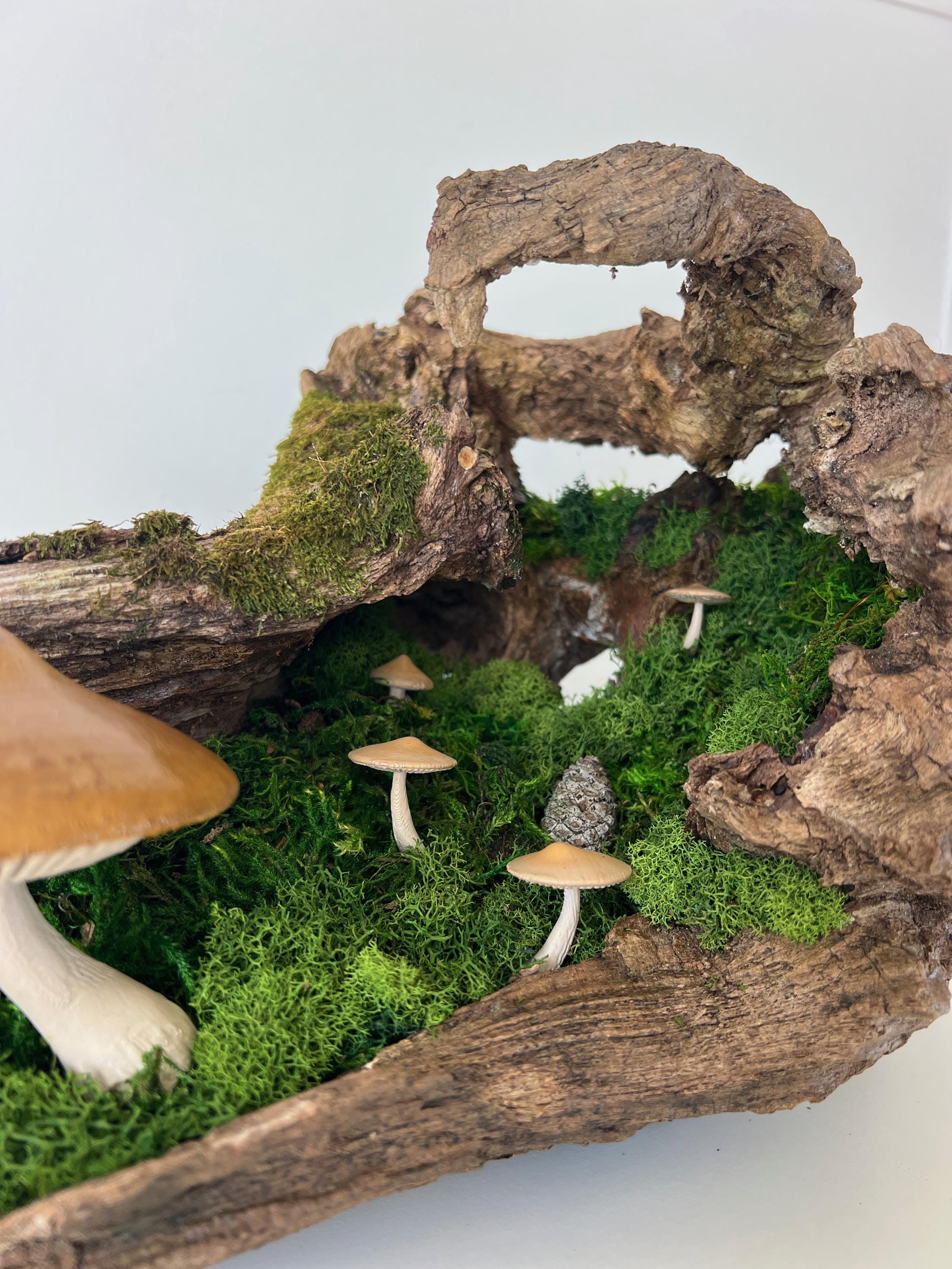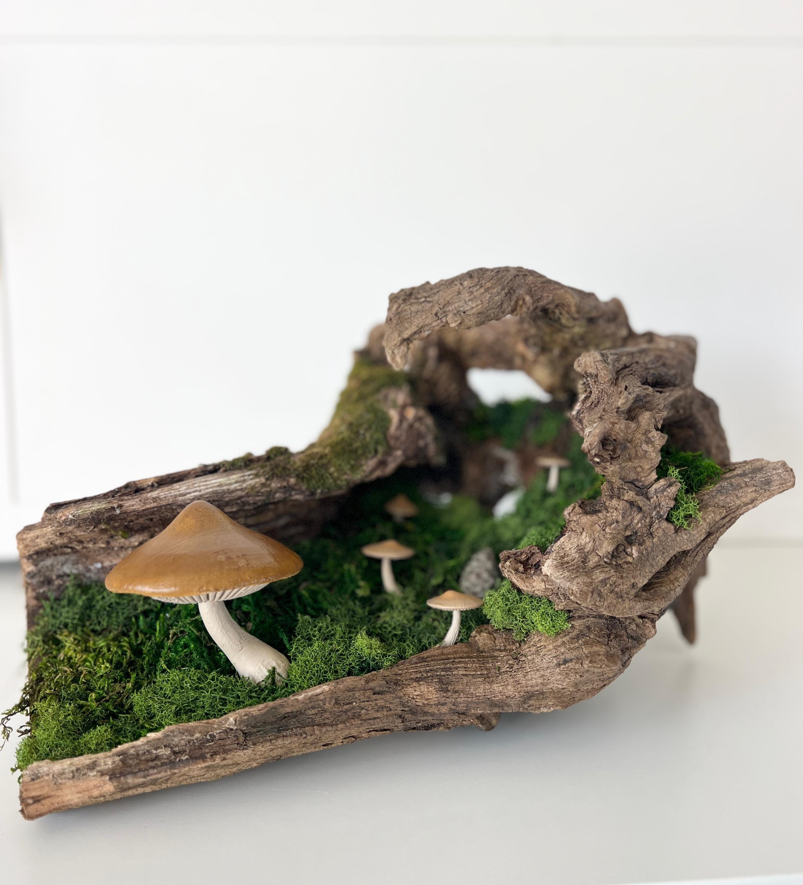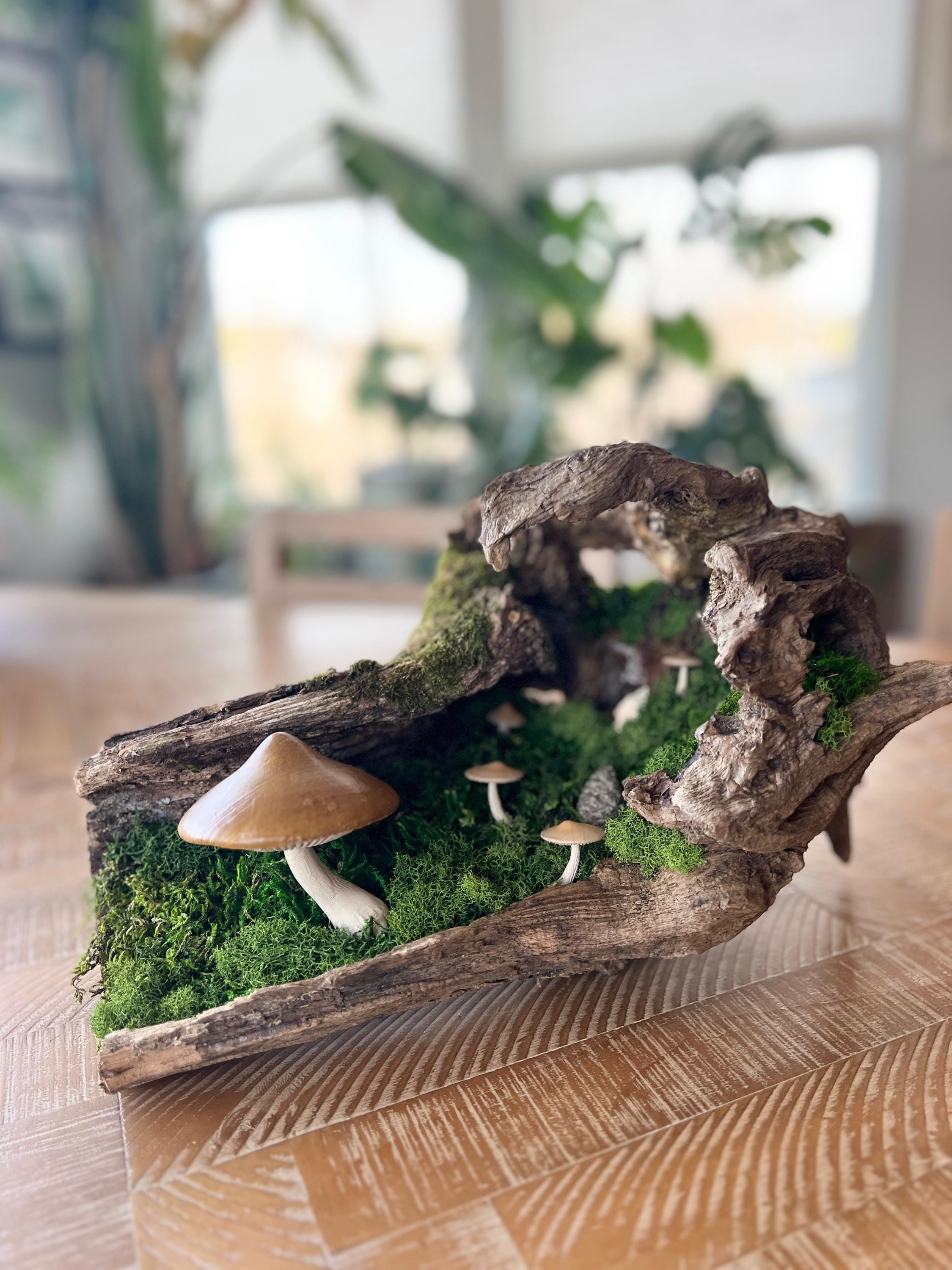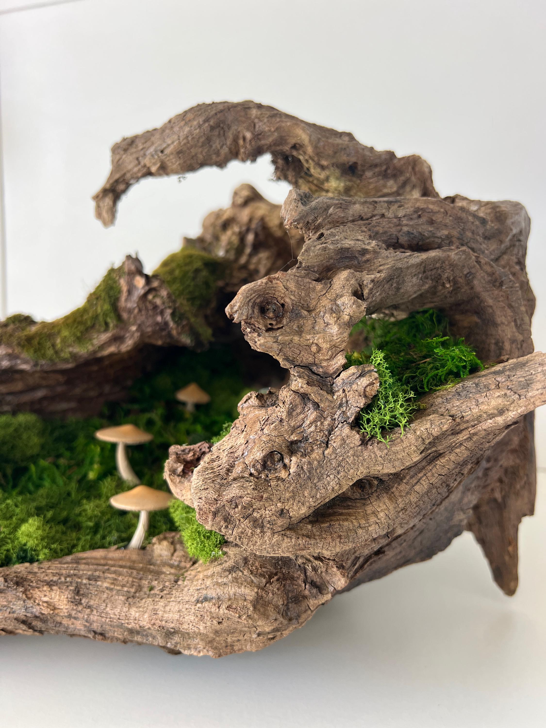 A large, gorgeous piece of knotty root wood makes a natural "hobbit hole" setting for this terraria, featuring preserved mosses and hand-painted mushrooms. It looks as if you came across it right in the middle of the forest floor.