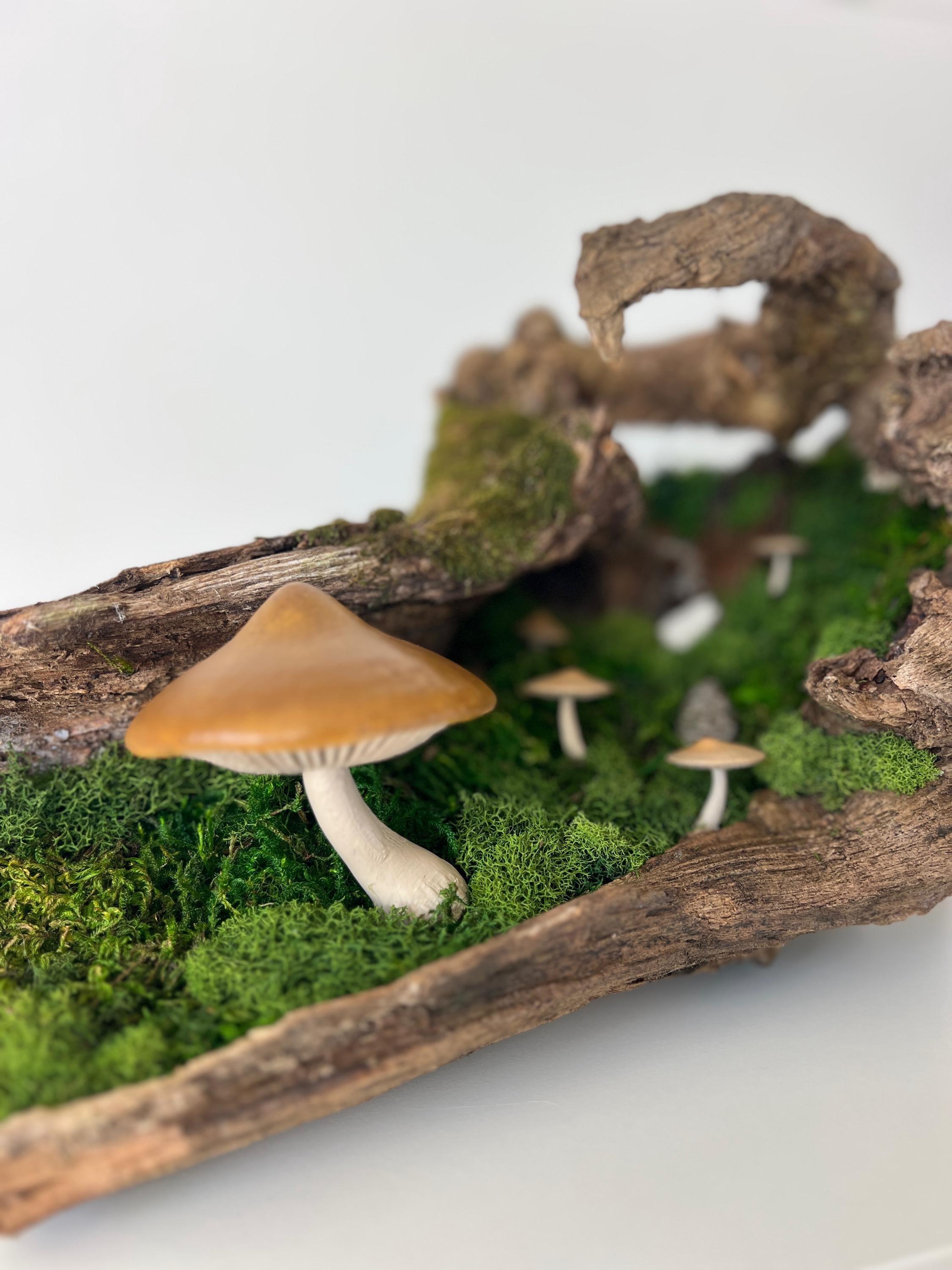 Mushrooms are 3D printed using eco-friendly, plant based, biodegradable PLA. Moss is preserved to stay green and beautiful with no maintenance.
