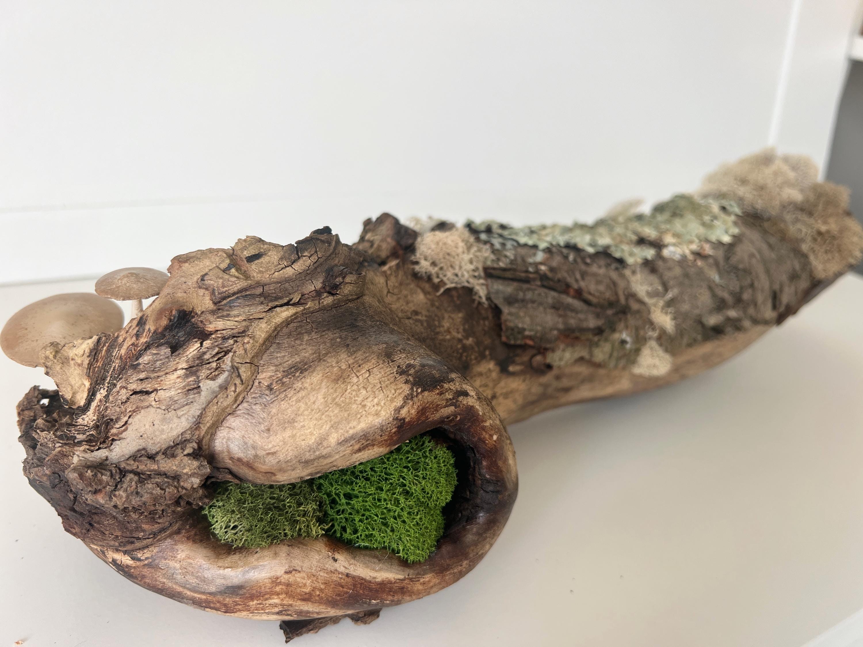 A large, gorgeous piece of knotty root wood makes a natural "hobbit hole" setting for this terraria, featuring preserved mosses and hand-painted mushrooms. It looks as if you came across it right in the middle of the forest floor.