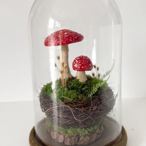 A large glass cloche displays a natural woodland scene. Natural botanical art created from wood, dried botanicals and moss foraged responsibly from nature, and mushrooms 3d printed with eco-friendly PLA and handpainted. Moss is preserved to stay green and beautiful with no maintenance needed.