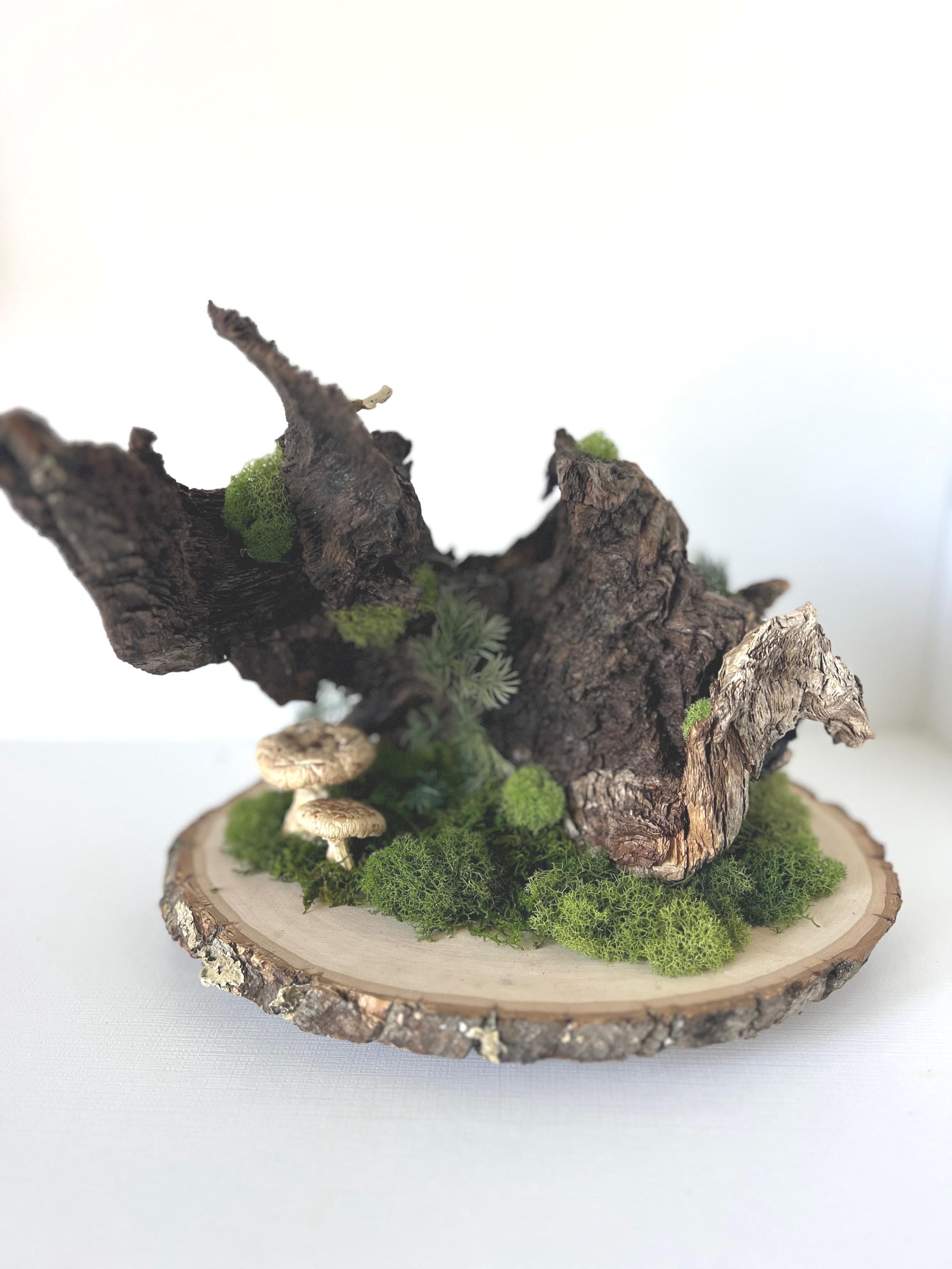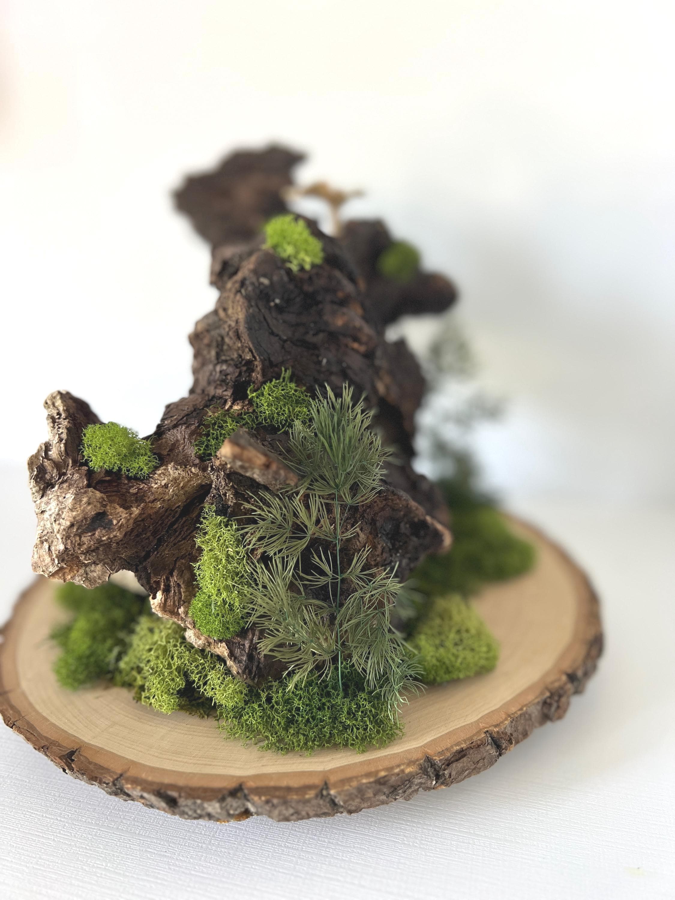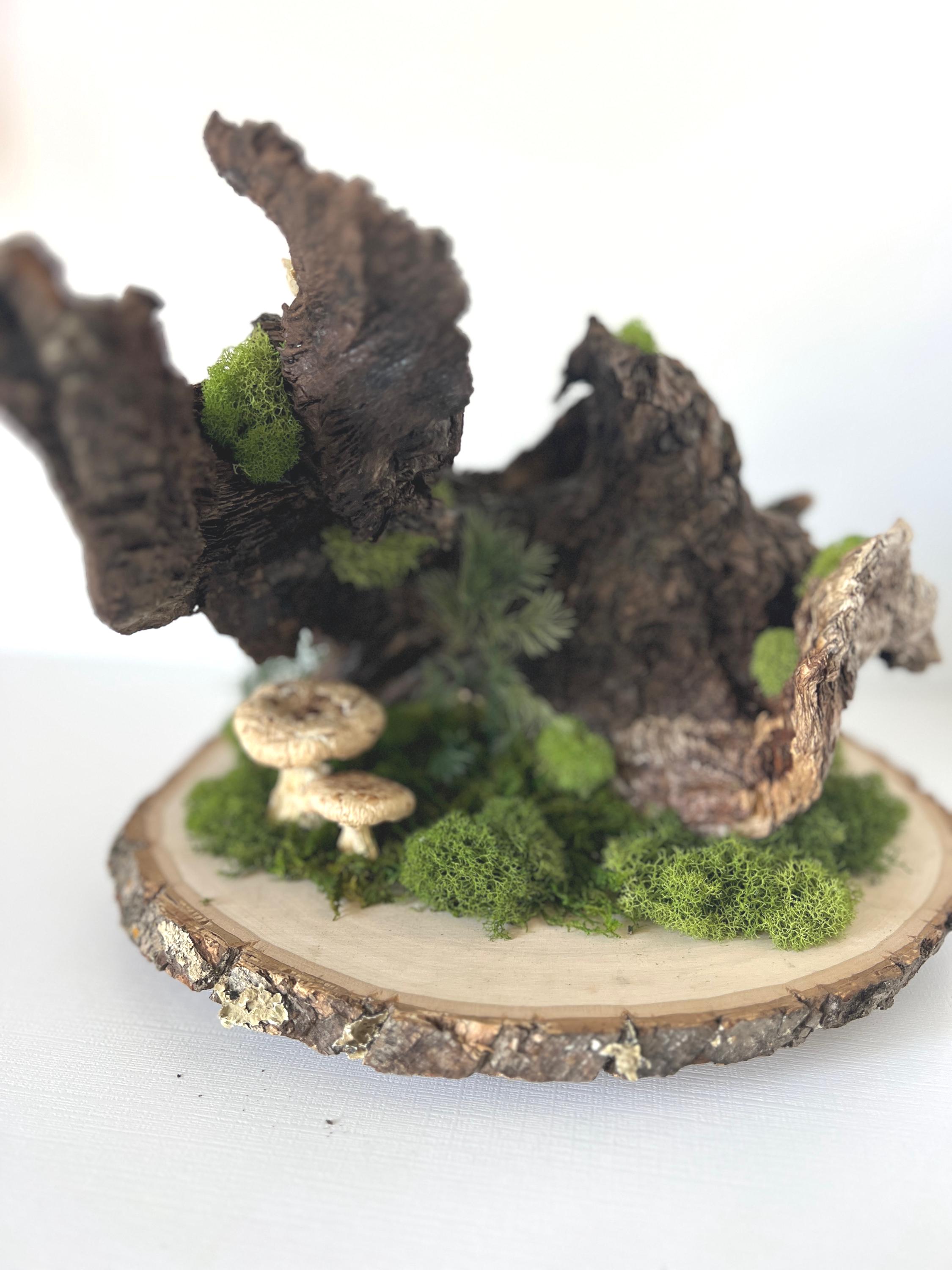 The knotty, aged piece of wood sets the backdrop for this woodland scene. Hand-painted mushrooms, dried preserved mosses, acorns, dried fern seeds and even a tiny snail, all come together for a large, eye-catching centerpiece.