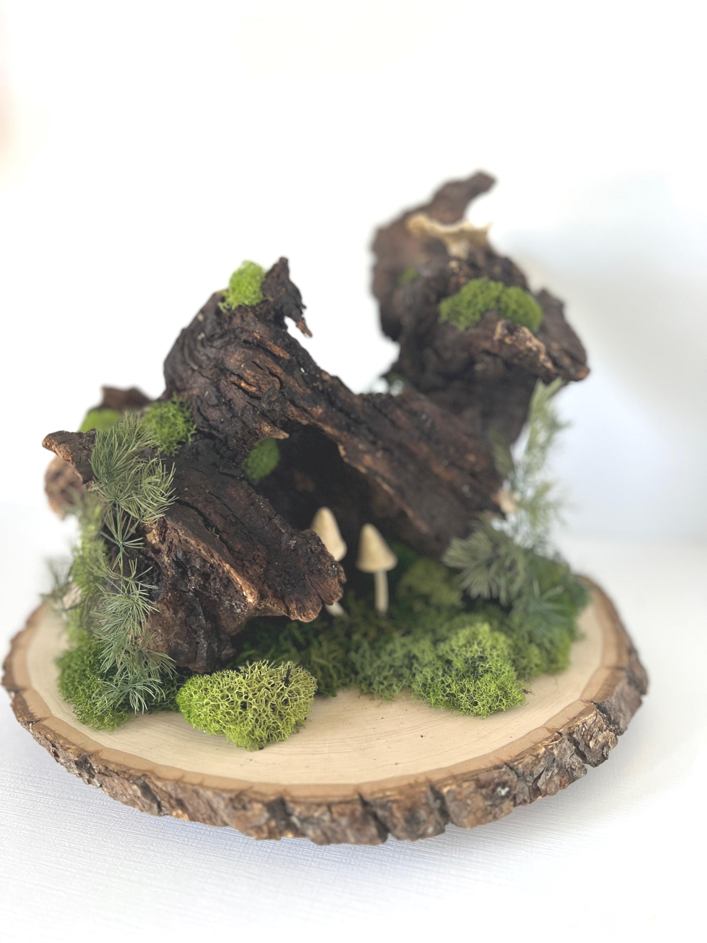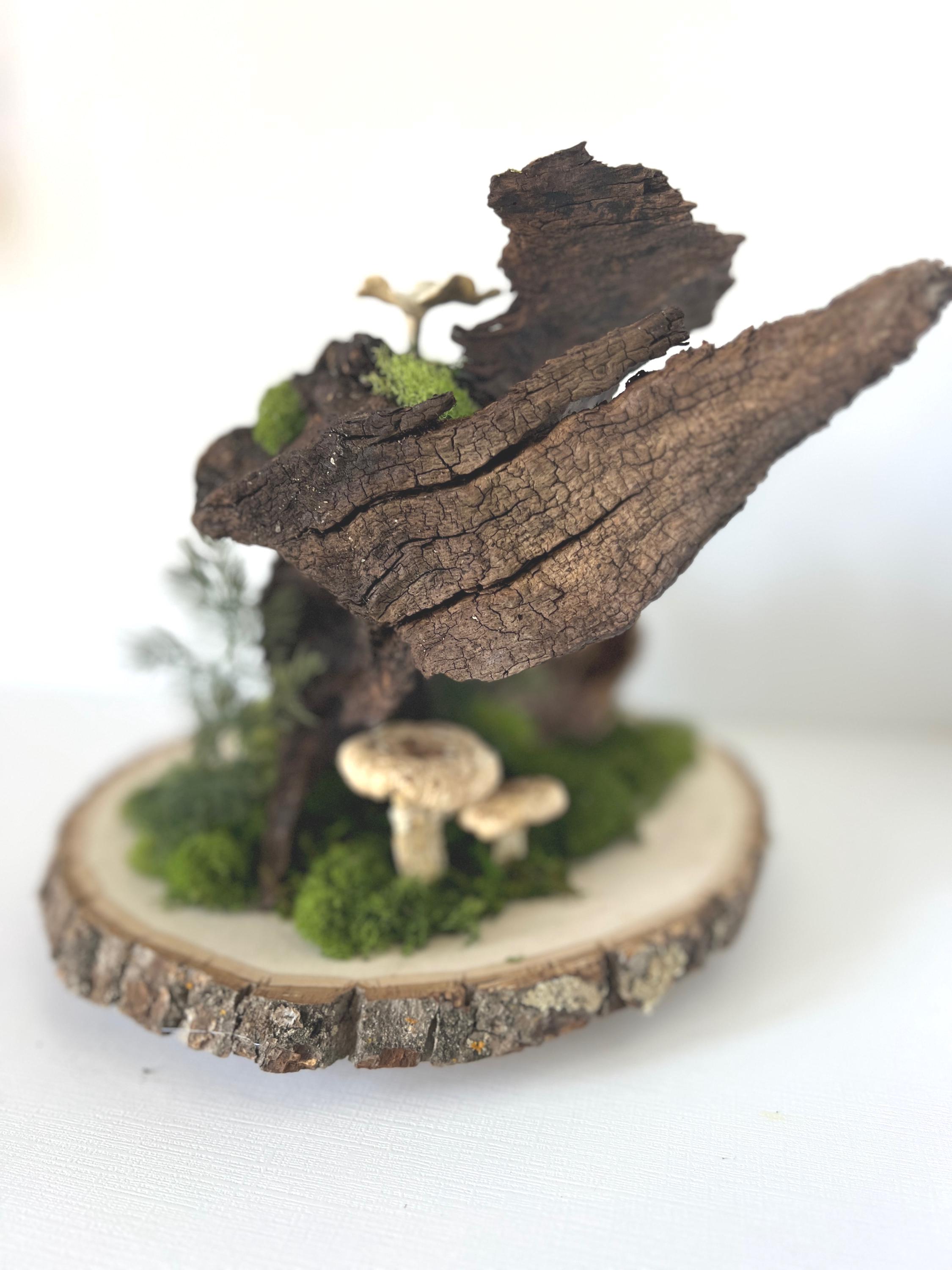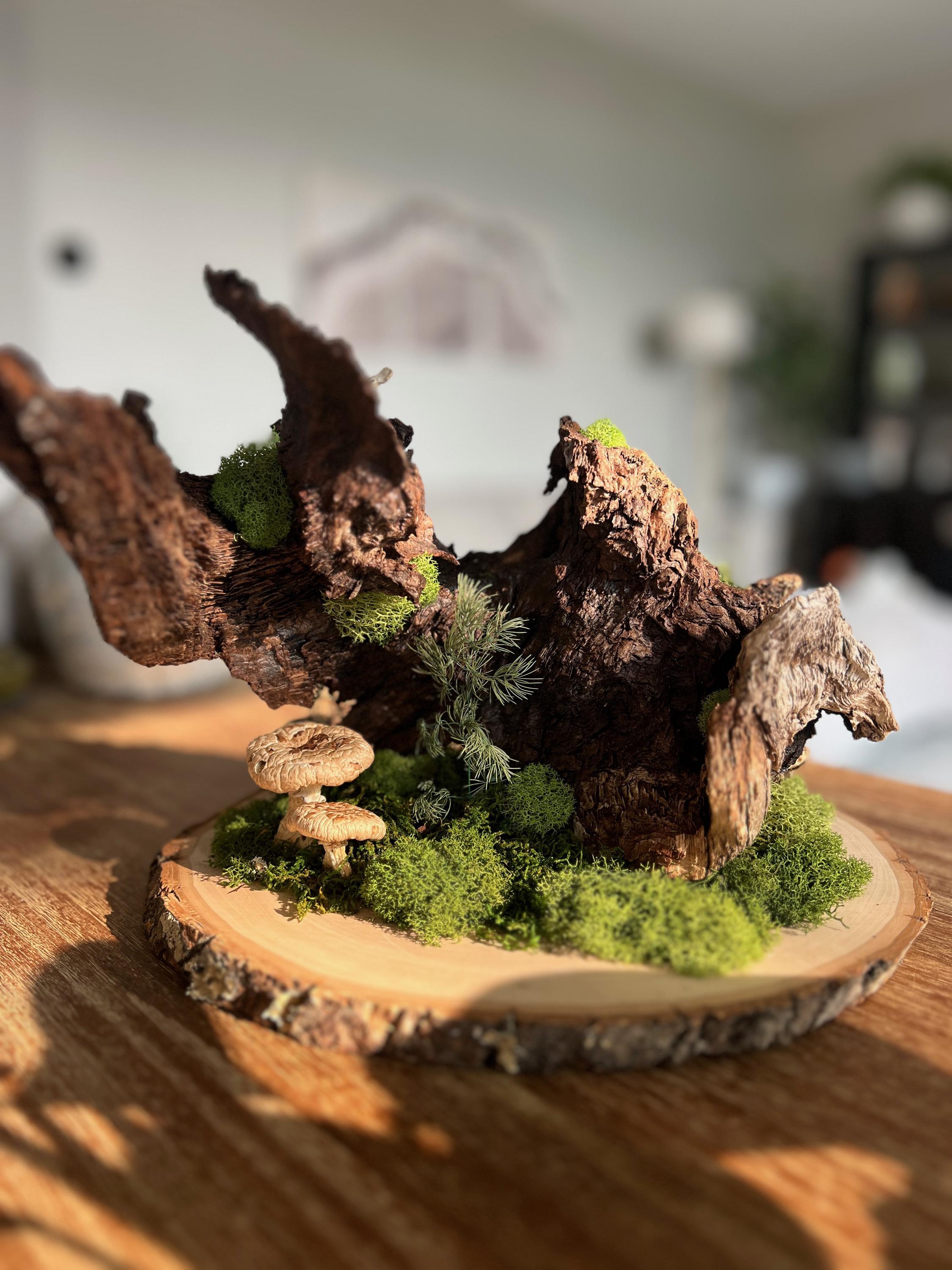 The knotty, aged piece of wood sets the backdrop for this woodland scene. Hand-painted mushrooms, dried preserved mosses, acorns, dried fern seeds and even a tiny snail, all come together for a large, eye-catching centerpiece.
