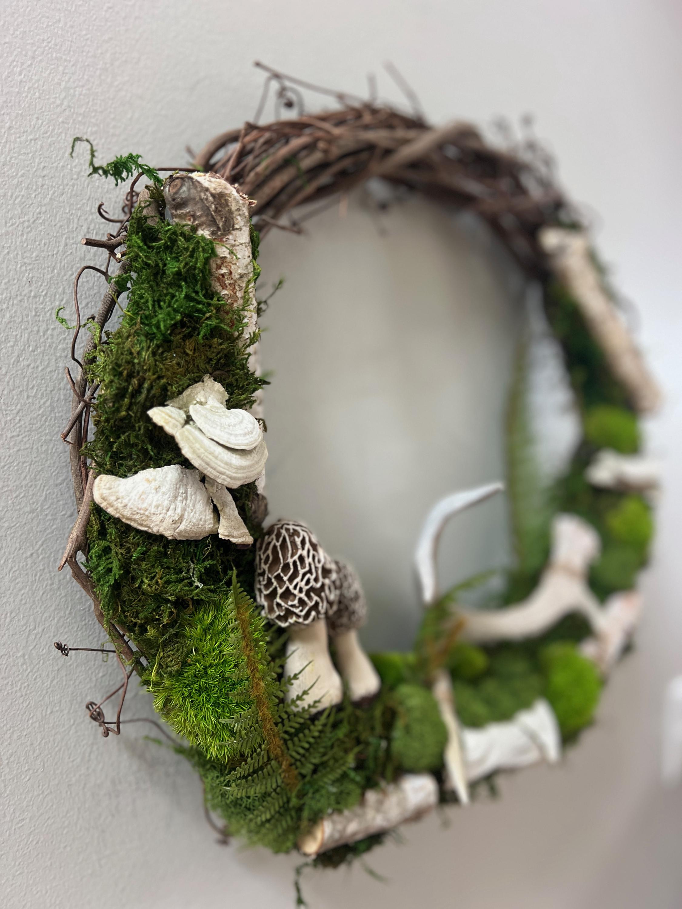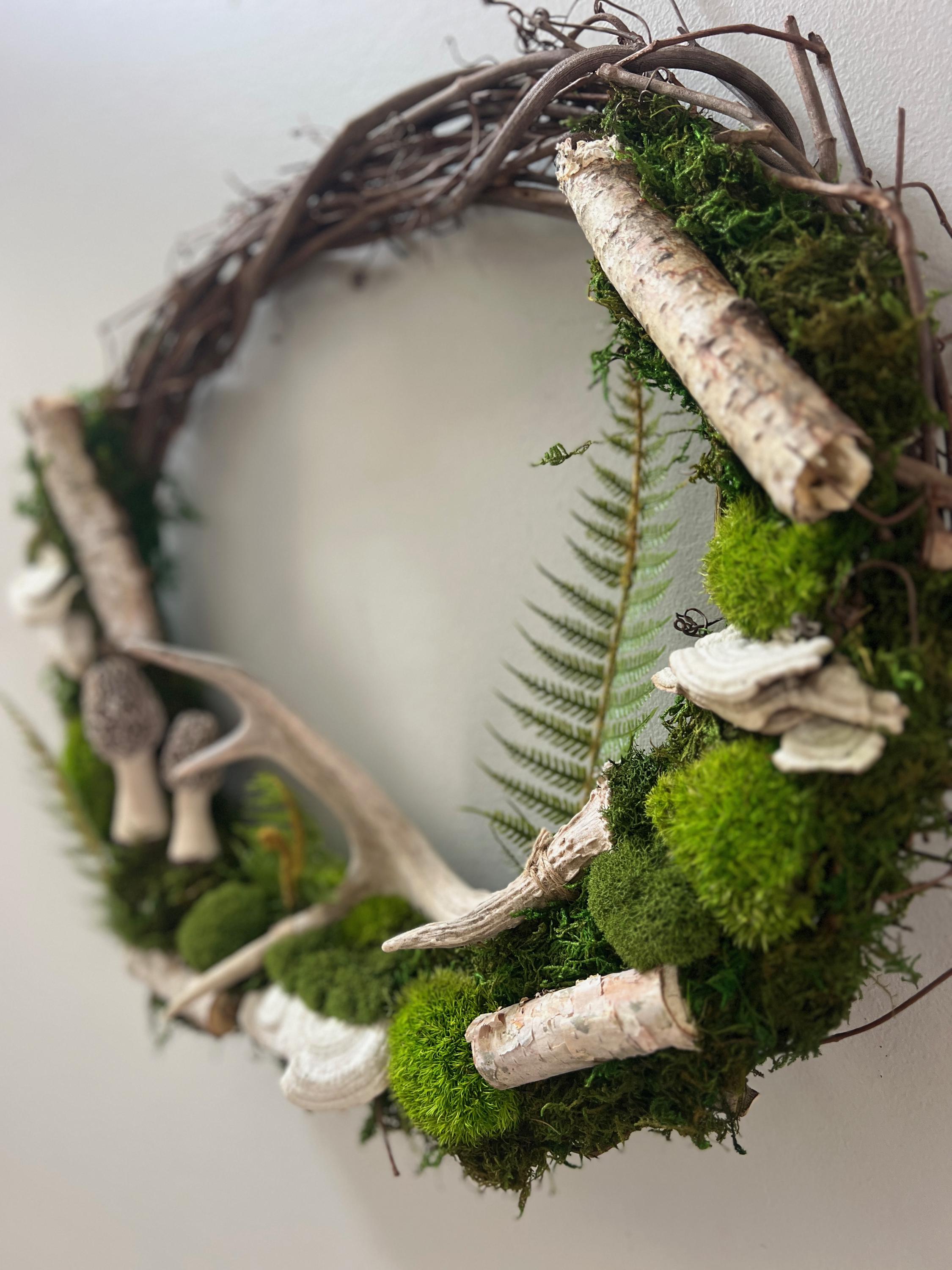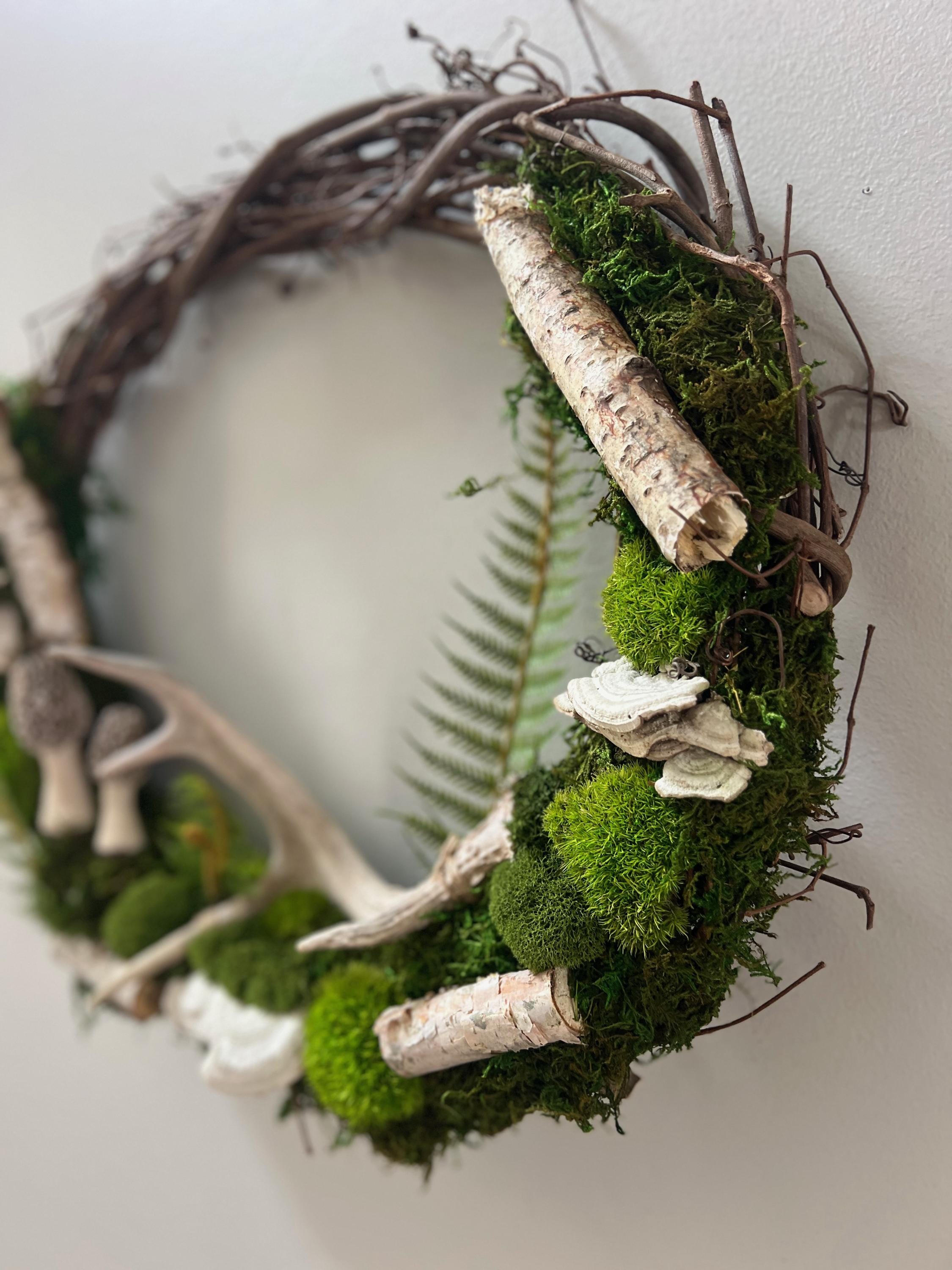 This beautiful woodland wreath gives peace and serenity vibes to any space. Modern organic aesthetic. Immersion in nature has been proven to have calming effects on our nervous system and lower cortisol levels. Now you can "forest bathe" in your home, office, spa, anywhere!
