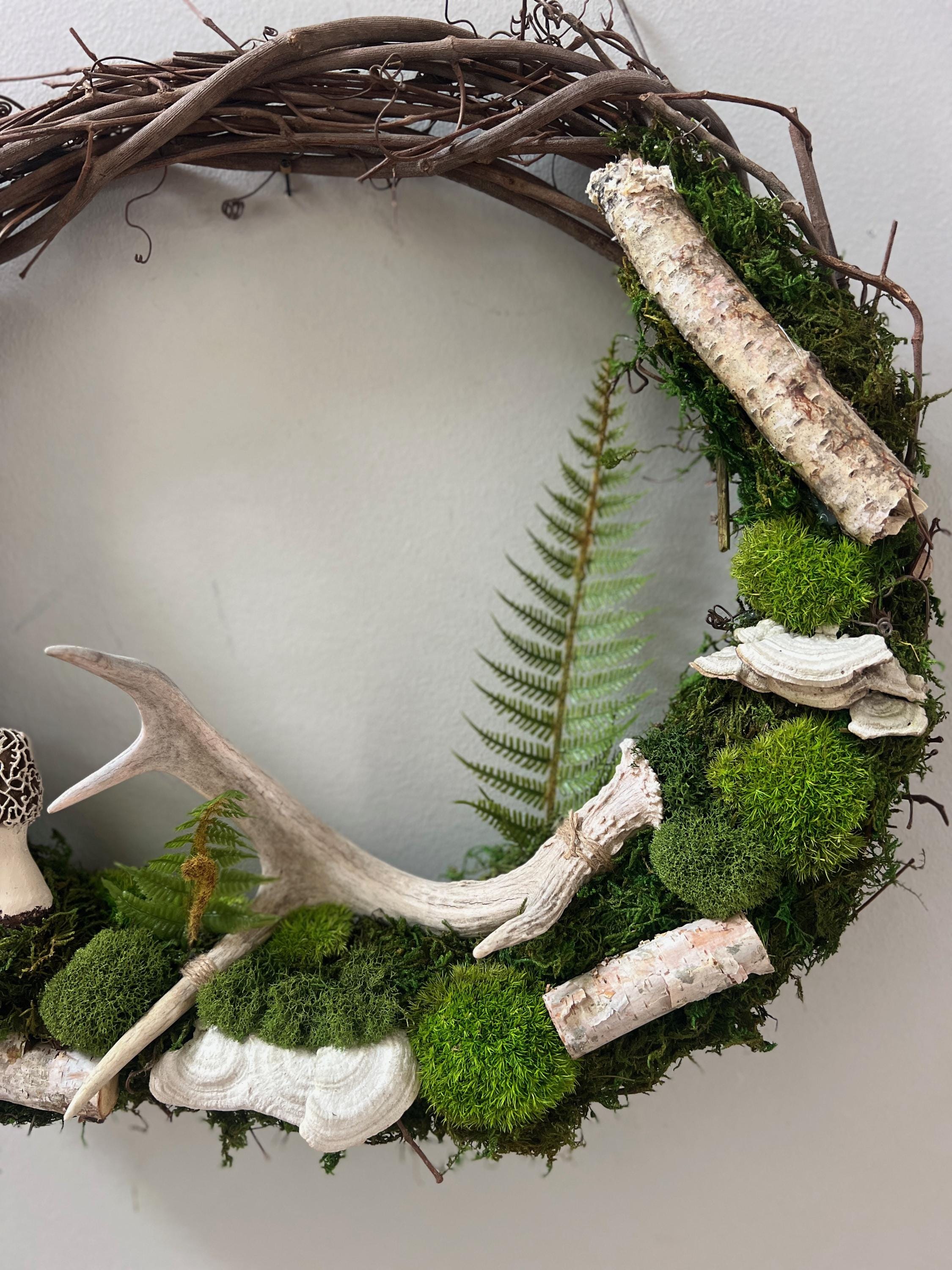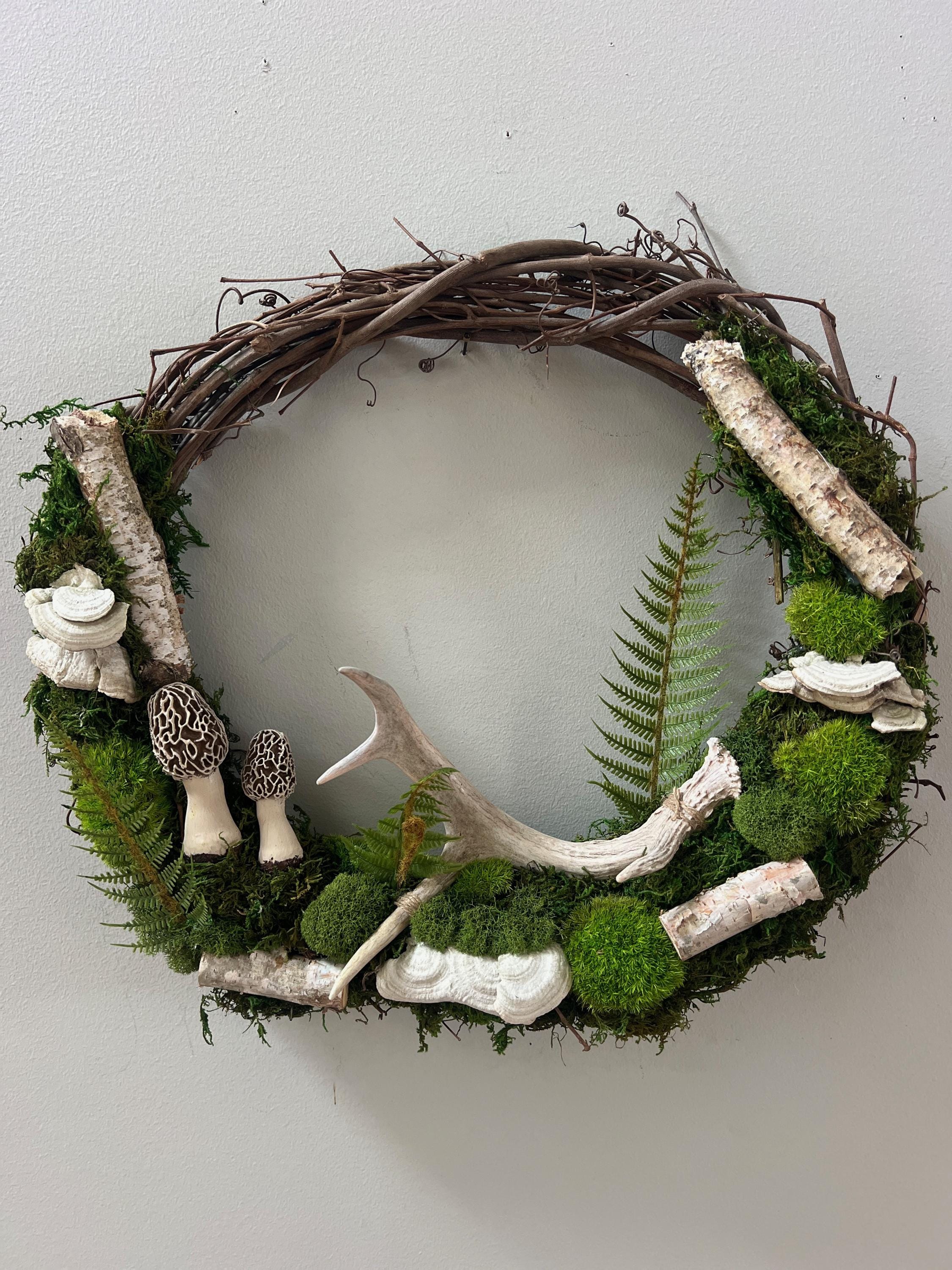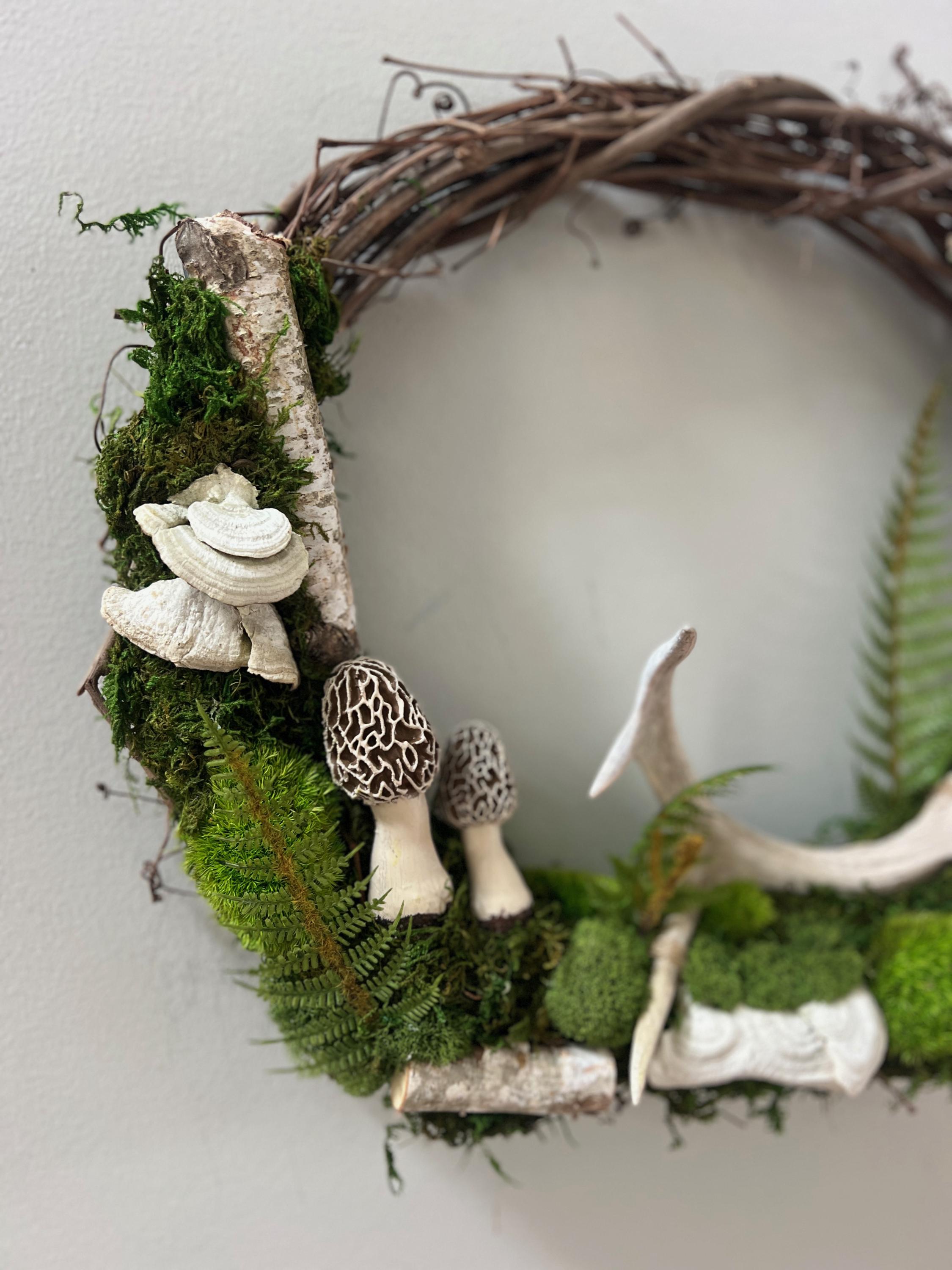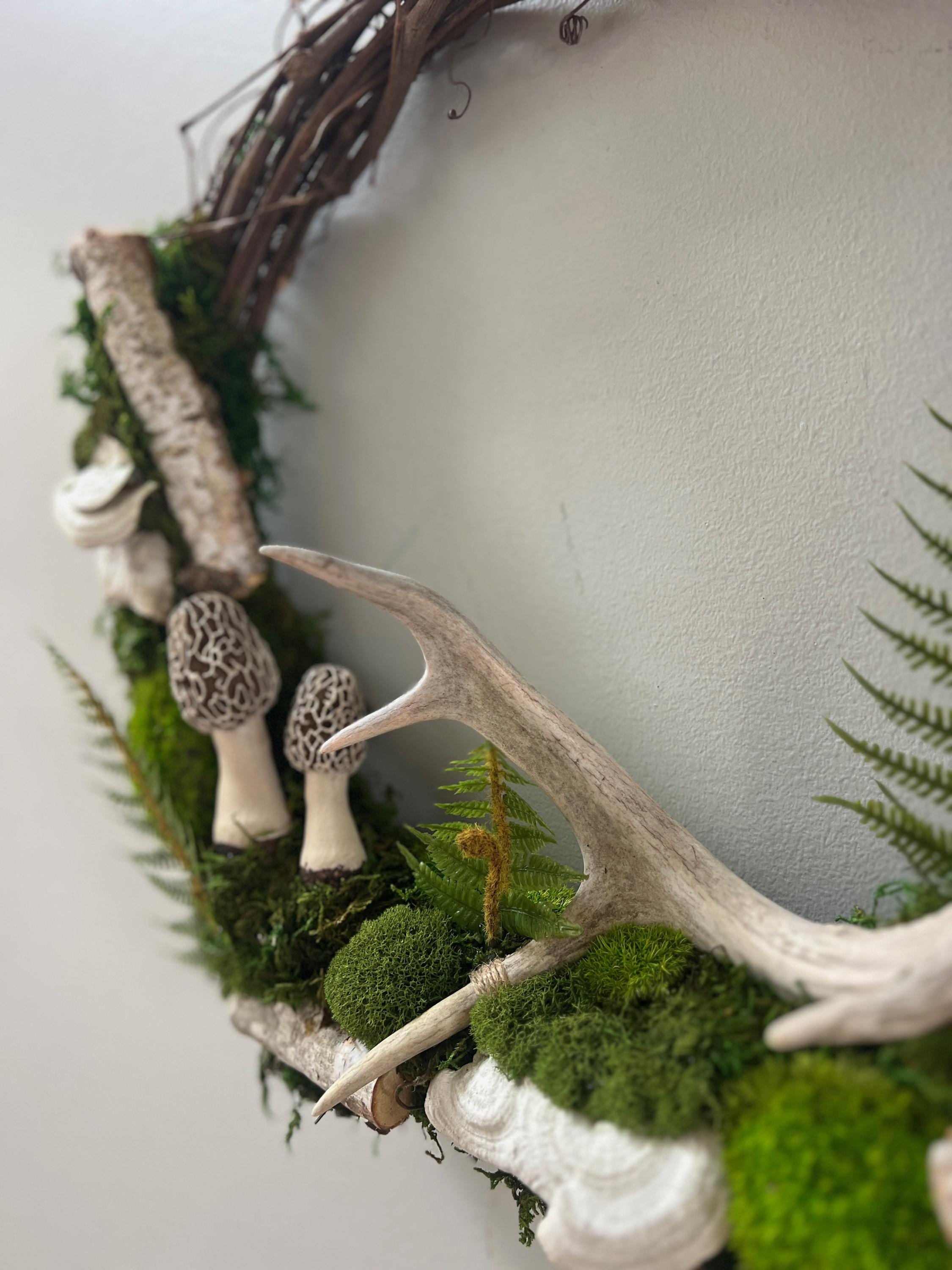 I call this the Midwest Wildlife wreath. A real antler shed, paired with real birch, morel mushrooms and ferns. The ultimate picture of woodlands in the Midwest. This is a nice large wreath at almost 20". Stunning.
