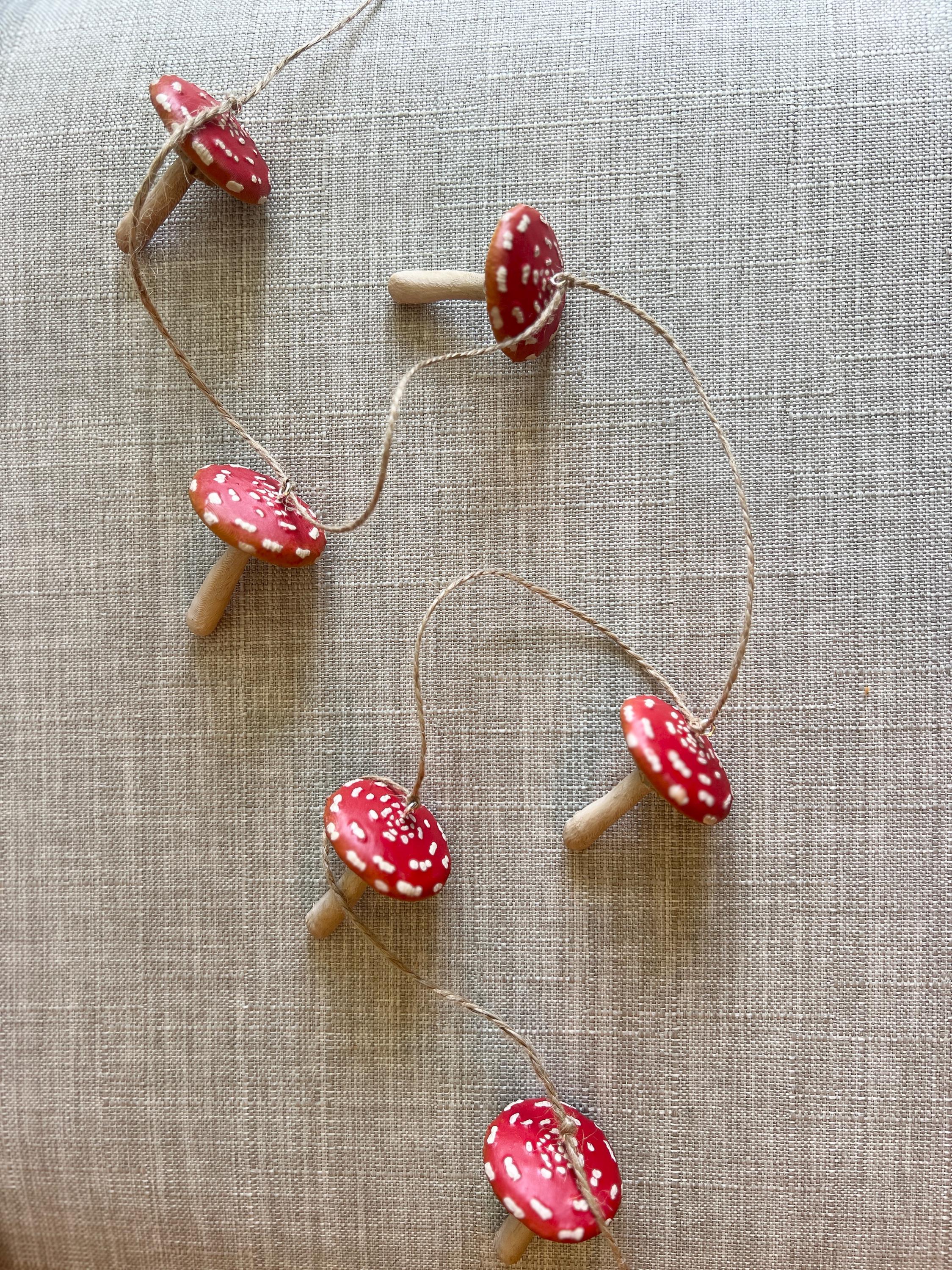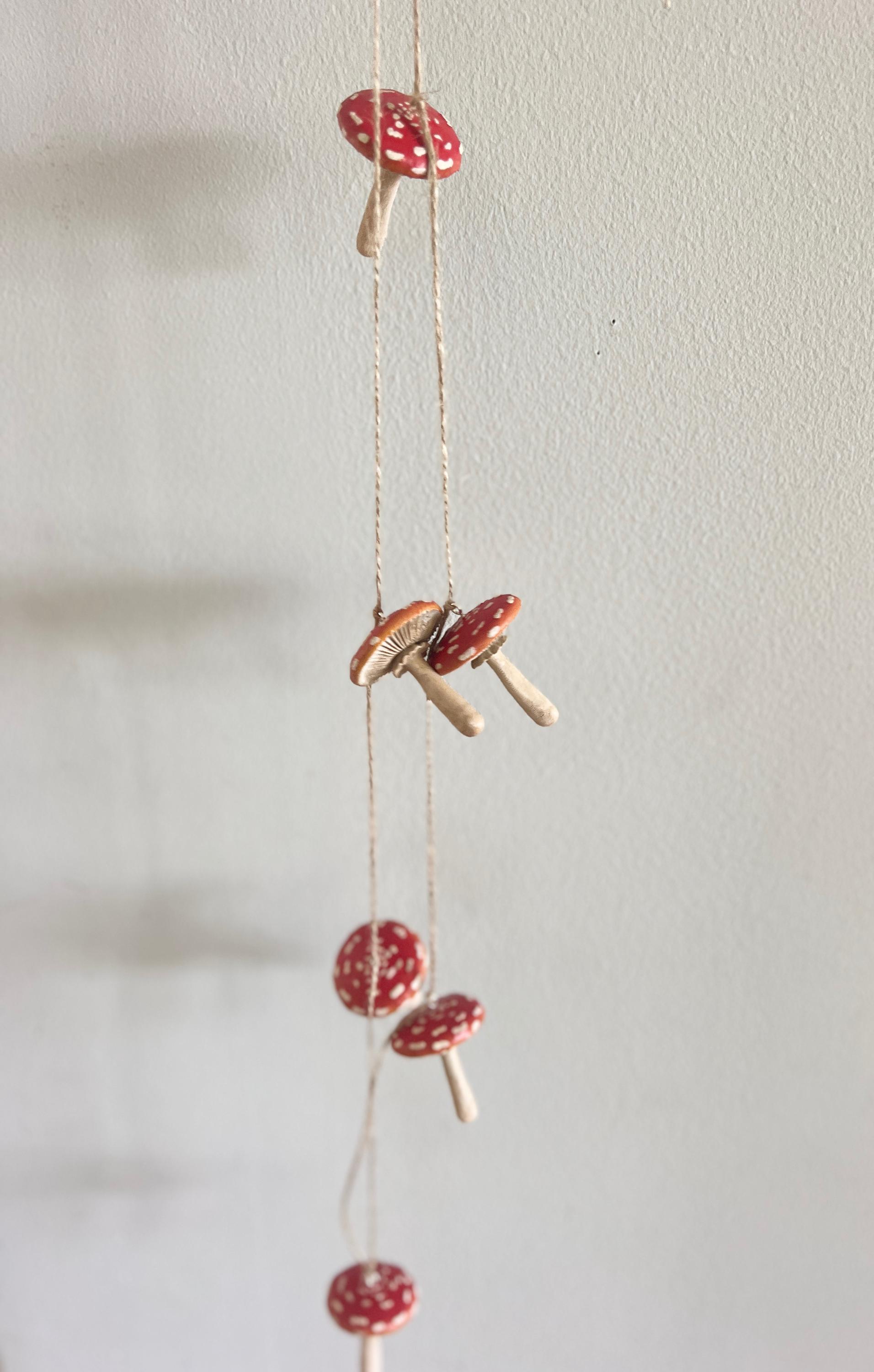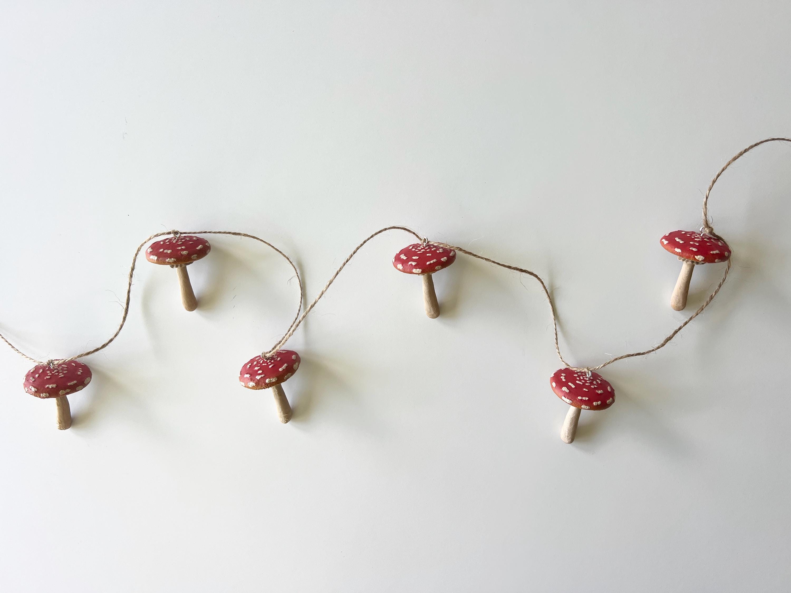 Sweet little mushroom garland for woodland themed parties, nursery decor, or just a fun little nature vibe in your space. The mushrooms are sealed against the weather so this can be used inside or out. The twine will age over time, as it is a natural fiber, so being in a protected area outside is recommended.