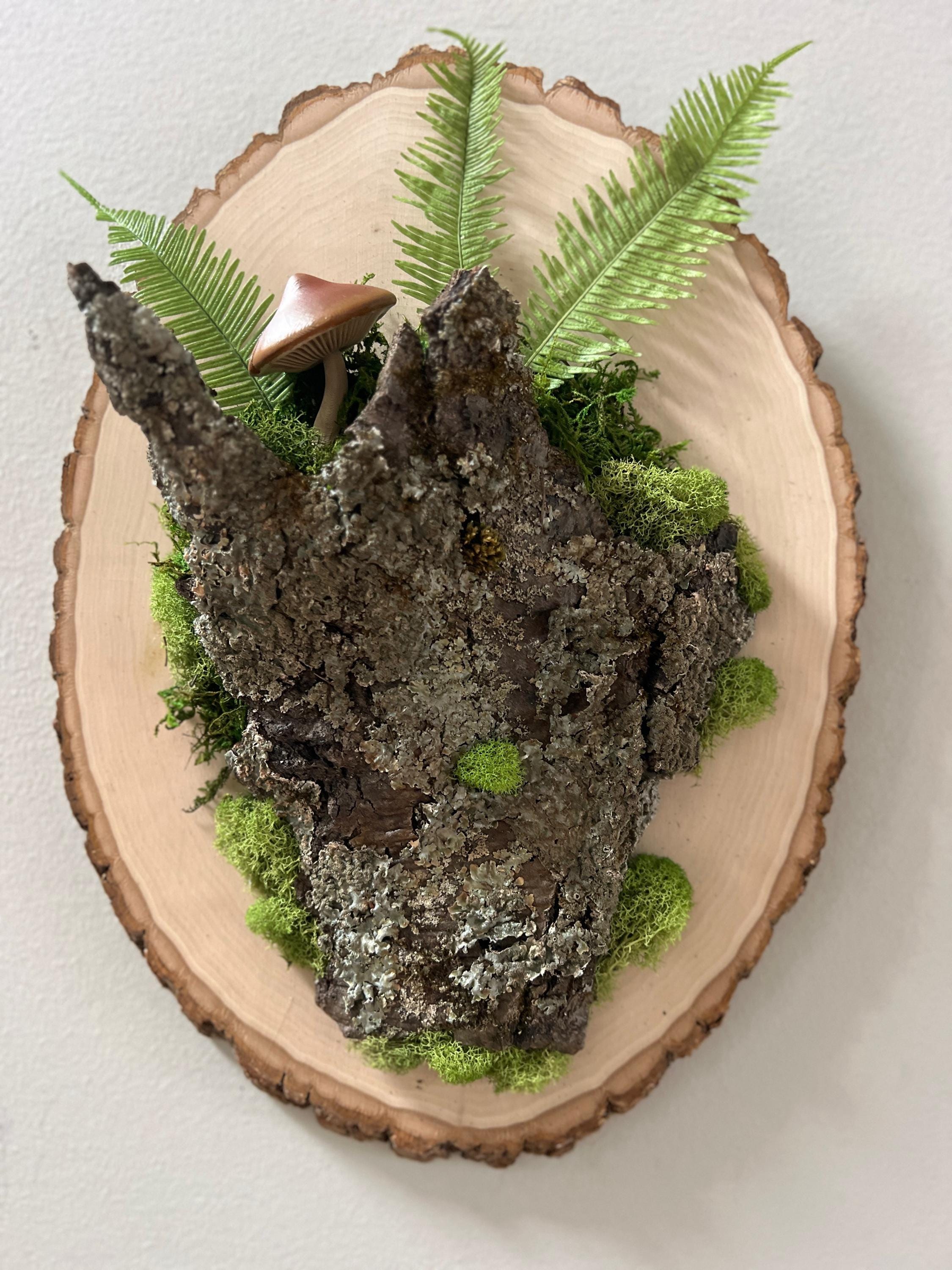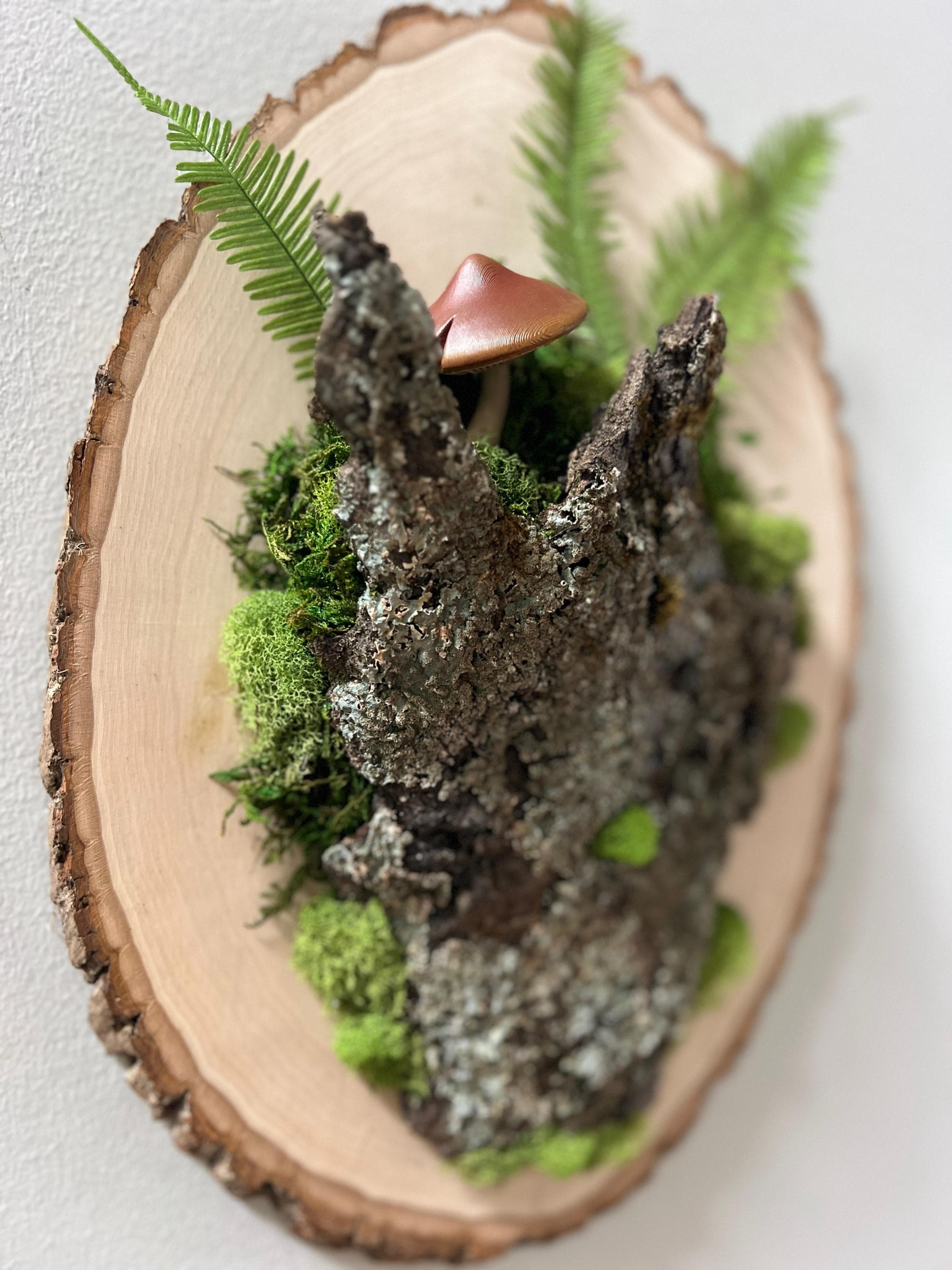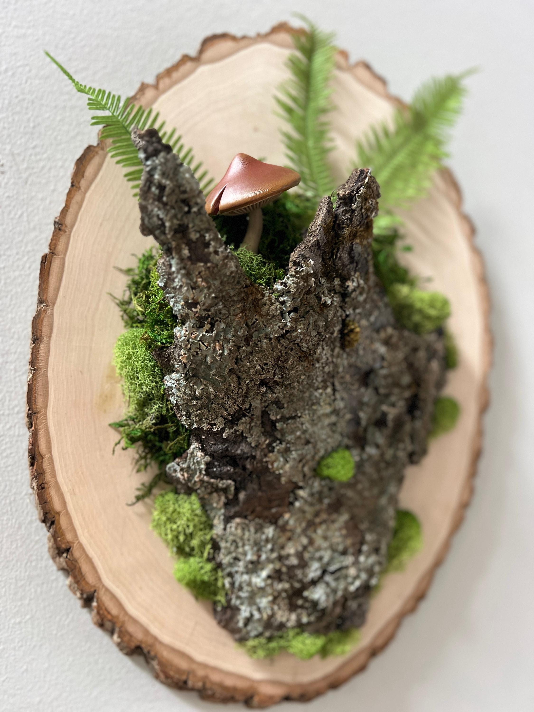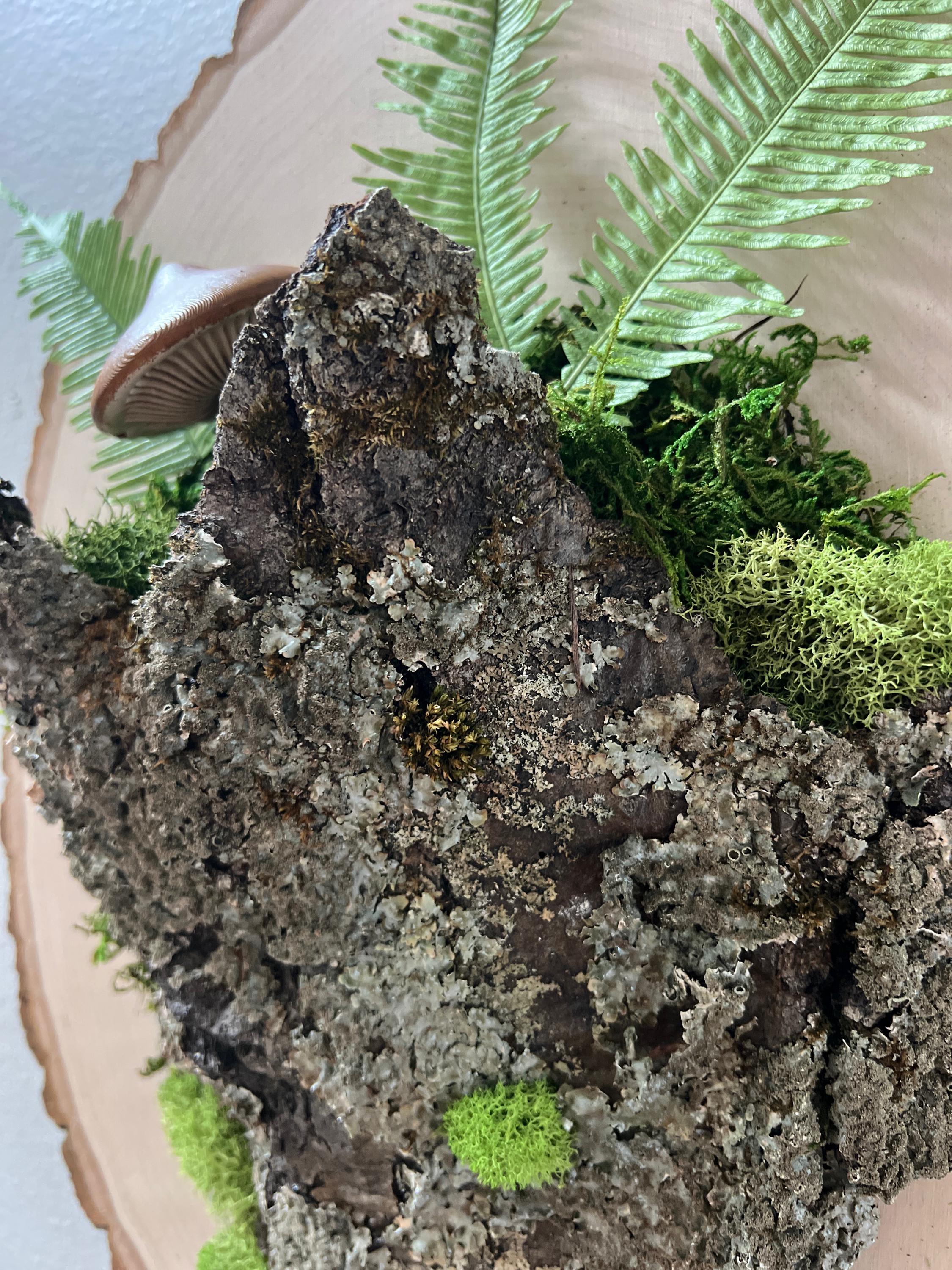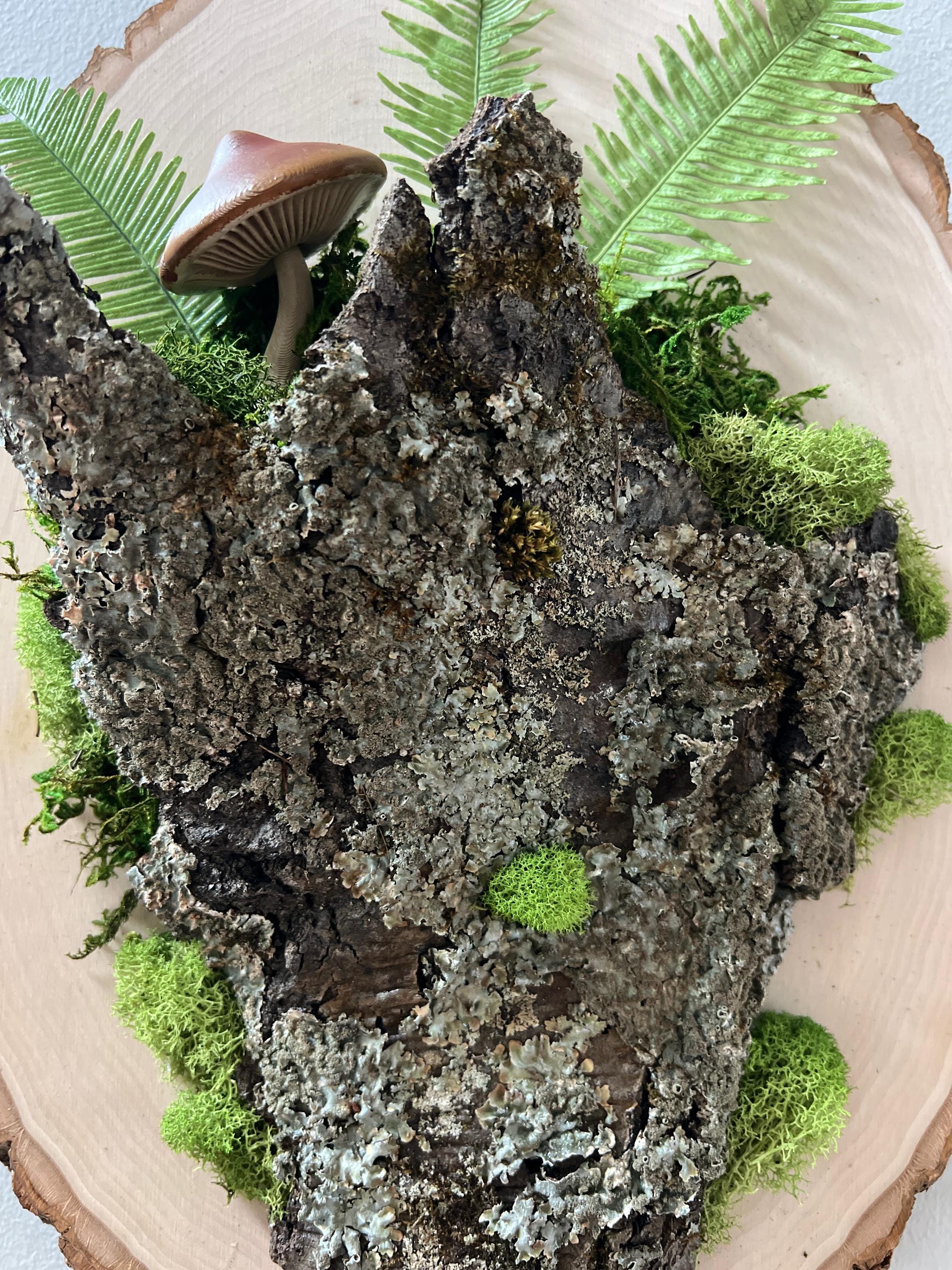 A beautiful piece of natural bark, covered in the prettiest blue-gray lichen pops off of this slice of wood with mosses, ferns and a sweet mushroom growing right out of it. This piece is 3 dimensional and looks great from every angle. Hang a piece of the forest on your wall.