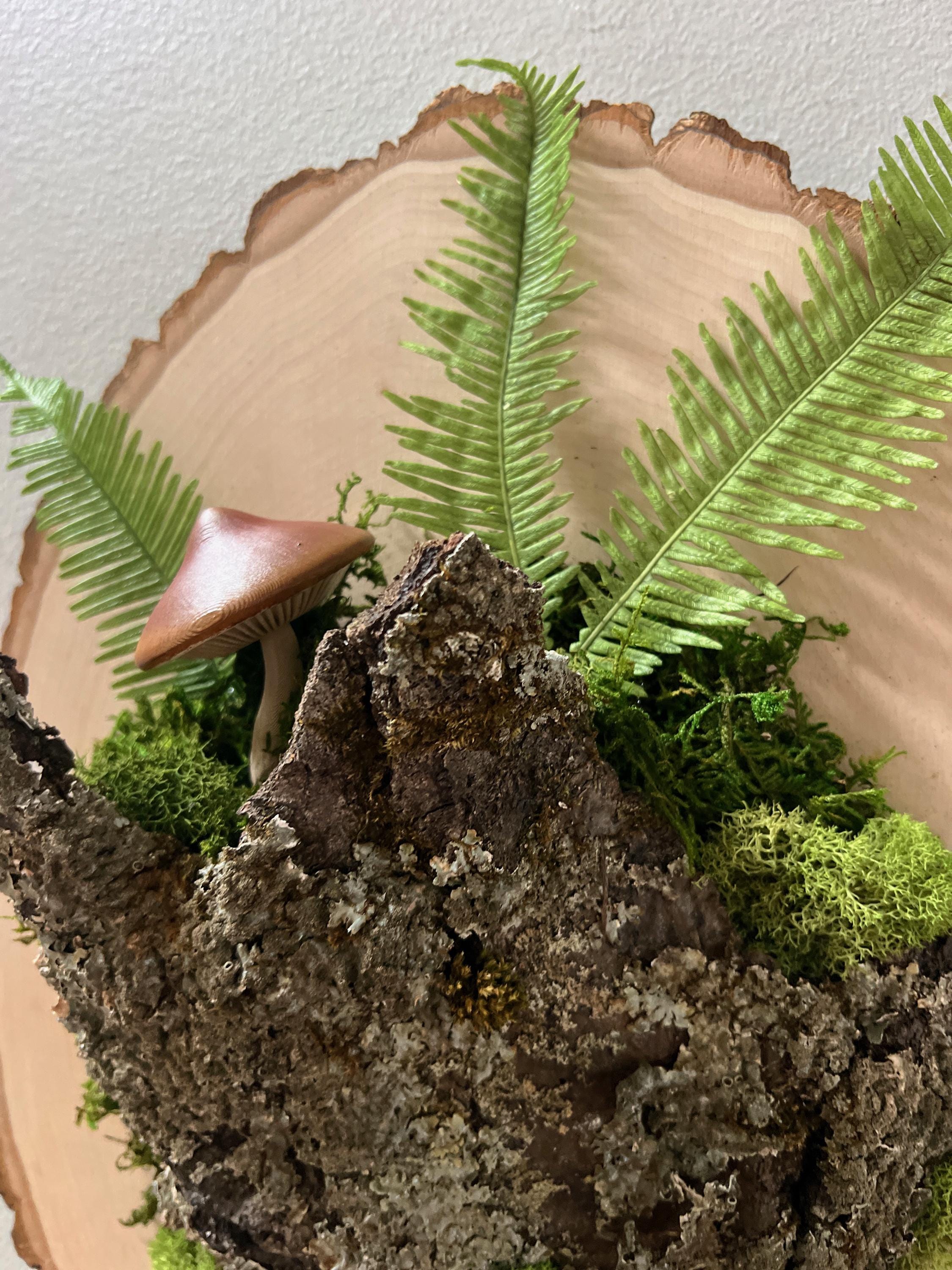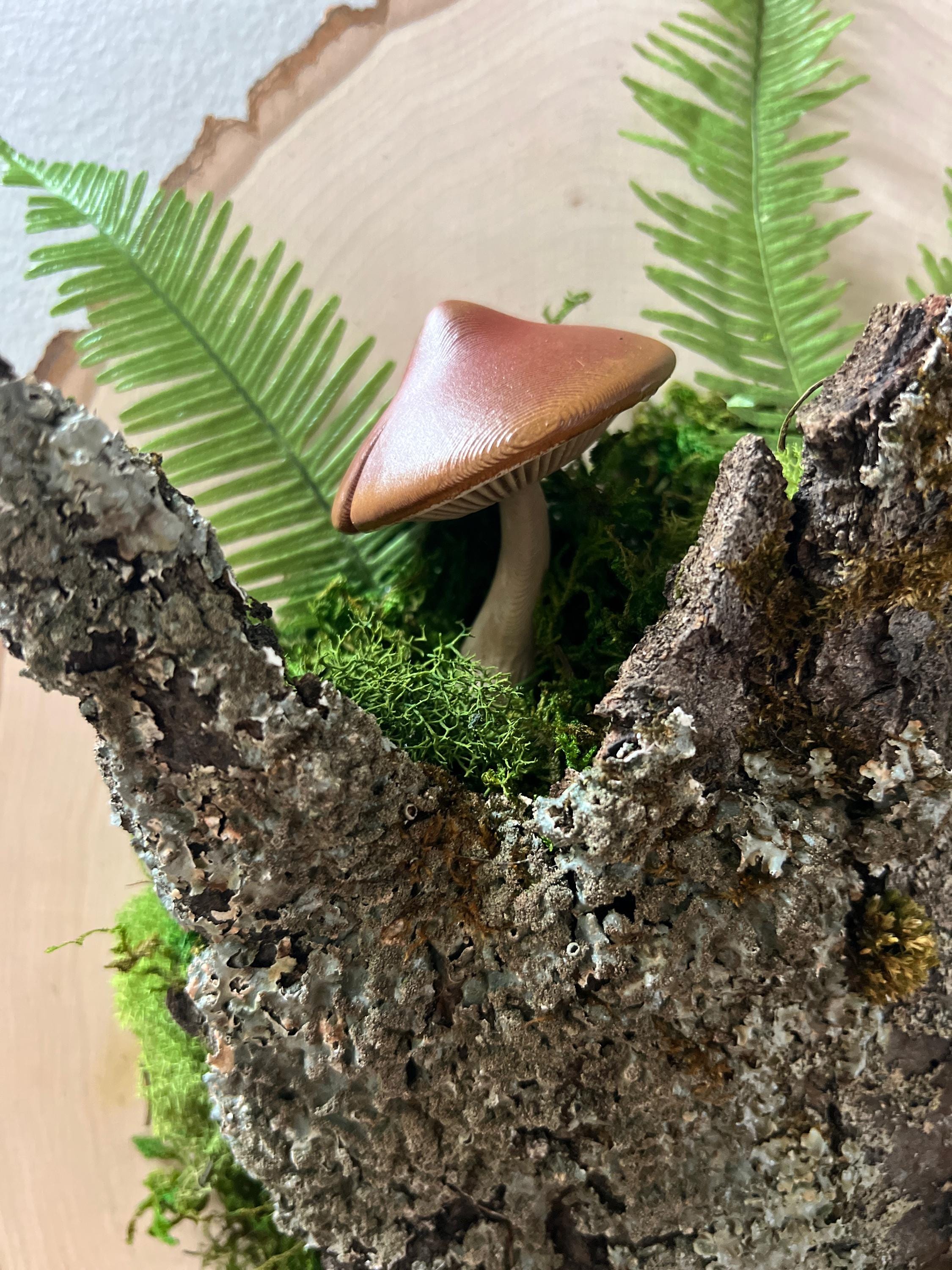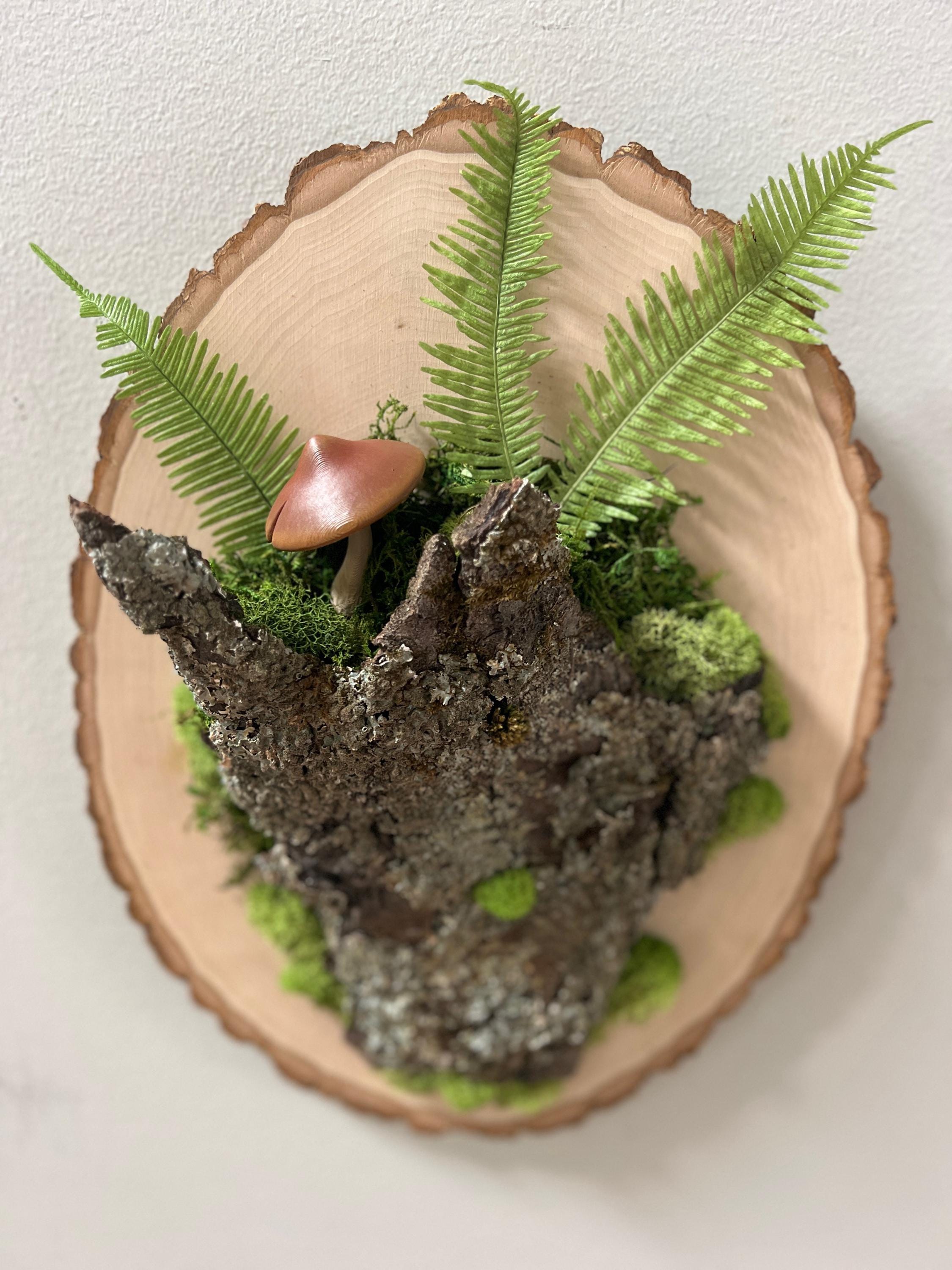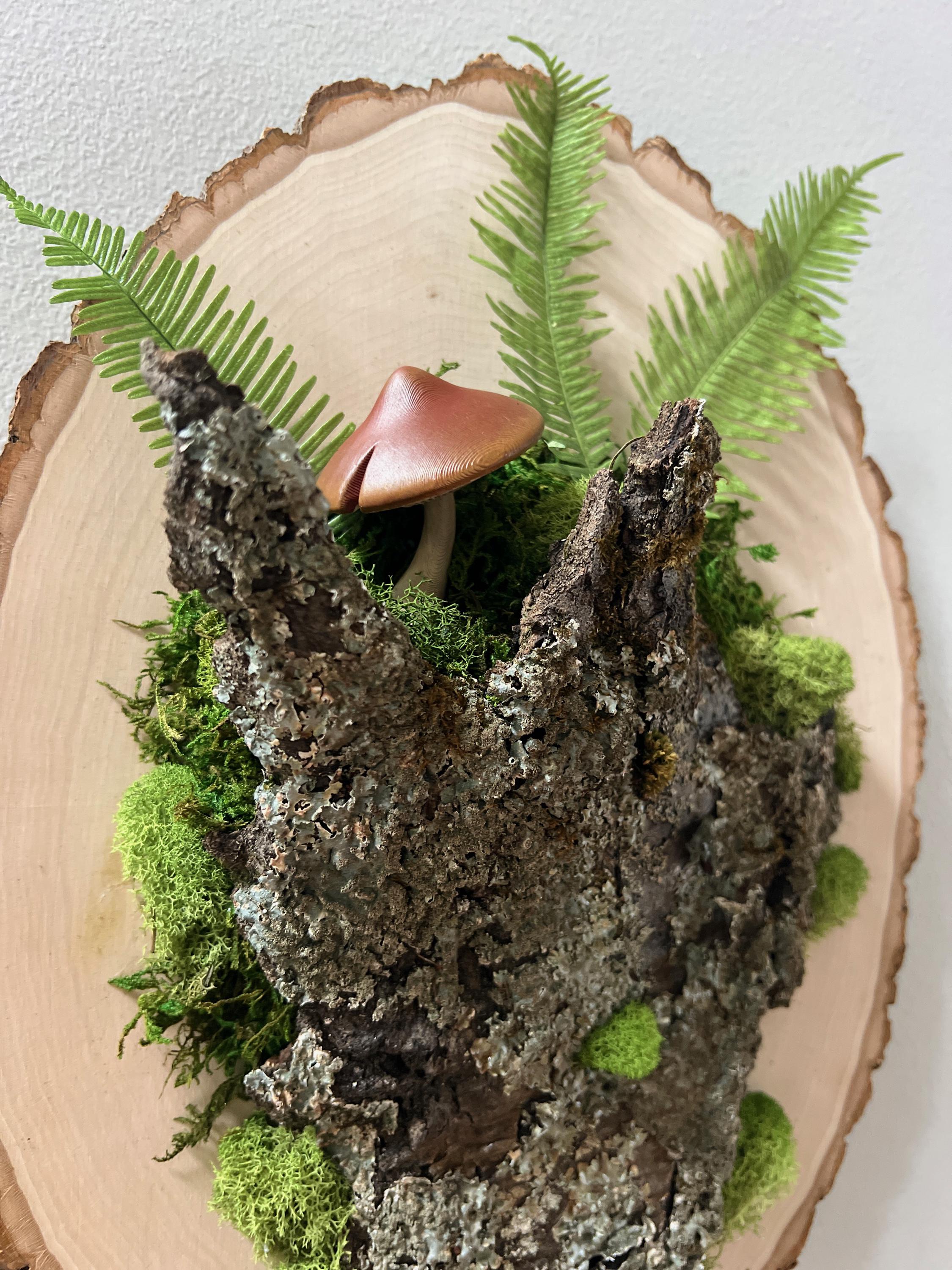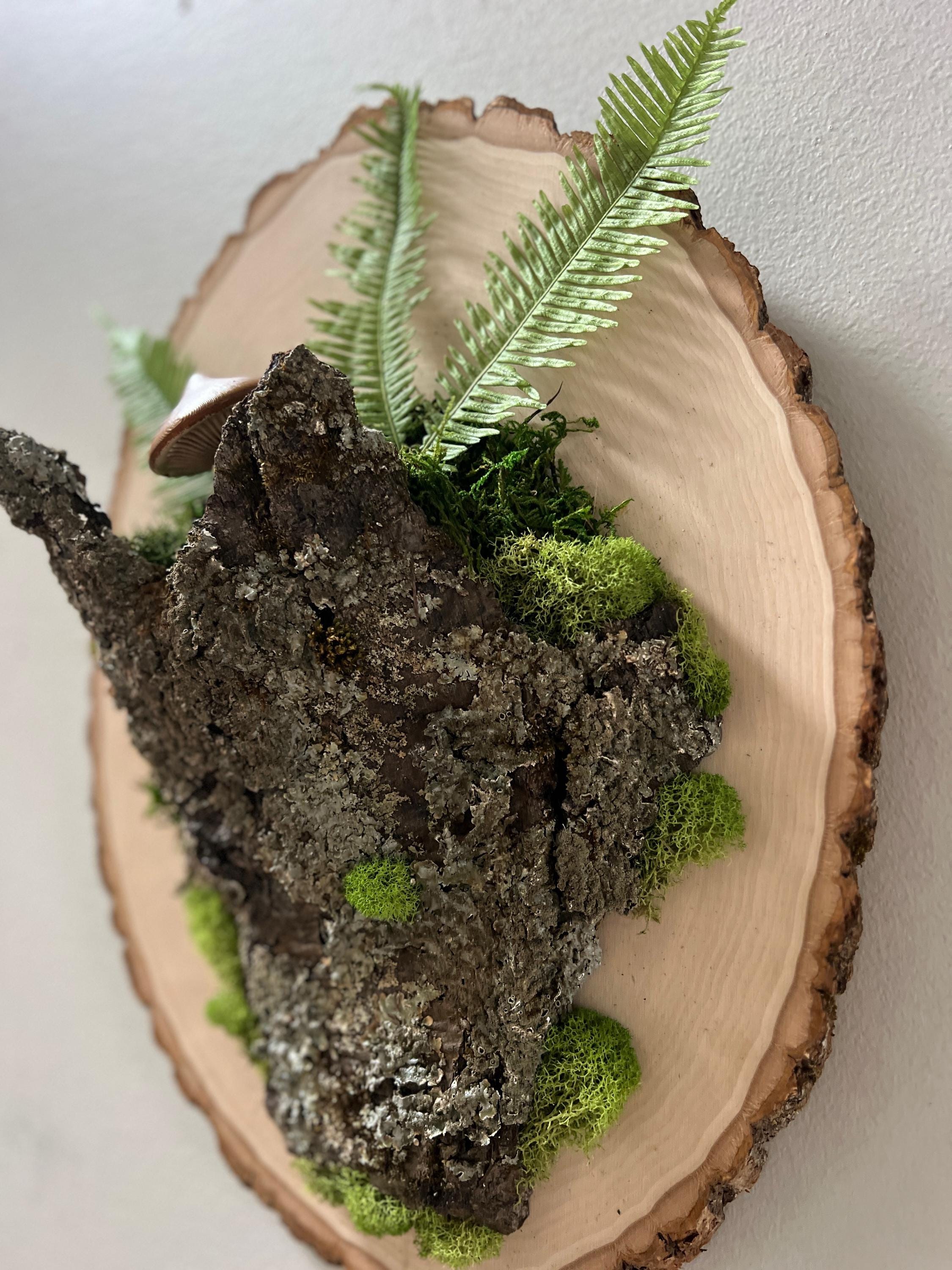 A beautiful piece of natural bark, covered in the prettiest blue-gray lichen pops off of this slice of wood with mosses, ferns and a sweet mushroom growing right out of it. This piece is 3 dimensional and looks great from every angle. Hang a piece of the forest on your wall.