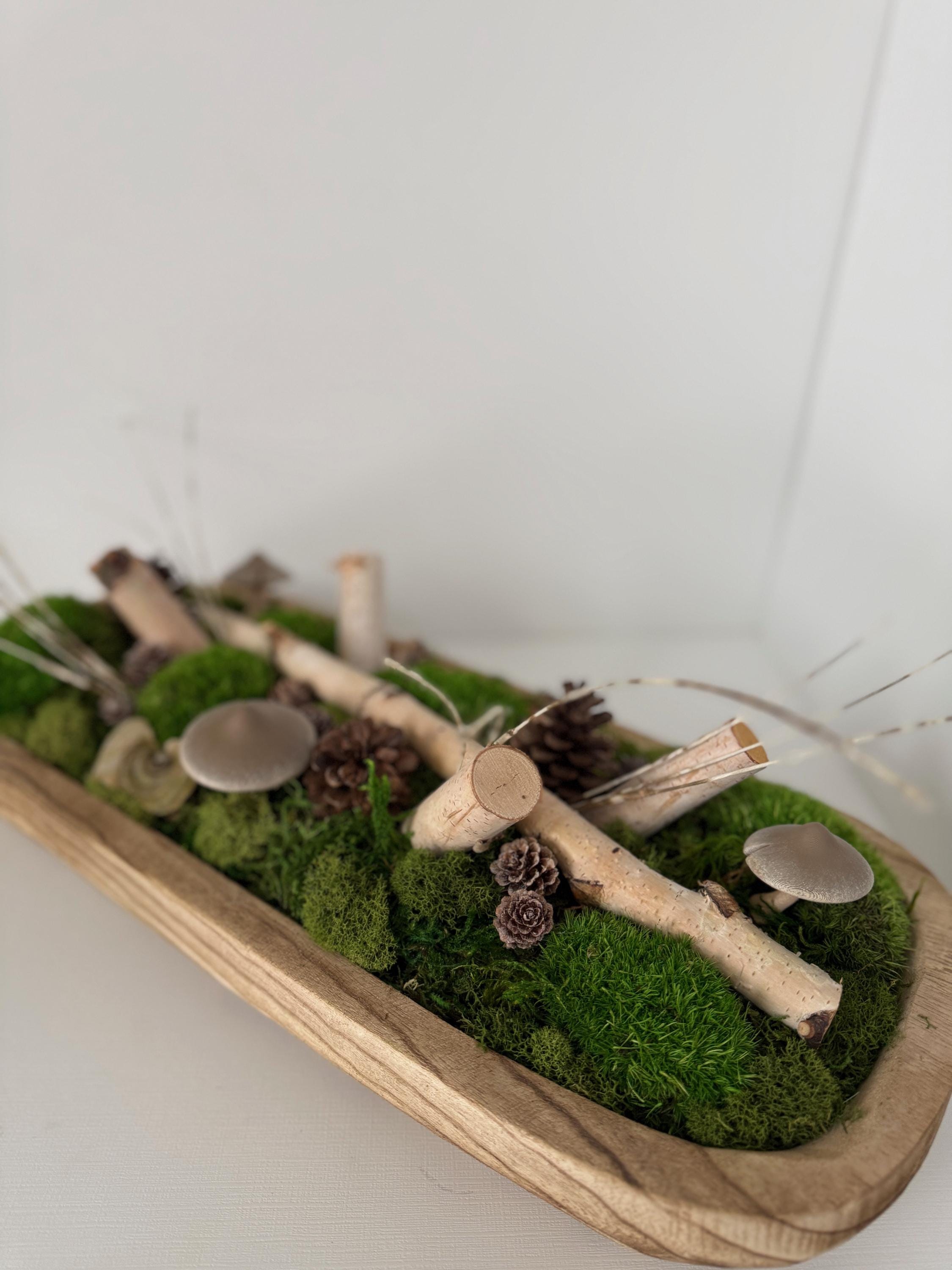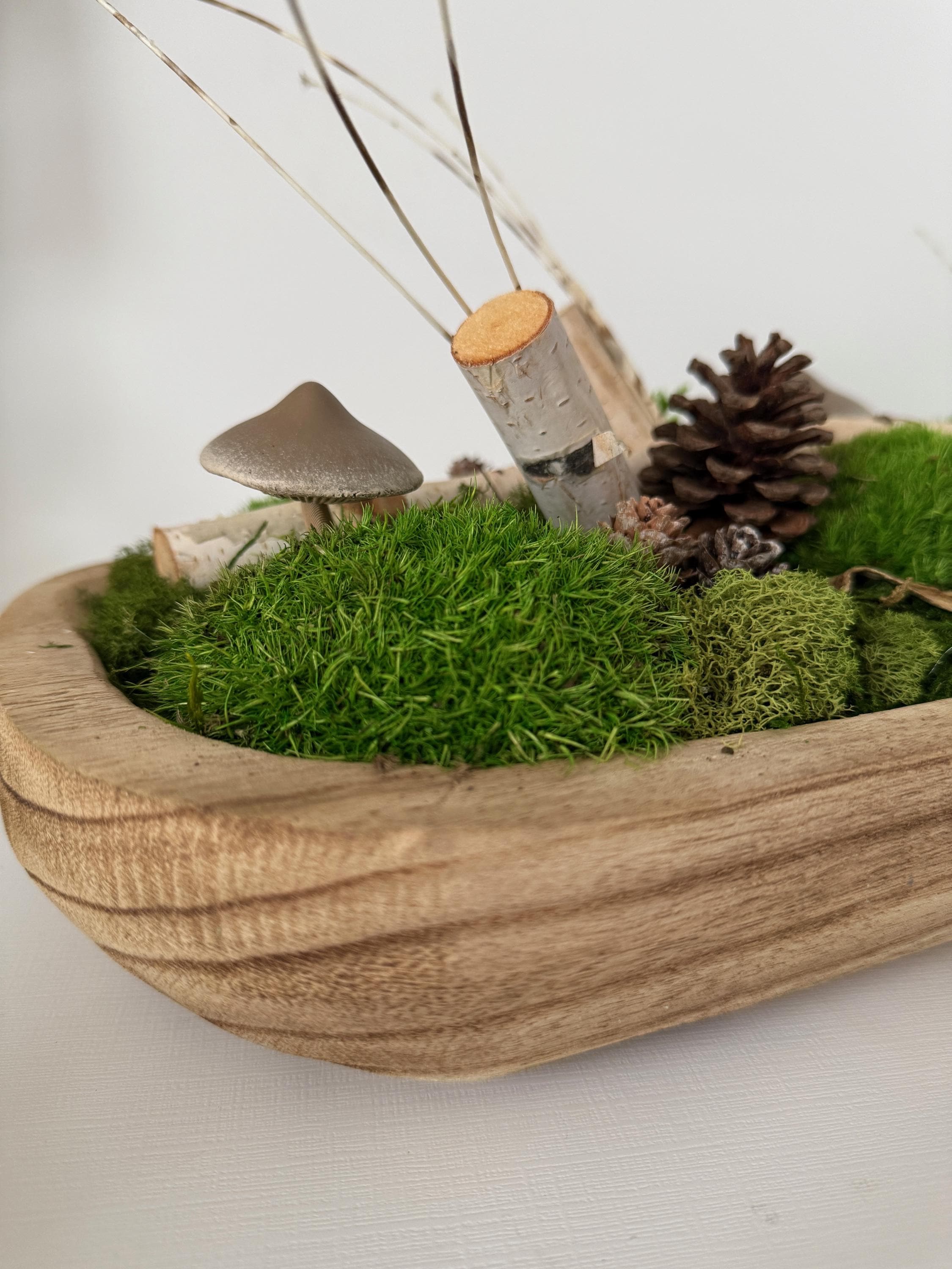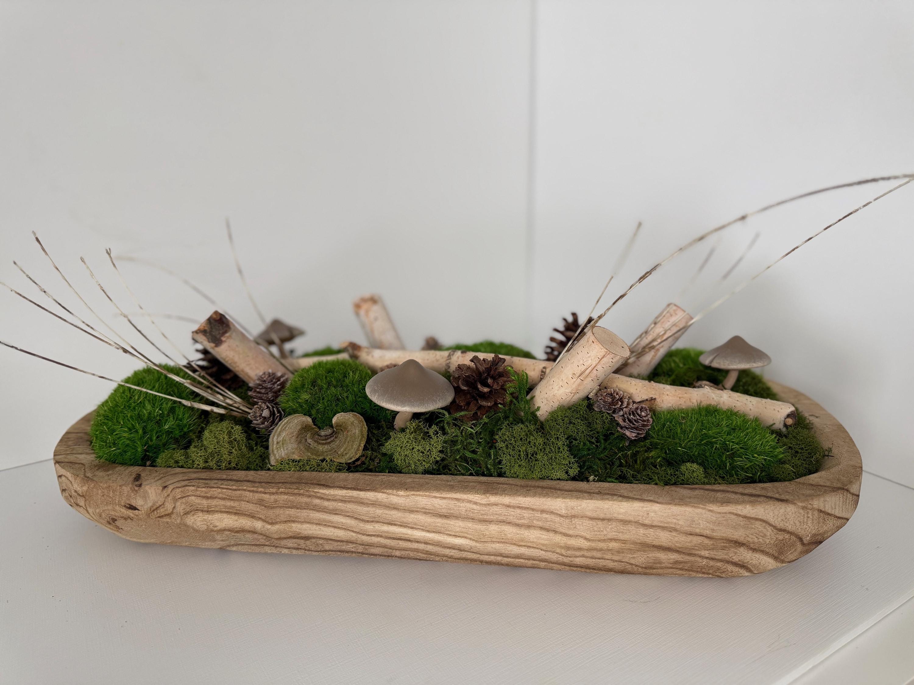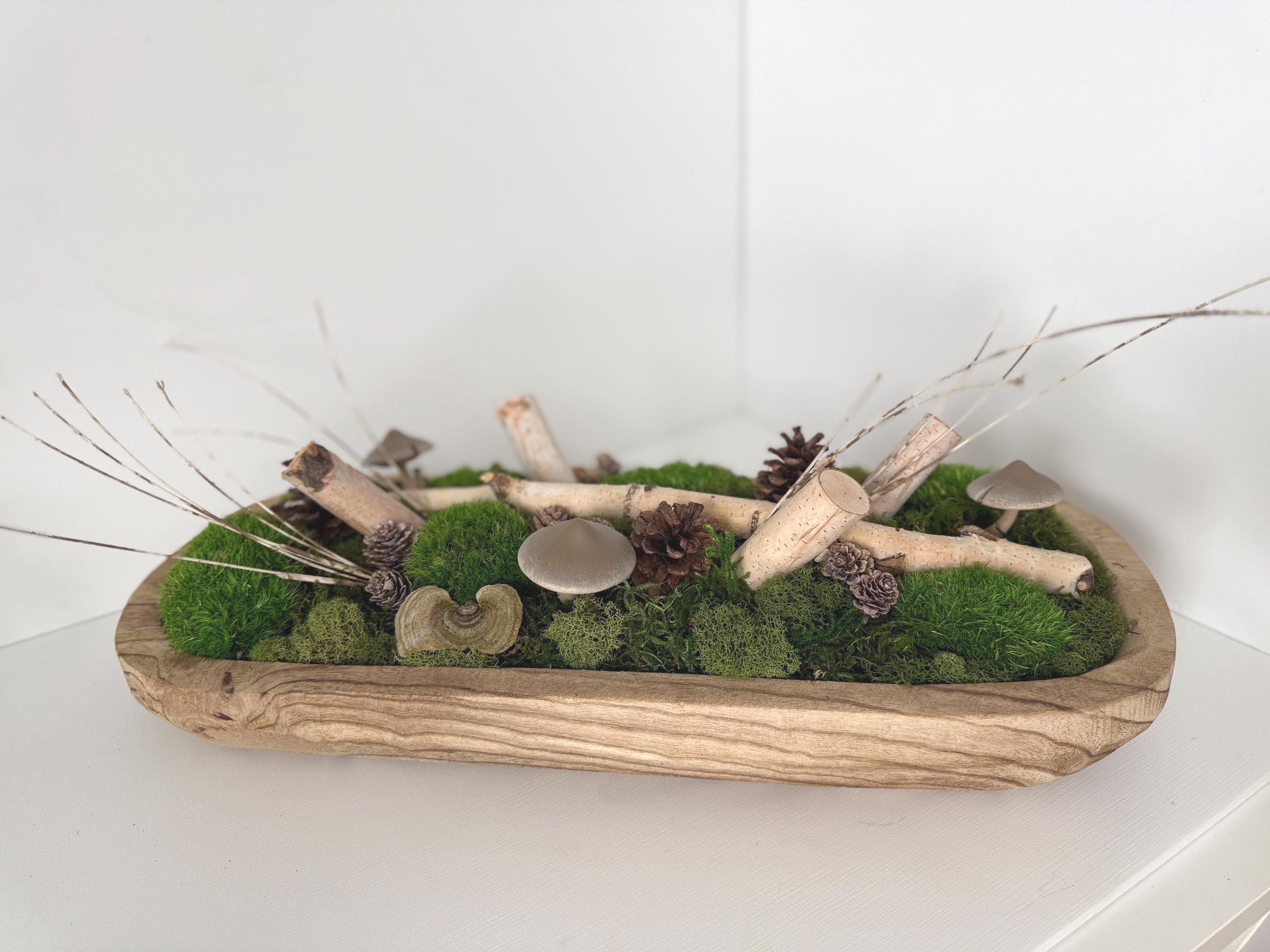 A large rustic, carved wooden dough bowl makes a great base for this winter woodland scene. Most materials foraged and preserved, right from the forest. Birch branches, preserved mosses, dried turkey tail mushrooms, pinecones, lichen and various natural elements. Mixed in are some faux greens in a frosty green. Sage, white, and wood. These bowls make the perfect table centerpiece all through winter, from first frost to Christmas and into the new year! Bring nature inside for the winter!