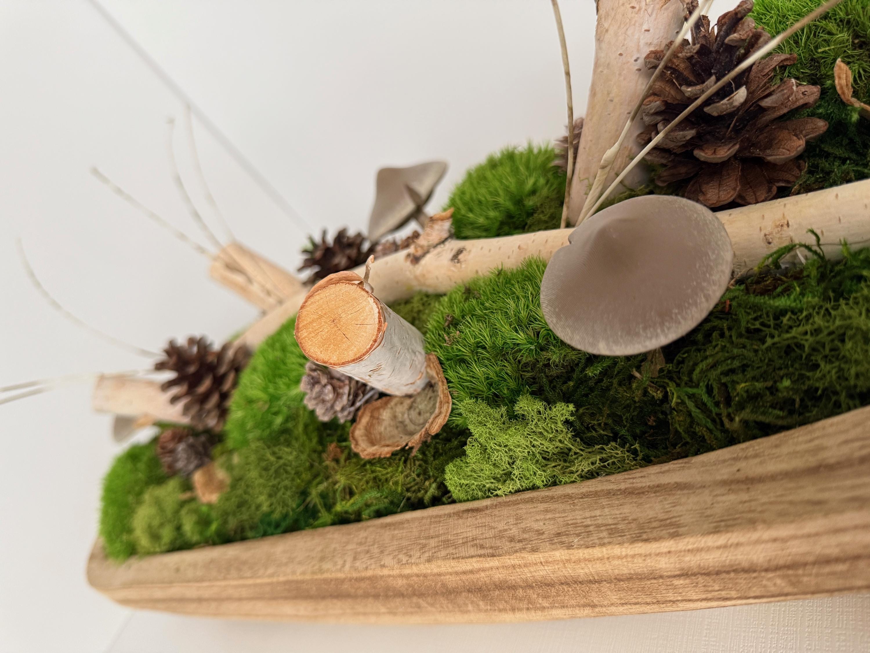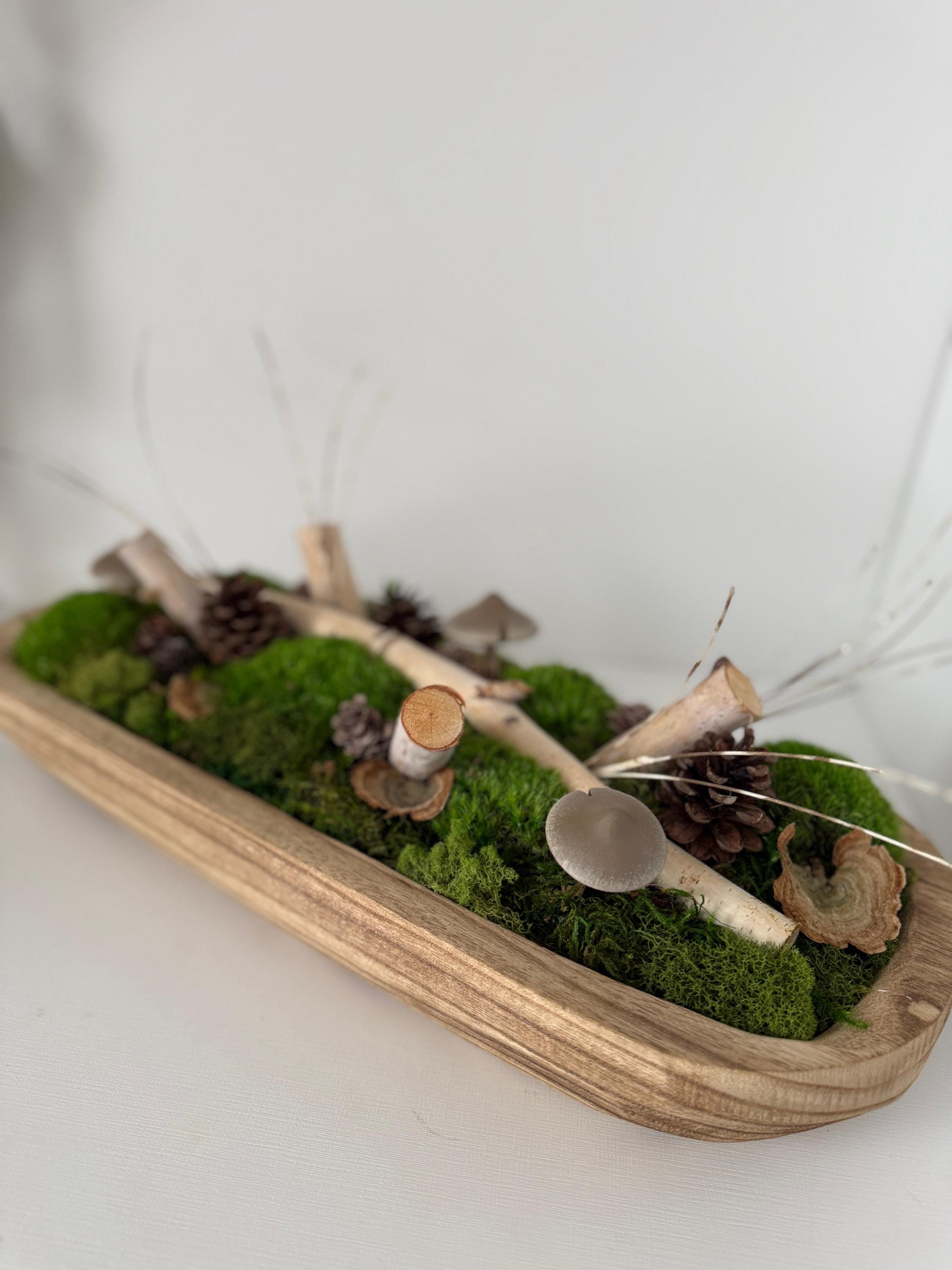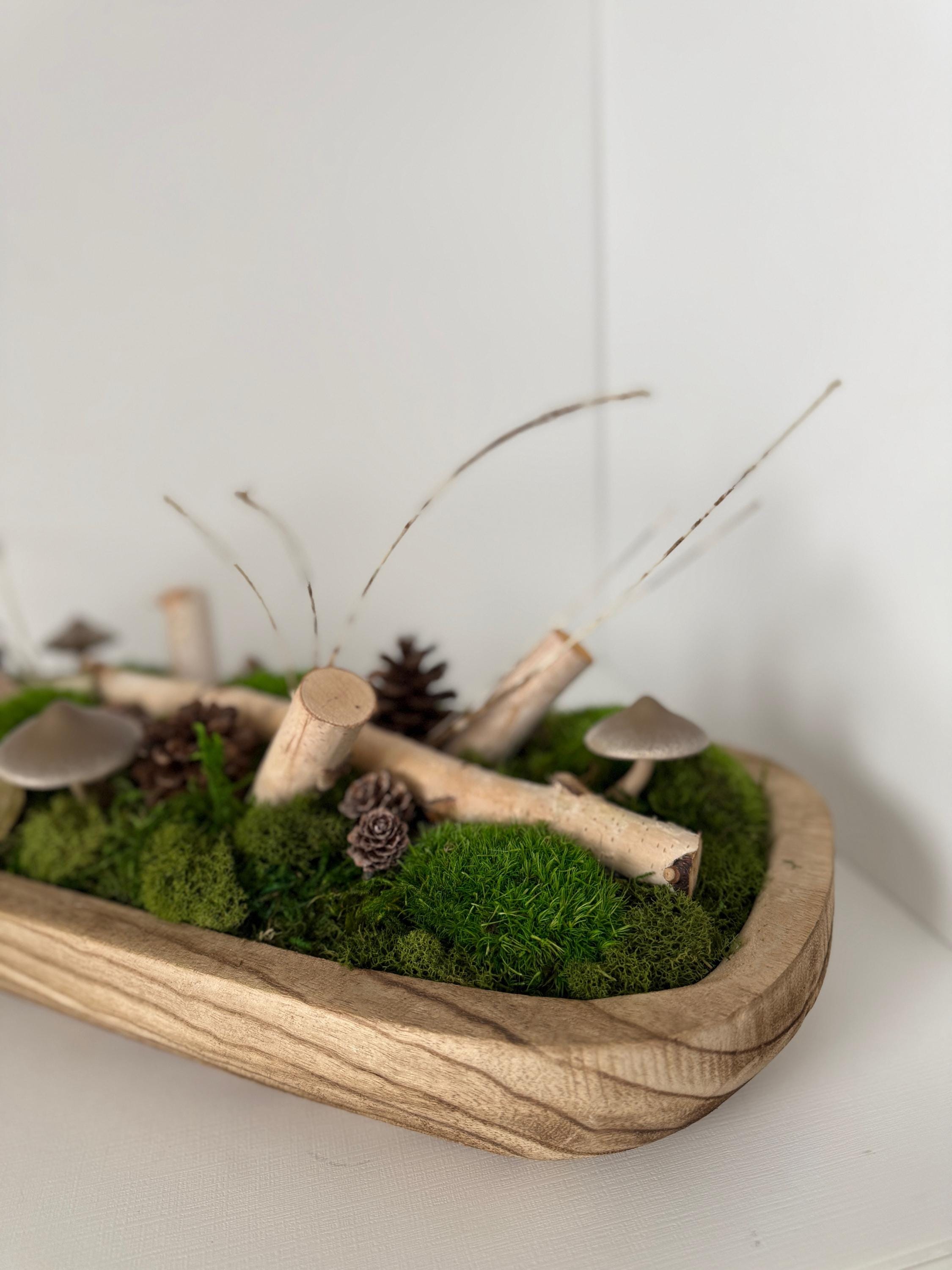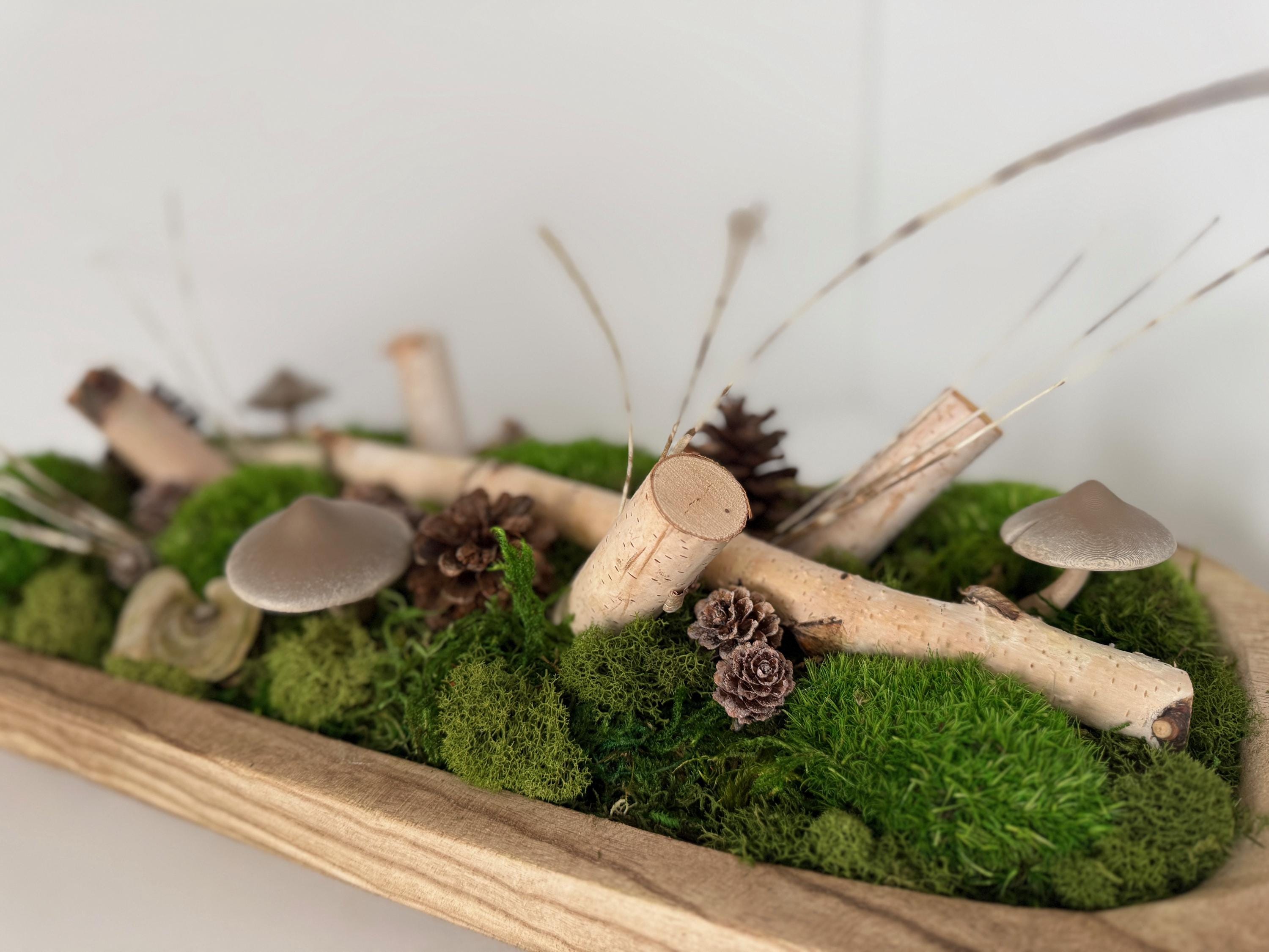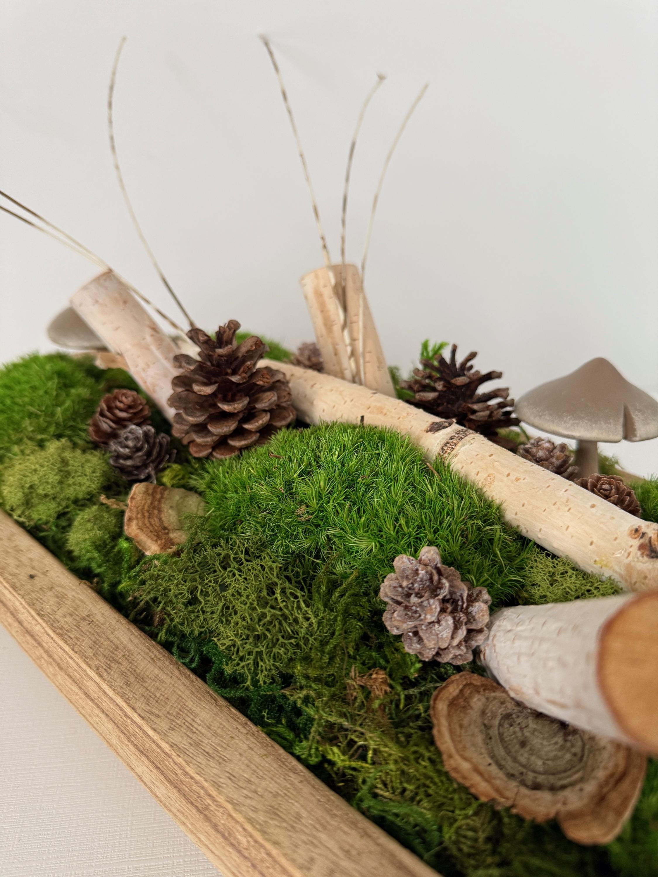 A large rustic, carved wooden dough bowl makes a great base for this winter woodland scene. Most materials foraged and preserved, right from the forest. Birch branches, preserved mosses, dried turkey tail mushrooms, pinecones, lichen and various natural elements. Mixed in are some faux greens in a frosty green. Sage, white, and wood. These bowls make the perfect table centerpiece all through winter, from first frost to Christmas and into the new year! Bring nature inside for the winter!
