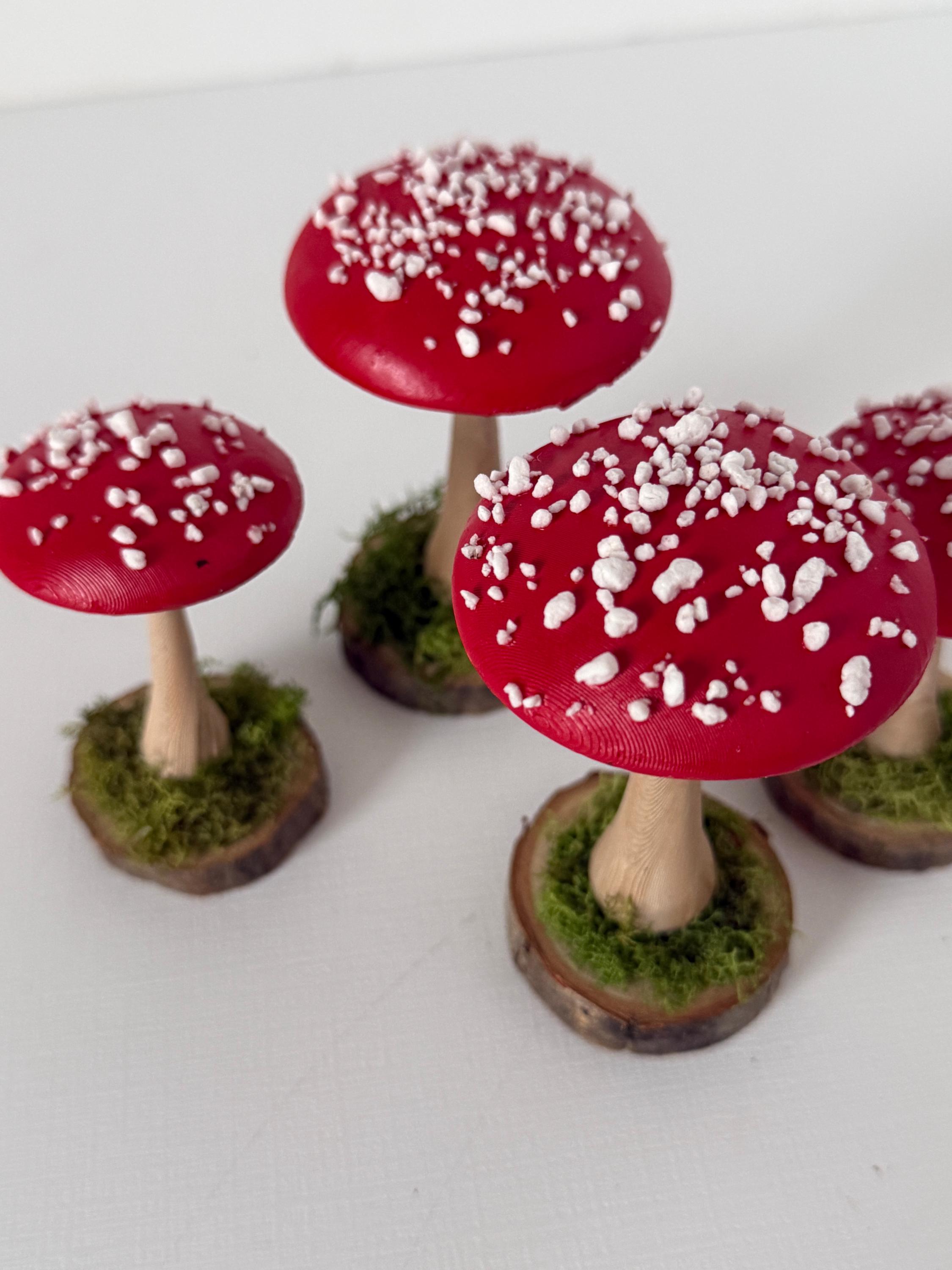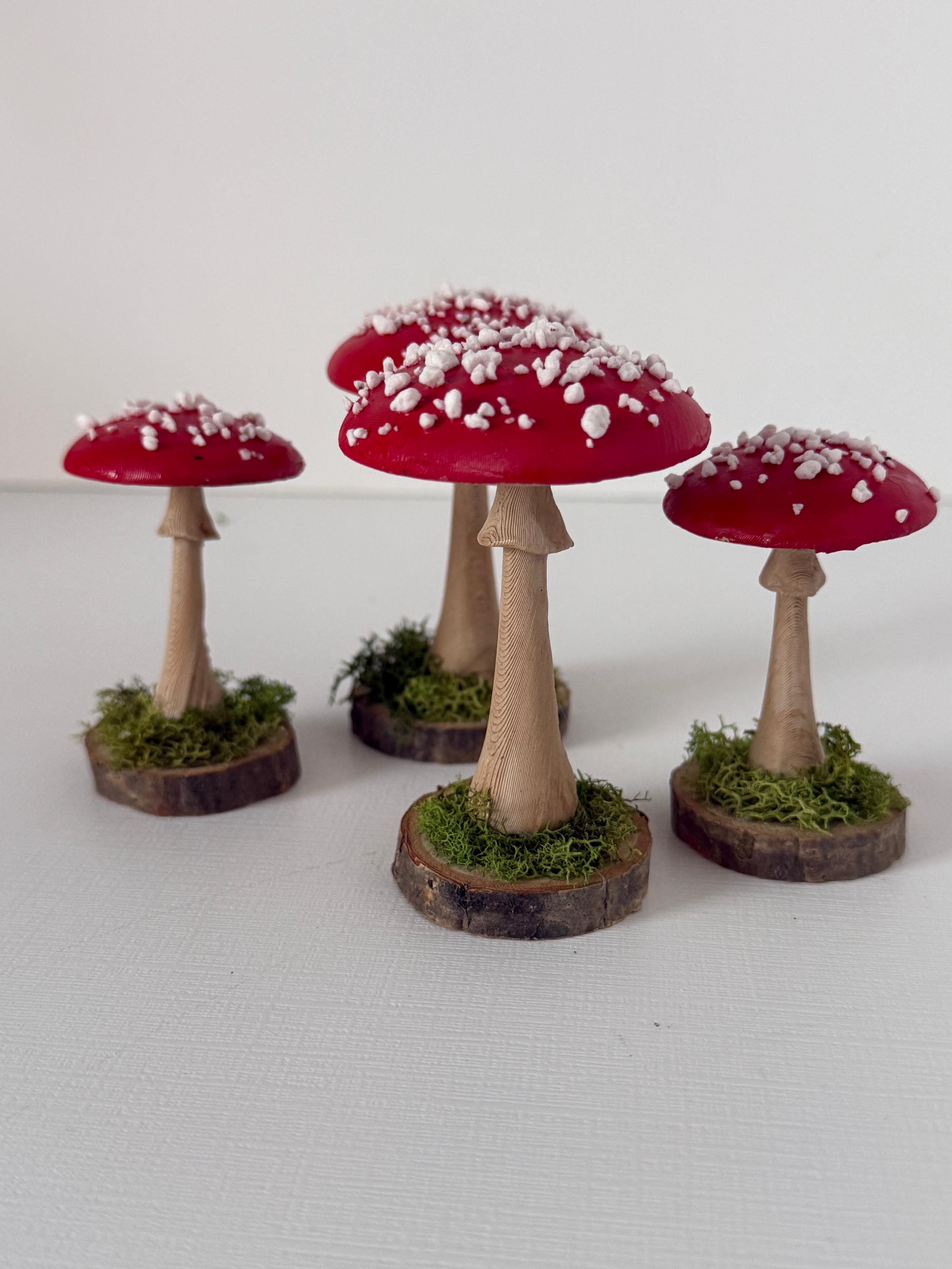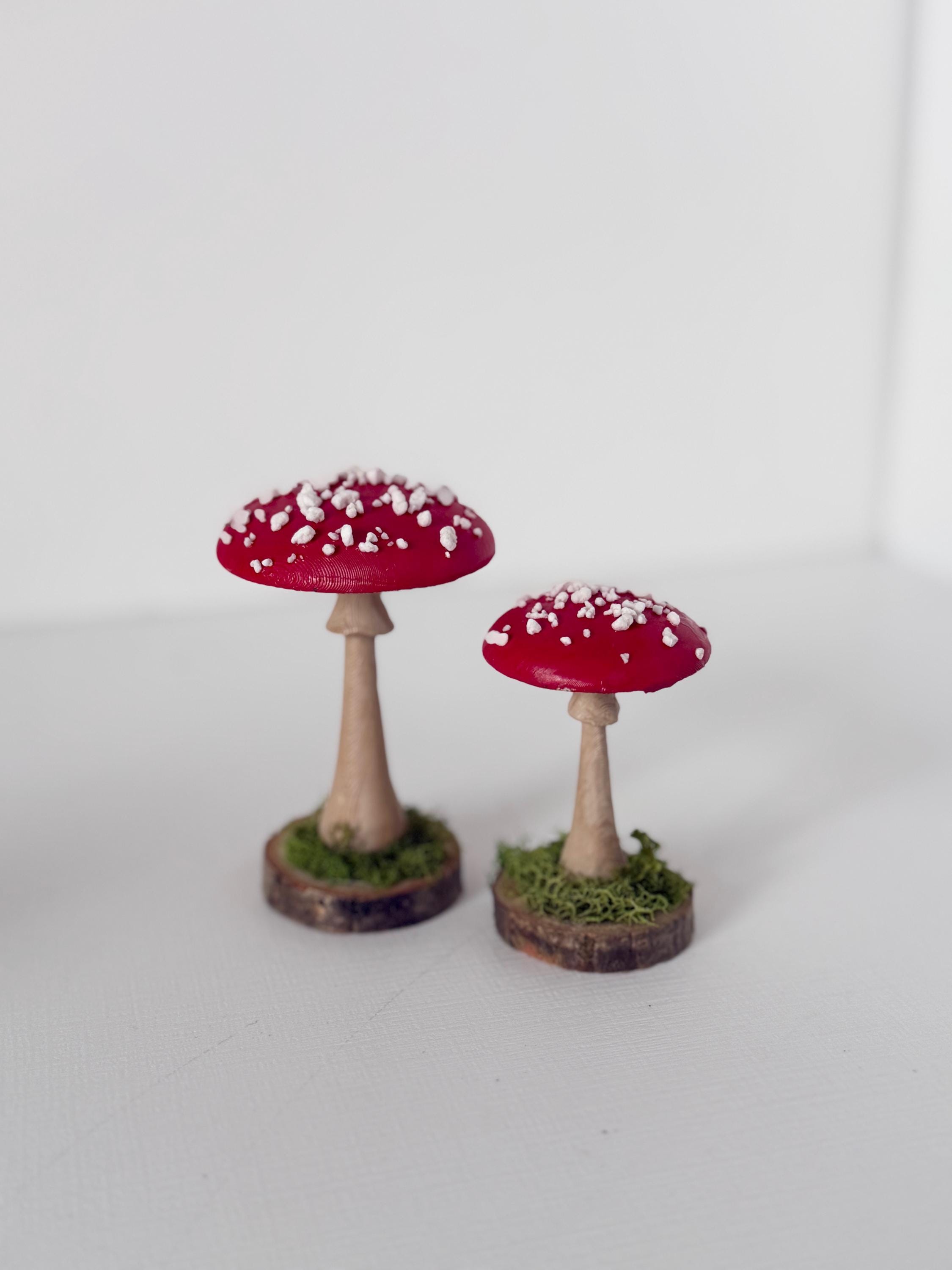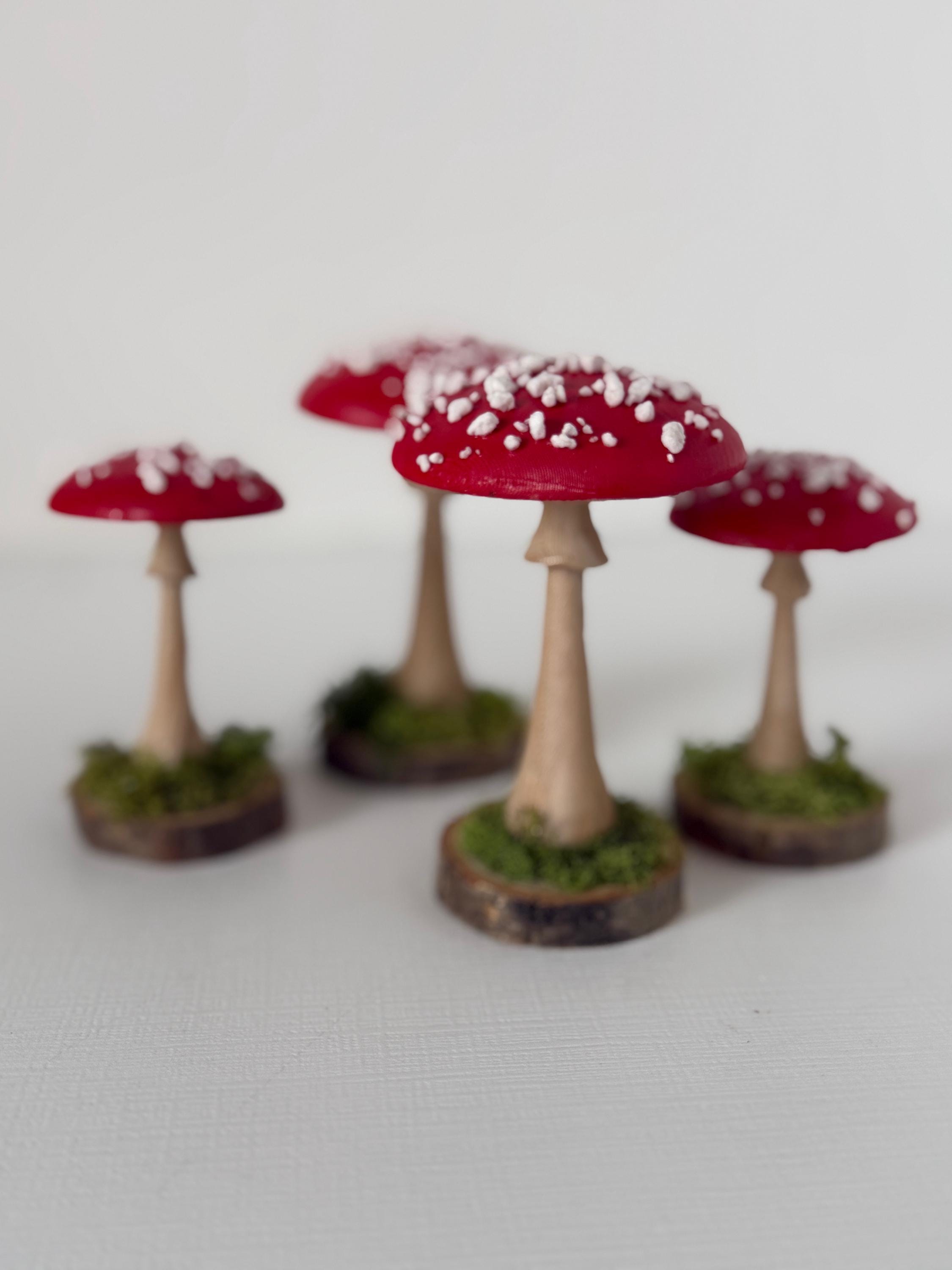 Little individual mushrooms for shelves, tablescapes, displays, place settings, centerpieces and so much more! Mushrooms are printed from PLA compostable filament, hand-painted, sealed and mounted on small wood-slice bases with some preserved mosses.