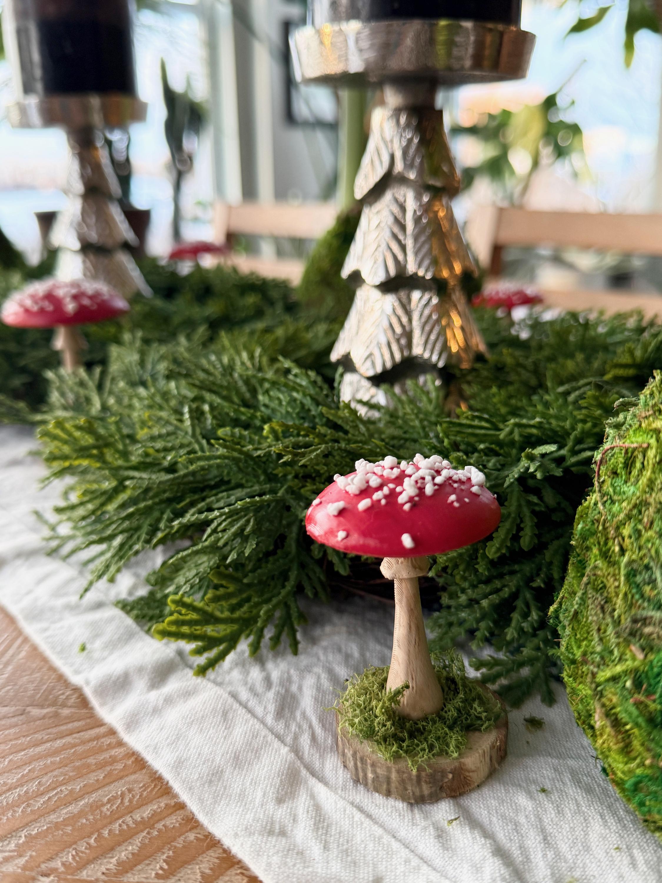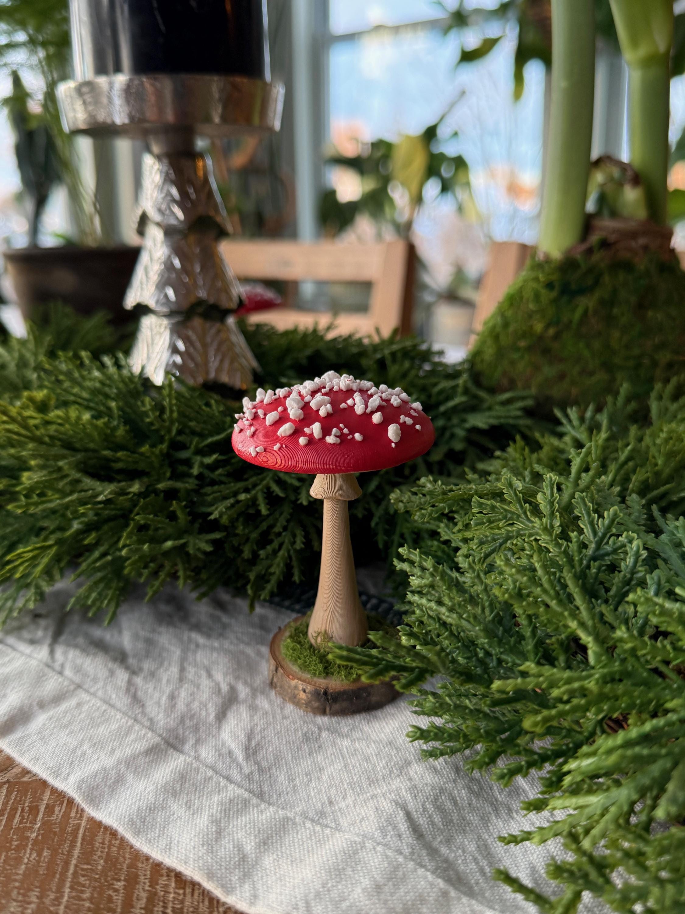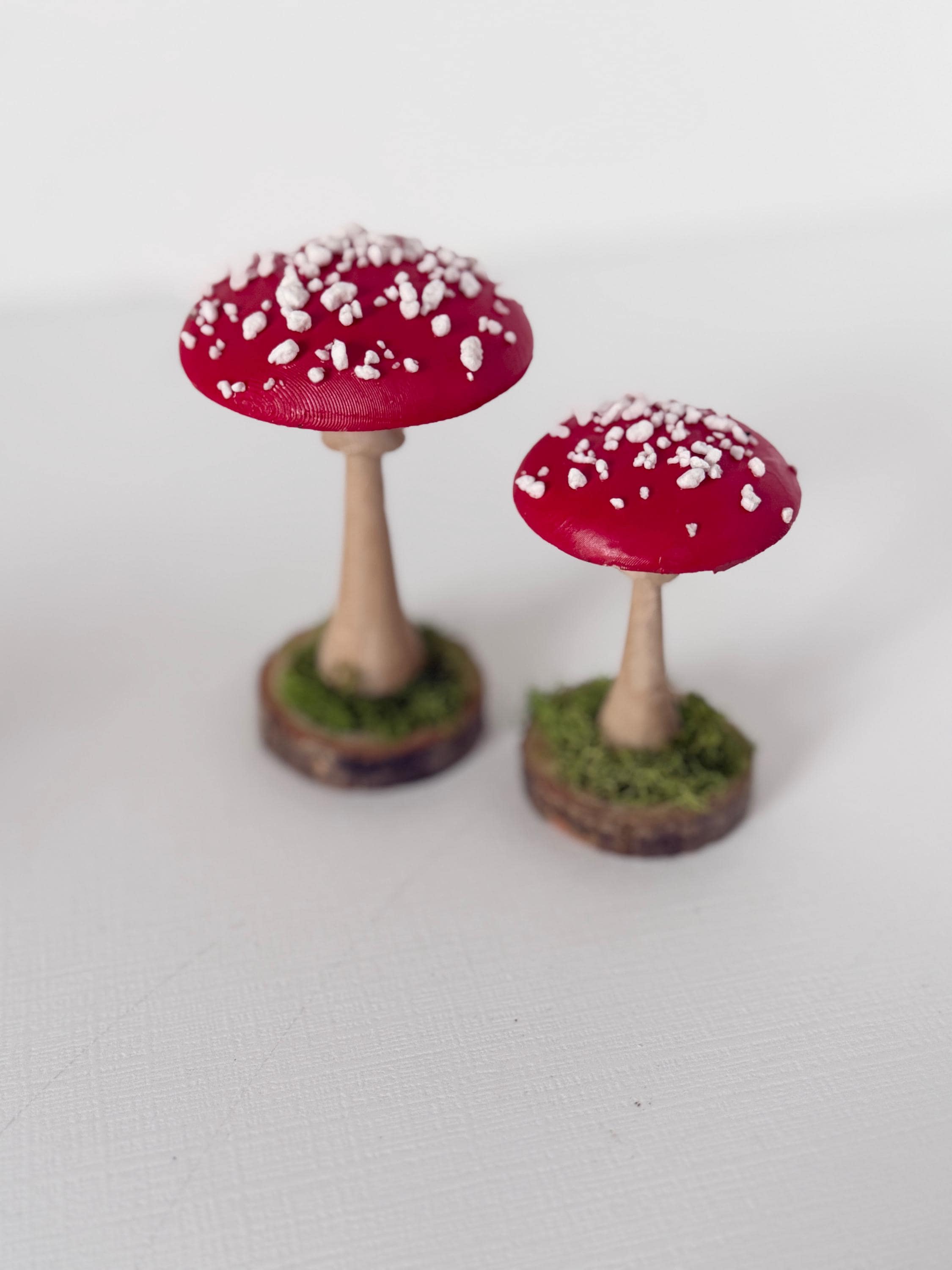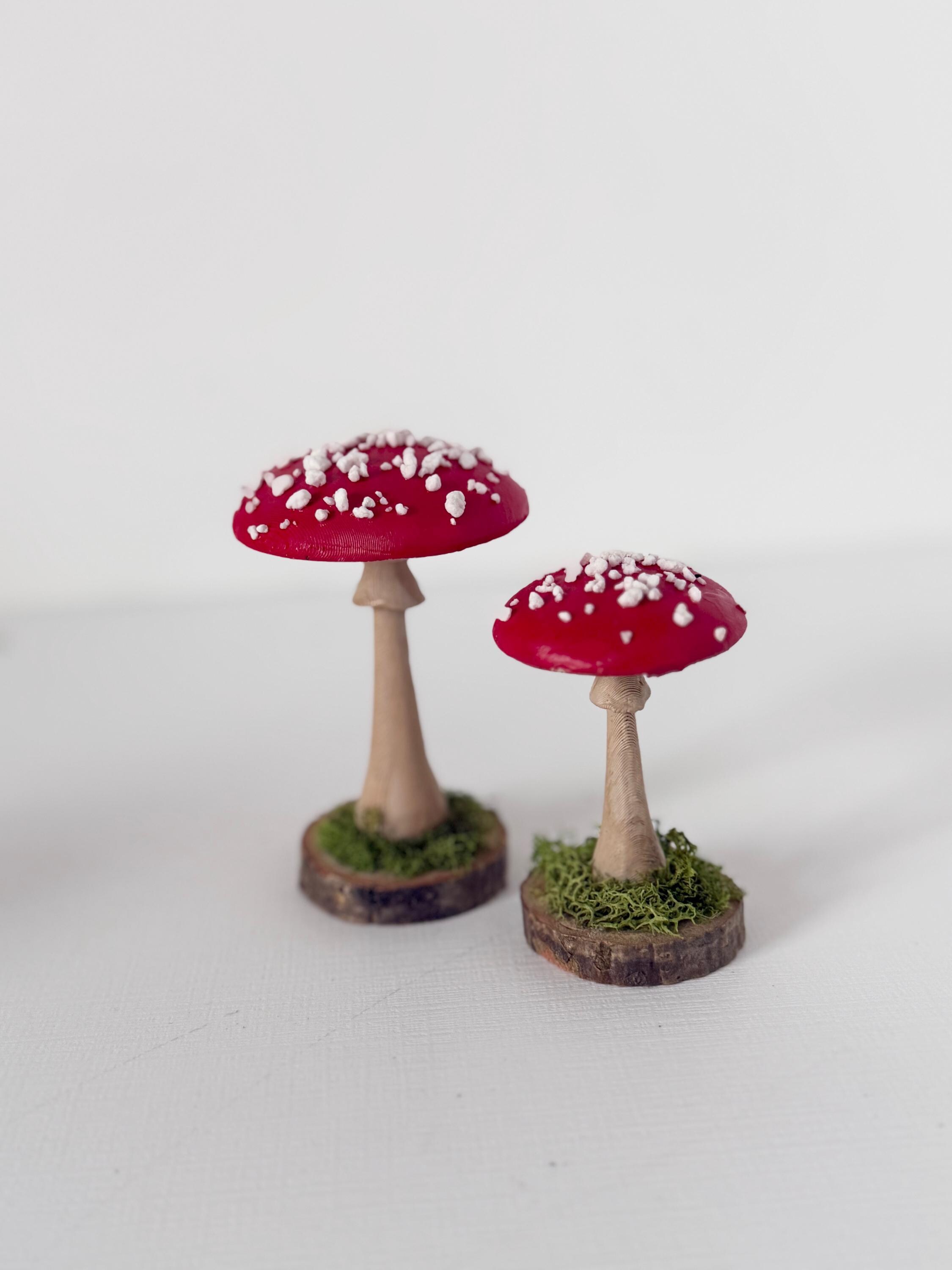 Little individual mushrooms for shelves, tablescapes, displays, place settings, centerpieces and so much more! Mushrooms are printed from PLA compostable filament, hand-painted, sealed and mounted on small wood-slice bases with some preserved mosses.