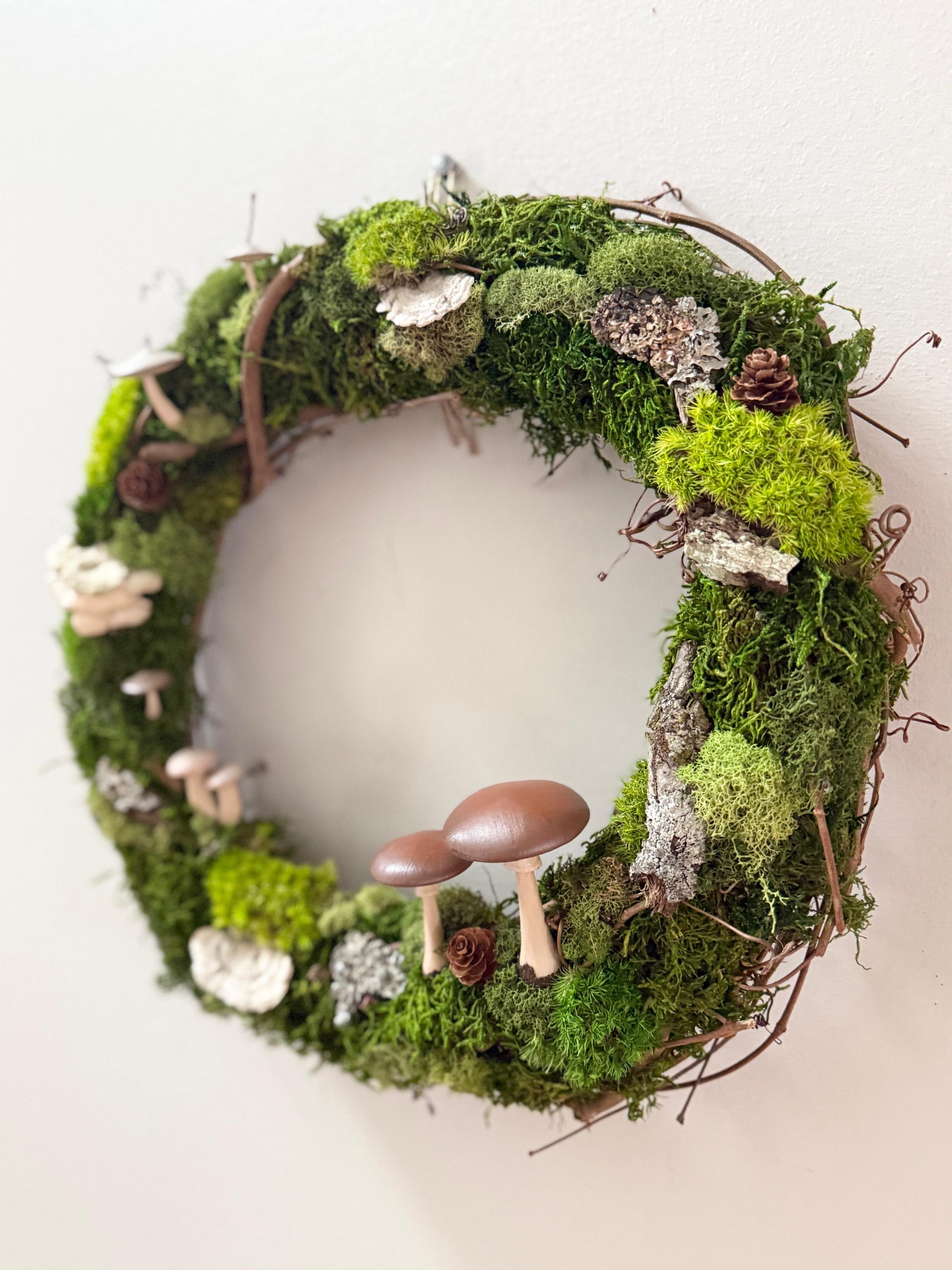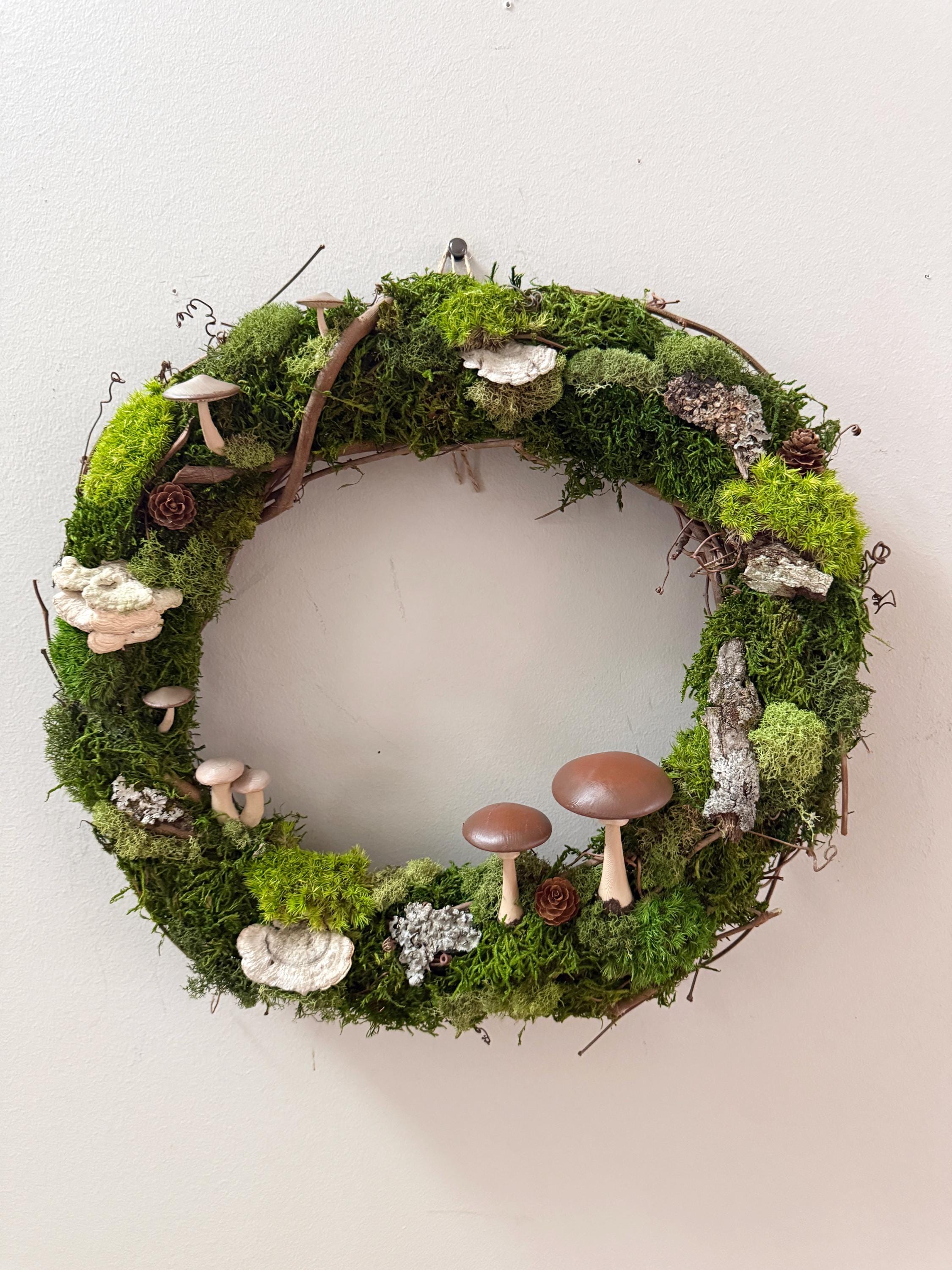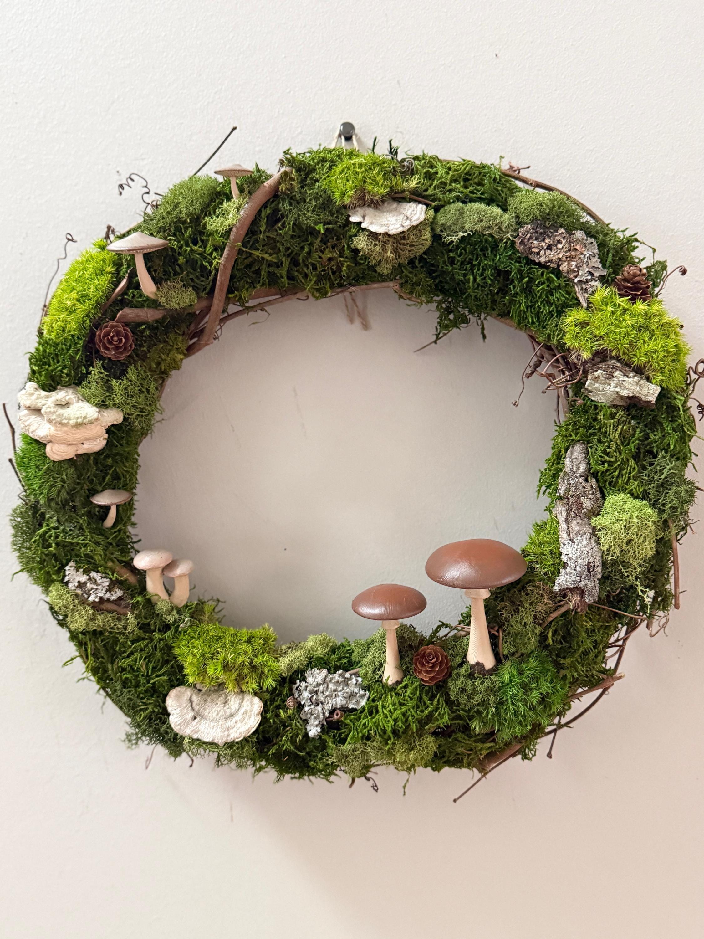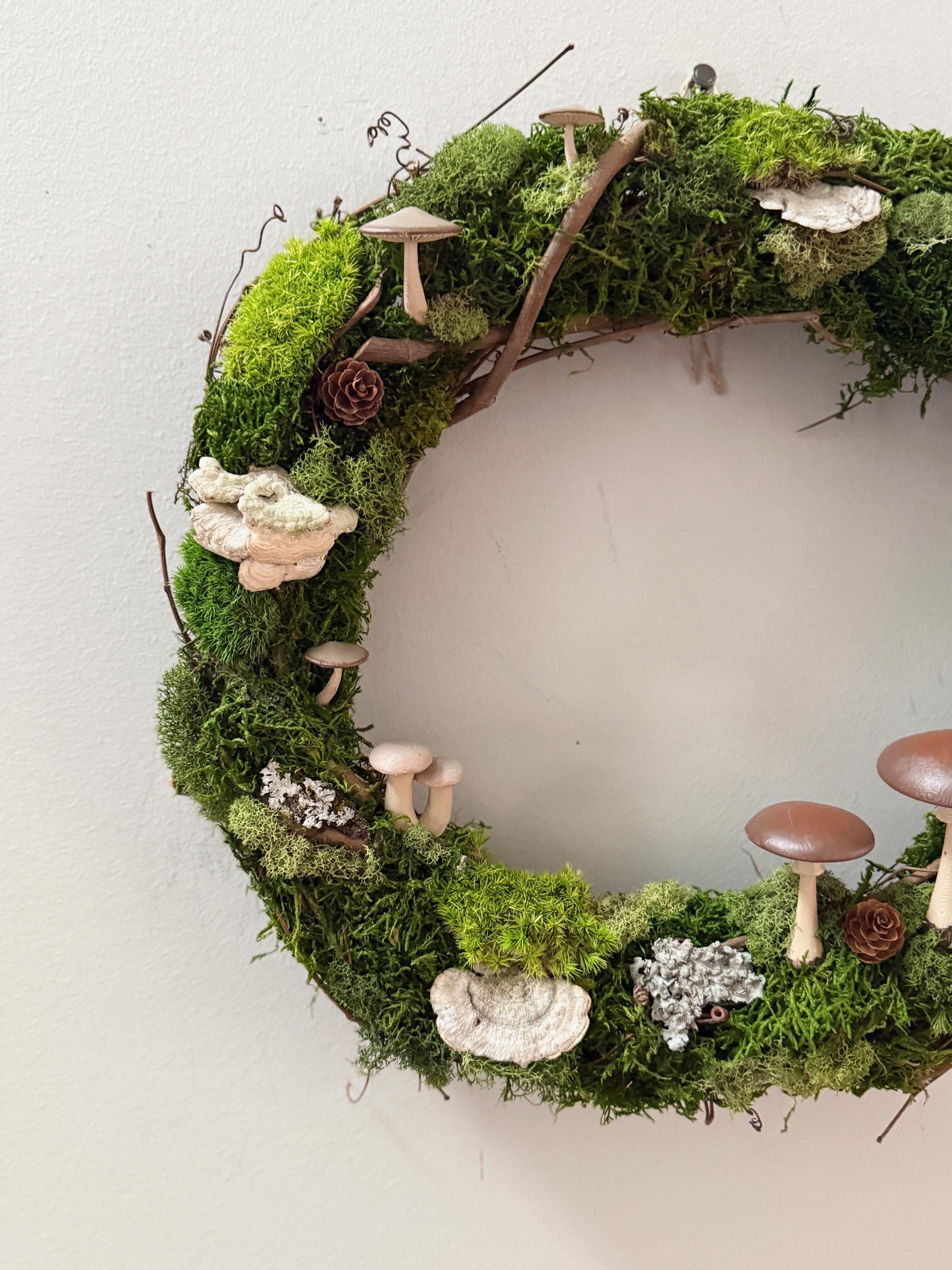 Mushroom Moss Wreath: 14" Living Wall Art, Forest Decor
