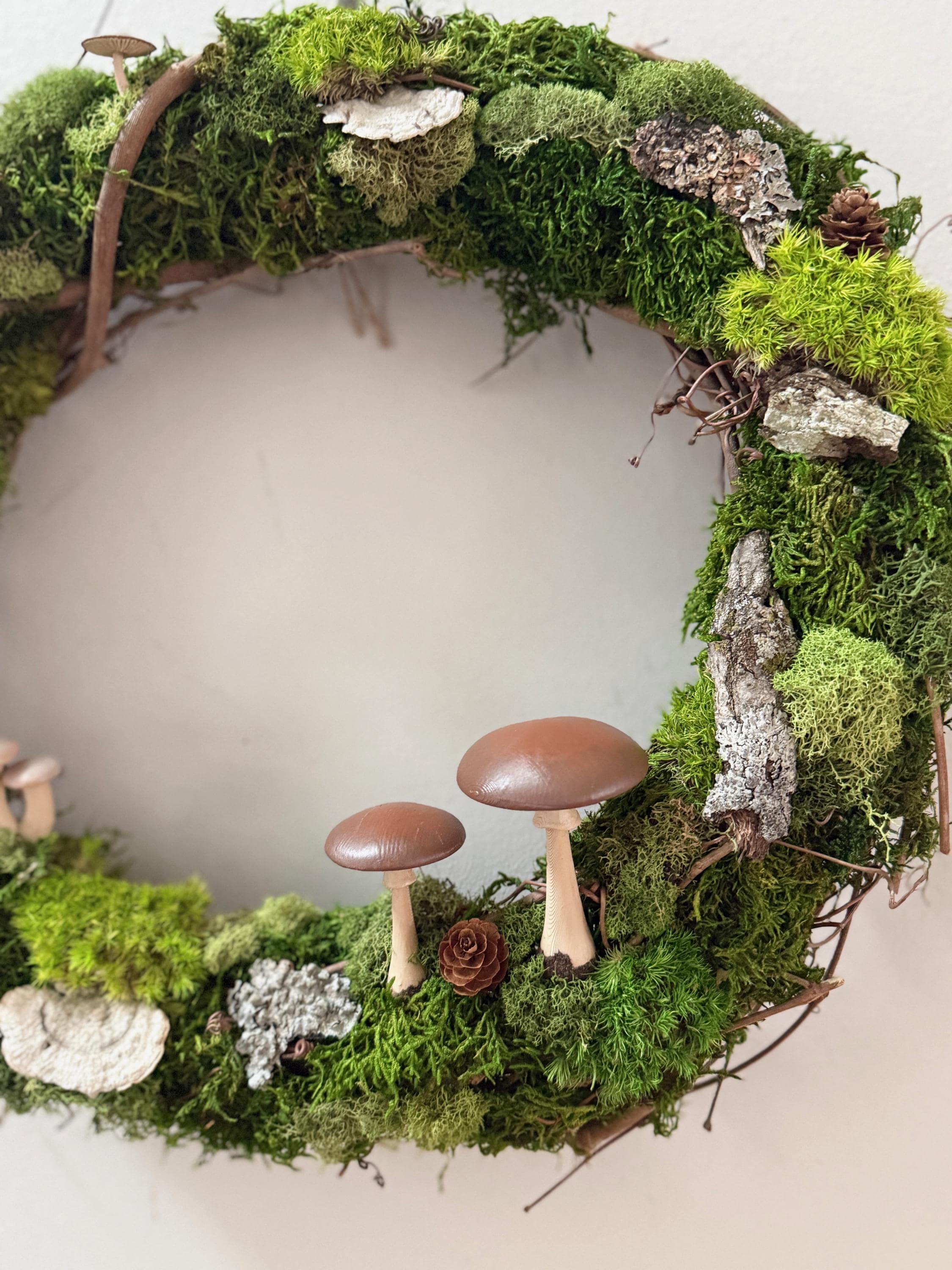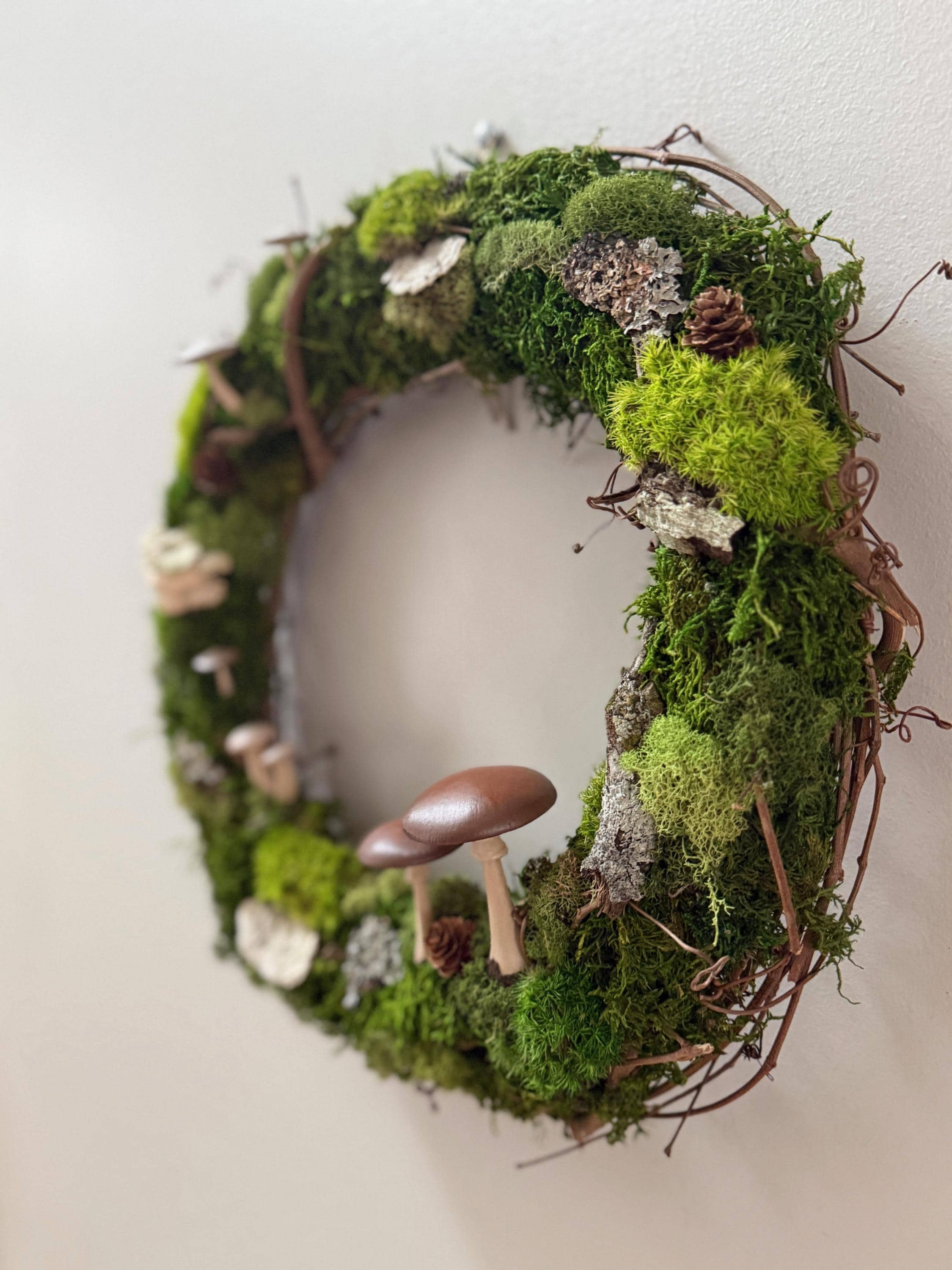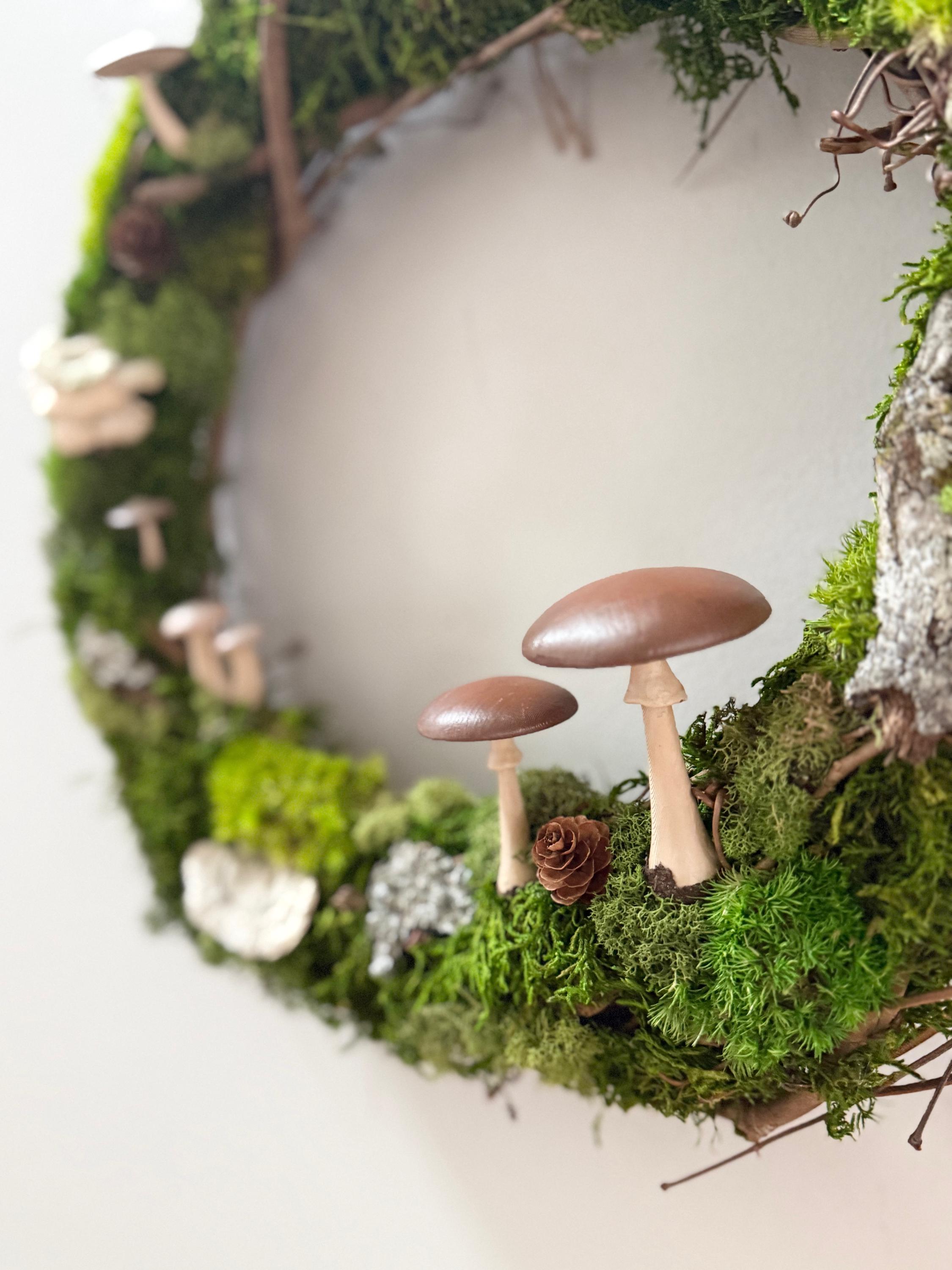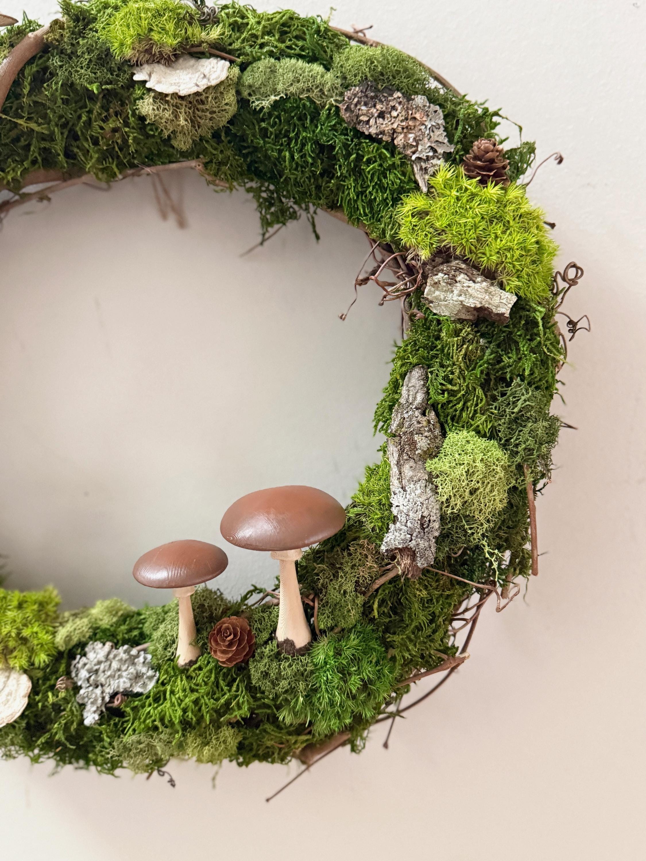 Mushroom Moss Wreath: 14" Living Wall Art, Forest Decor