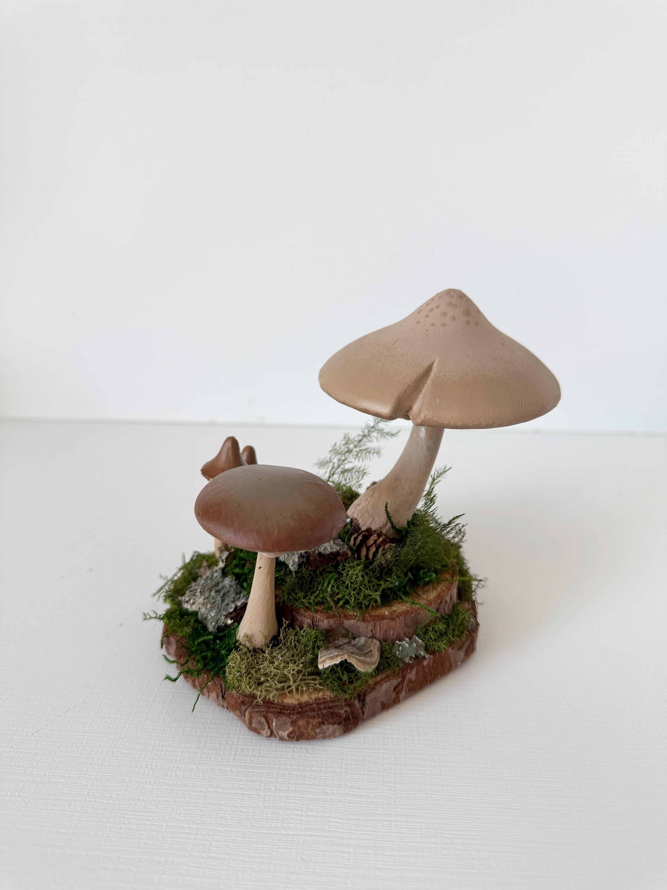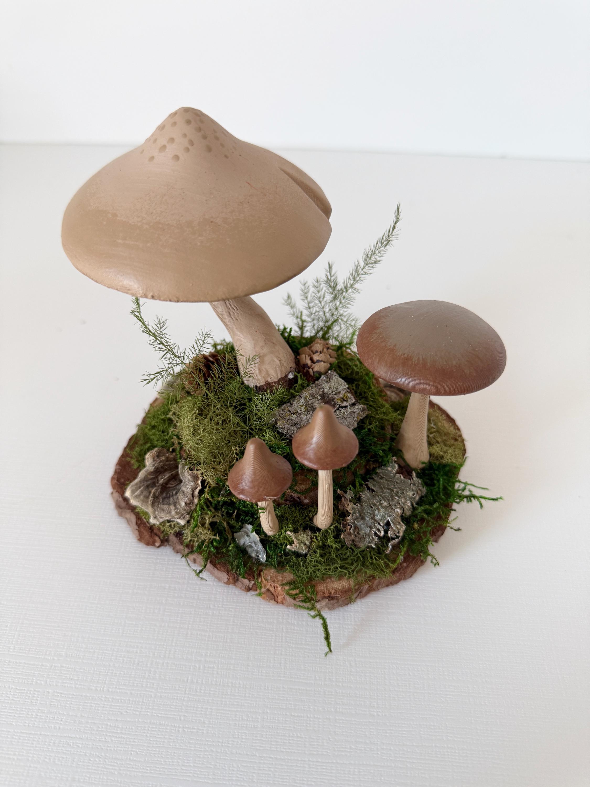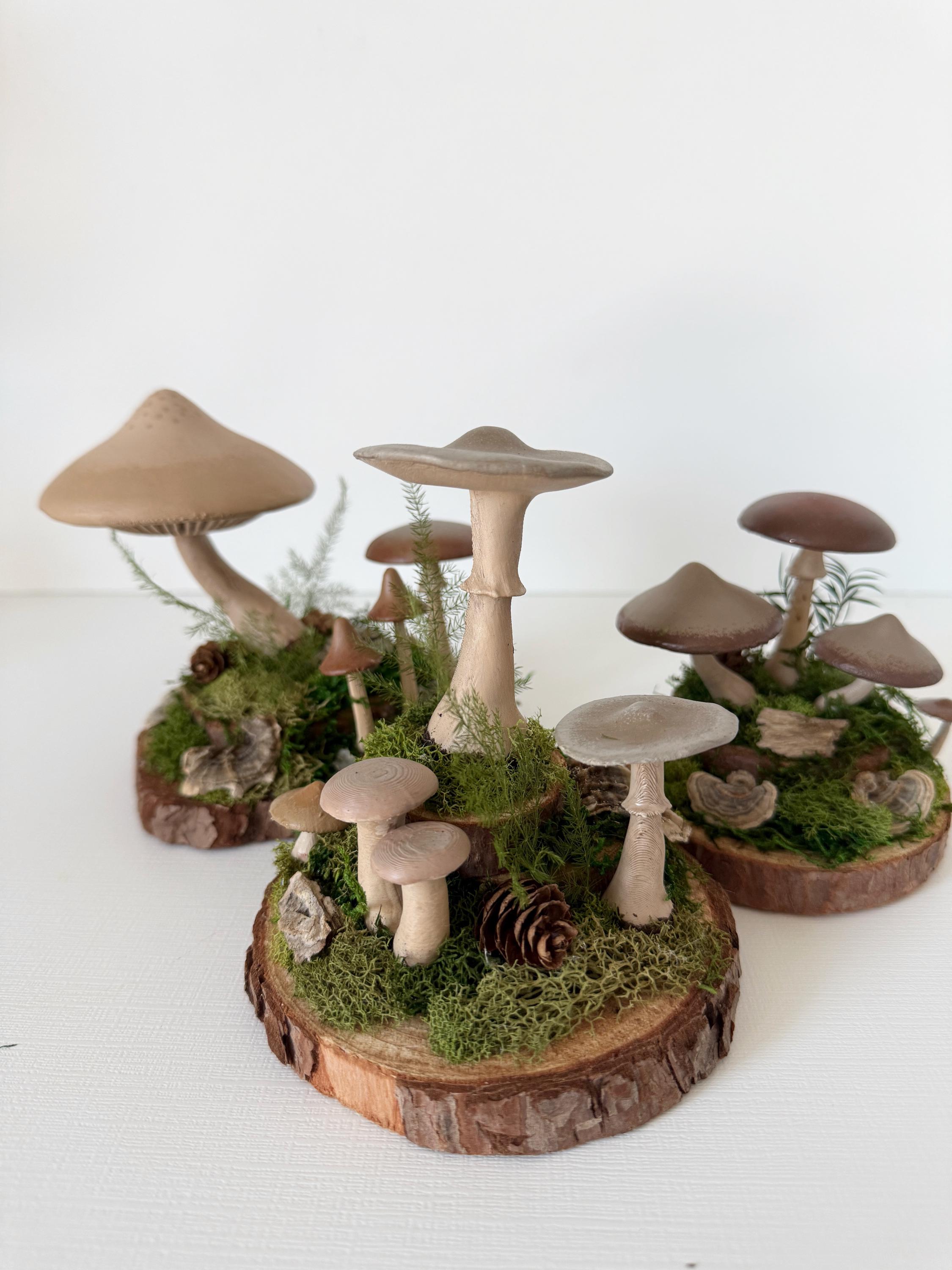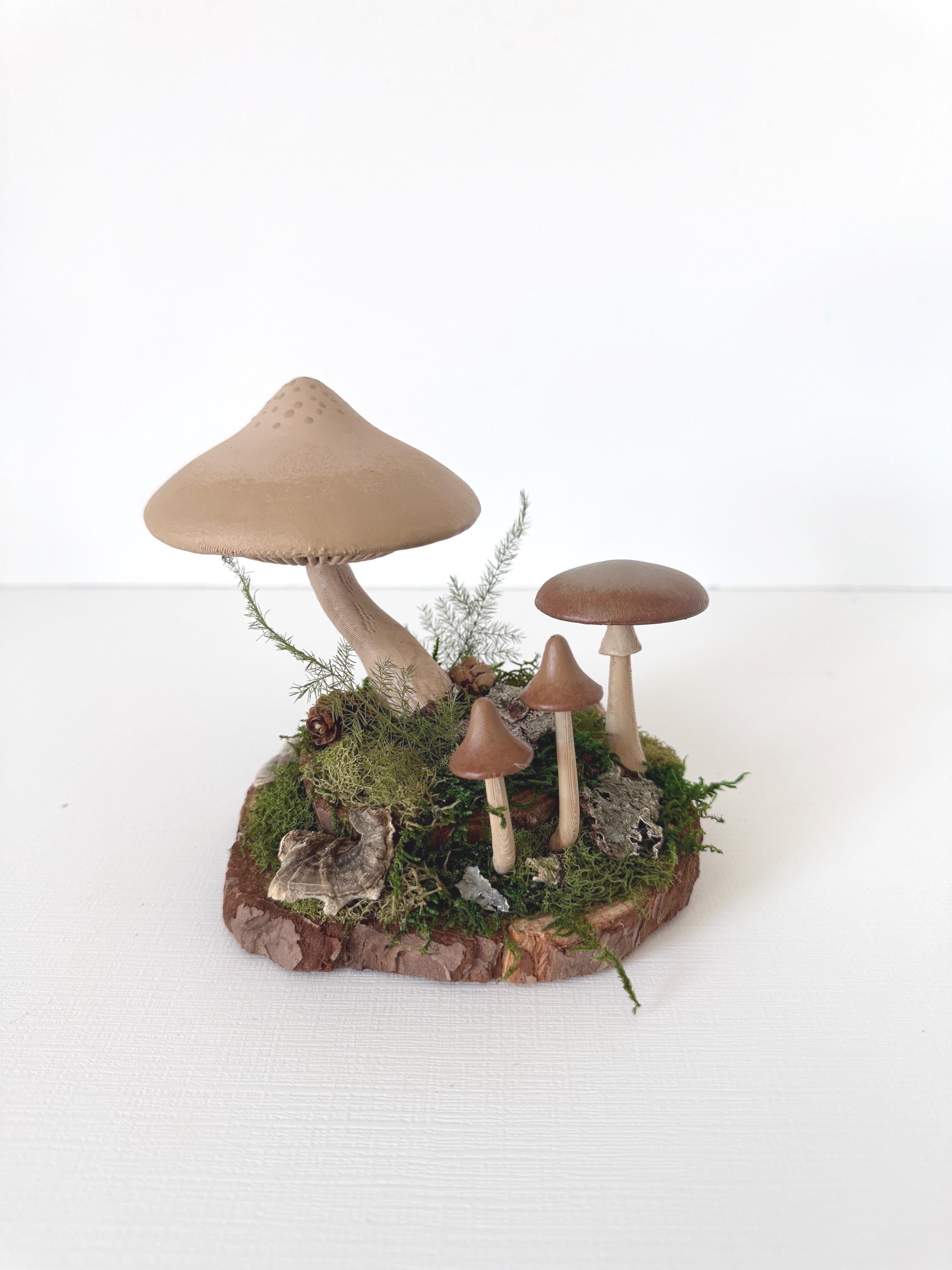 Realistic hand-painted mushrooms in a cute little nature scene. Real preserved moss and bark require no maintenance but bring the same natural element to your home and office as houseplants. Mushrooms are printed with eco-friendly, compostable PLA and hand painted. Base is a real slice of hardwood with bark edges.