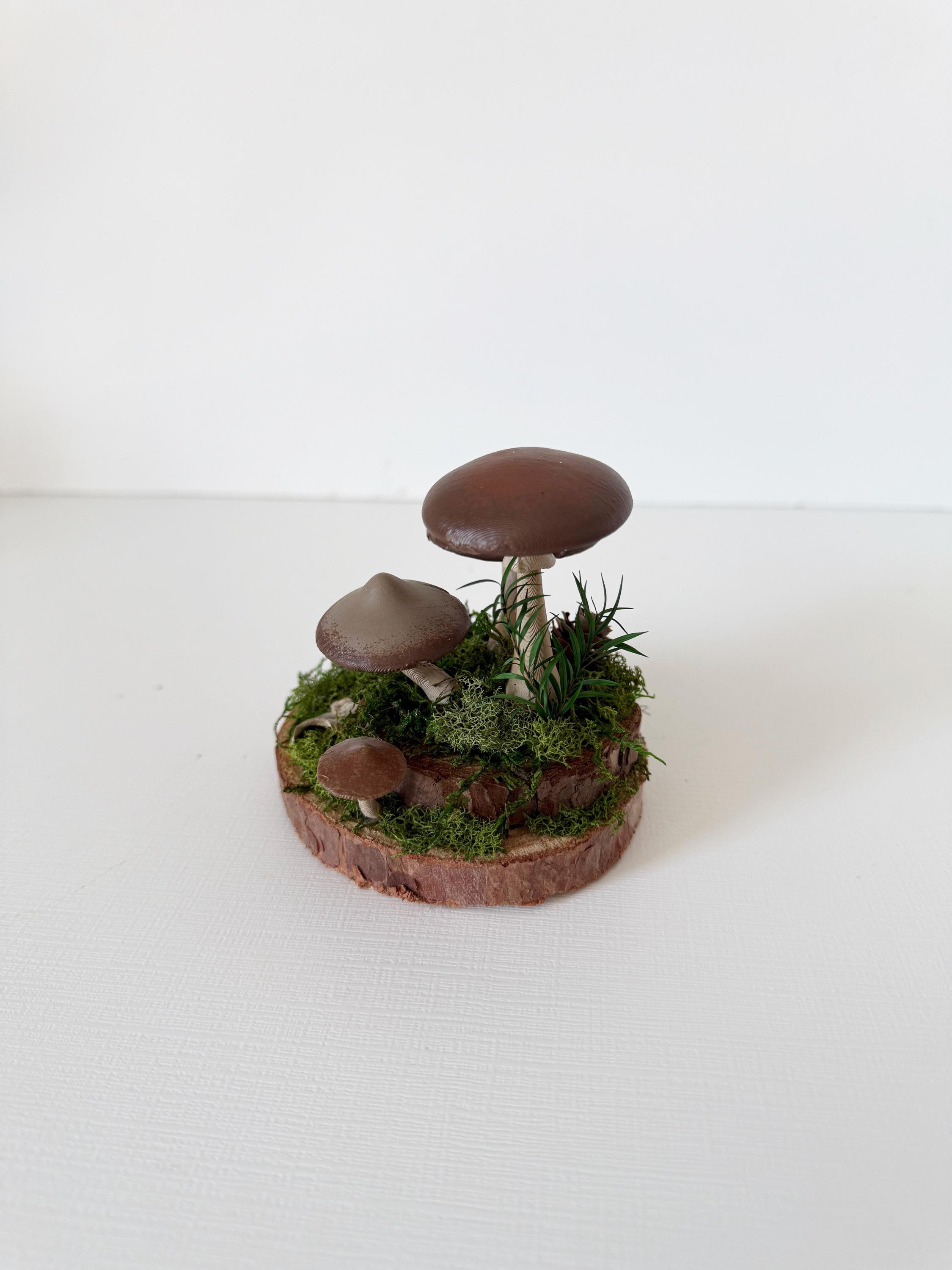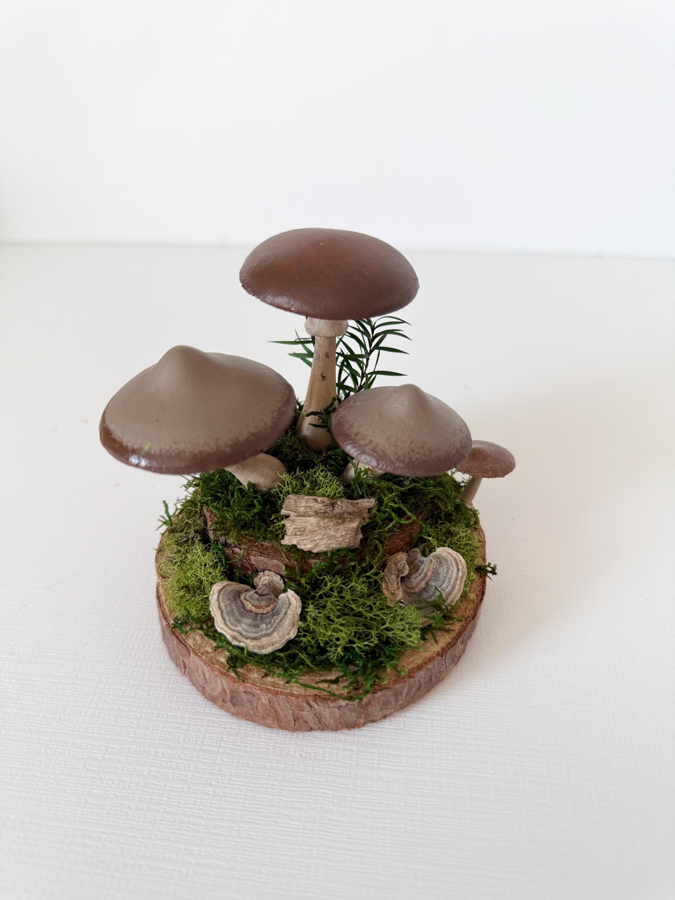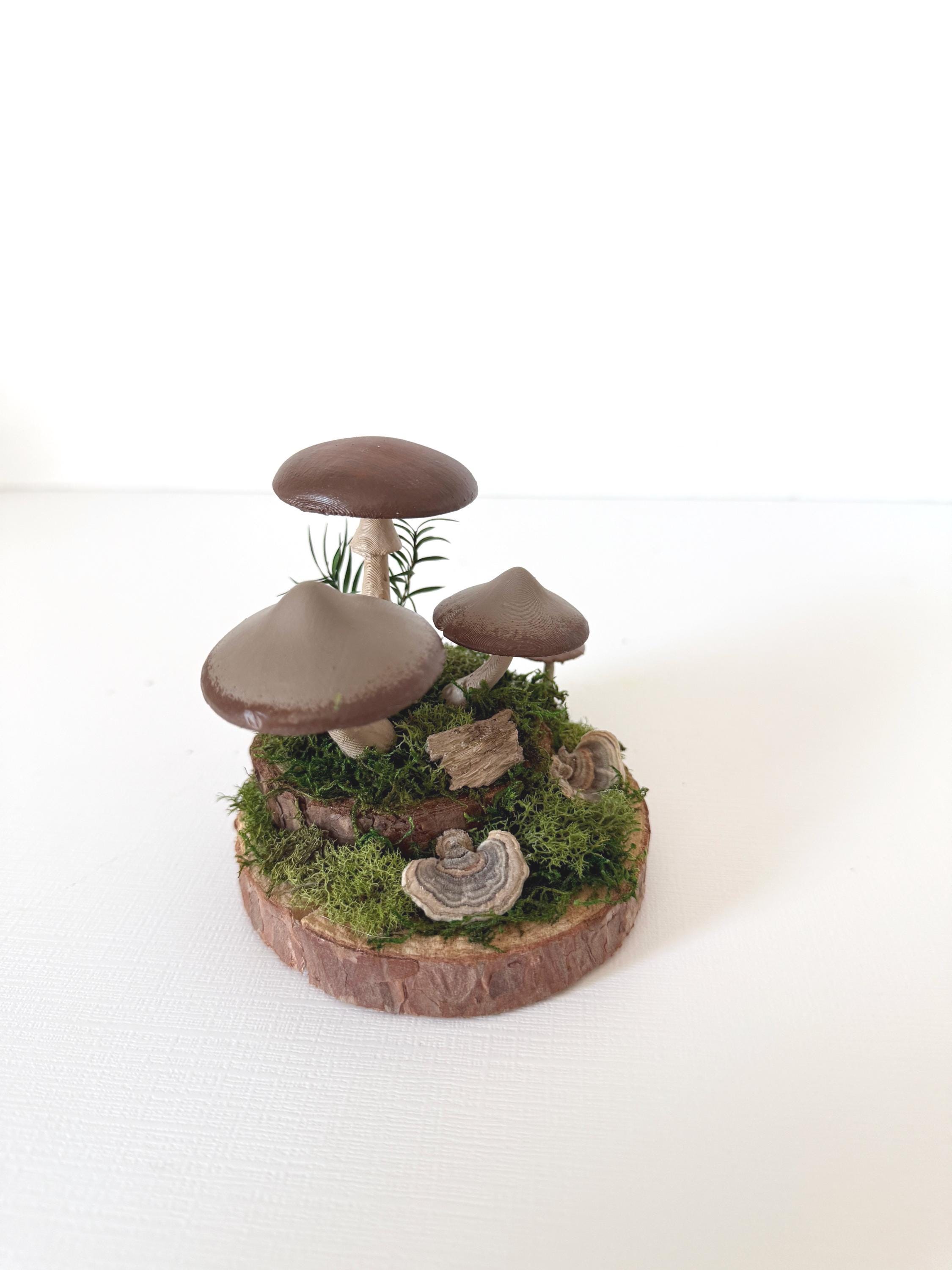 Realistic hand-painted mushrooms in a cute little nature scene. Real preserved moss and bark require no maintenance but bring the same natural element to your home and office as houseplants. Mushrooms are printed with eco-friendly, compostable PLA and hand painted. Base is a real slice of hardwood with bark edges.