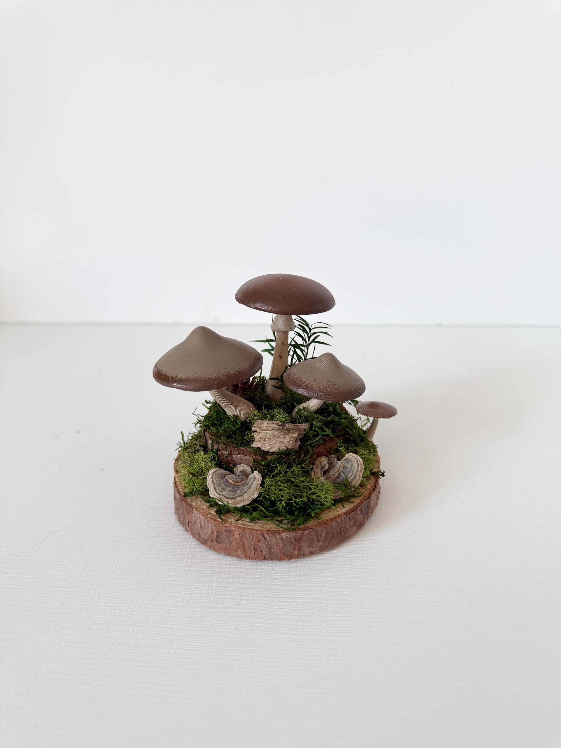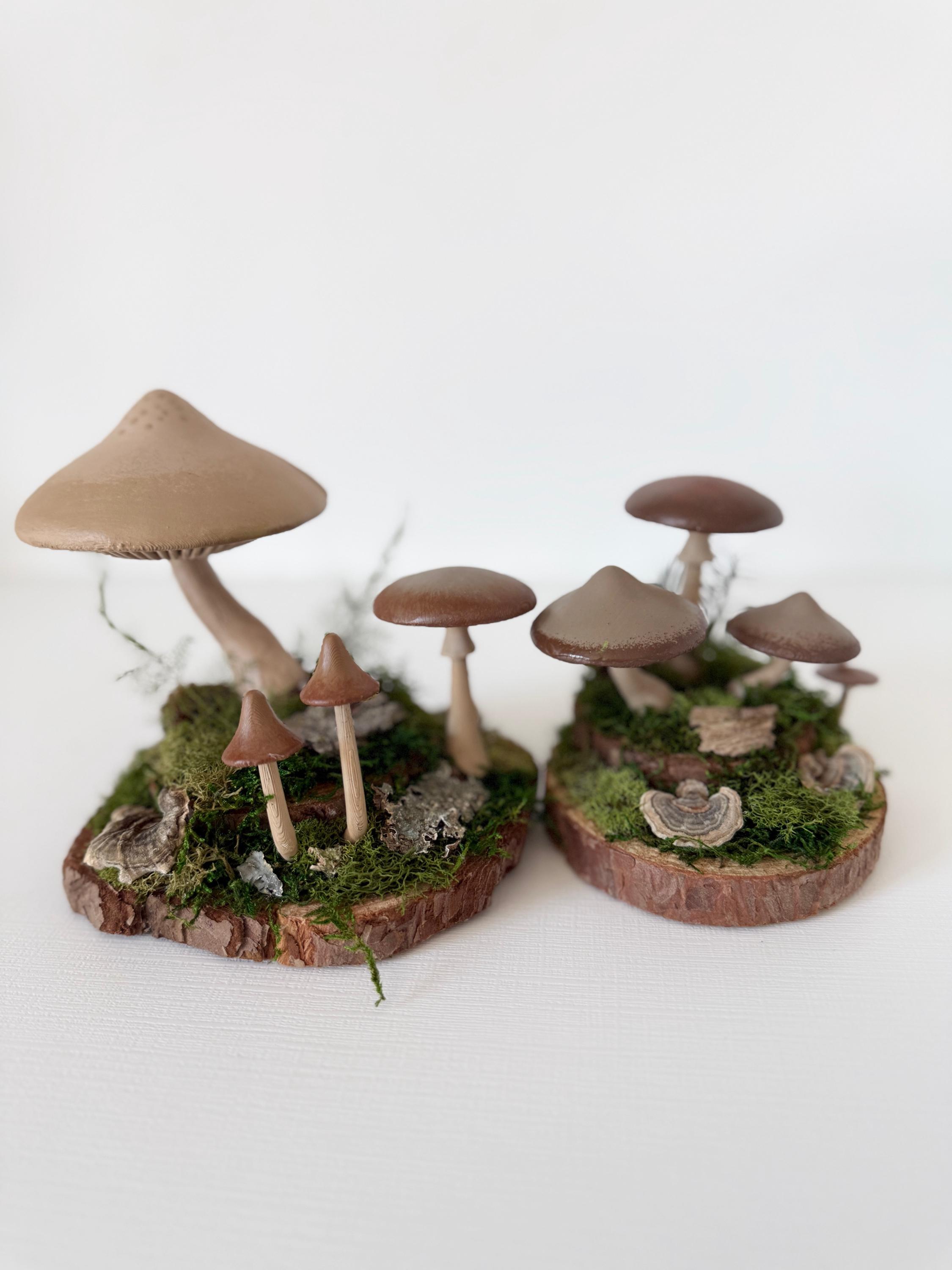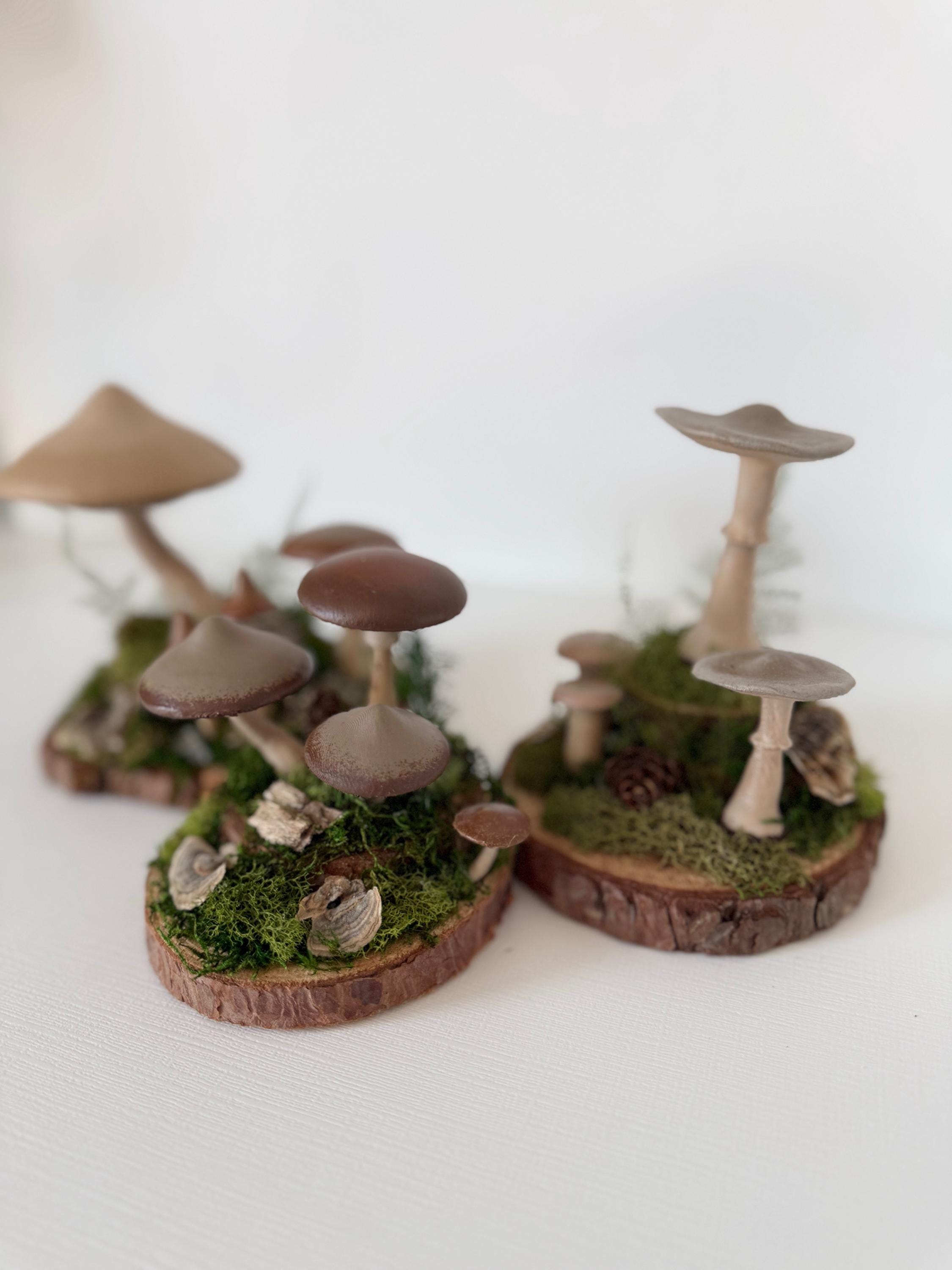 Realistic hand-painted mushrooms in a cute little nature scene. Real preserved moss and bark require no maintenance but bring the same natural element to your home and office as houseplants. Mushrooms are printed with eco-friendly, compostable PLA and hand painted. Base is a real slice of hardwood with bark edges.