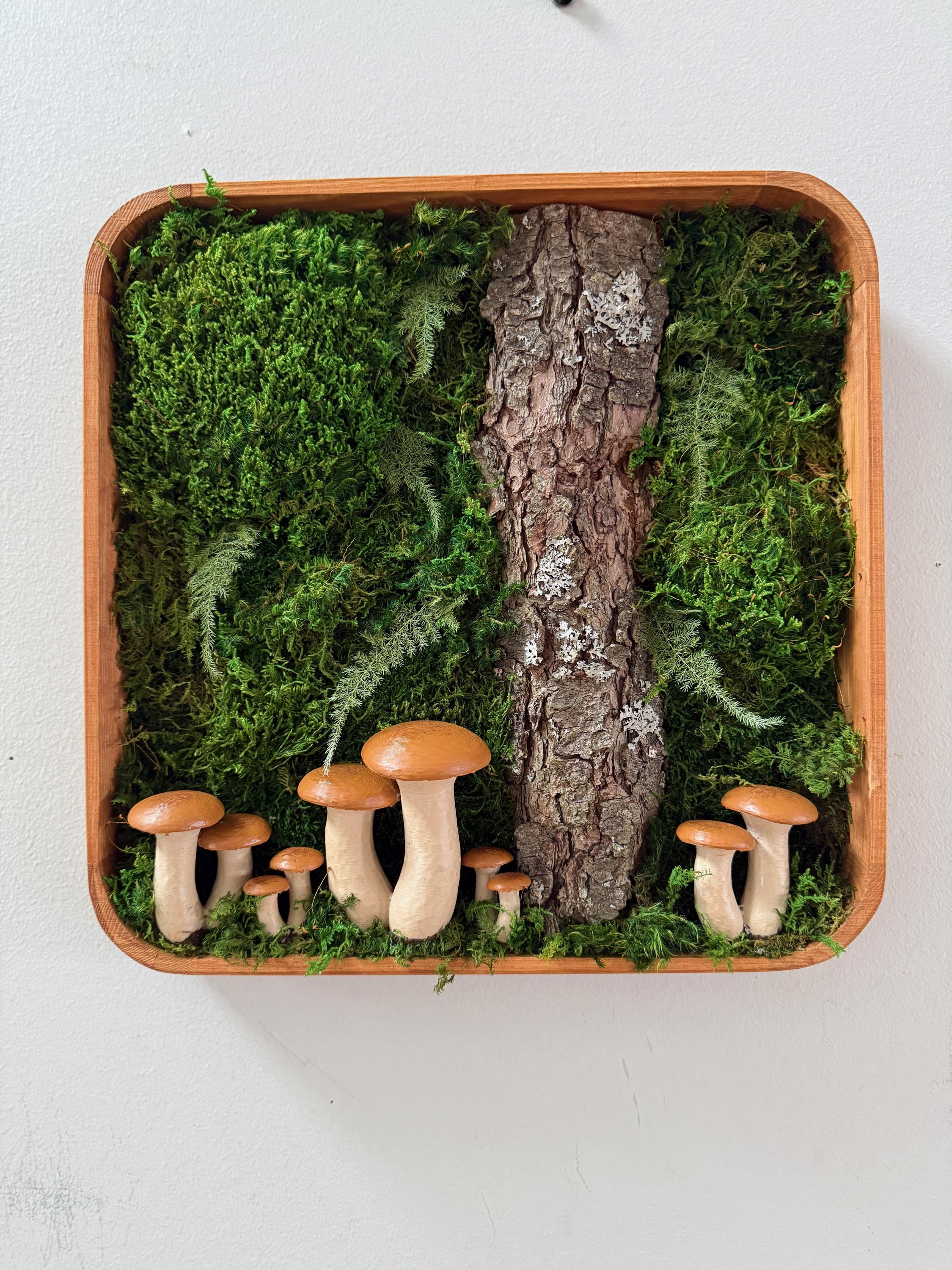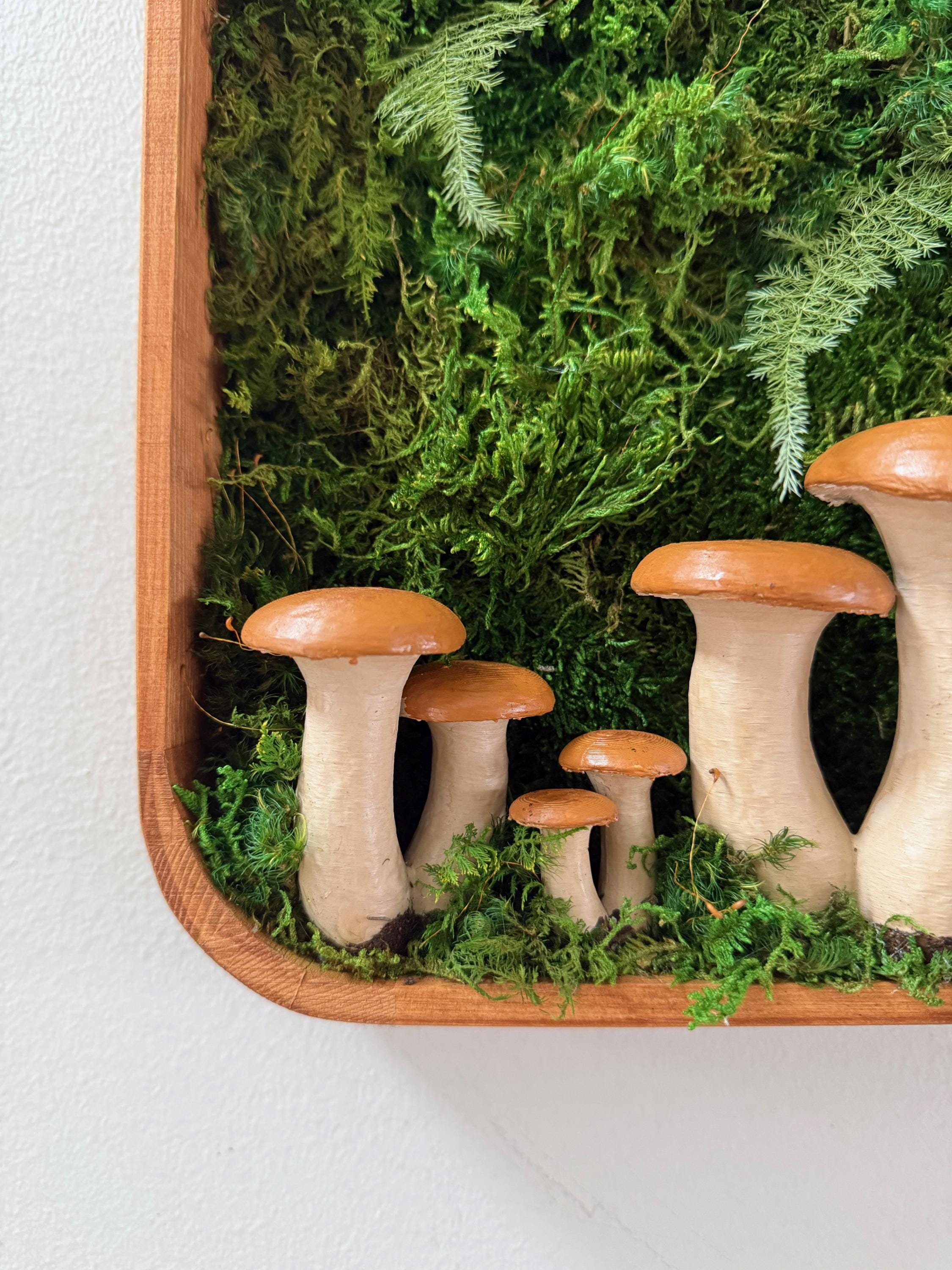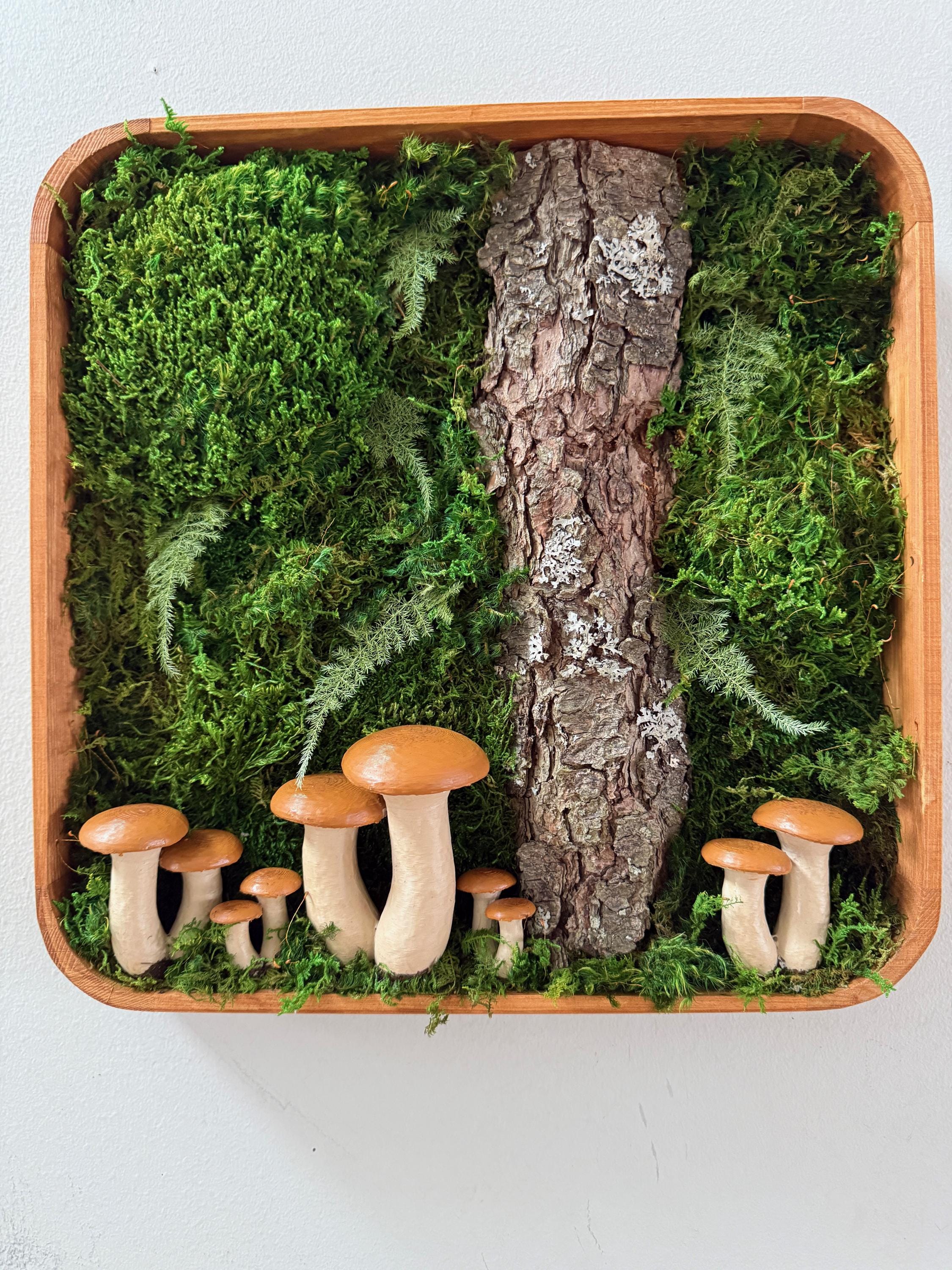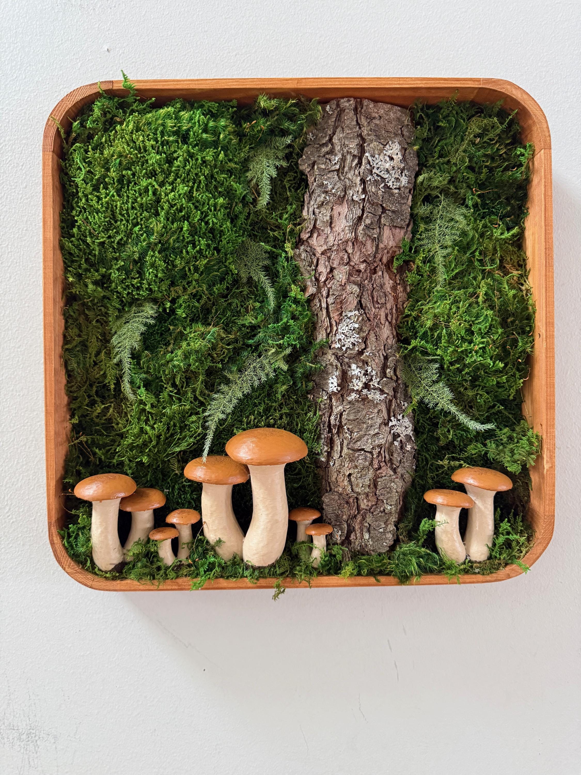 Bring the peace of the forest into your home, office, spa, anywhere that needs natural calming energy. Various preserved mosses, raw wood and other naturally foraged forest treasures, paired with my hand painted mushrooms, all work together in this botanical wall hanging. The scene is set in a deep, shadowbox wood frame. All materials are preserved so no maintenance is required.