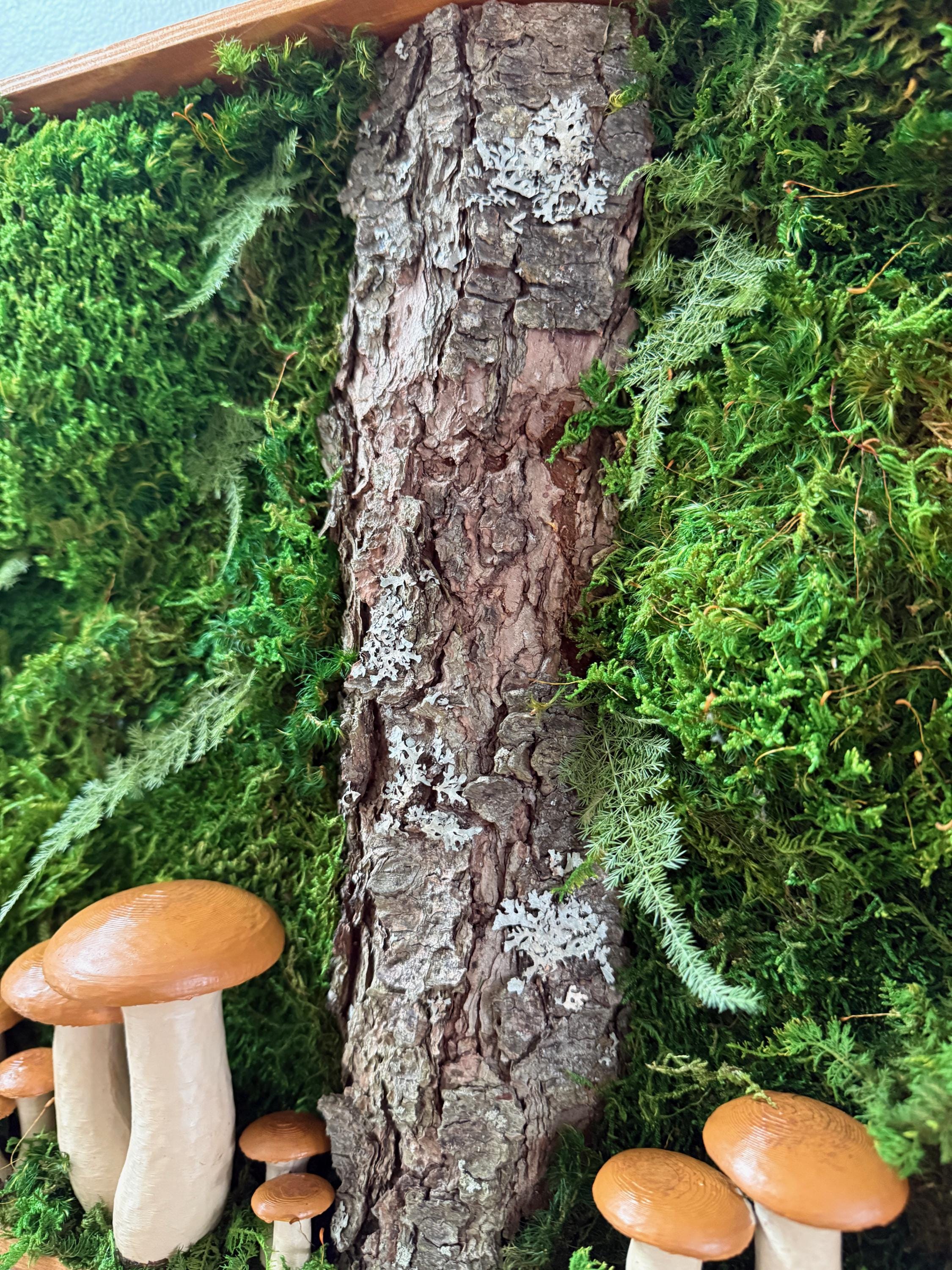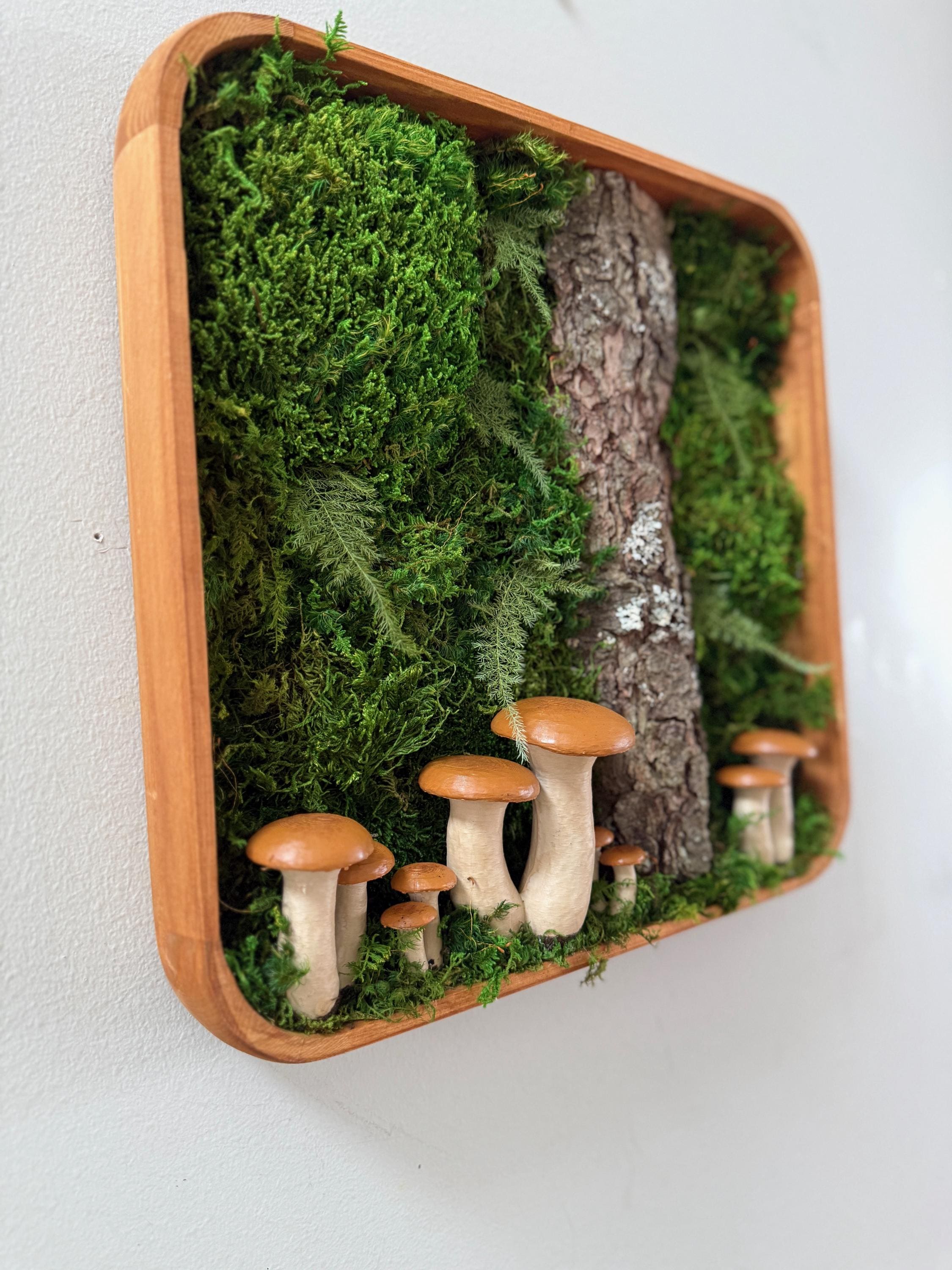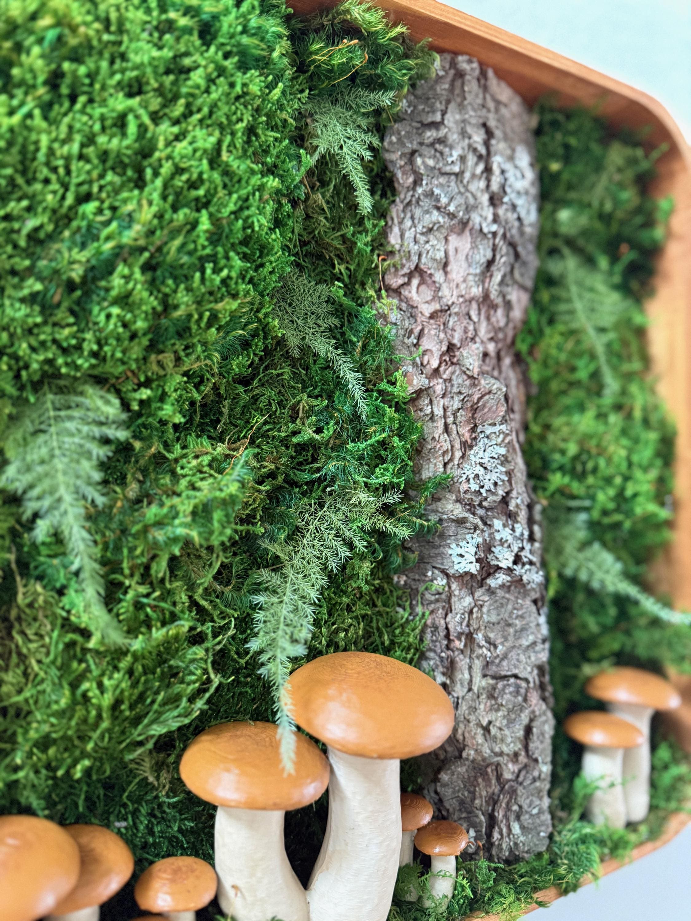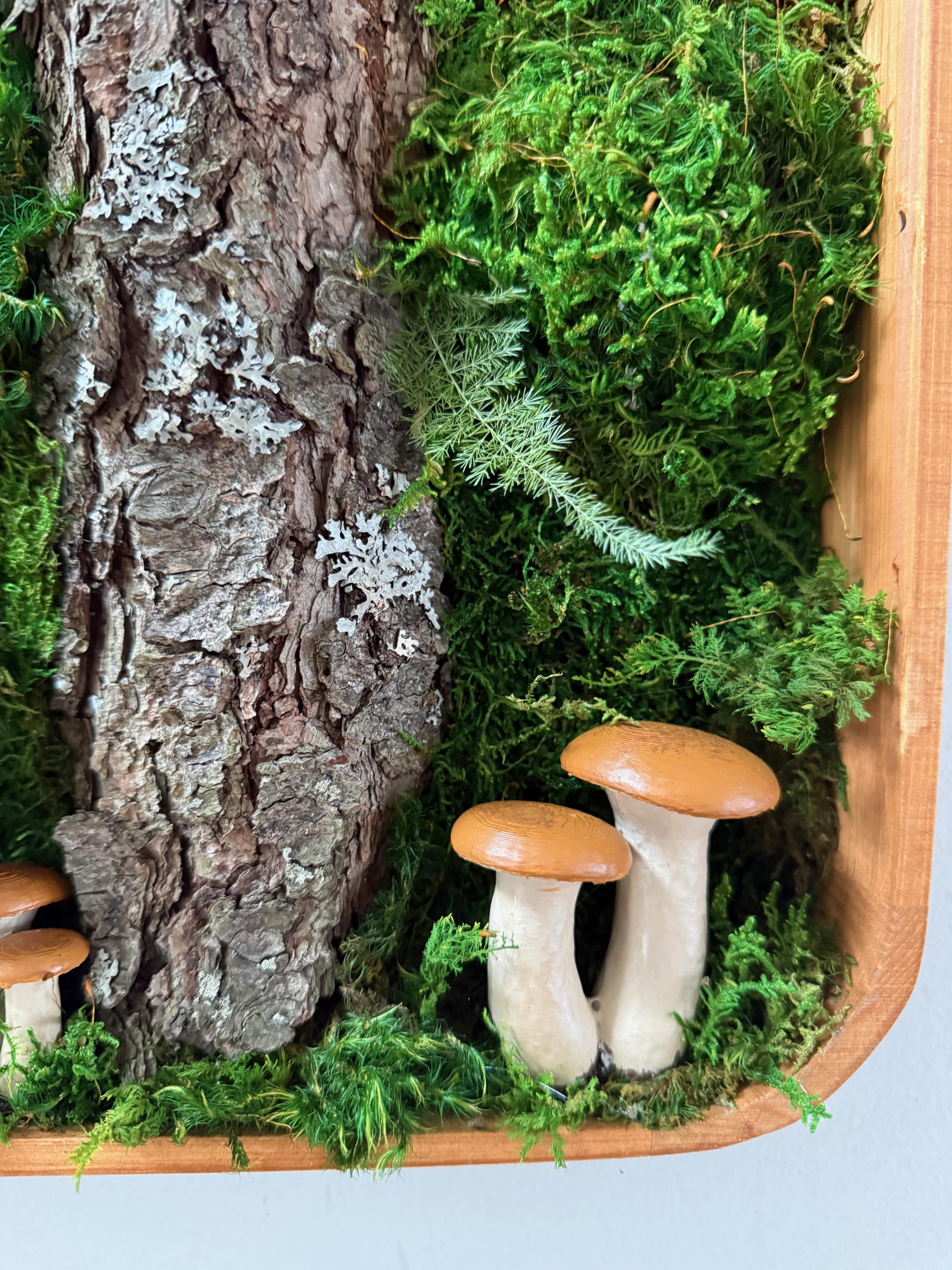 Bring the peace of the forest into your home, office, spa, anywhere that needs natural calming energy. Various preserved mosses, raw wood and other naturally foraged forest treasures, paired with my hand painted mushrooms, all work together in this botanical wall hanging. The scene is set in a deep, shadowbox wood frame. All materials are preserved so no maintenance is required.