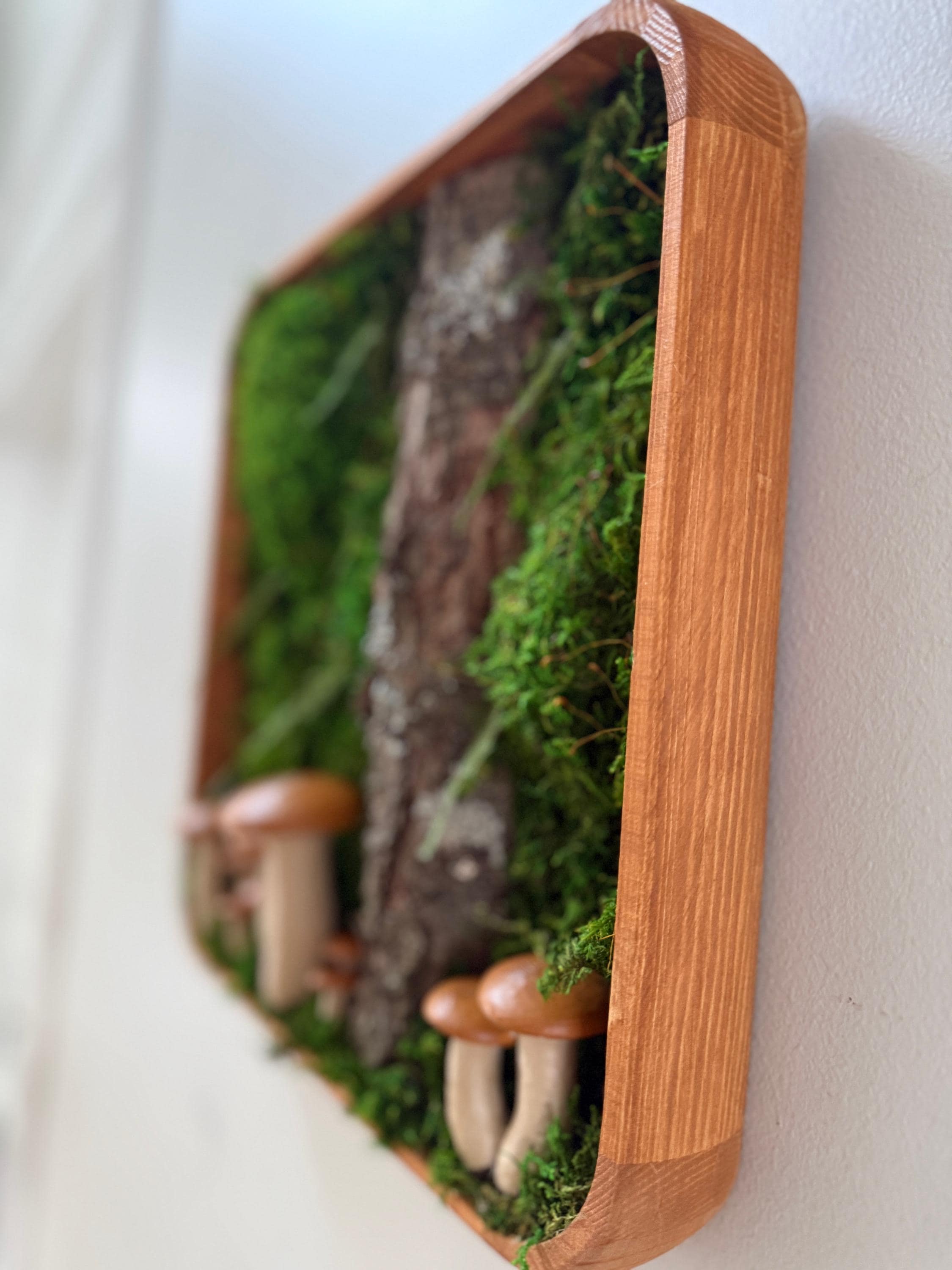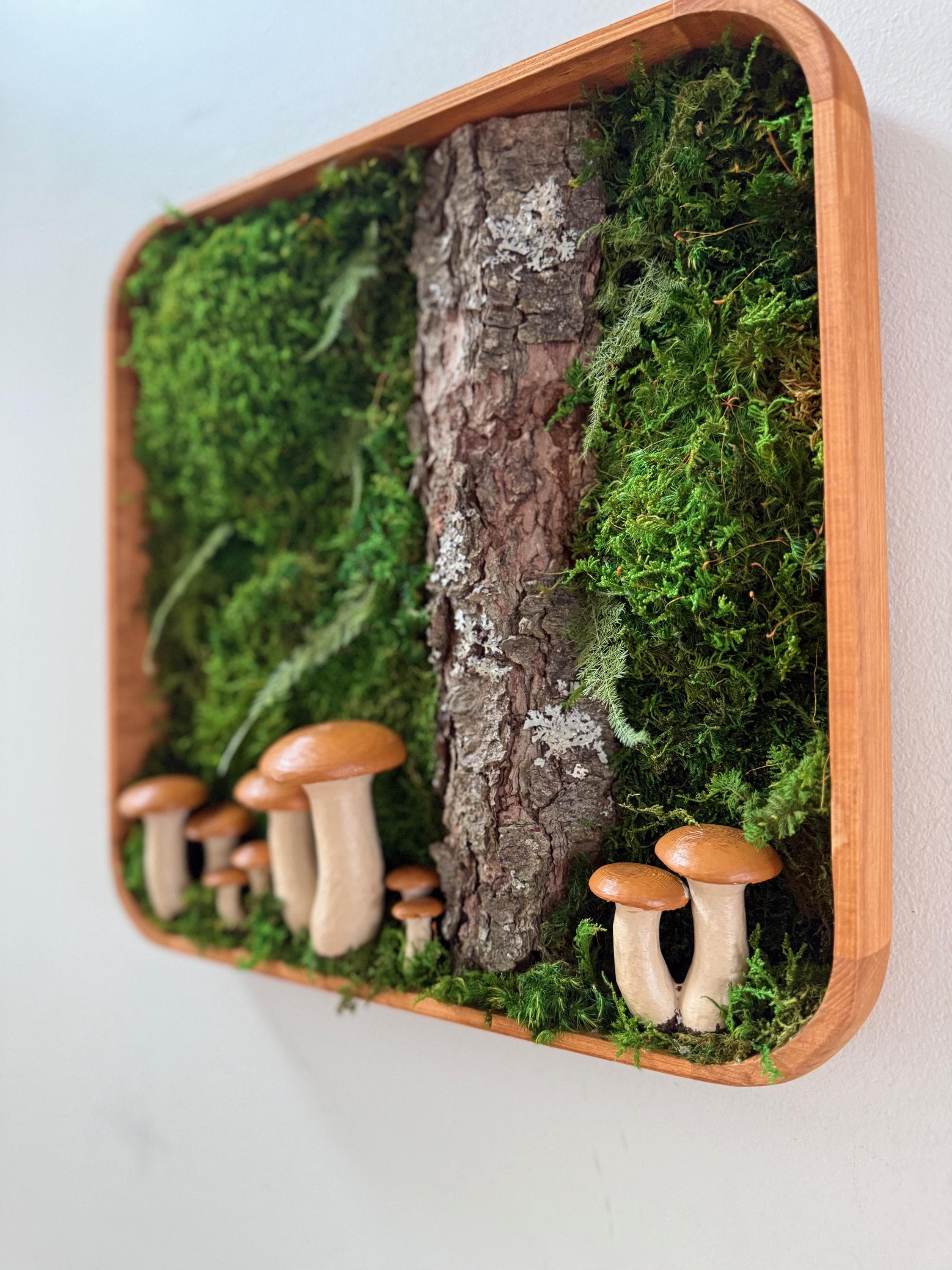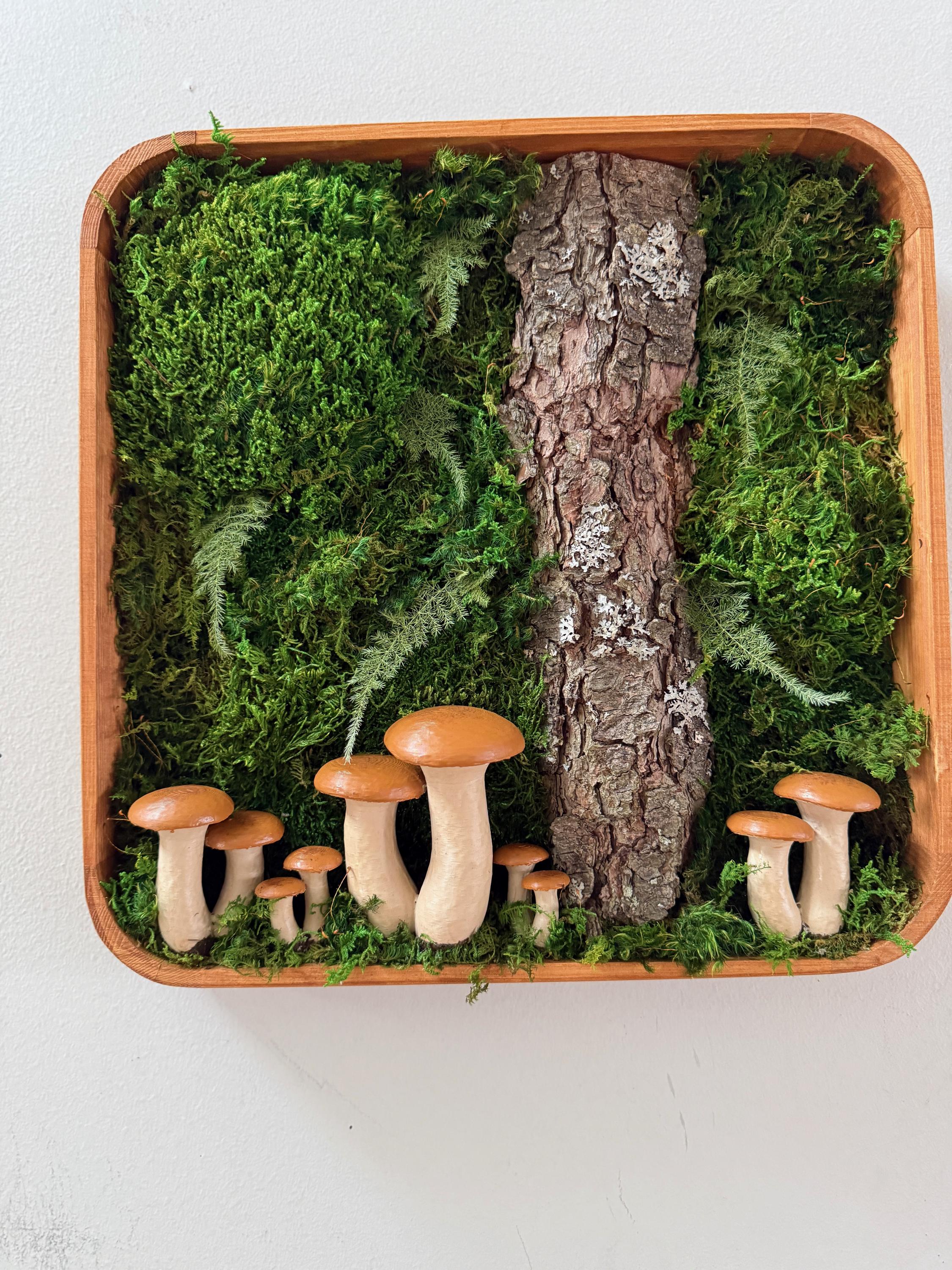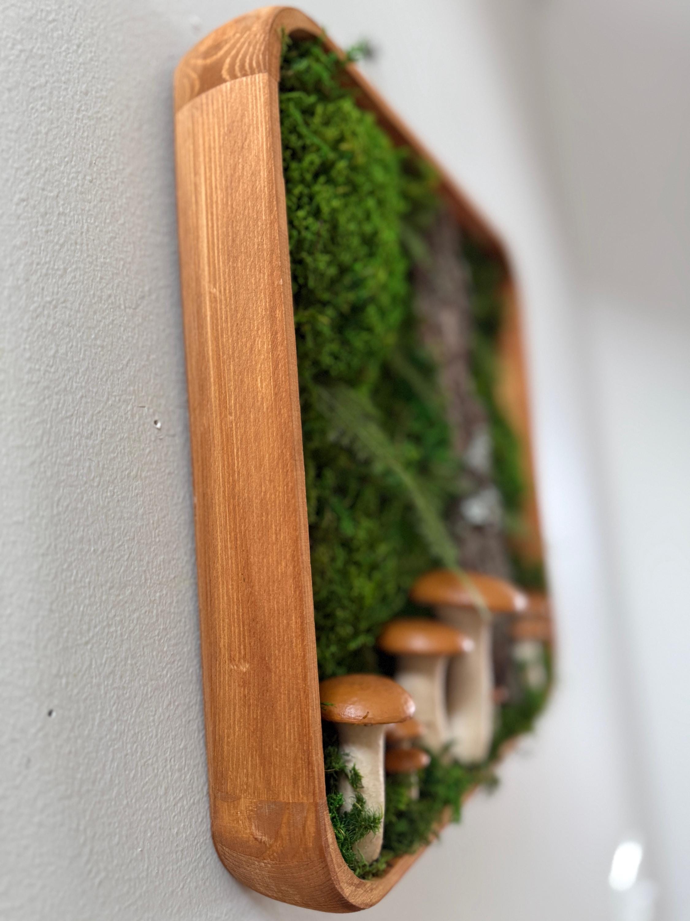 Bring the peace of the forest into your home, office, spa, anywhere that needs natural calming energy. Various preserved mosses, raw wood and other naturally foraged forest treasures, paired with my hand painted mushrooms, all work together in this botanical wall hanging. The scene is set in a deep, shadowbox wood frame. All materials are preserved so no maintenance is required.