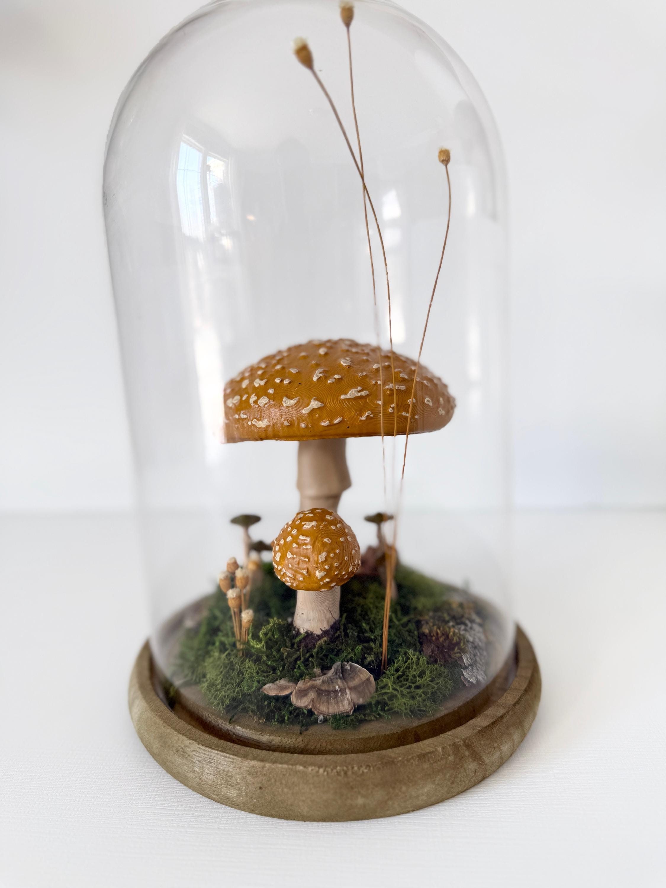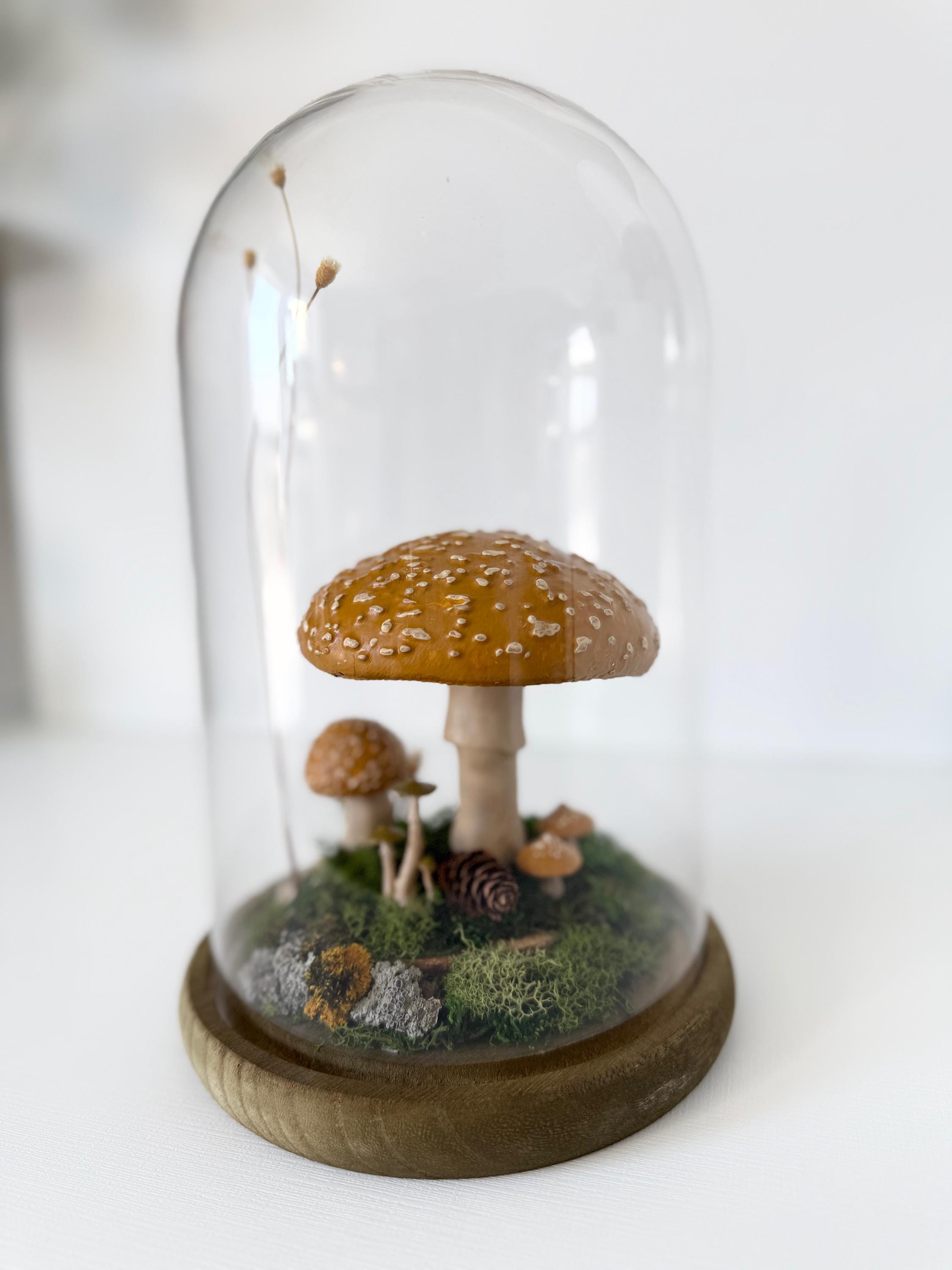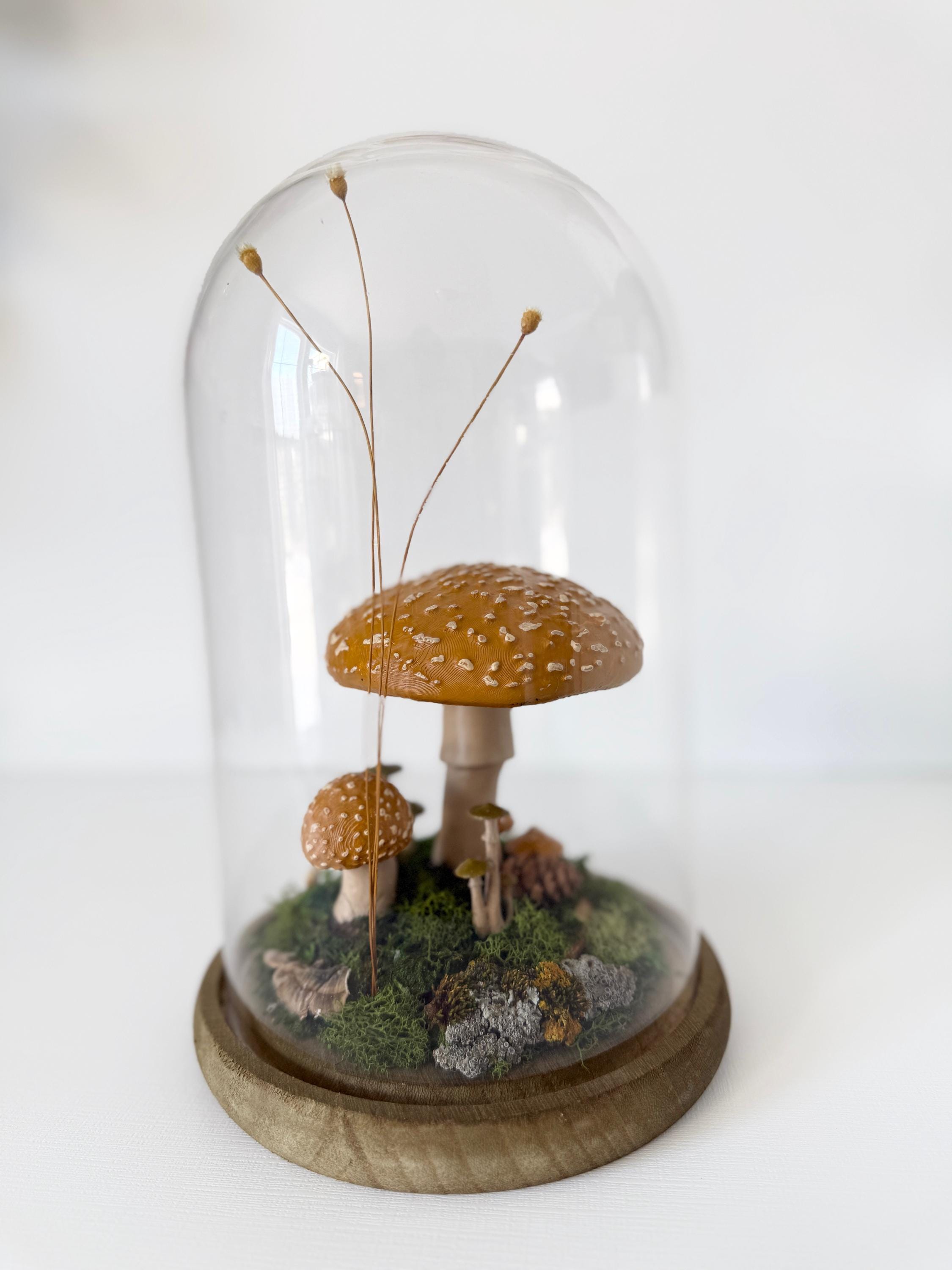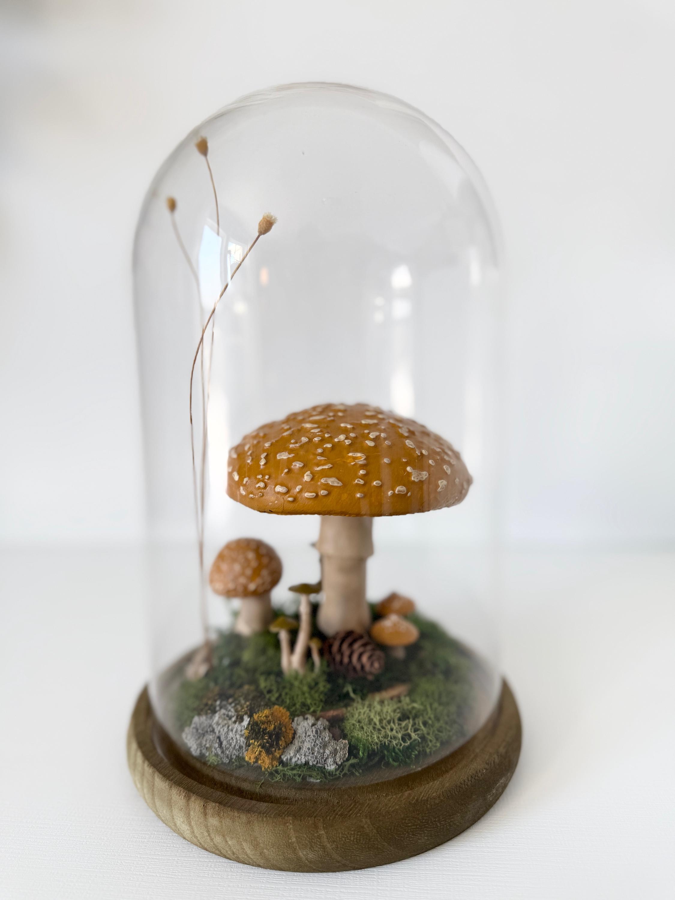 A large glass cloche displays a natural woodland scene. Natural botanical art created from dried botanicals and moss foraged responsibly from nature, and mushrooms 3d printed with eco-friendly PLA and handpainted. Moss is preserved to stay green and beautiful with no maintenance needed.