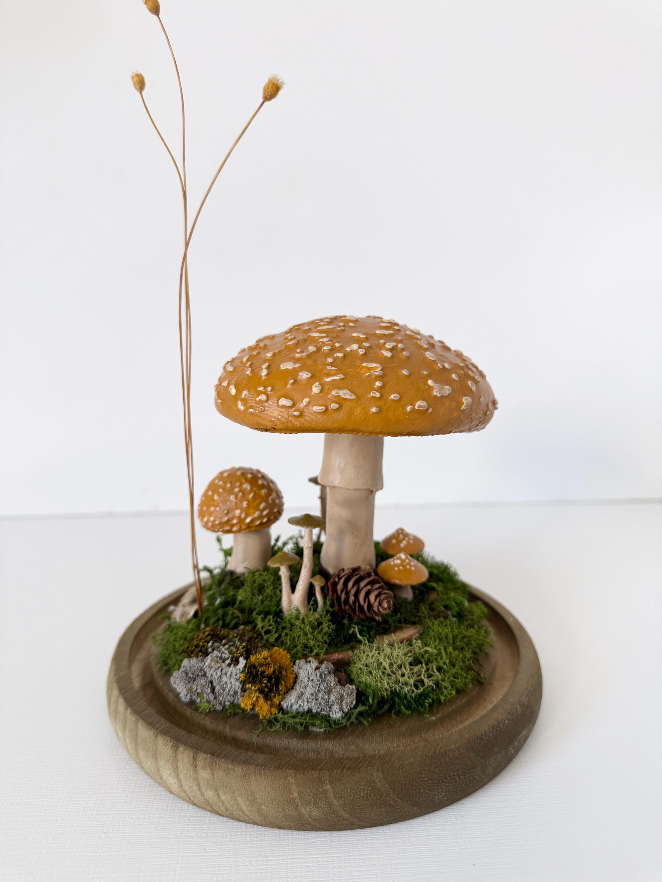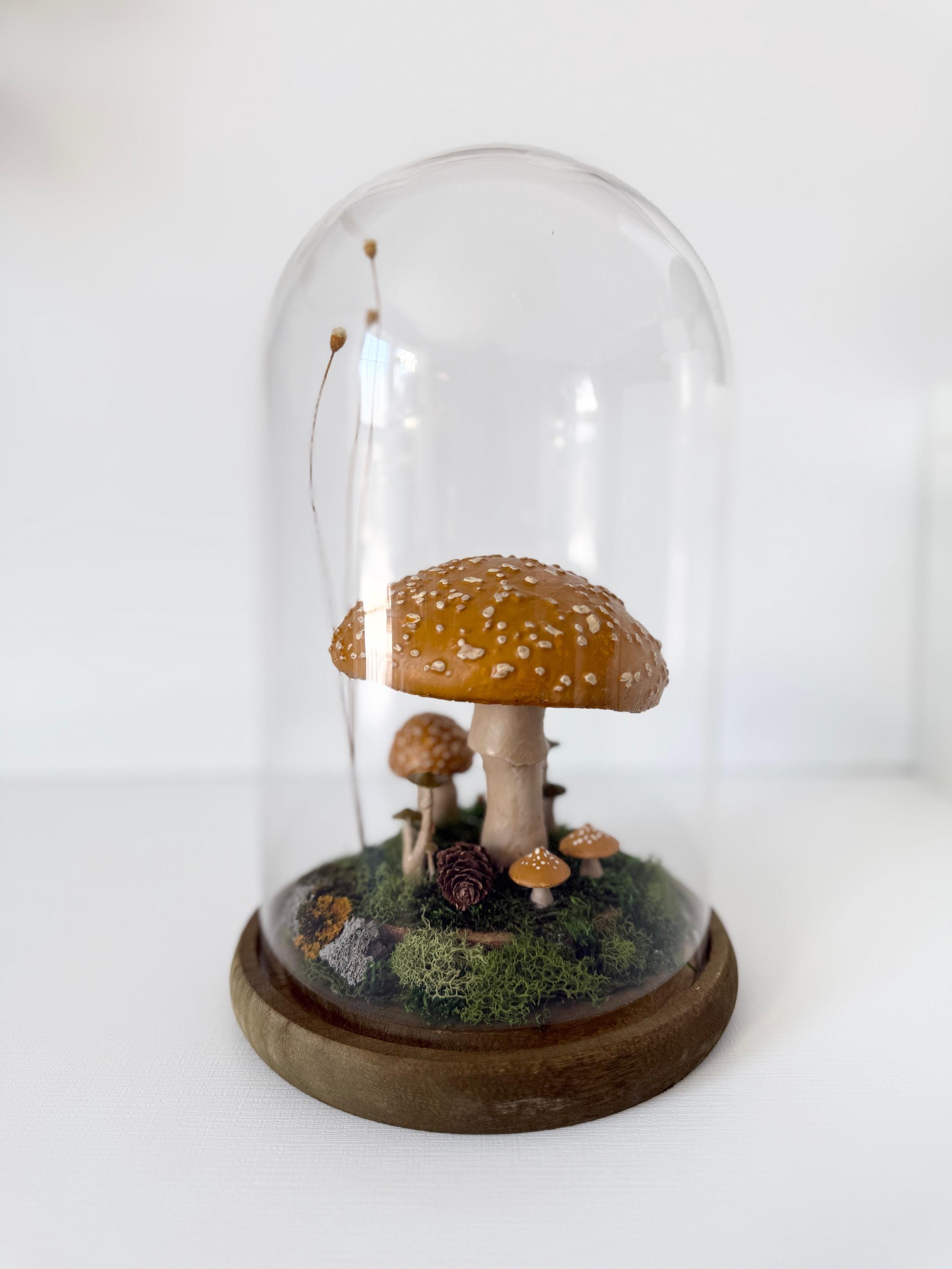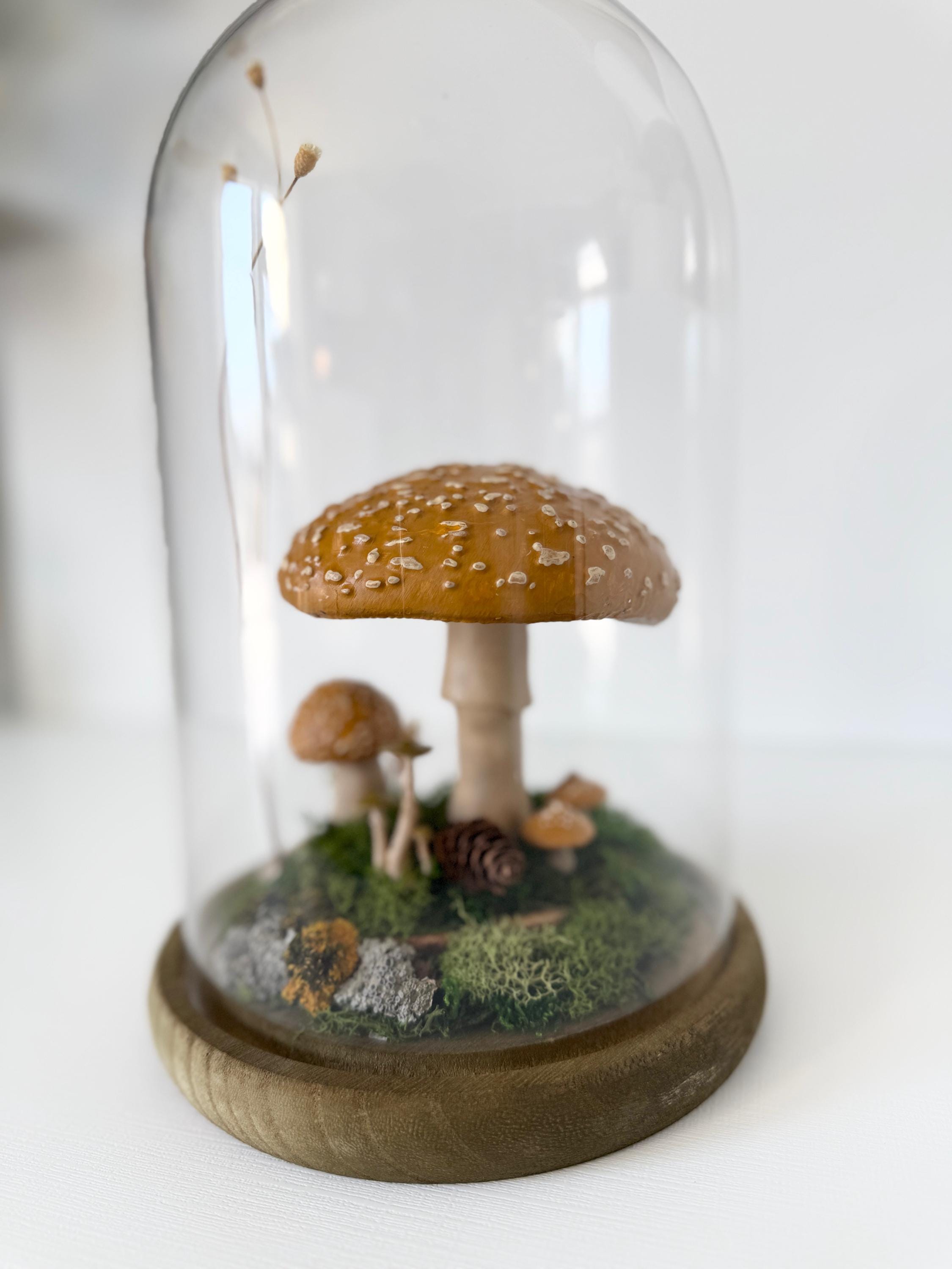 A large glass cloche displays a natural woodland scene. Natural botanical art created from dried botanicals and moss foraged responsibly from nature, and mushrooms 3d printed with eco-friendly PLA and handpainted. Moss is preserved to stay green and beautiful with no maintenance needed.