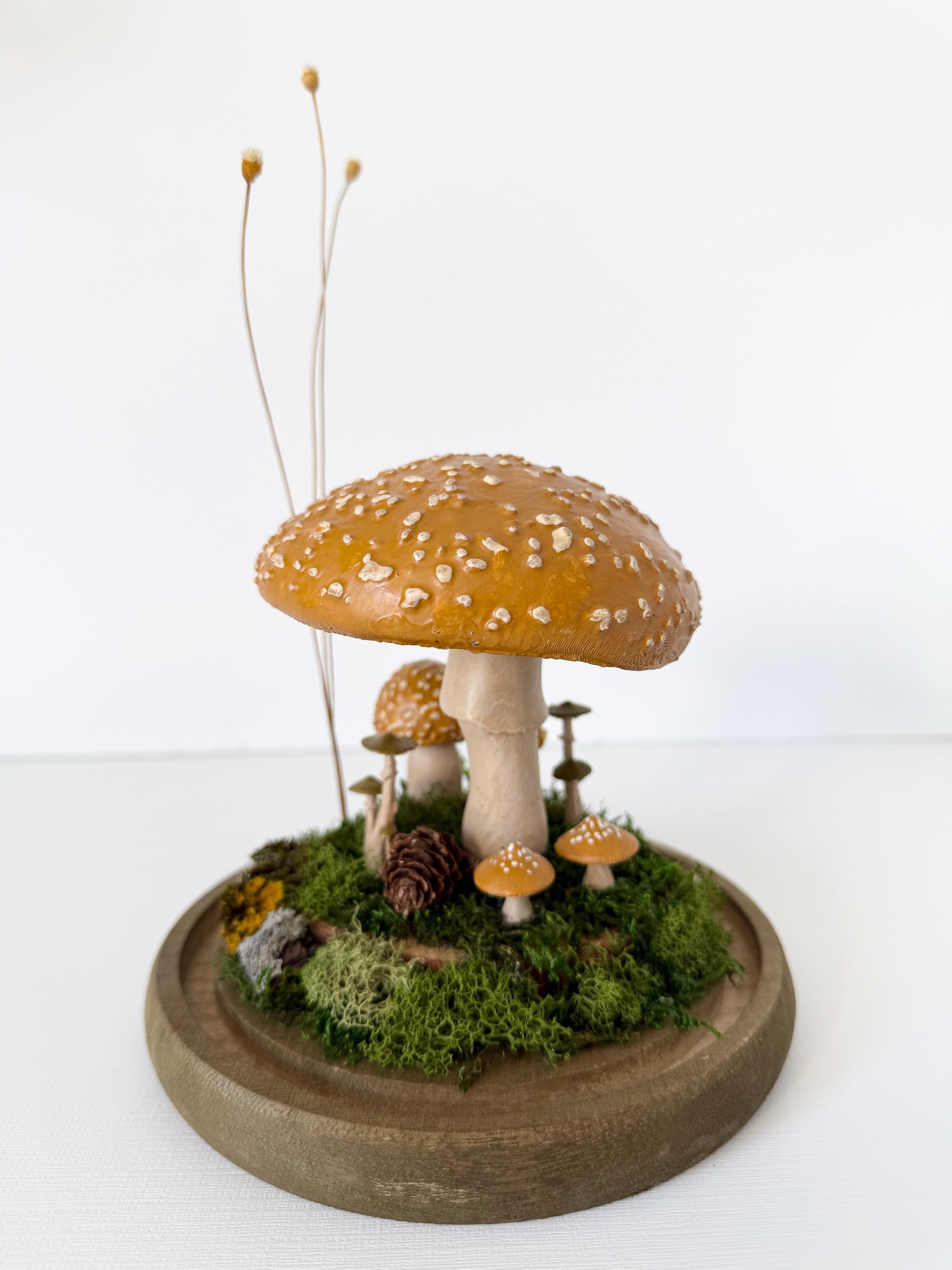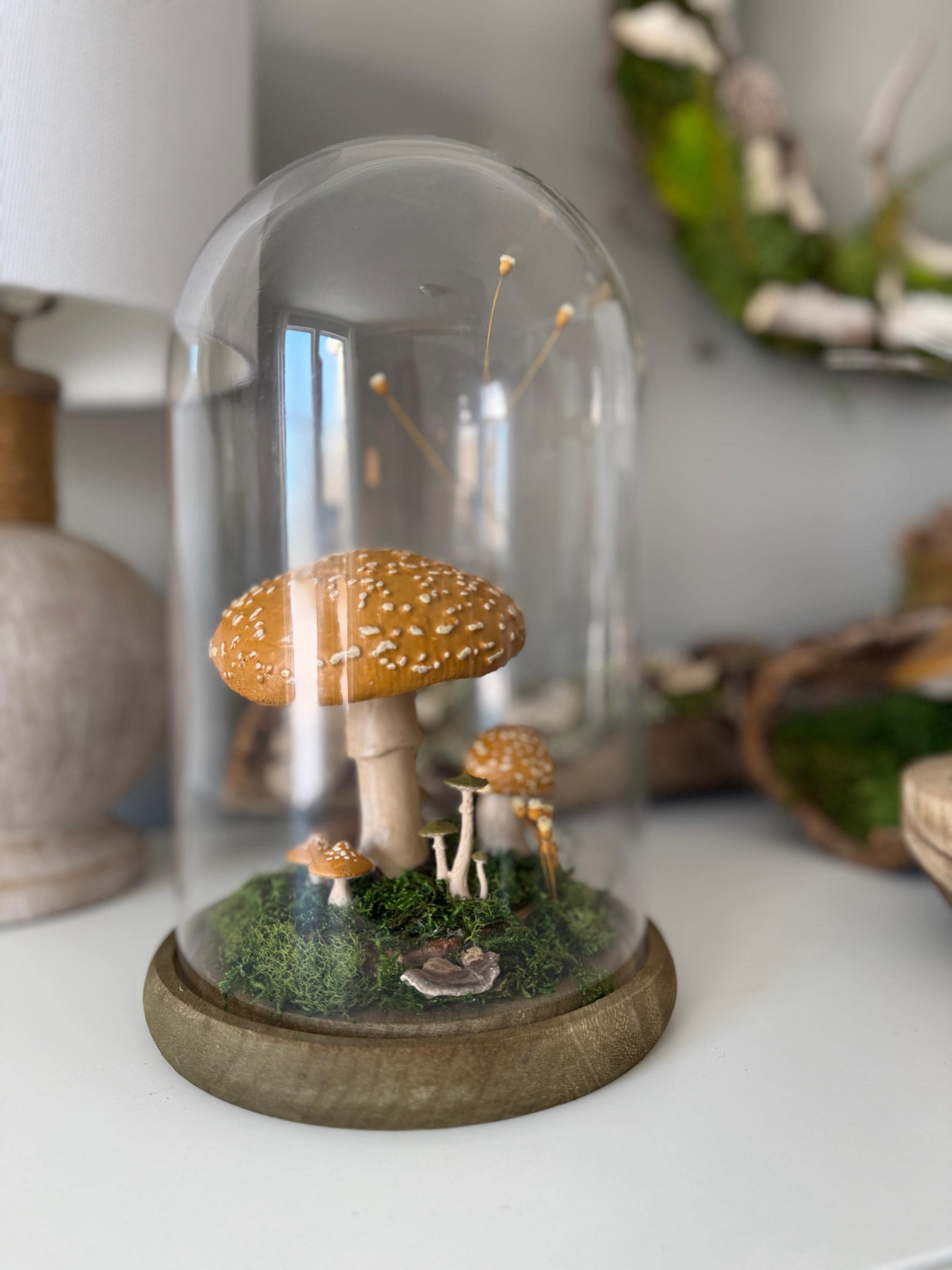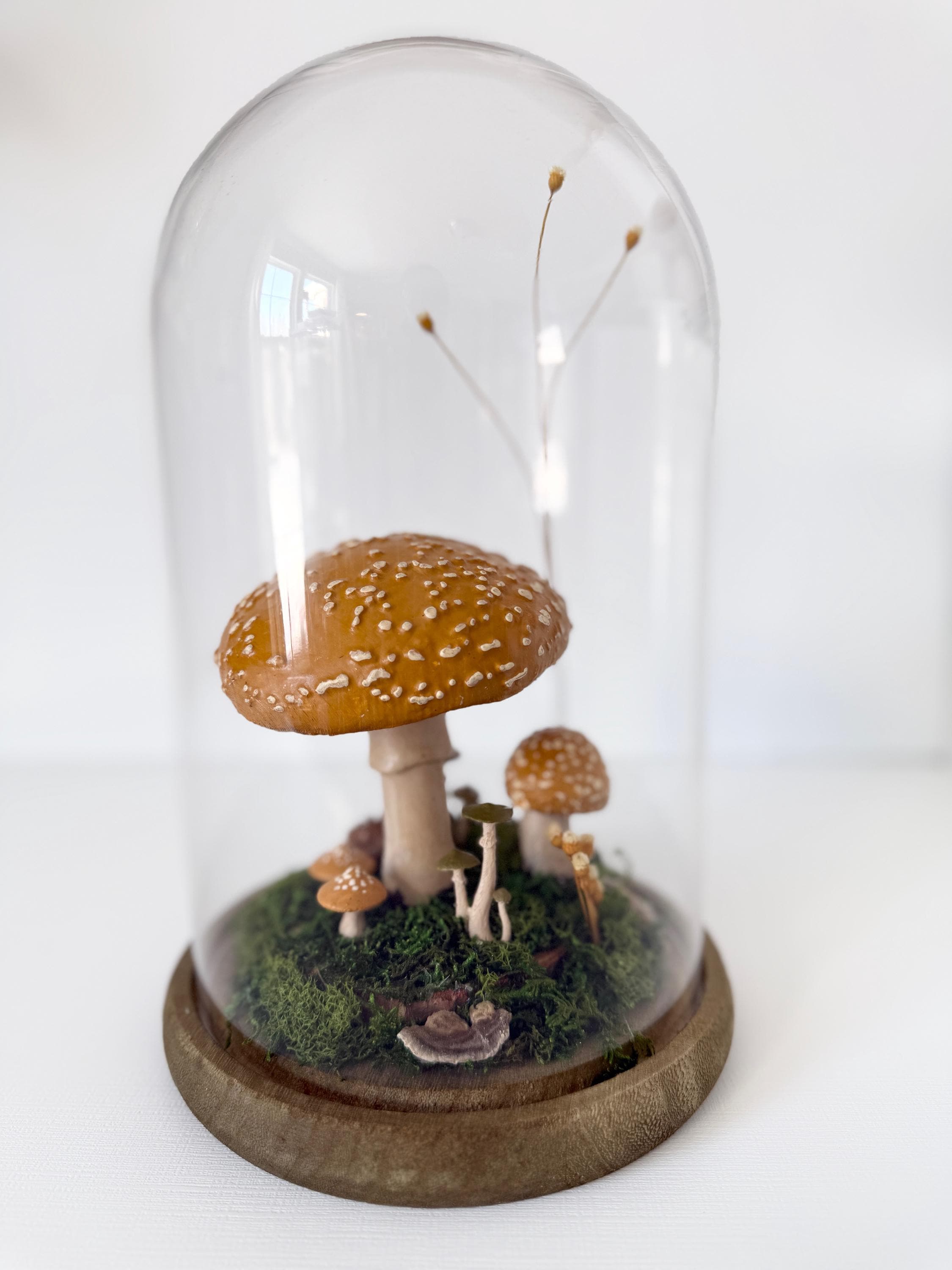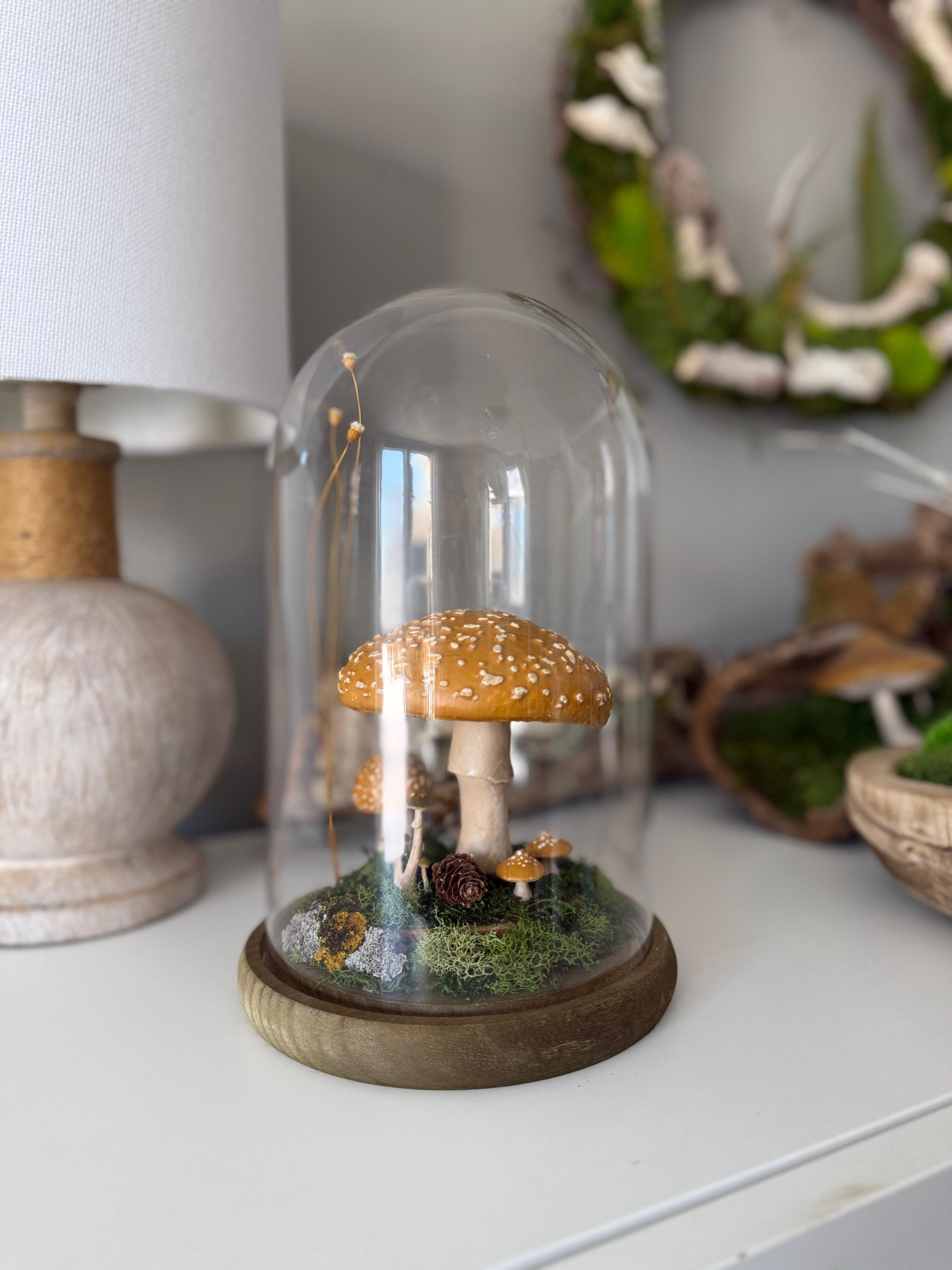 A large glass cloche displays a natural woodland scene. Natural botanical art created from dried botanicals and moss foraged responsibly from nature, and mushrooms 3d printed with eco-friendly PLA and handpainted. Moss is preserved to stay green and beautiful with no maintenance needed.