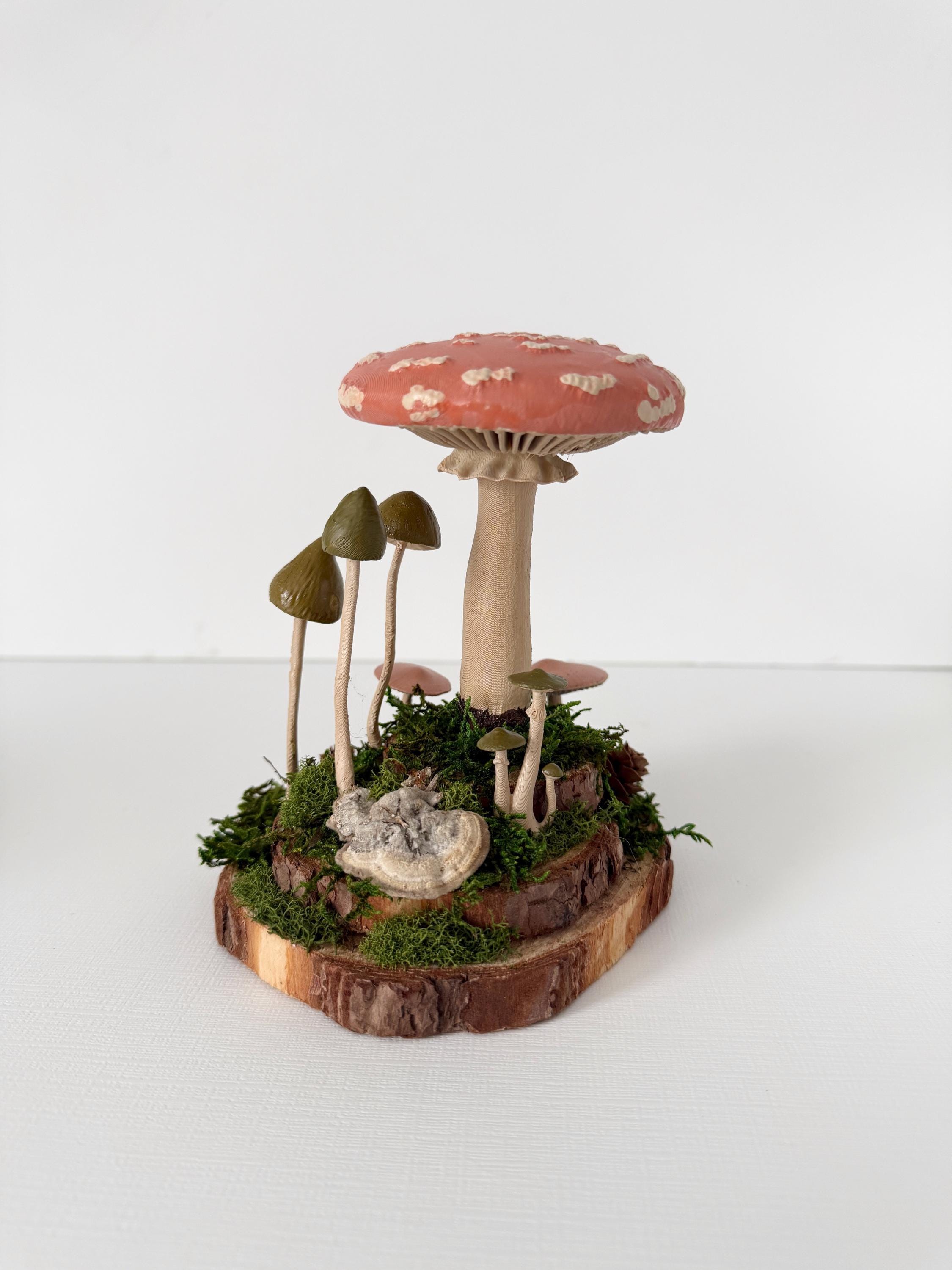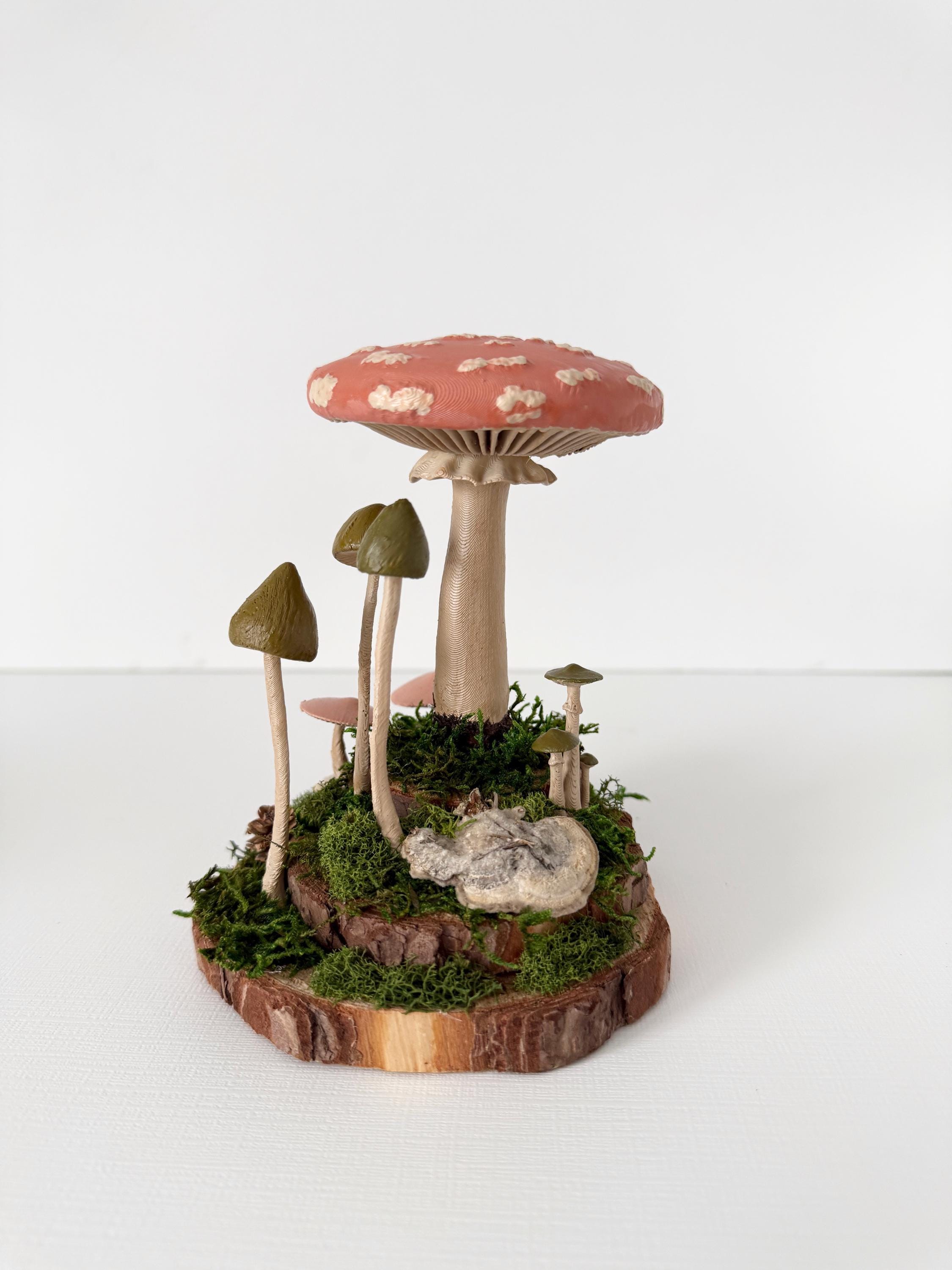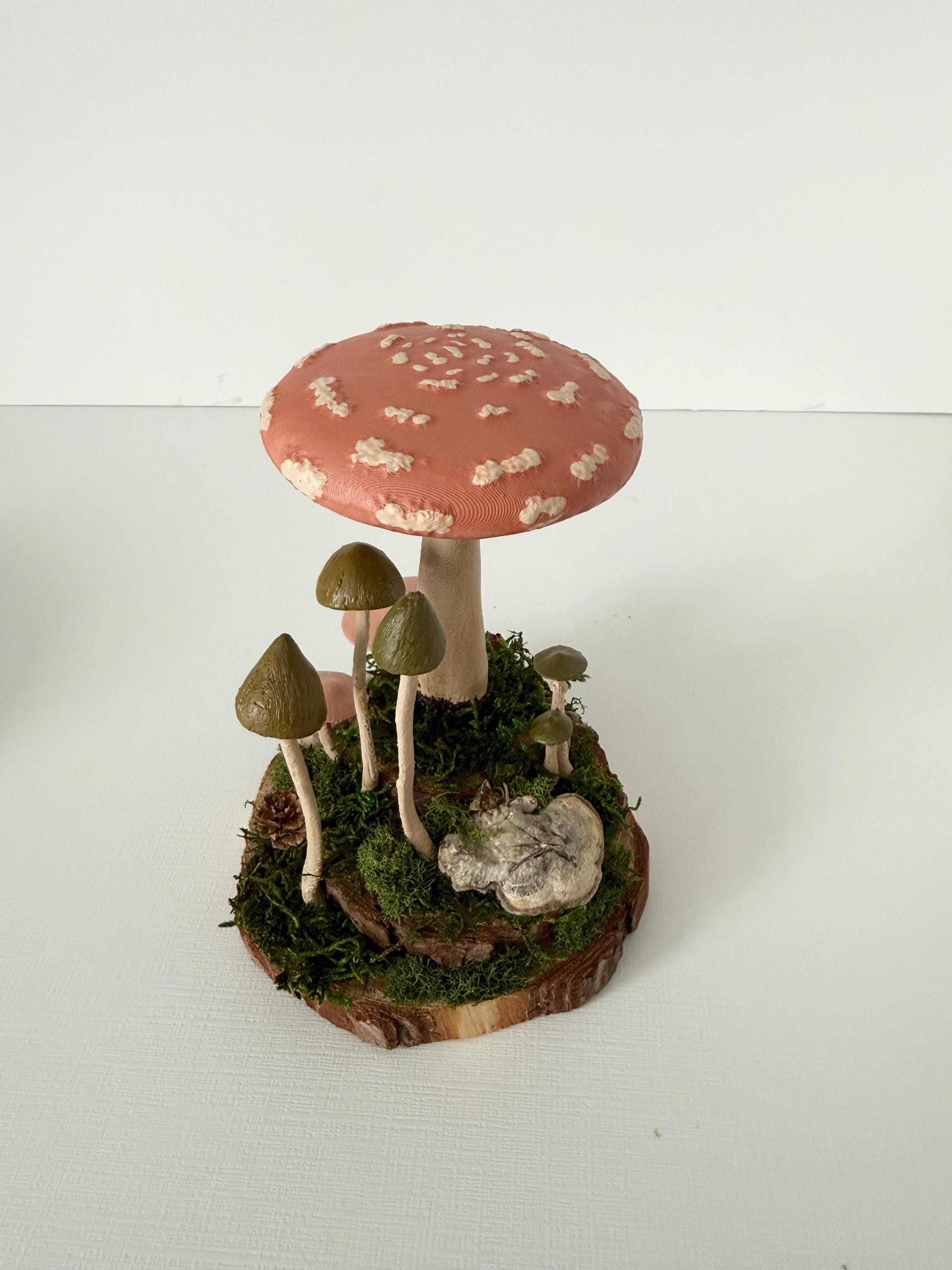 Realistic hand-painted mushrooms in a cute little nature scene. Real preserved moss and bark require no maintenance but bring the same natural element to your home and office as houseplants. Mushrooms are printed with eco-friendly, compostable PLA and hand painted. Base is a real slice of hardwood with bark edges.