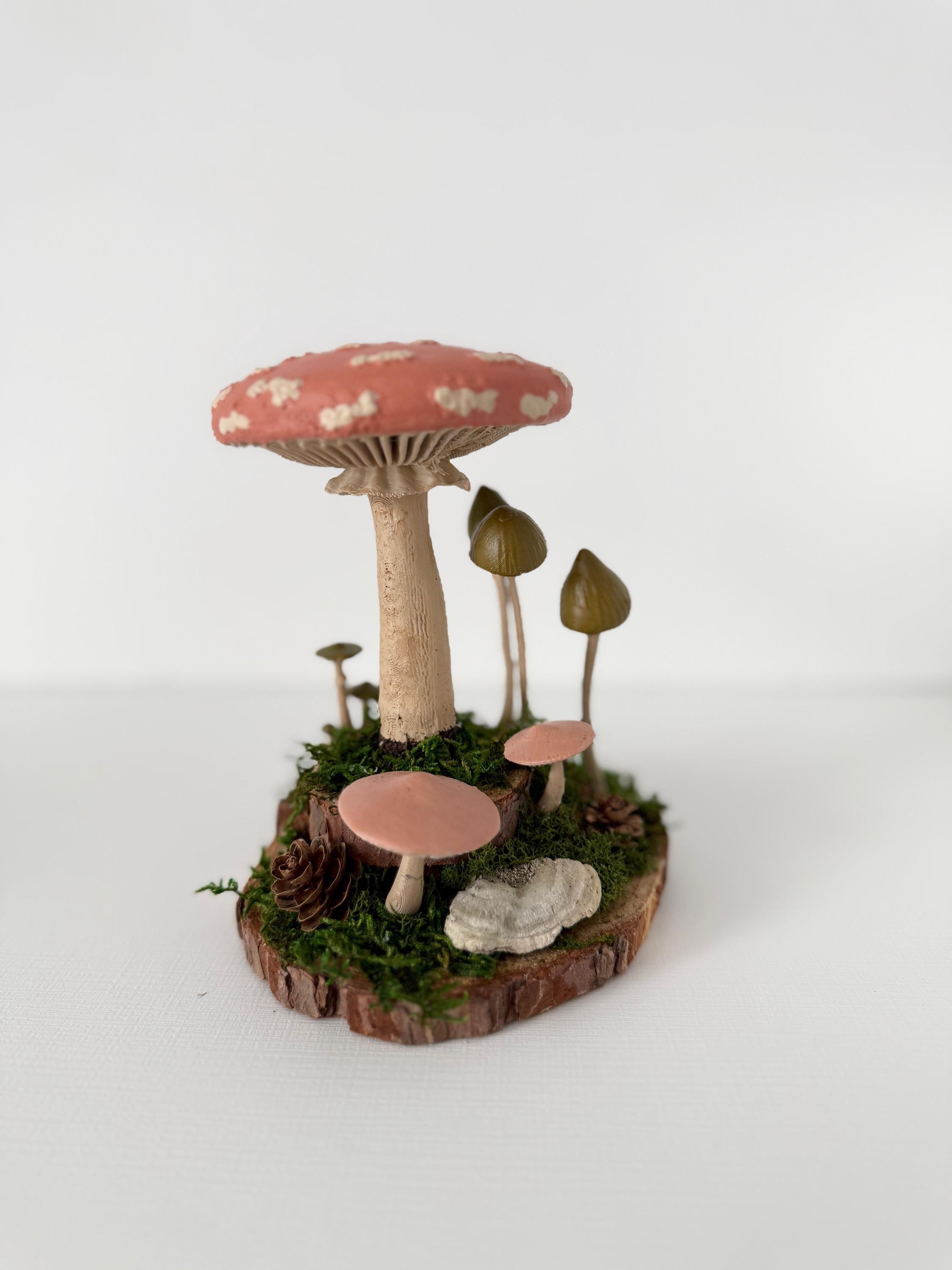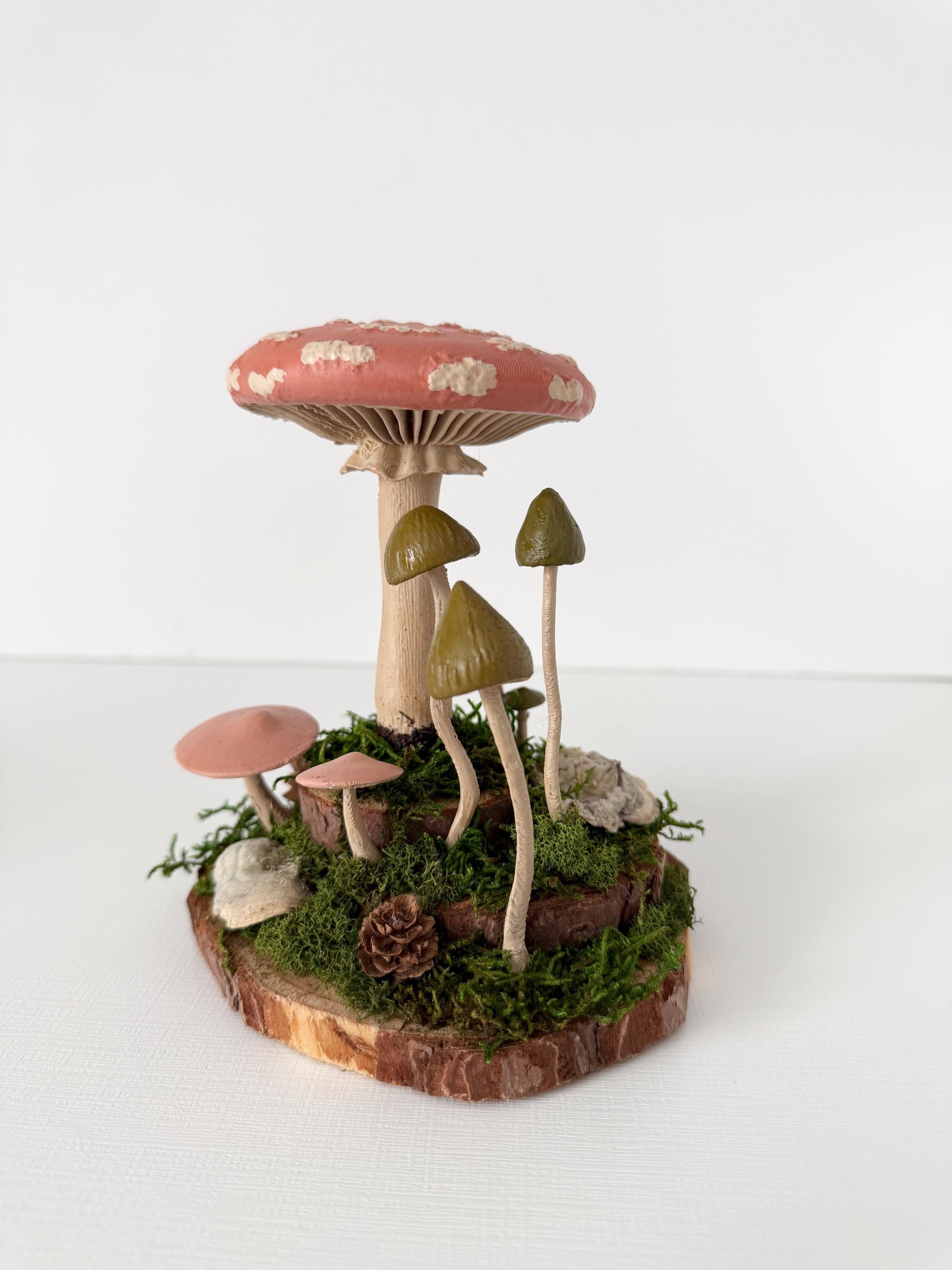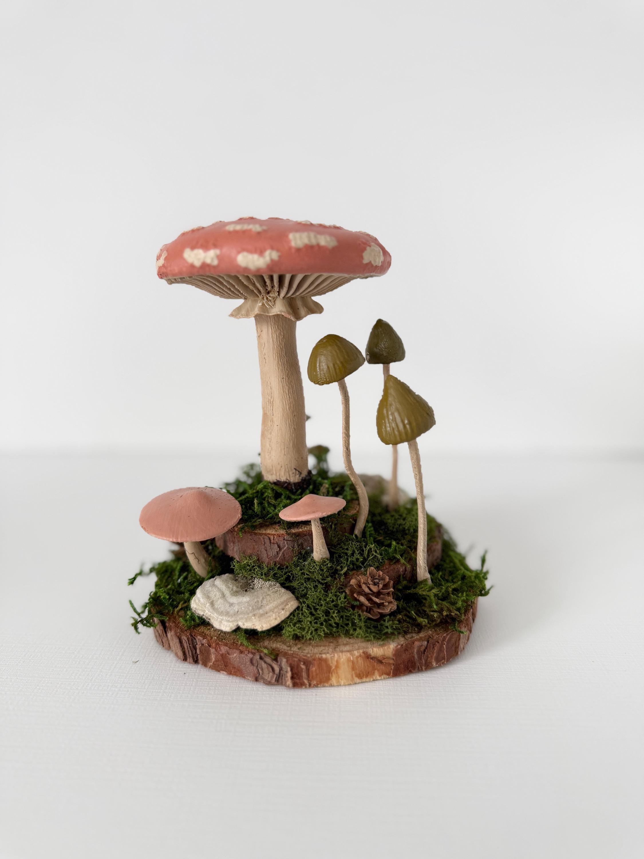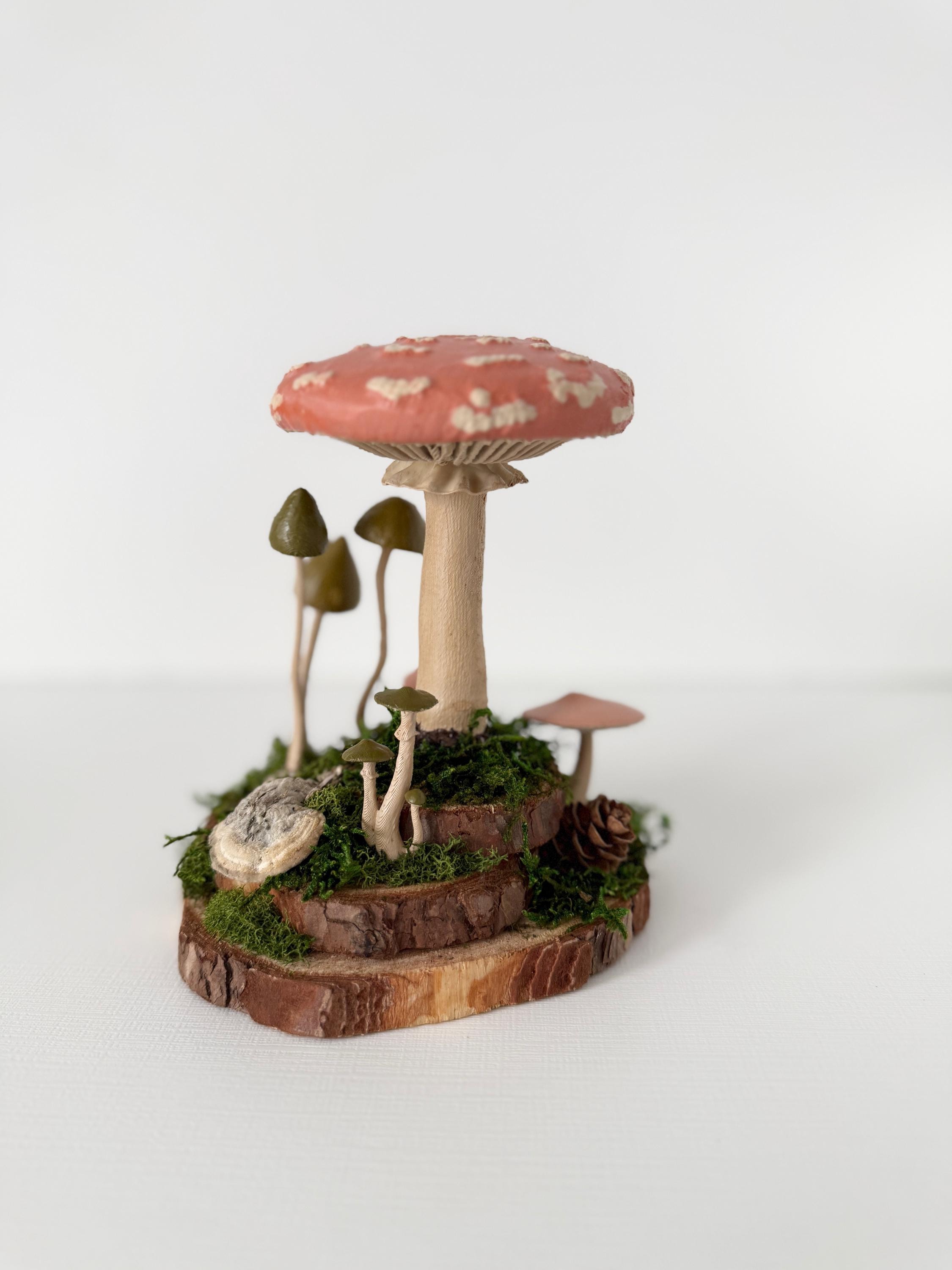 Realistic hand-painted mushrooms in a cute little nature scene. Real preserved moss and bark require no maintenance but bring the same natural element to your home and office as houseplants. Mushrooms are printed with eco-friendly, compostable PLA and hand painted. Base is a real slice of hardwood with bark edges.