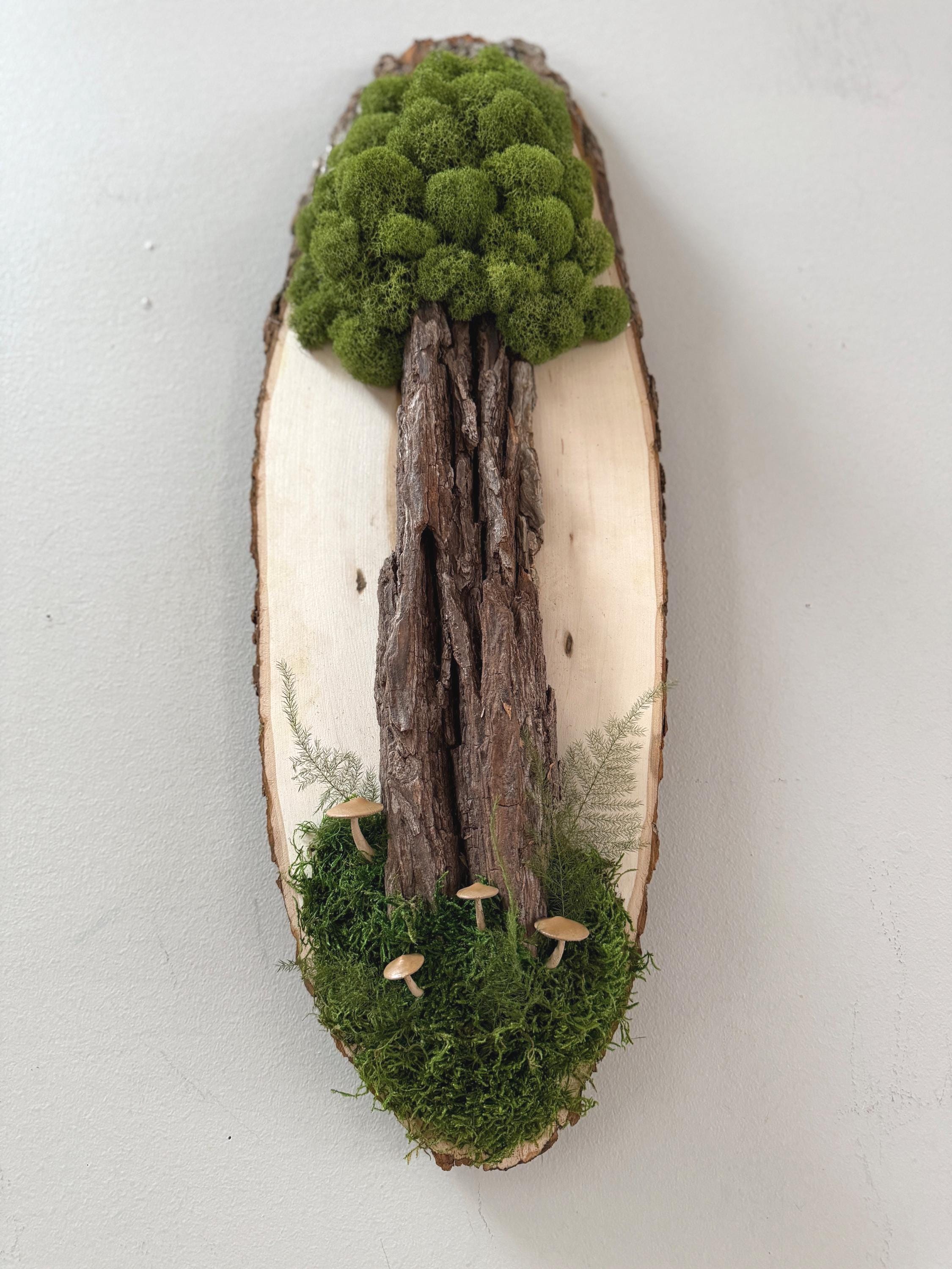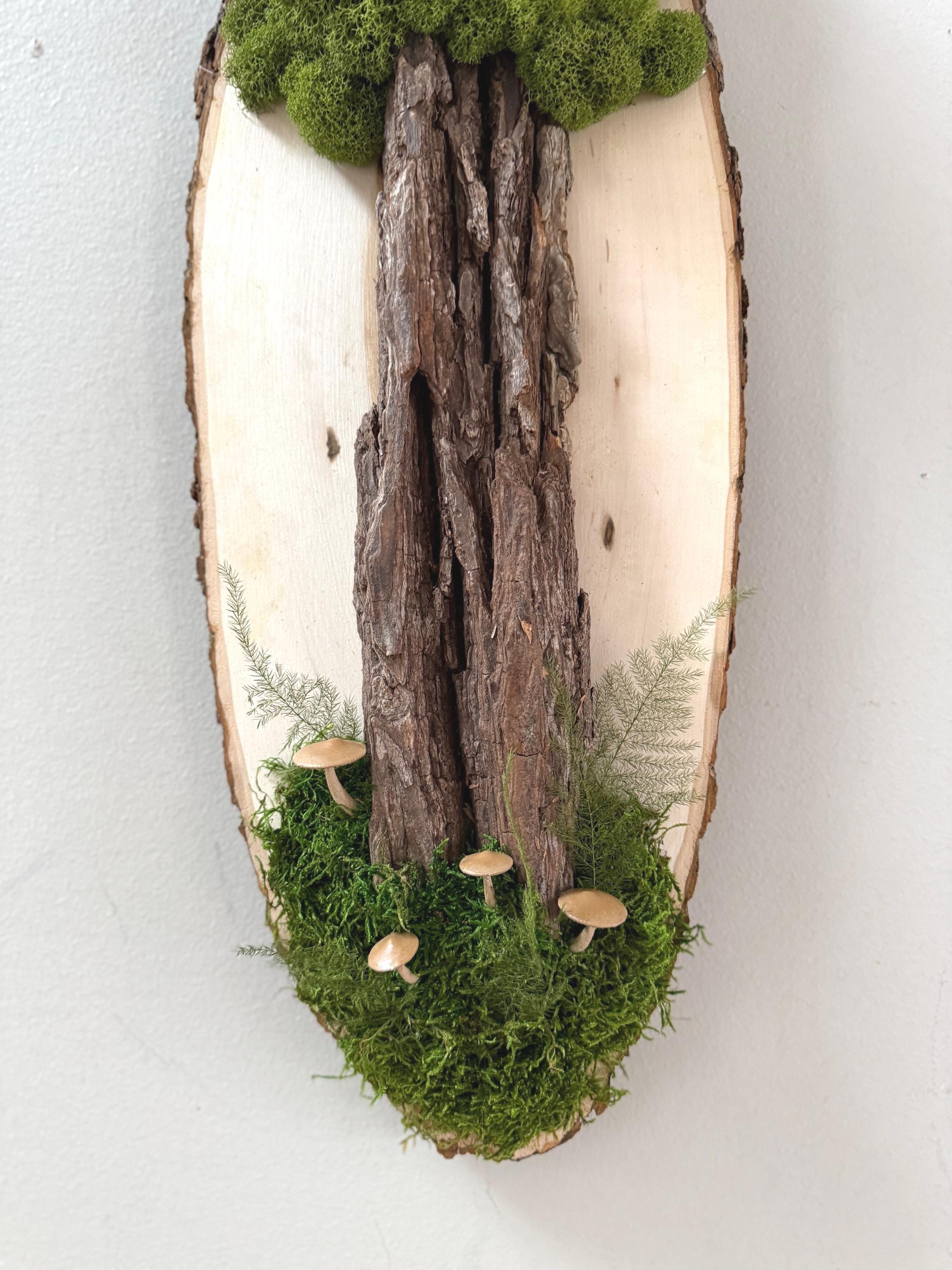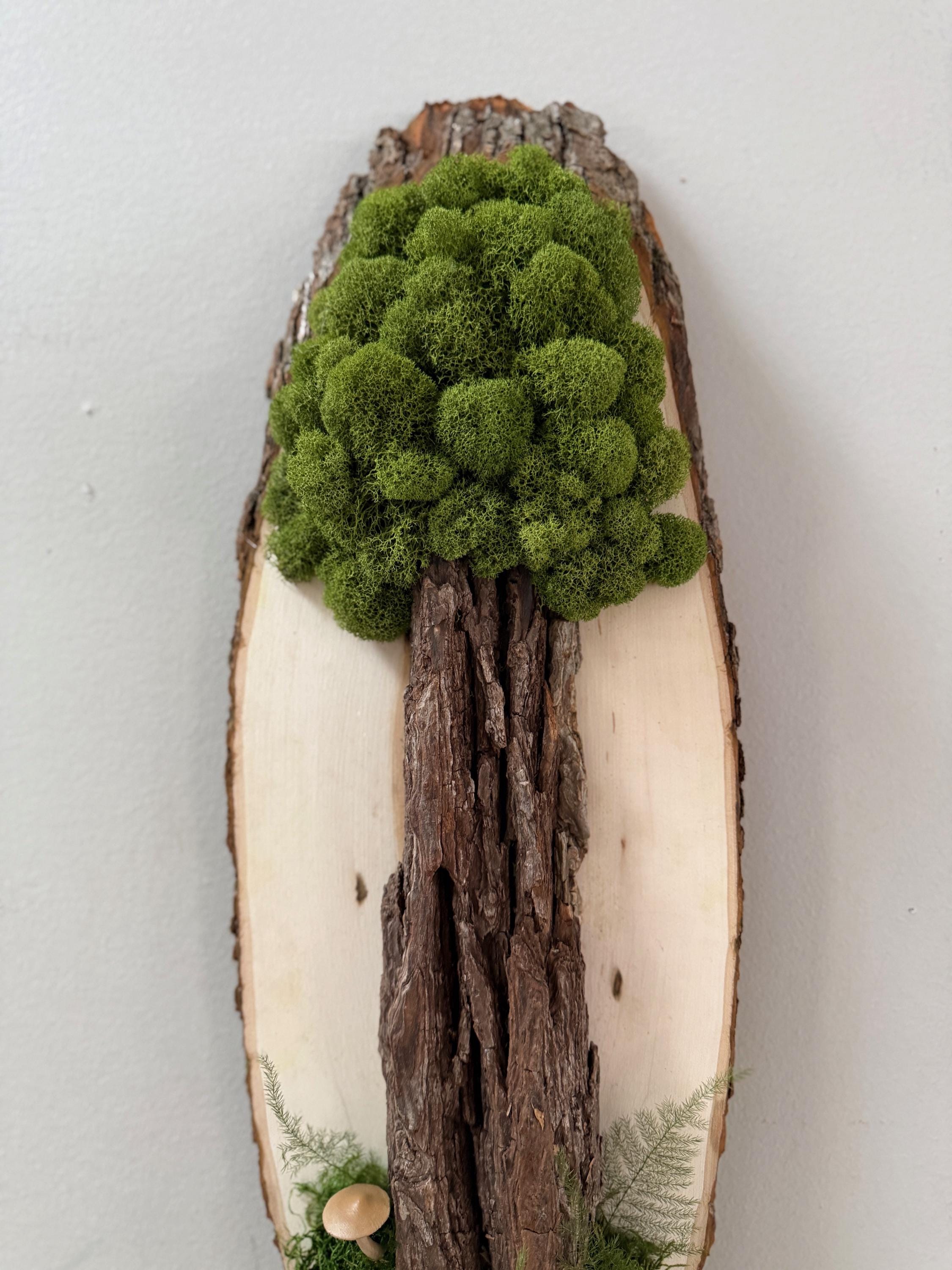 This "tree" was created with a gorgeous piece of dried bark and preserved mosses. All natural dried and preserved botanicals. Lovely, large wall hanging on a real wood slice with raw bark edge. All materials are preserved so no maintenance is required.