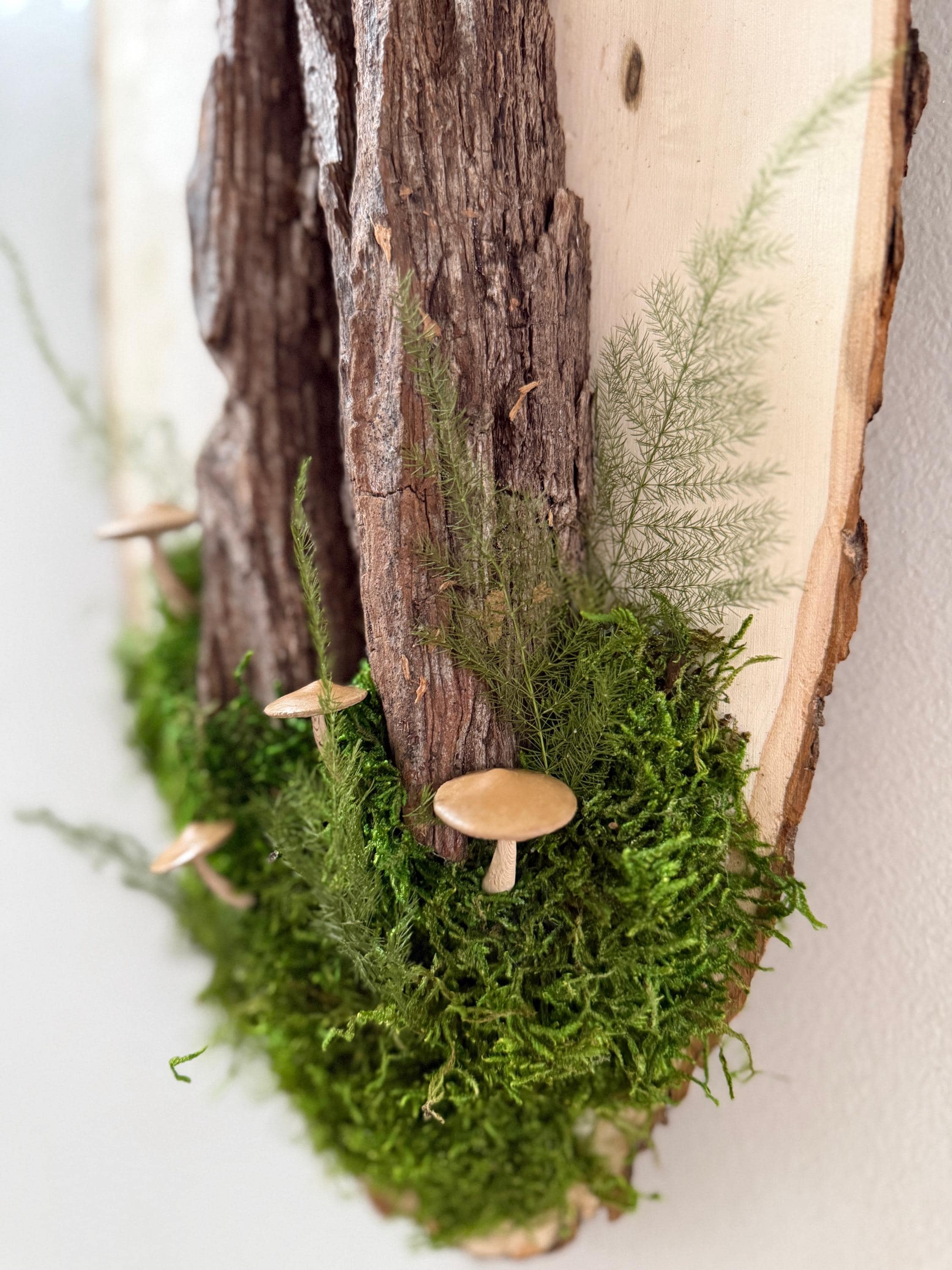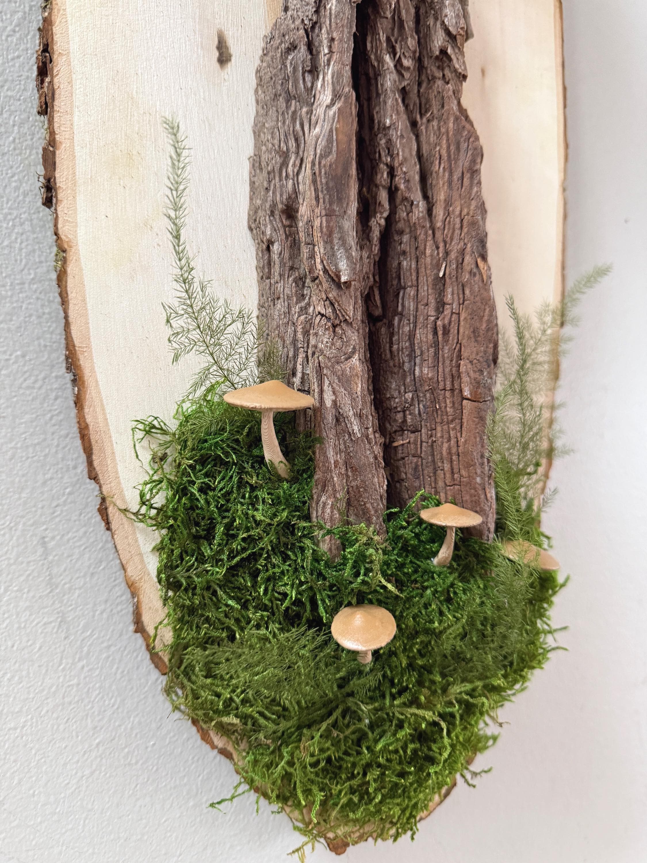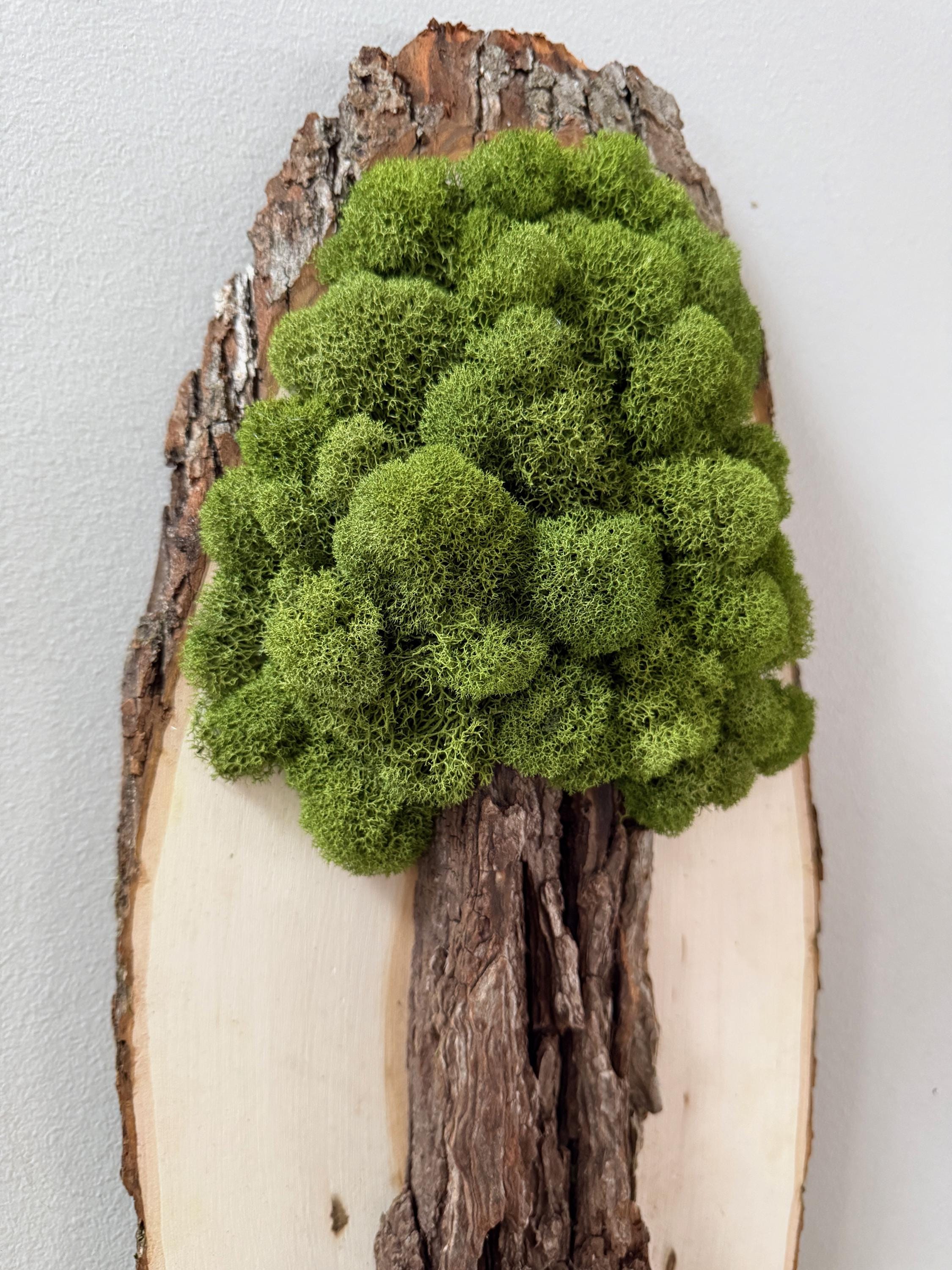This "tree" was created with a gorgeous piece of dried bark and preserved mosses. All natural dried and preserved botanicals. Lovely, large wall hanging on a real wood slice with raw bark edge. All materials are preserved so no maintenance is required.
