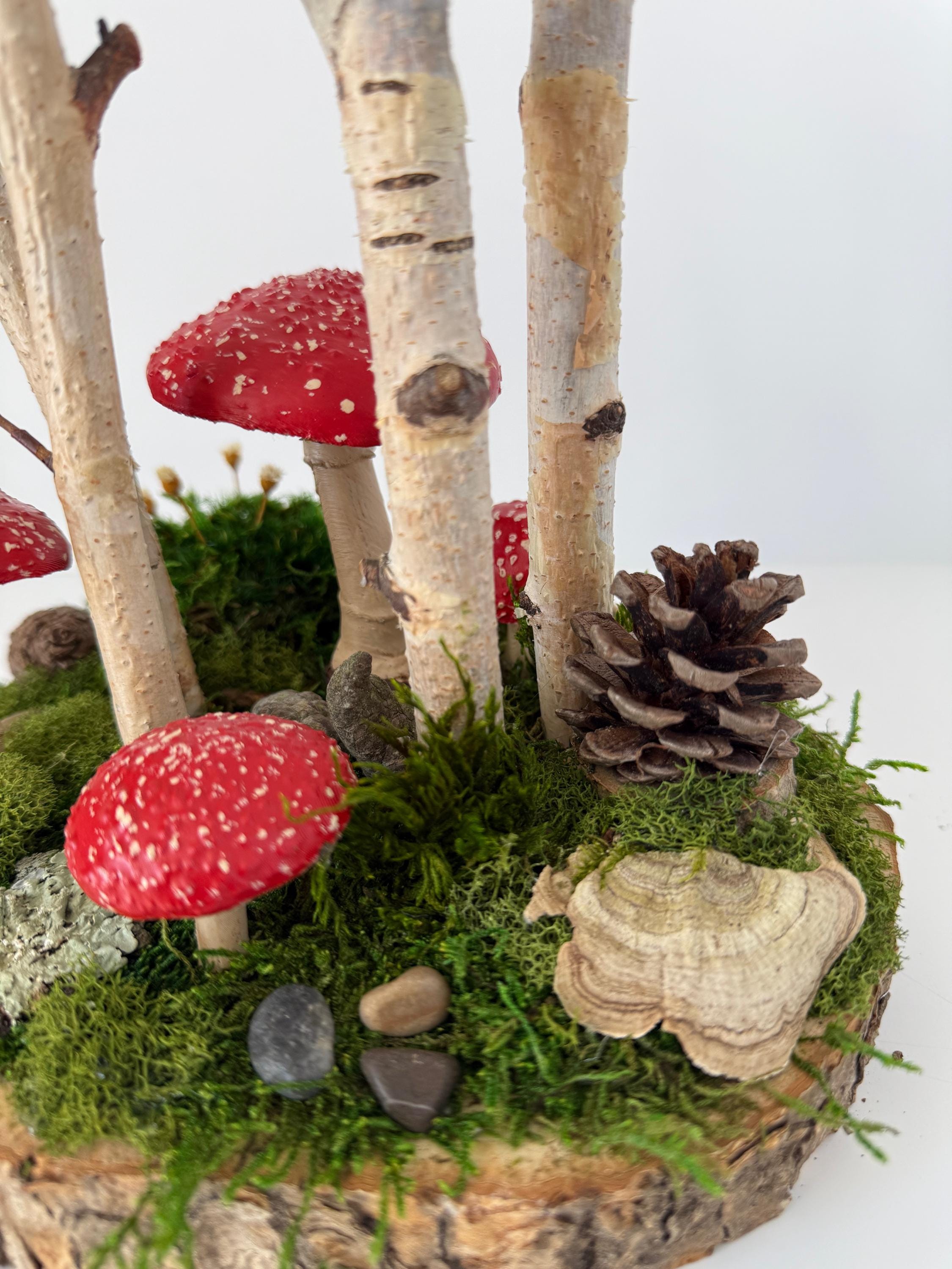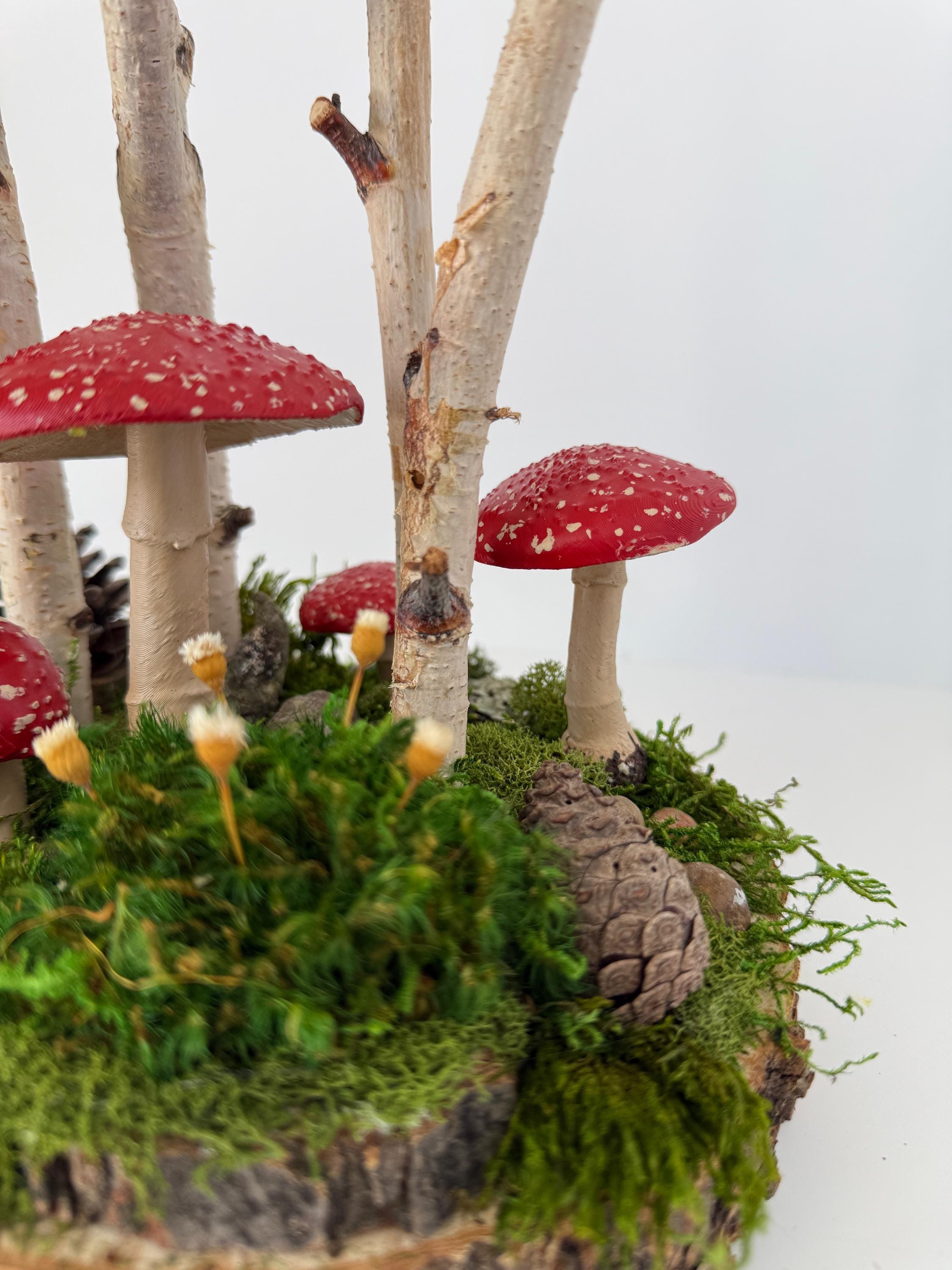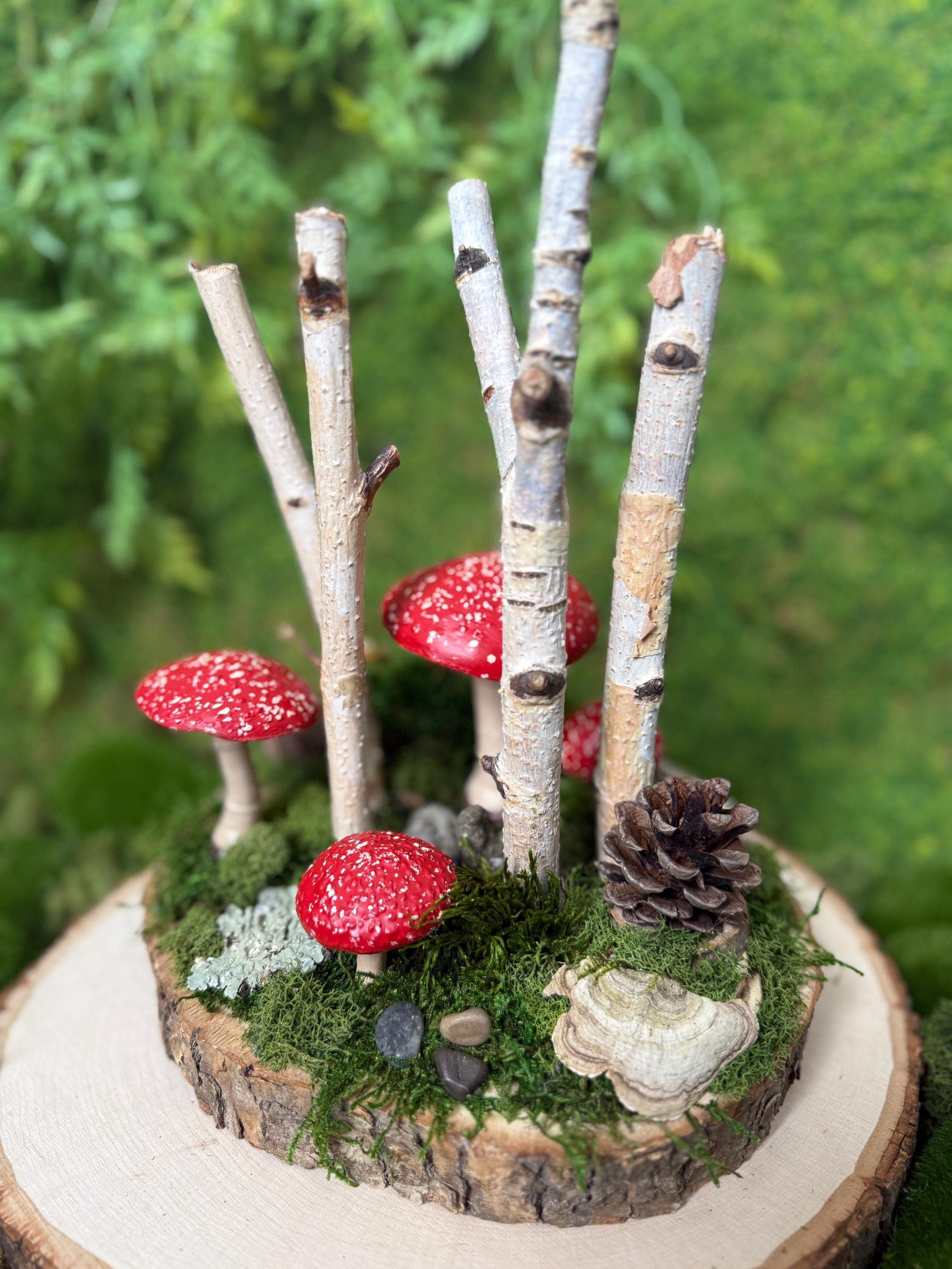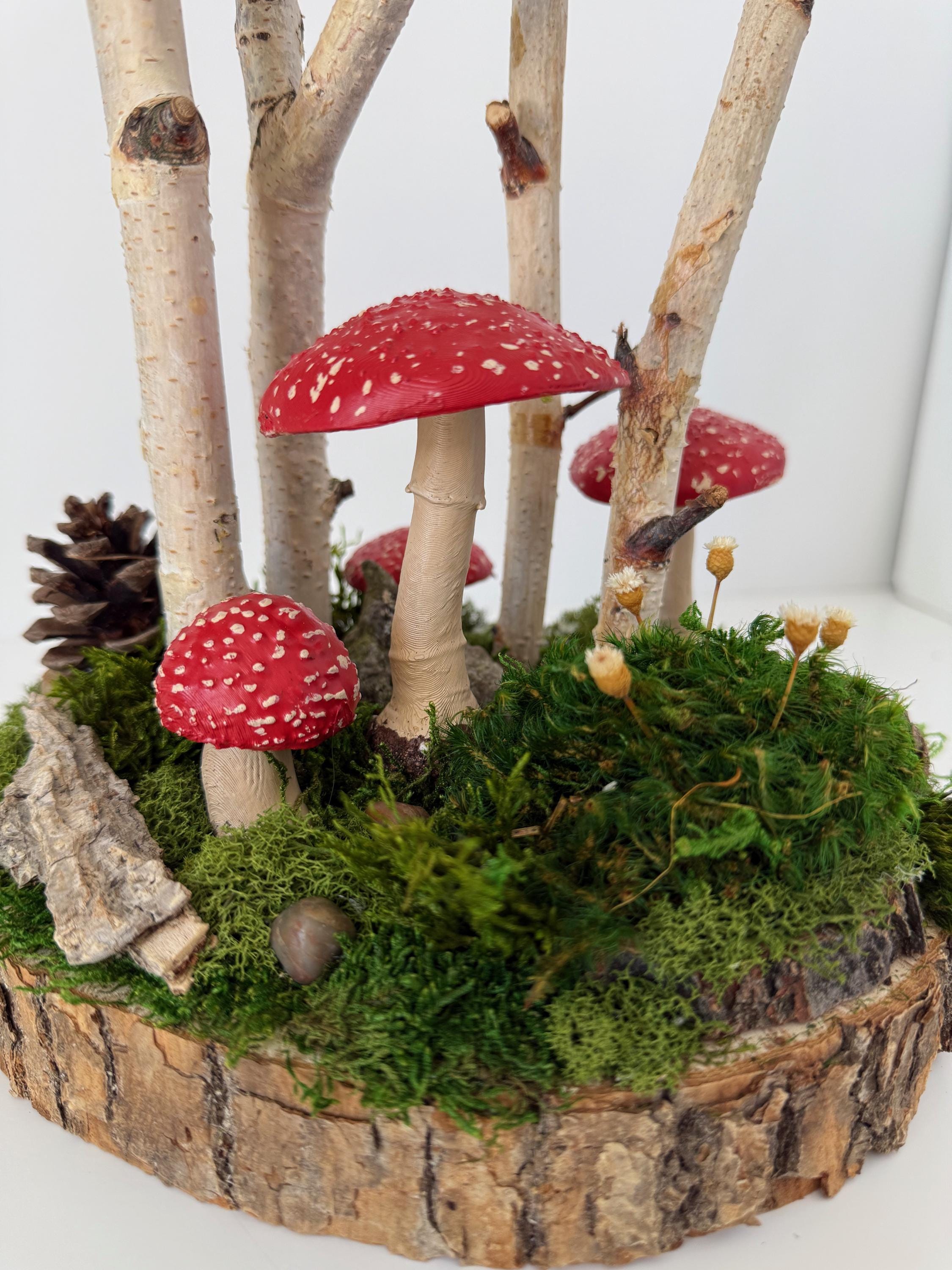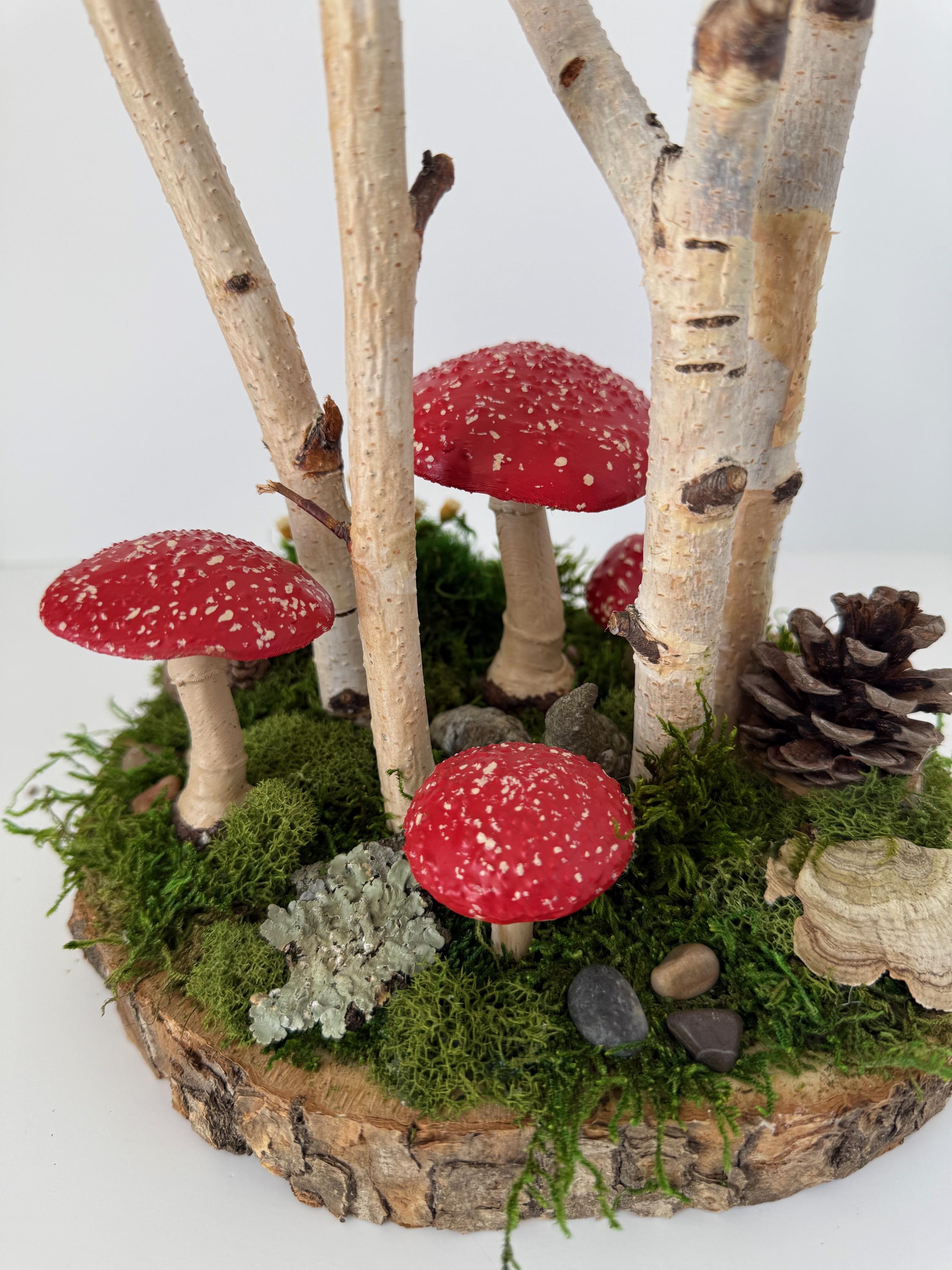 Welcome to a magical forest scene! Real preserved birch branches, mosses, botanicals, lichen and more make my mushrooms feel right at home. Hand-painted mushrooms are made from eco-friendly, plant based, biodegradable PLA. Moss is preserved to stay green and beautiful with no maintenance. Base is a slice of real hardwood.