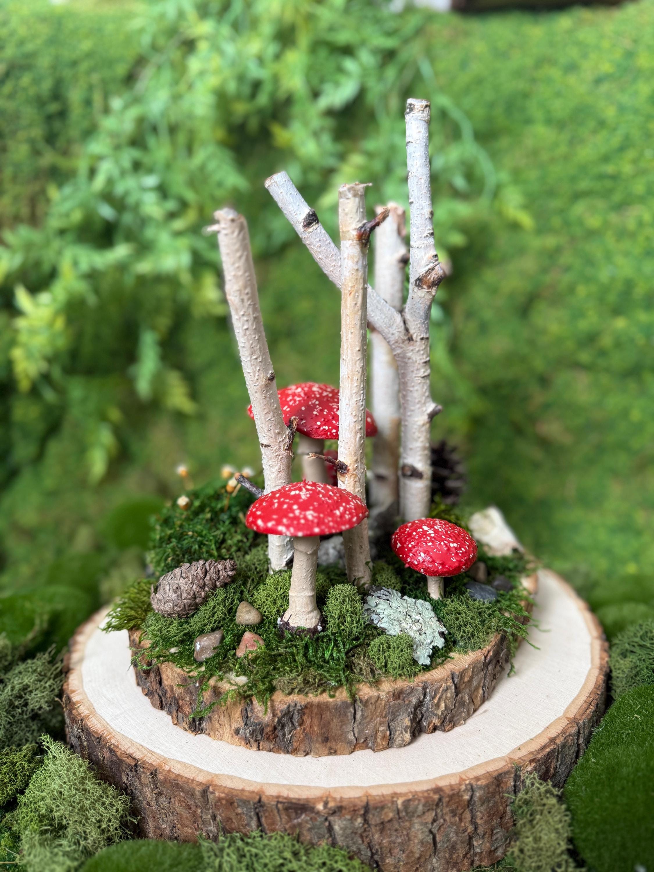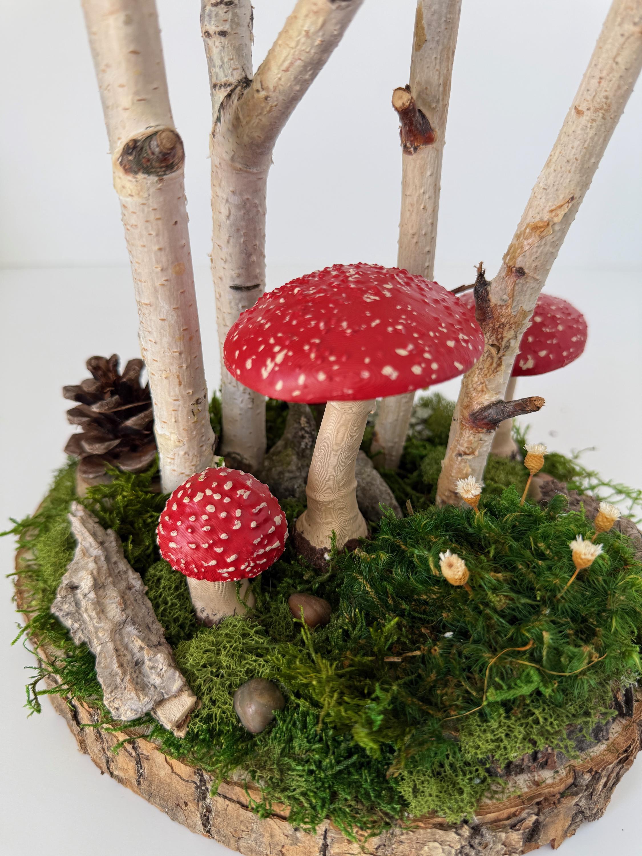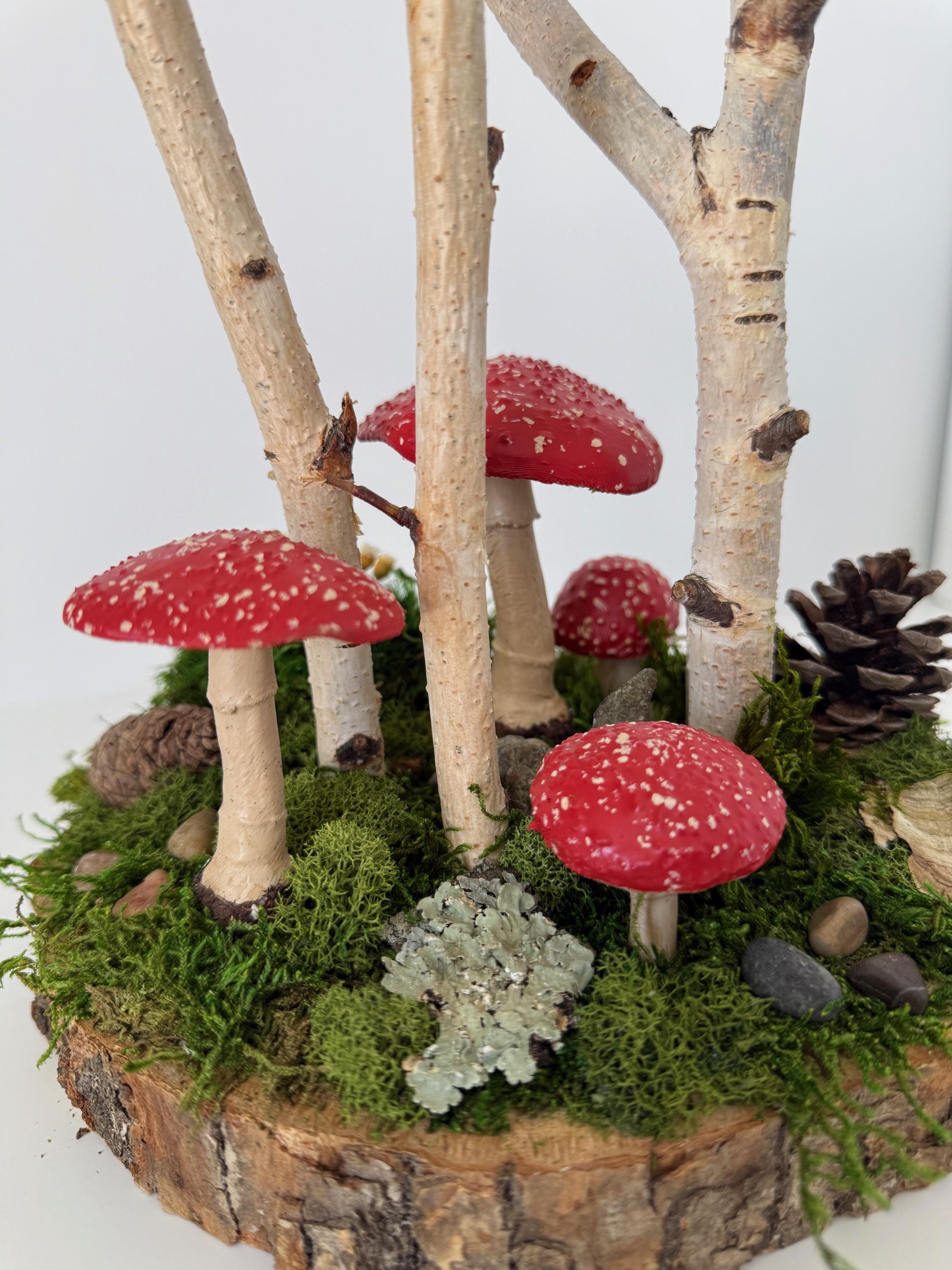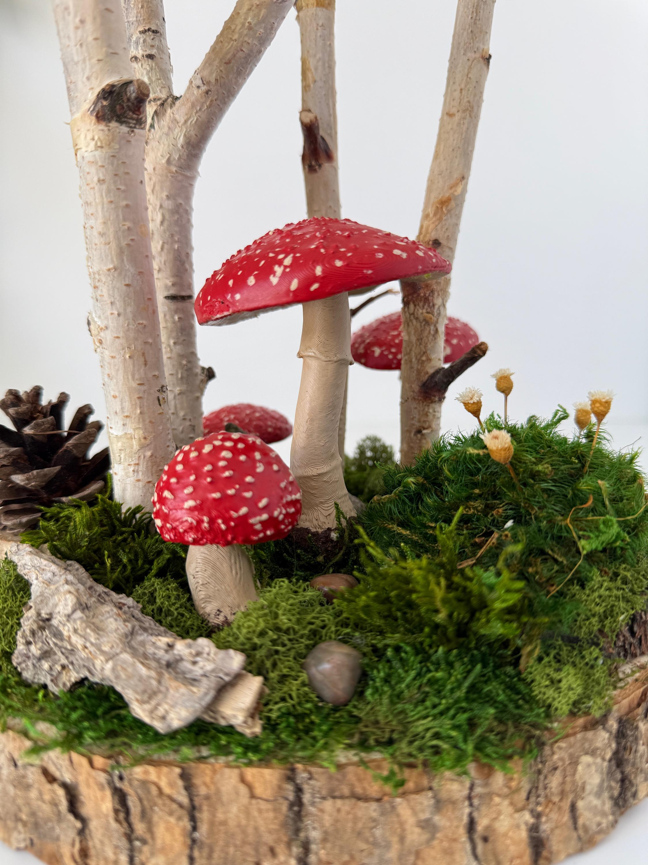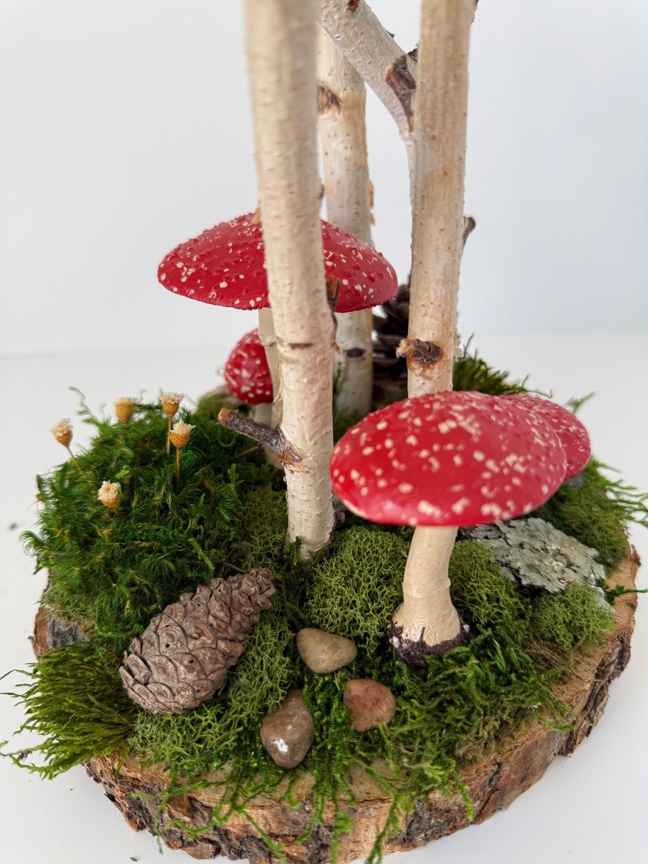 Welcome to a magical forest scene! Real preserved birch branches, mosses, botanicals, lichen and more make my mushrooms feel right at home. Hand-painted mushrooms are made from eco-friendly, plant based, biodegradable PLA. Moss is preserved to stay green and beautiful with no maintenance. Base is a slice of real hardwood.