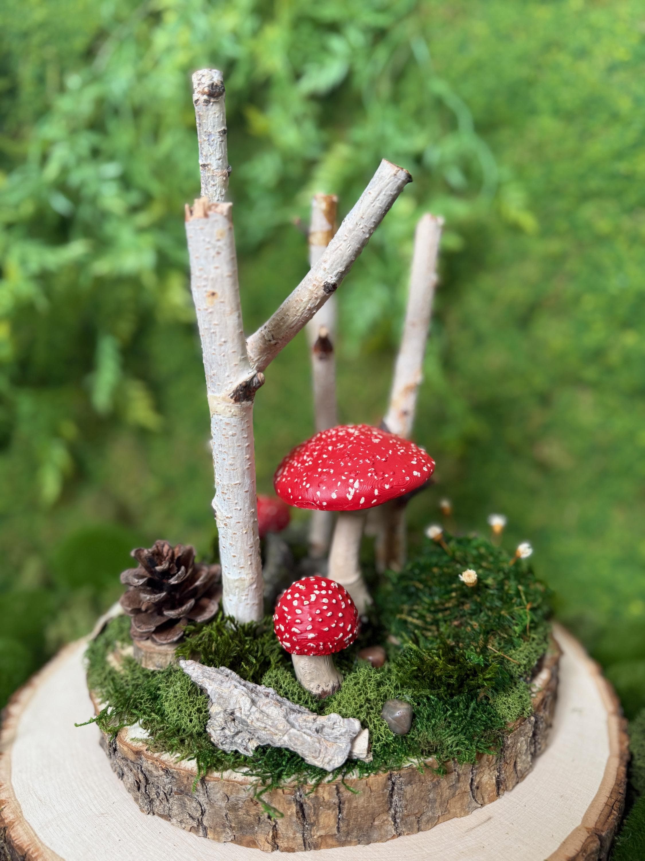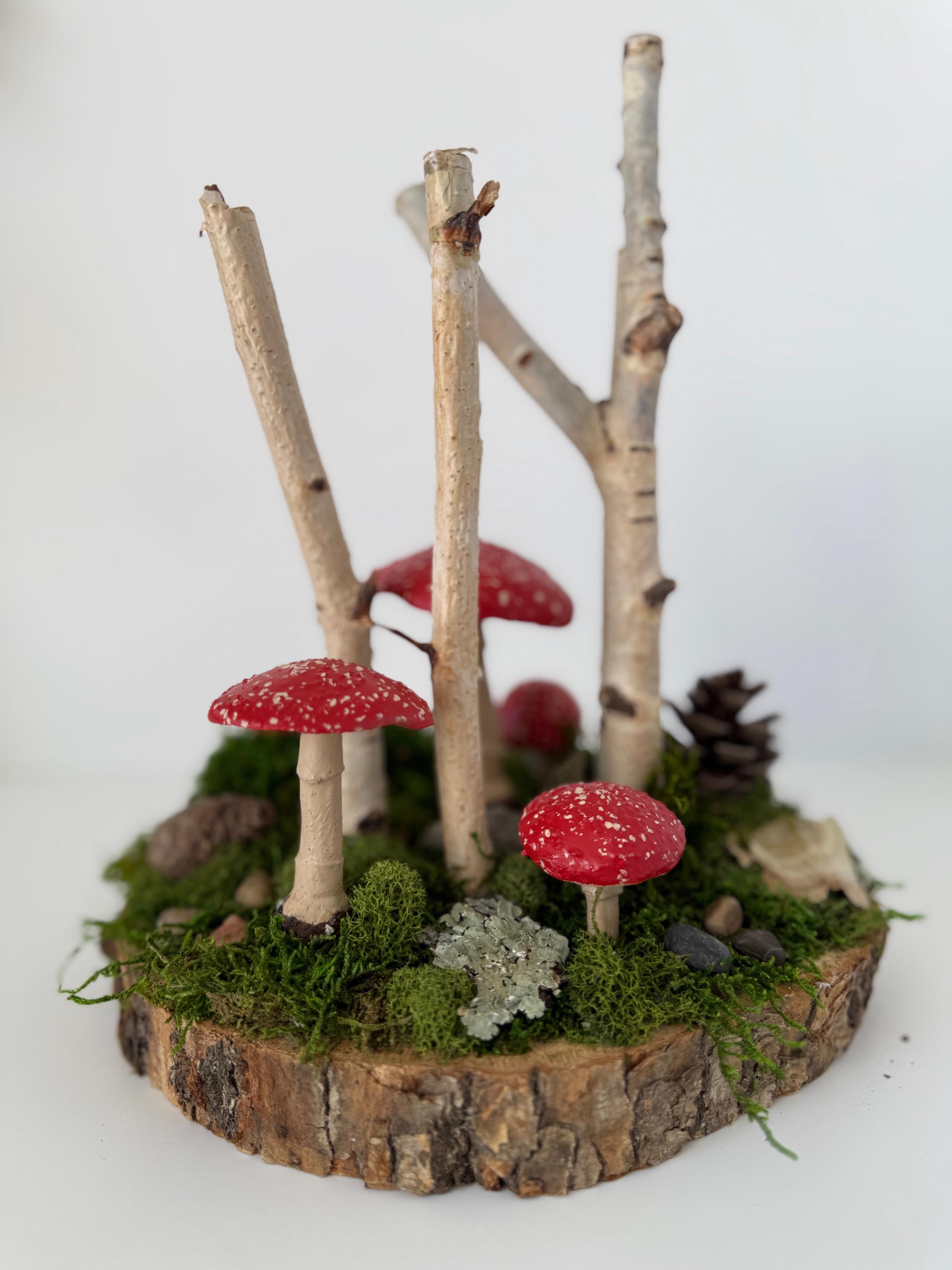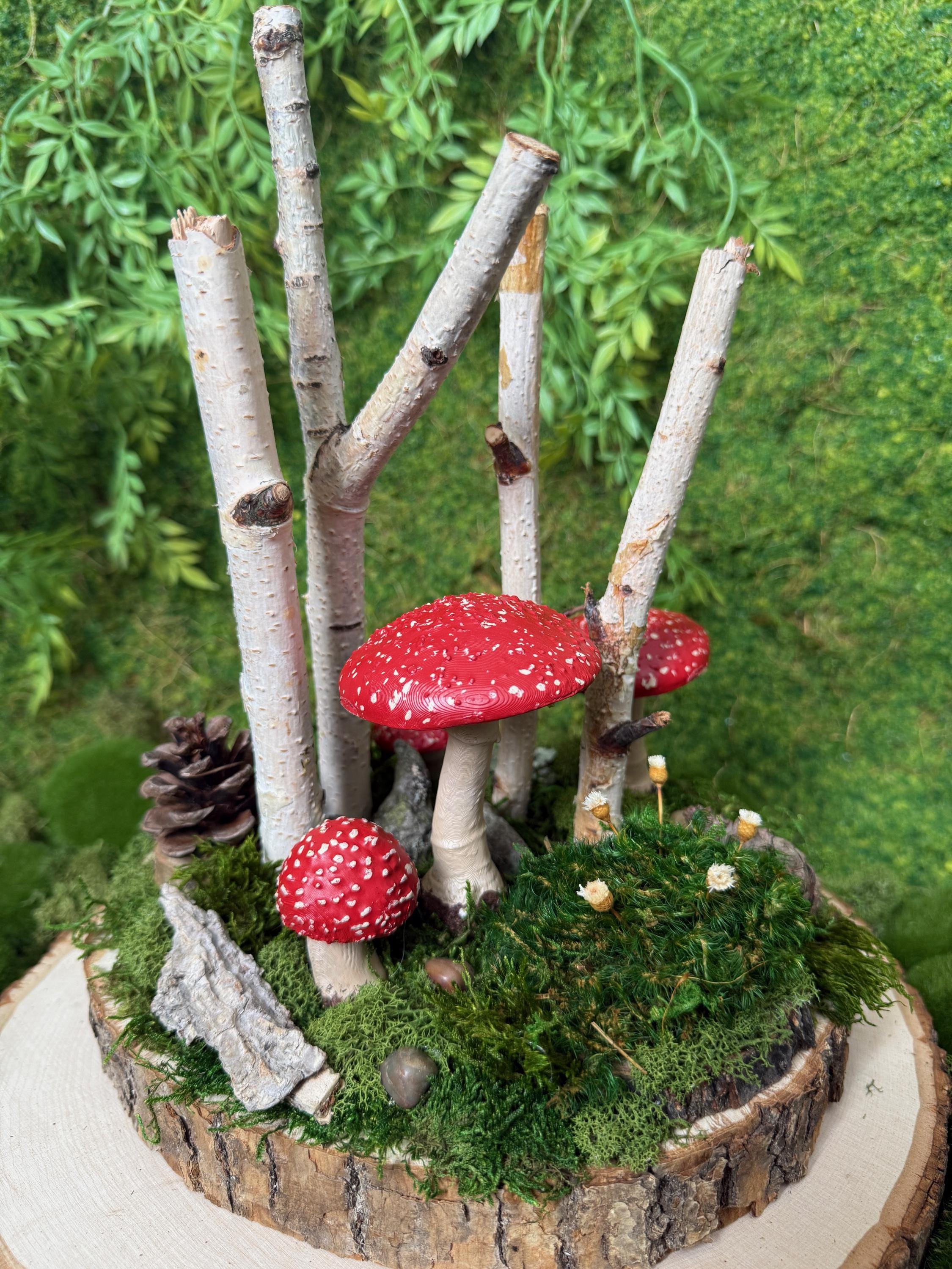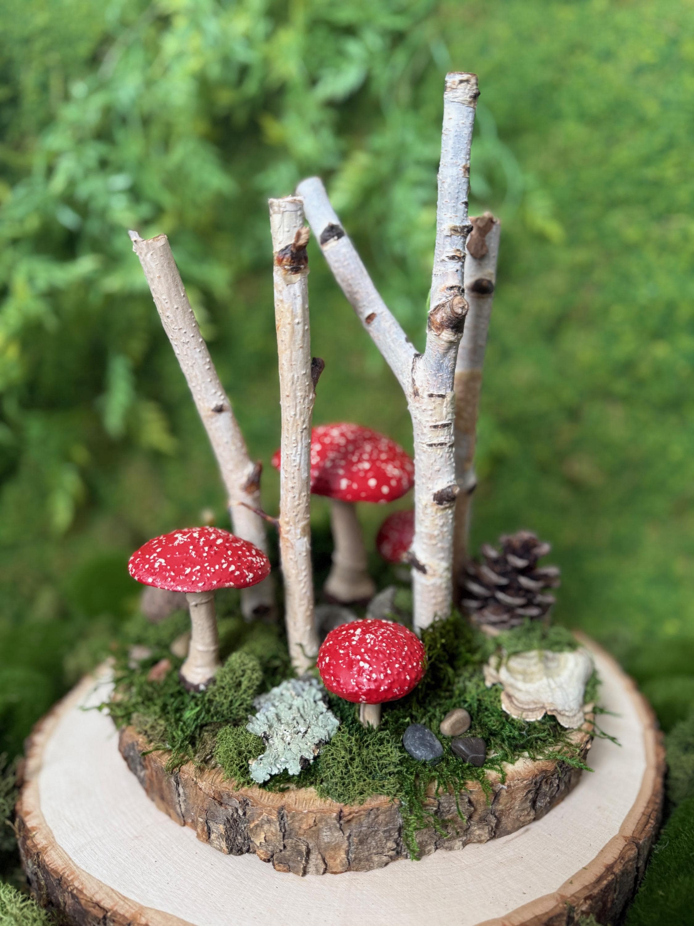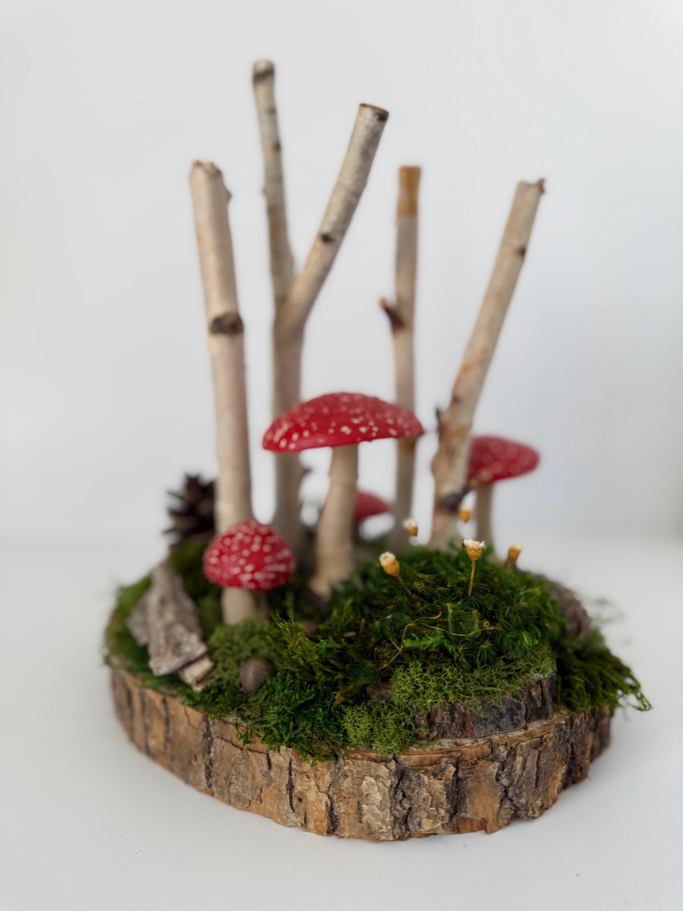 Welcome to a magical forest scene! Real preserved birch branches, mosses, botanicals, lichen and more make my mushrooms feel right at home. Hand-painted mushrooms are made from eco-friendly, plant based, biodegradable PLA. Moss is preserved to stay green and beautiful with no maintenance. Base is a slice of real hardwood.