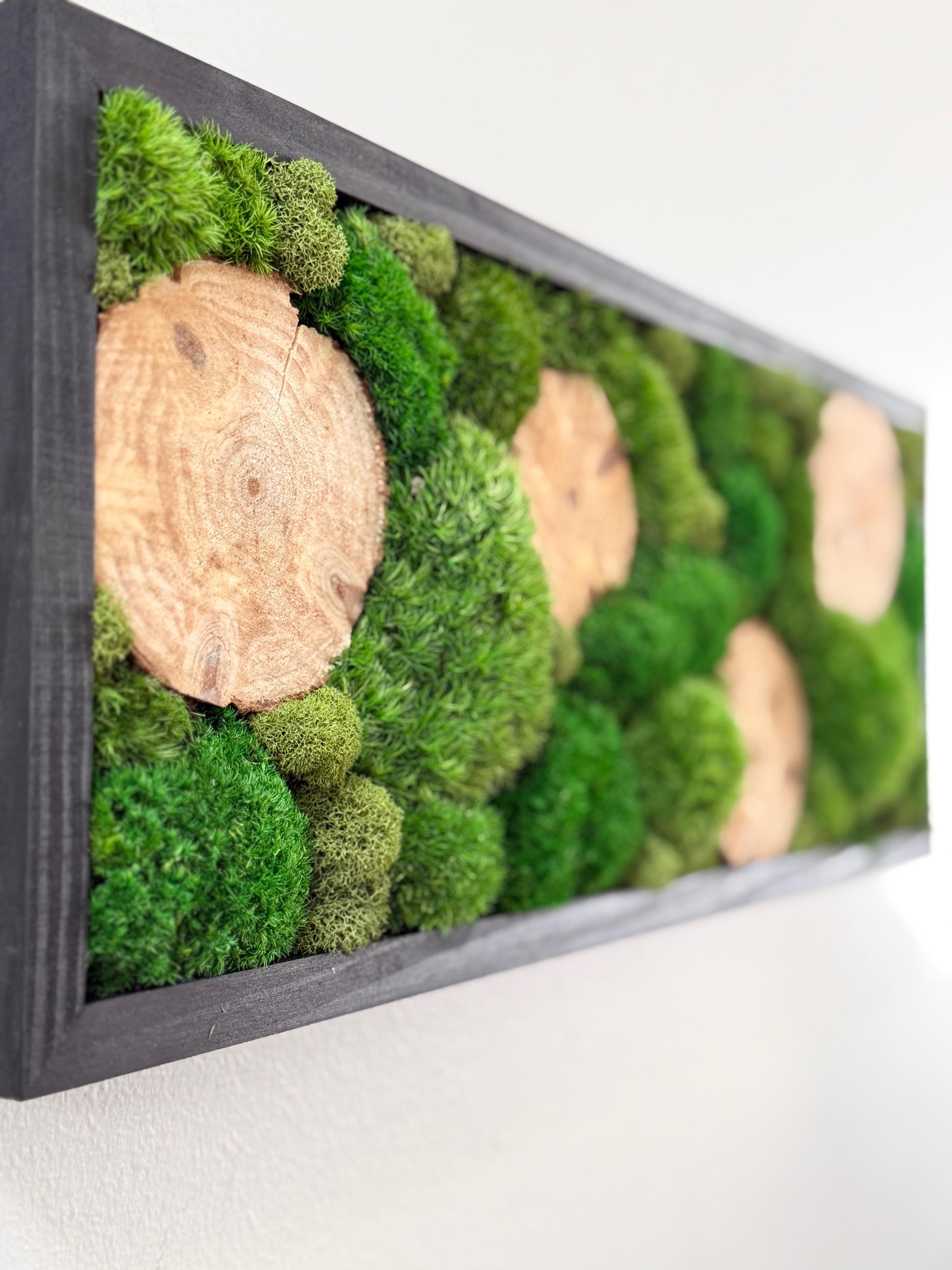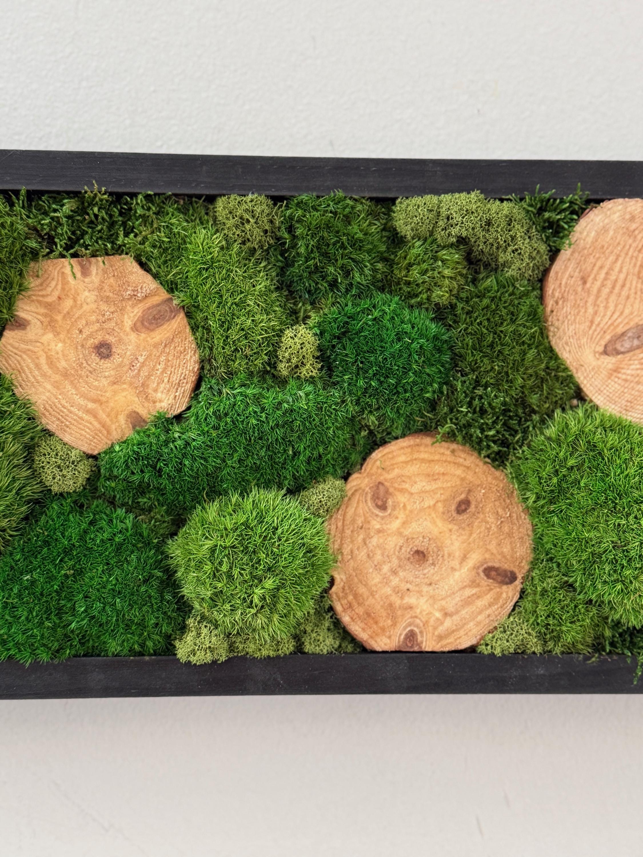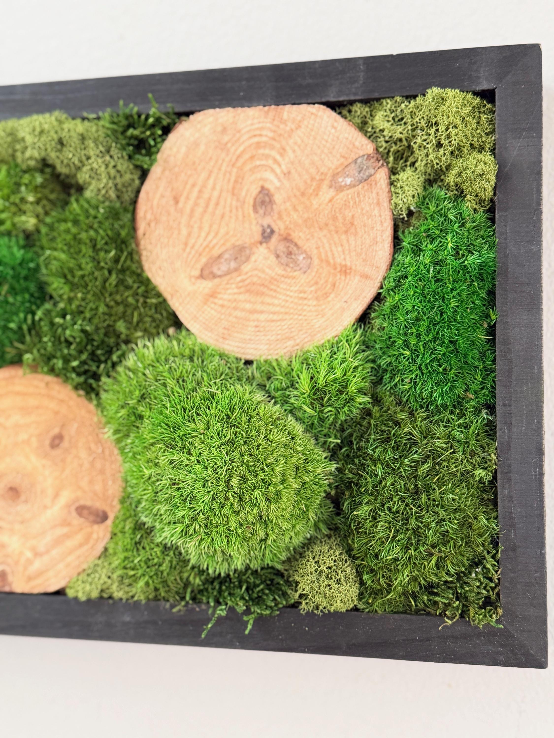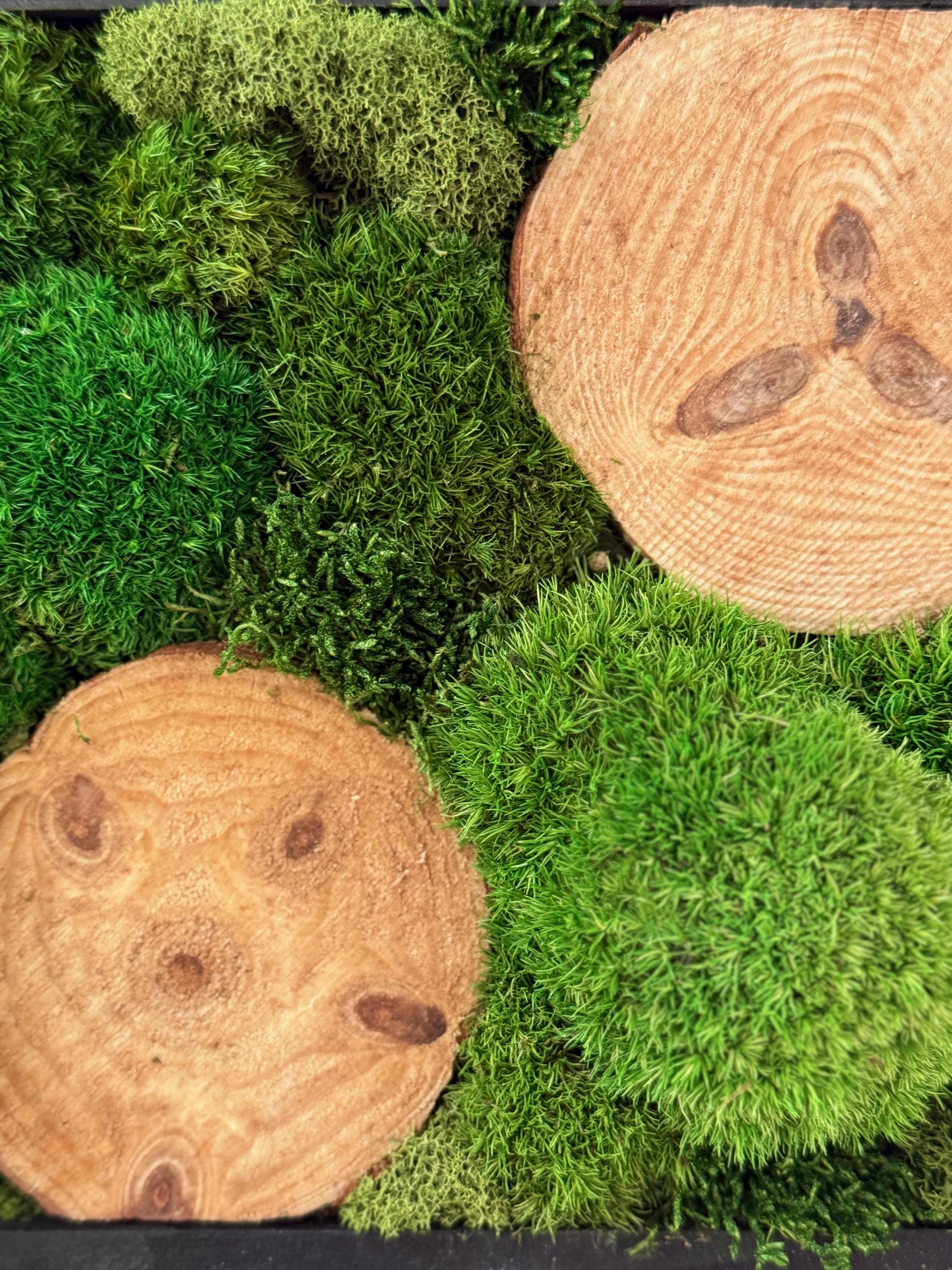 Serene live art done in a variety of preserved mosses and wood slices. Replicating a woodland glen in soothing shades of green set in a black wood frame. All materials are preserved so no maintenance is required.