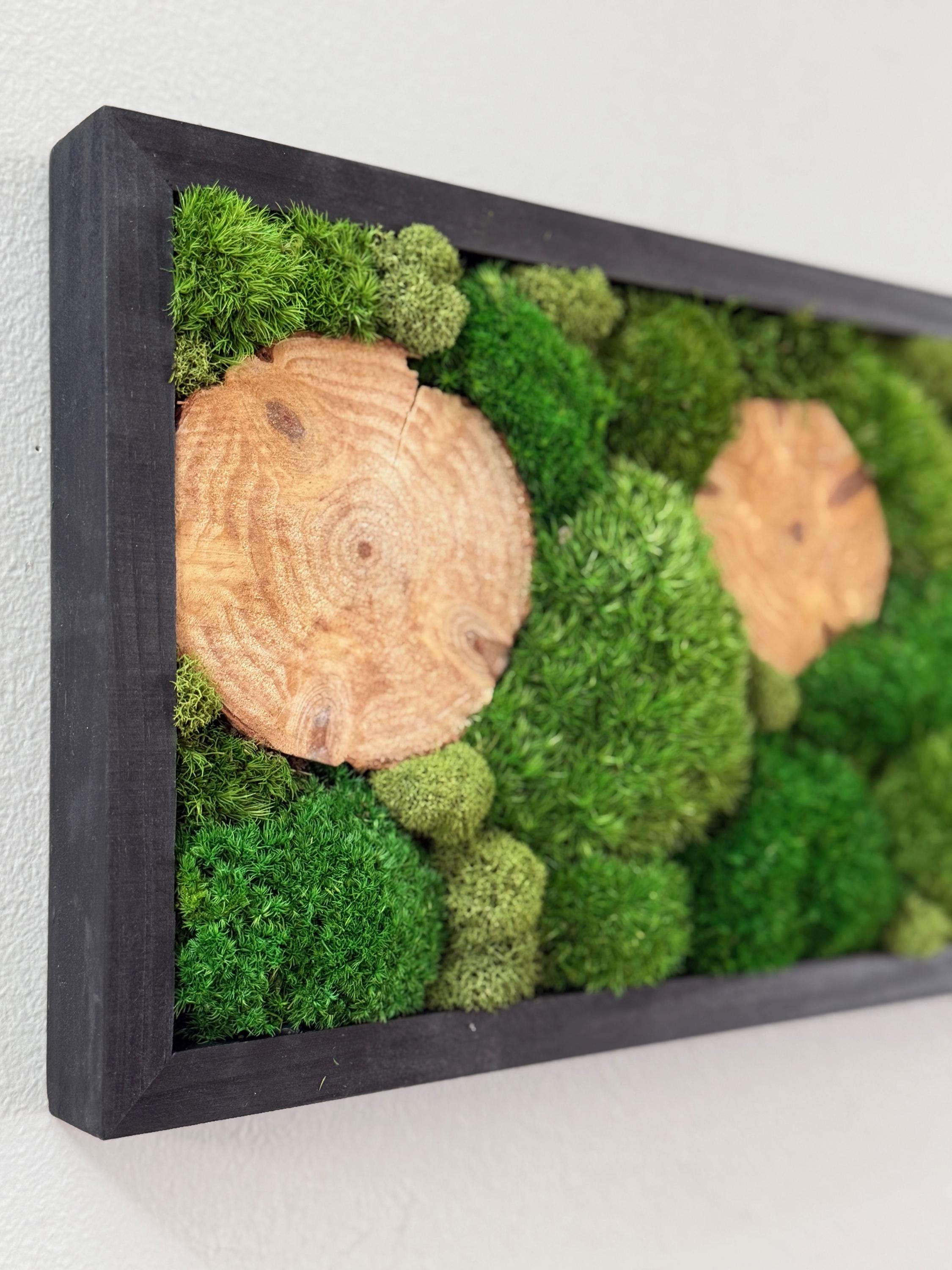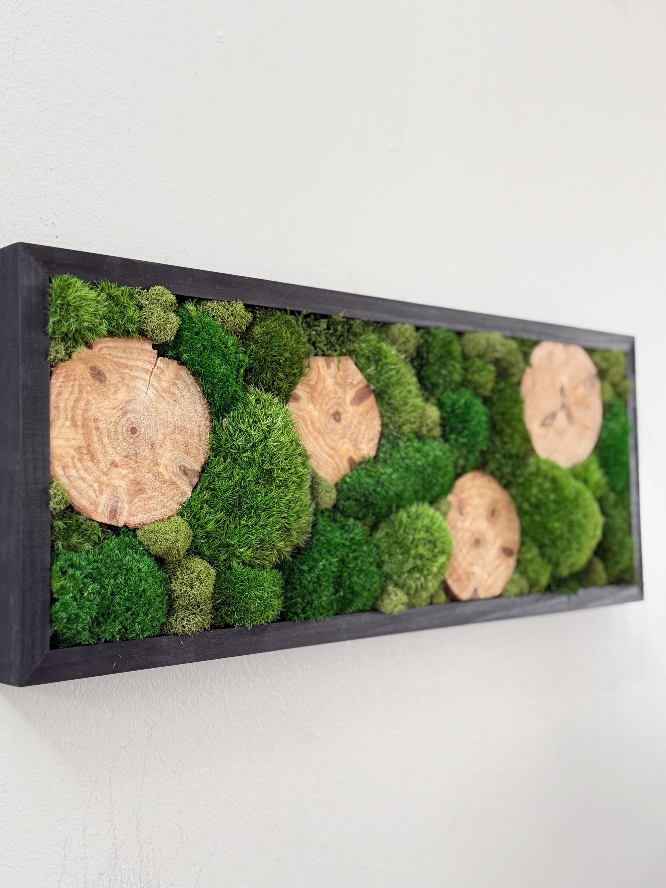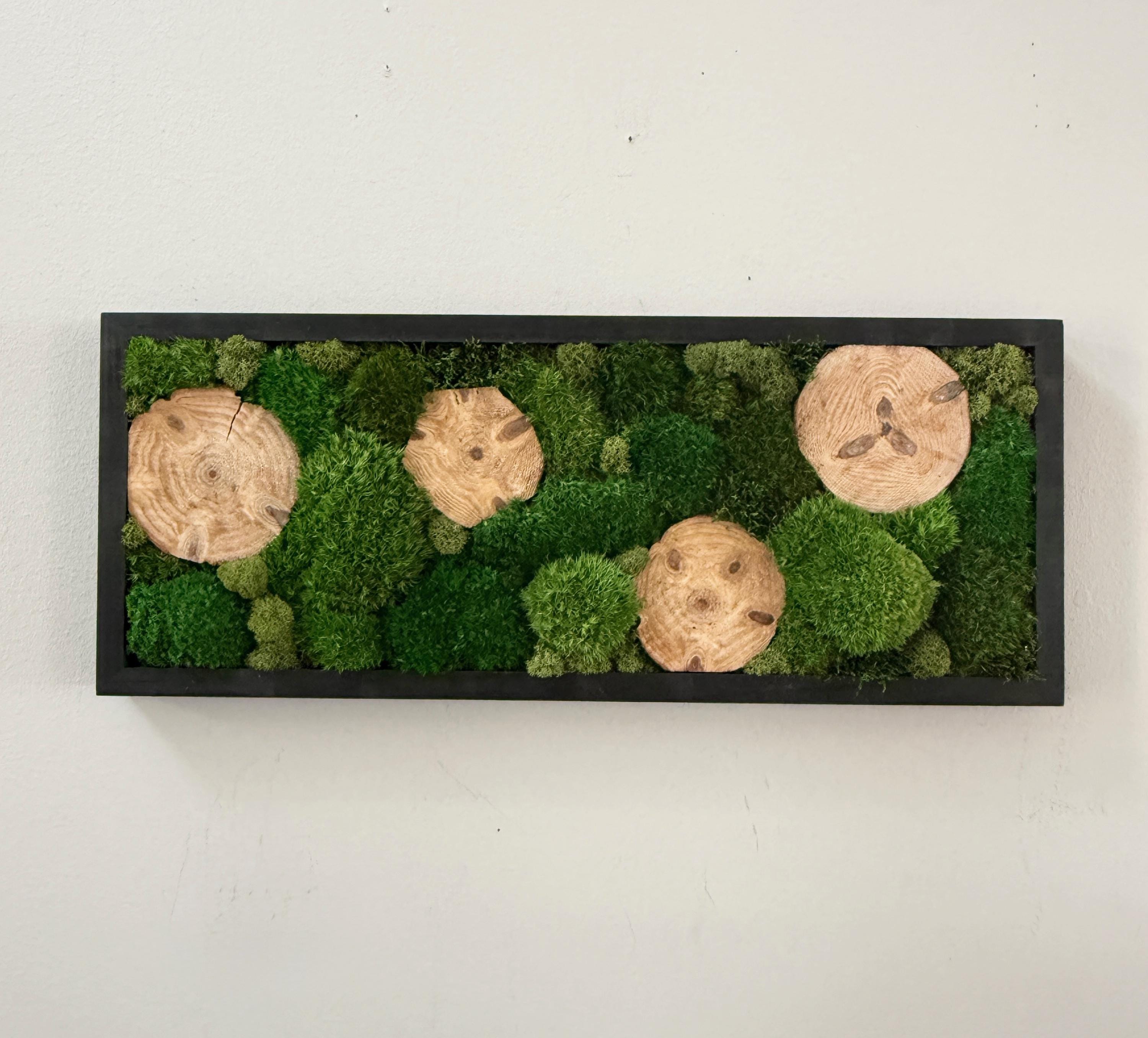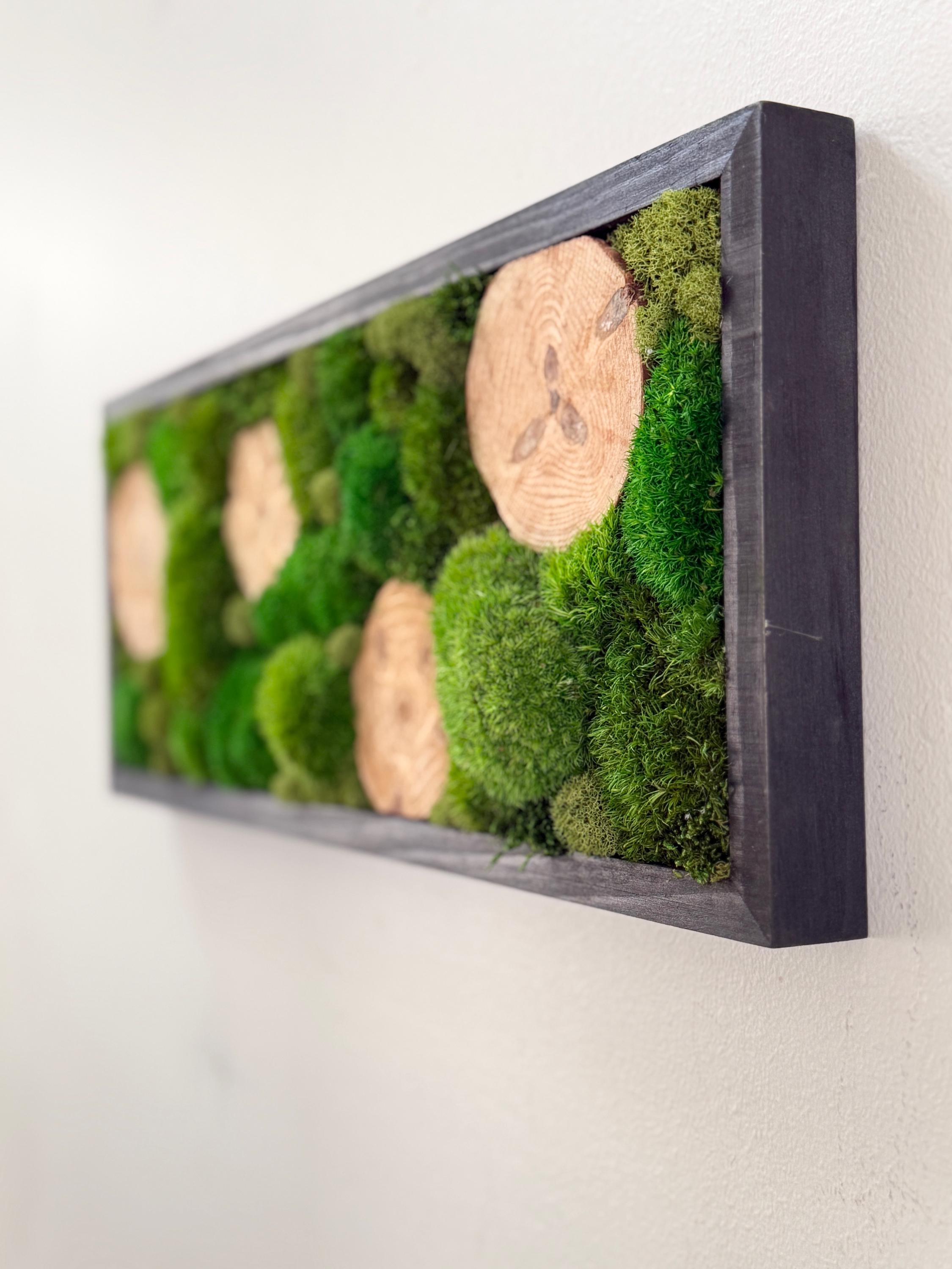Serene live art done in a variety of preserved mosses and wood slices. Replicating a woodland glen in soothing shades of green set in a black wood frame. All materials are preserved so no maintenance is required.