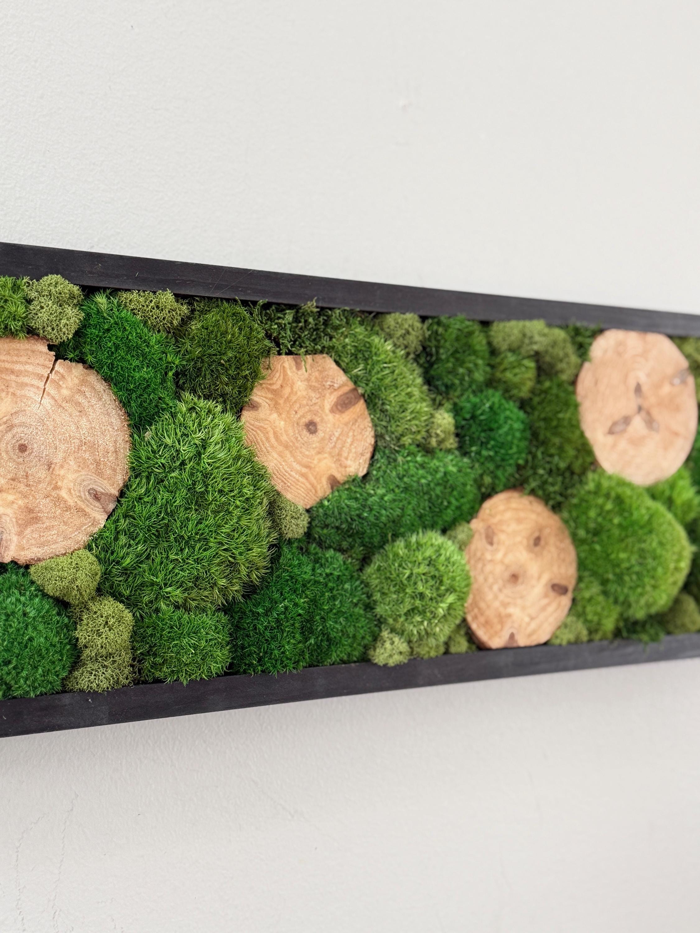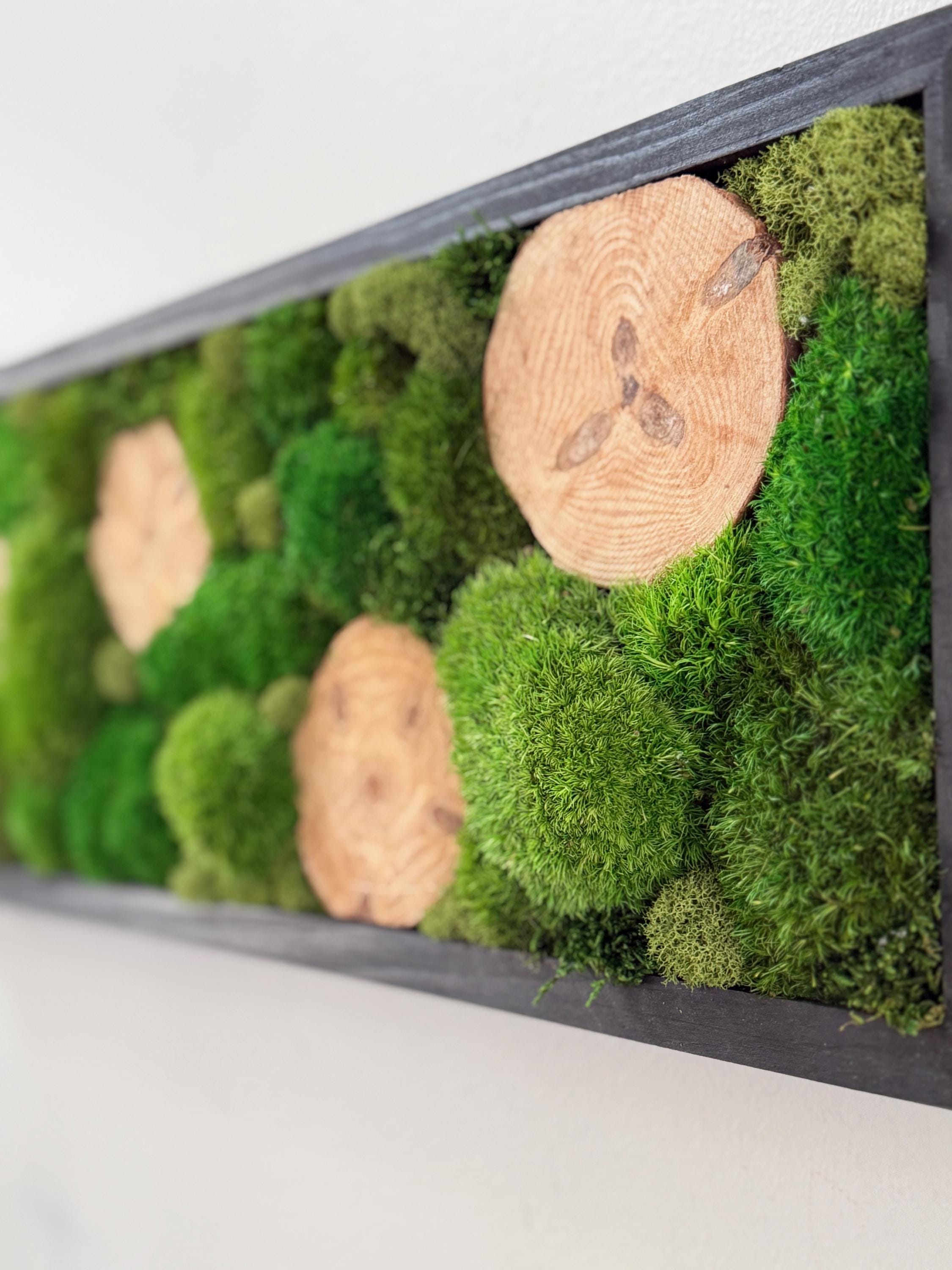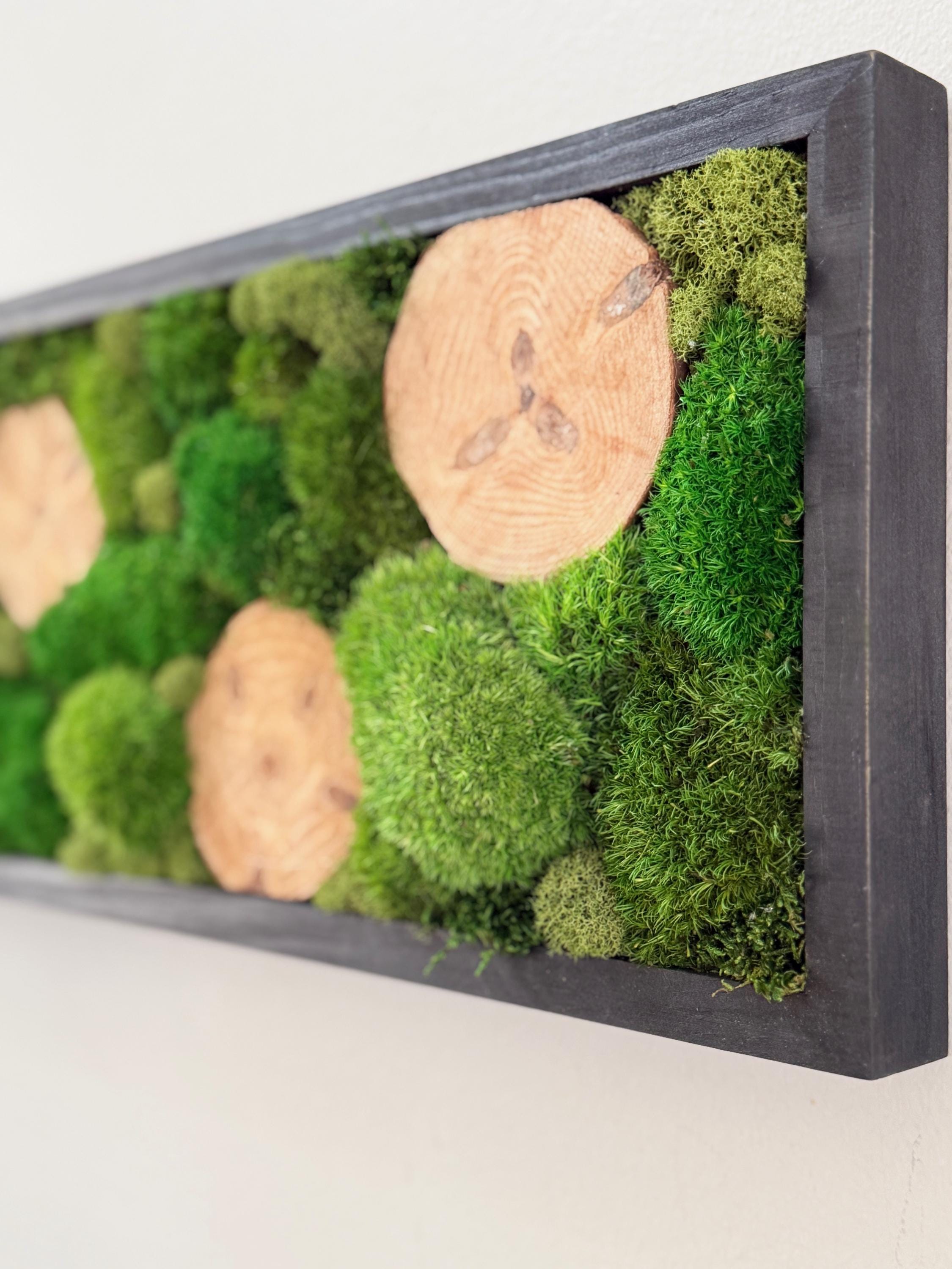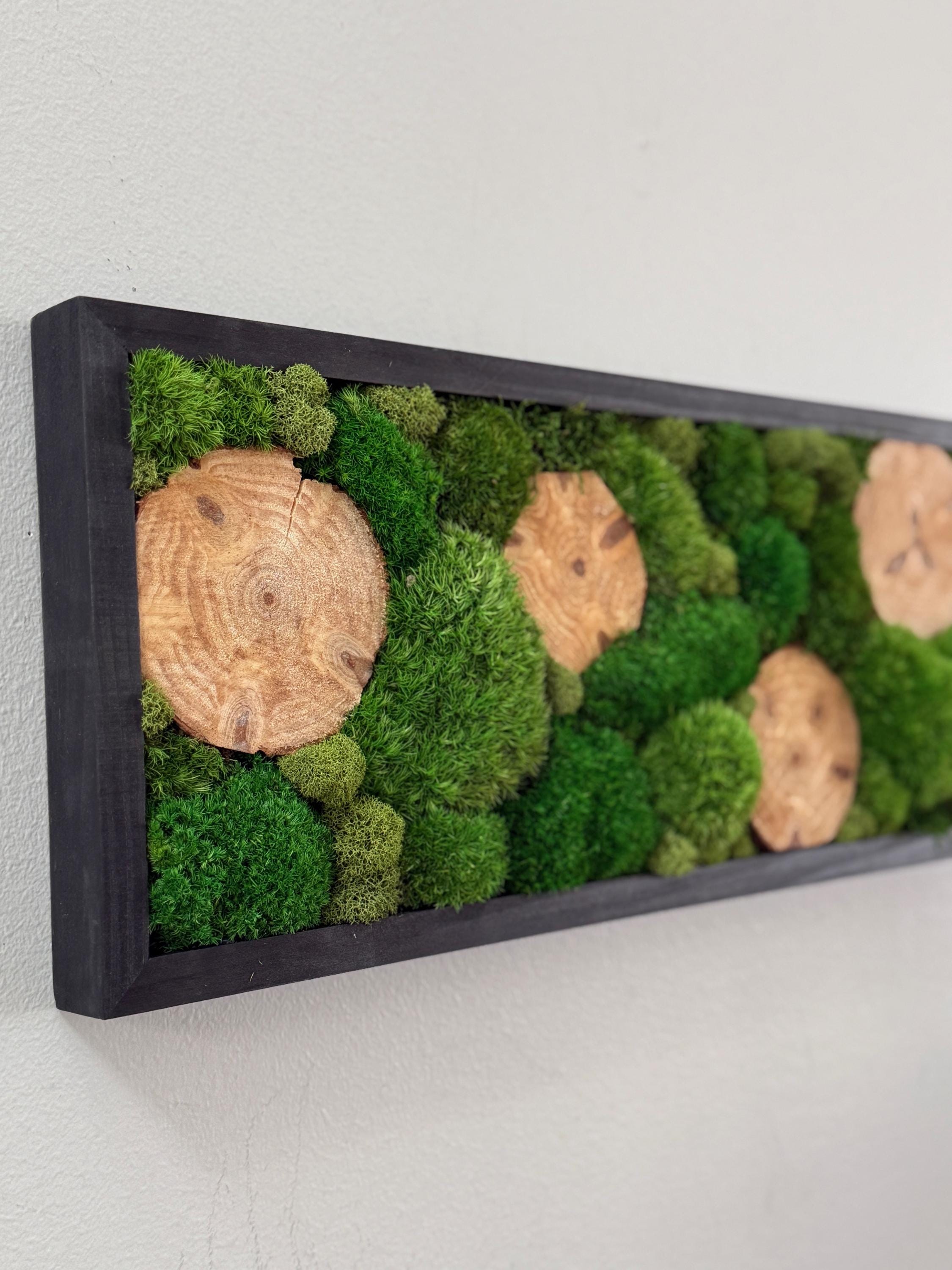 Serene live art done in a variety of preserved mosses and wood slices. Replicating a woodland glen in soothing shades of green set in a black wood frame. All materials are preserved so no maintenance is required.
