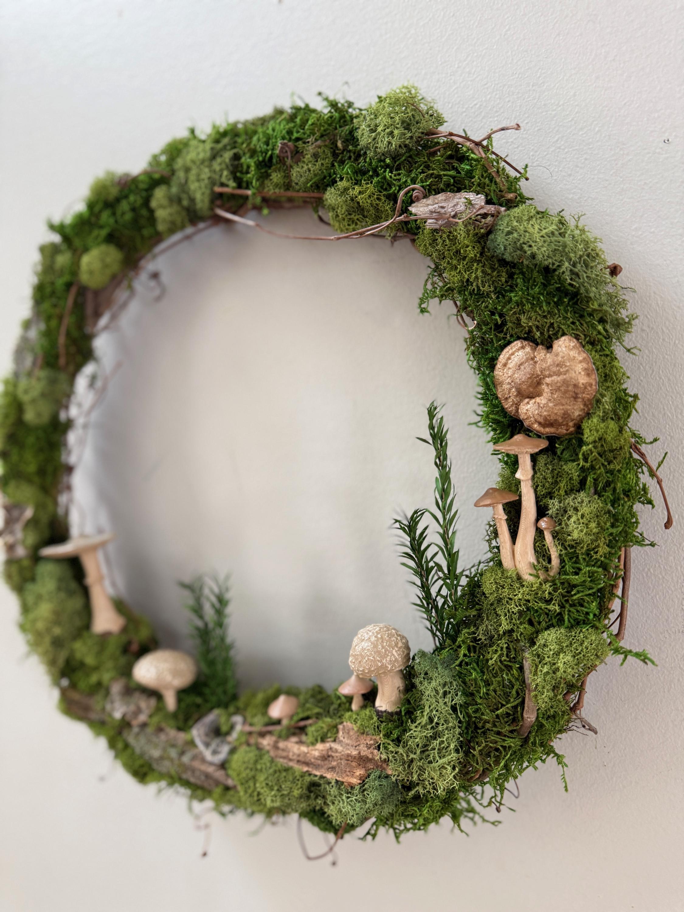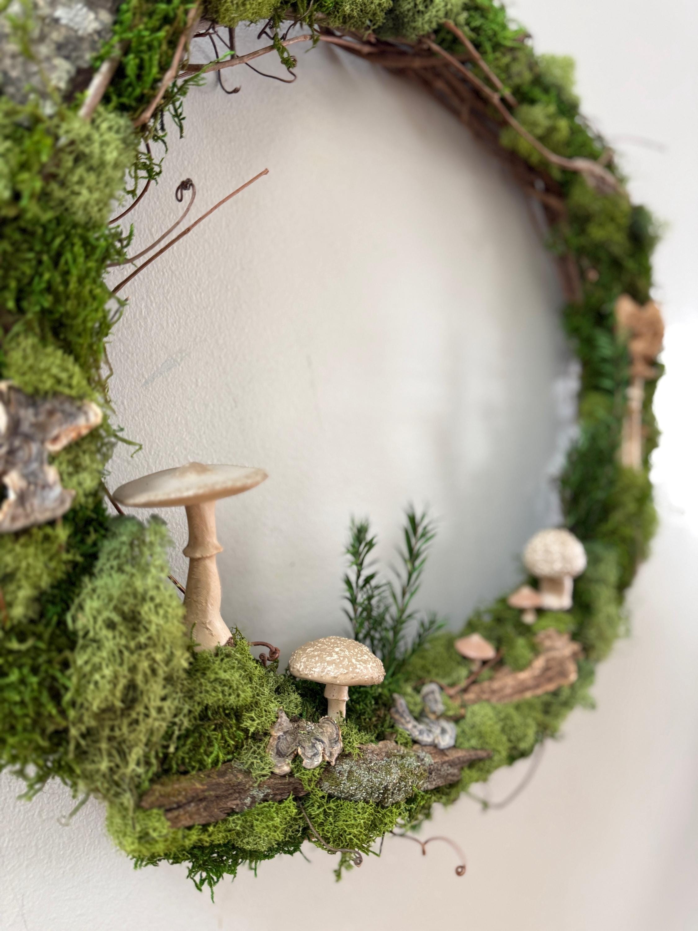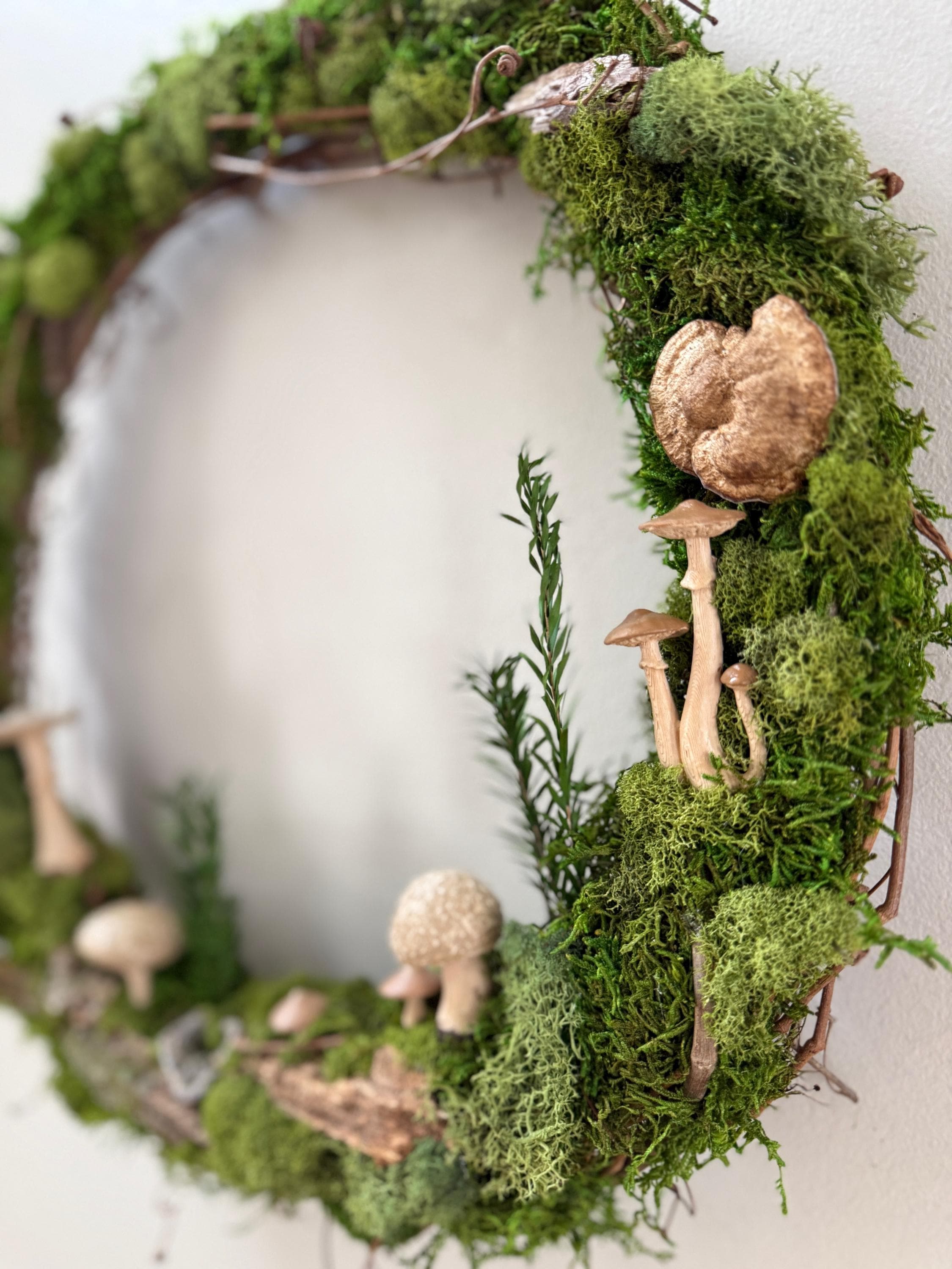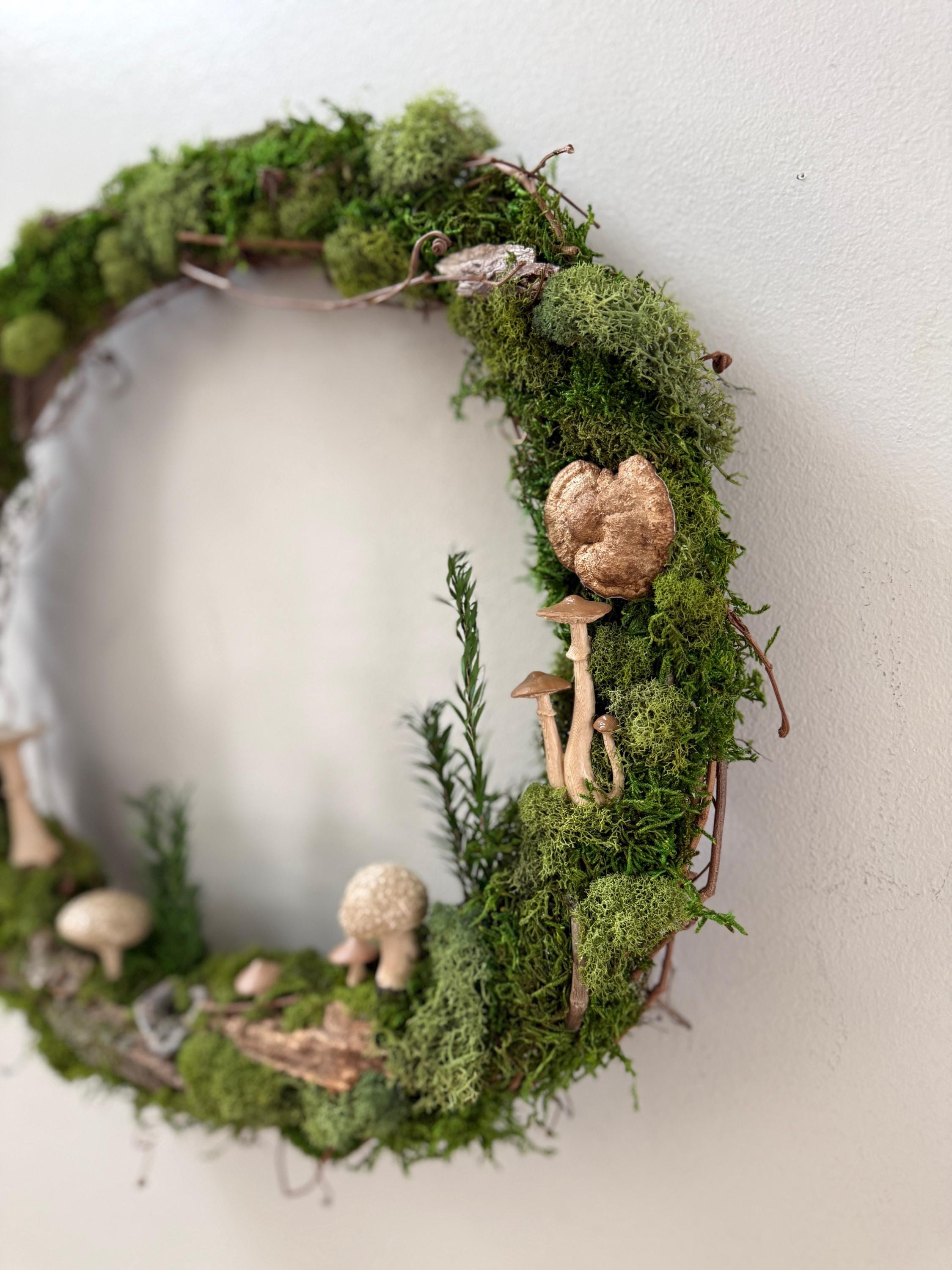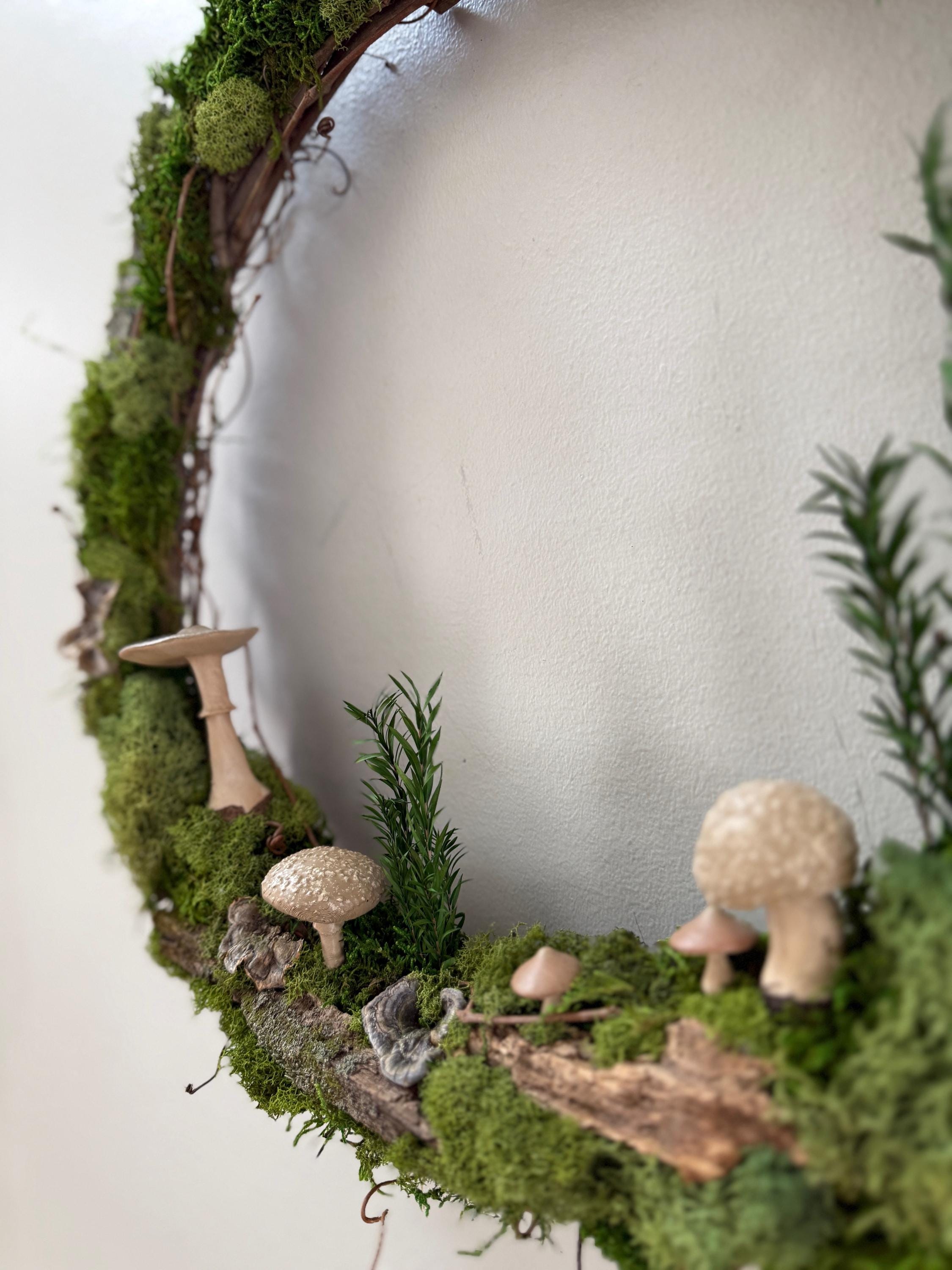 Woodland wreath made with preserved mosses, dried turkey tail mushrooms, pine cones, mossy bark, and handpainted mushrooms.
