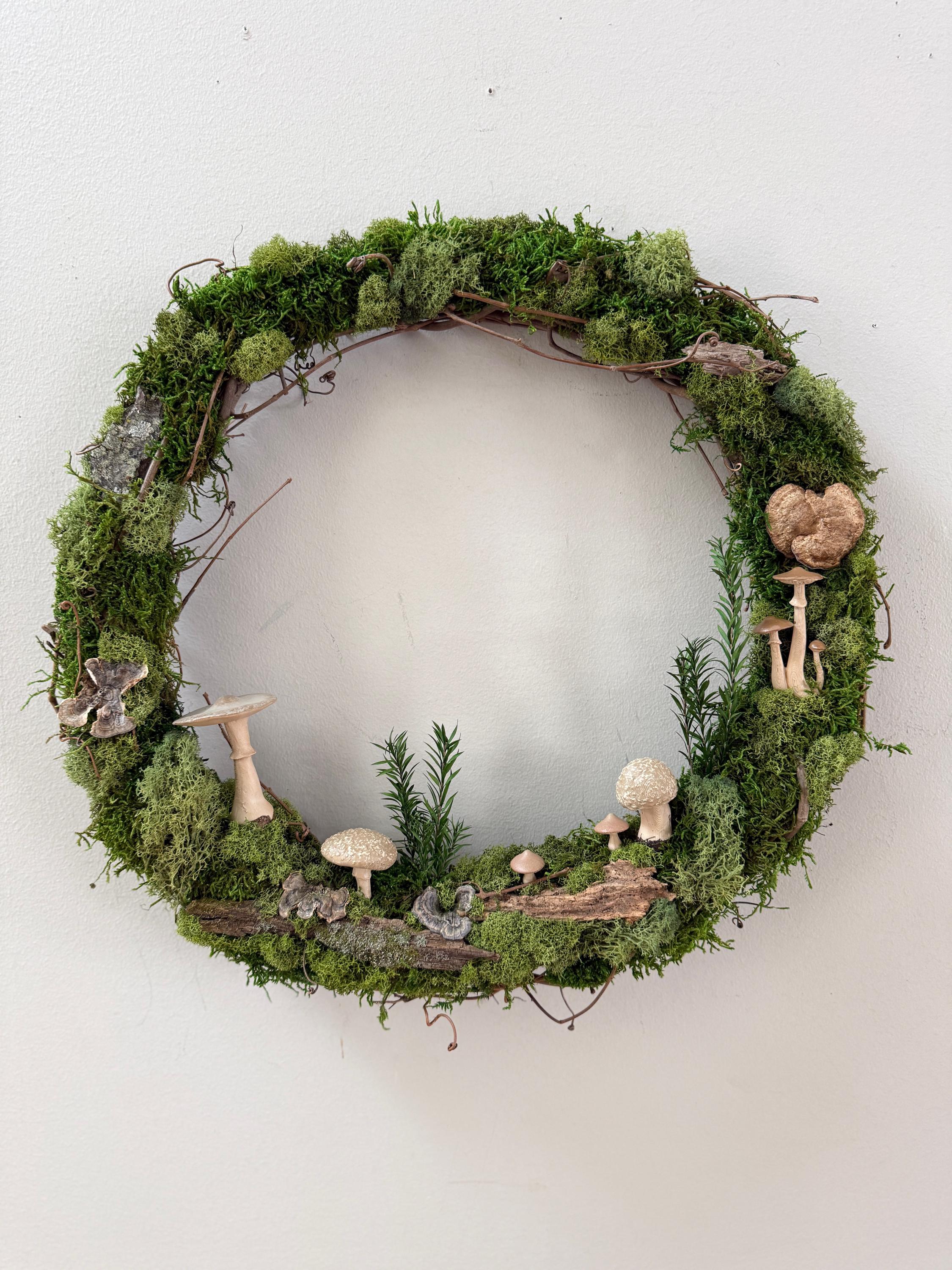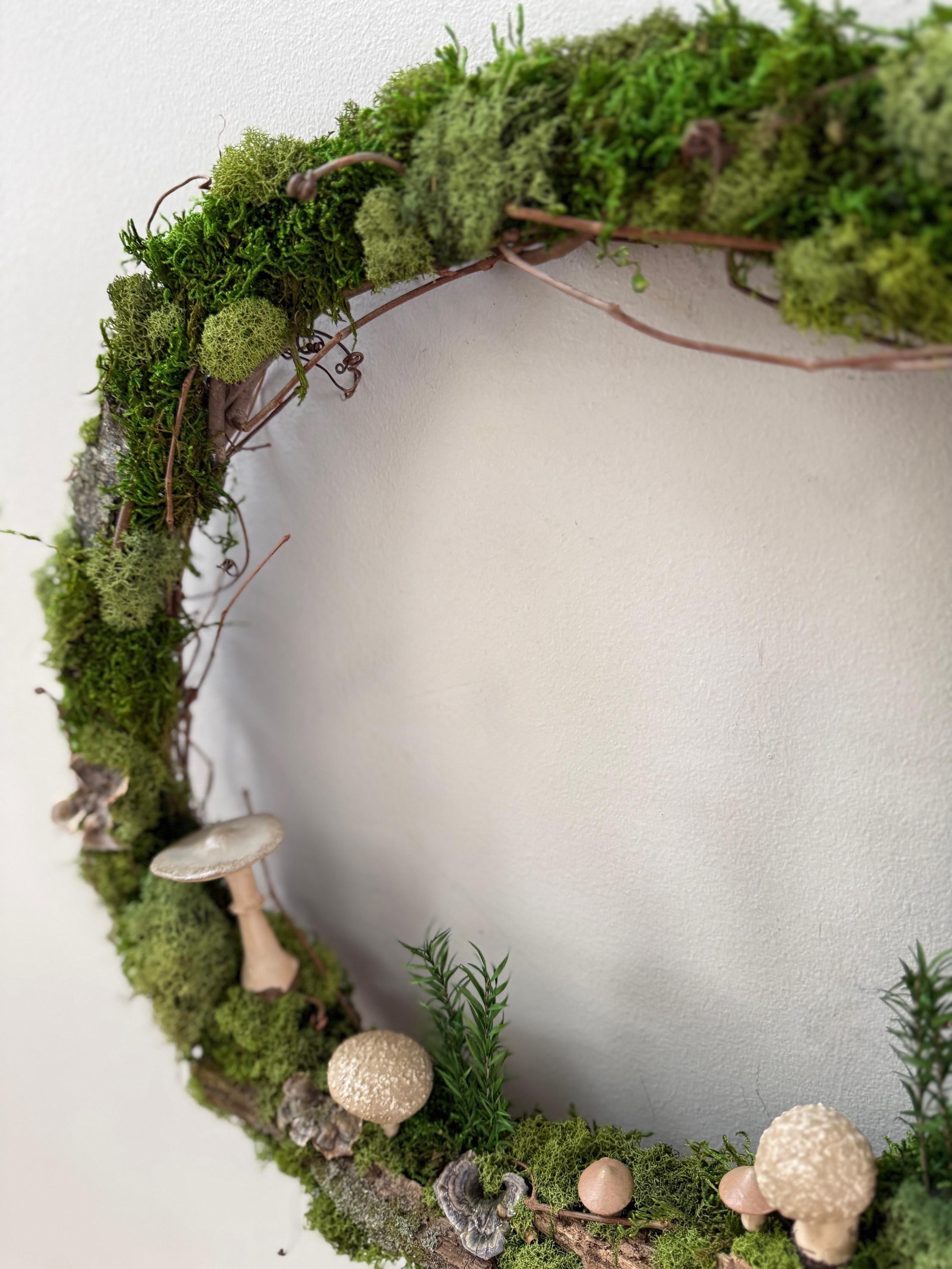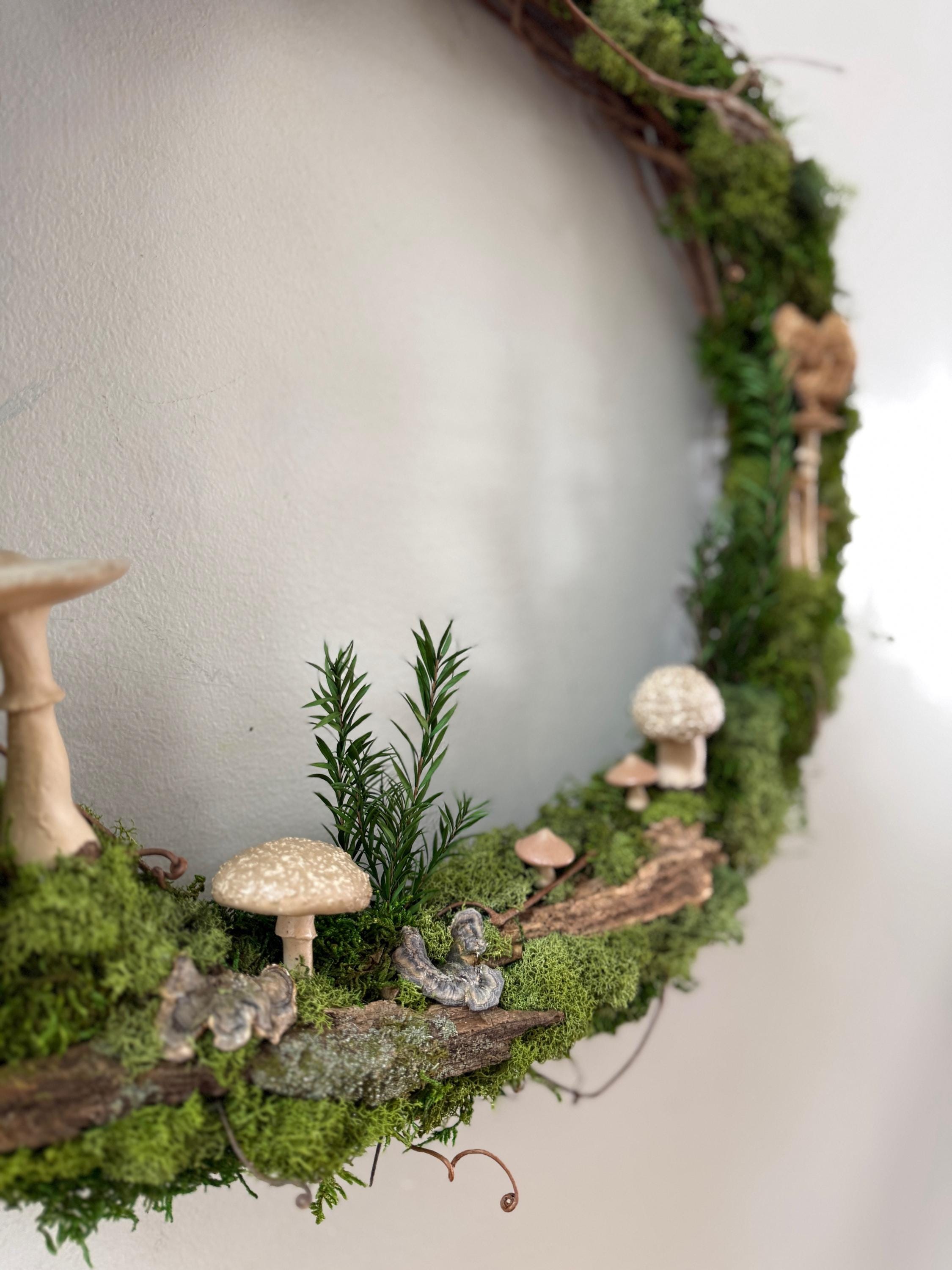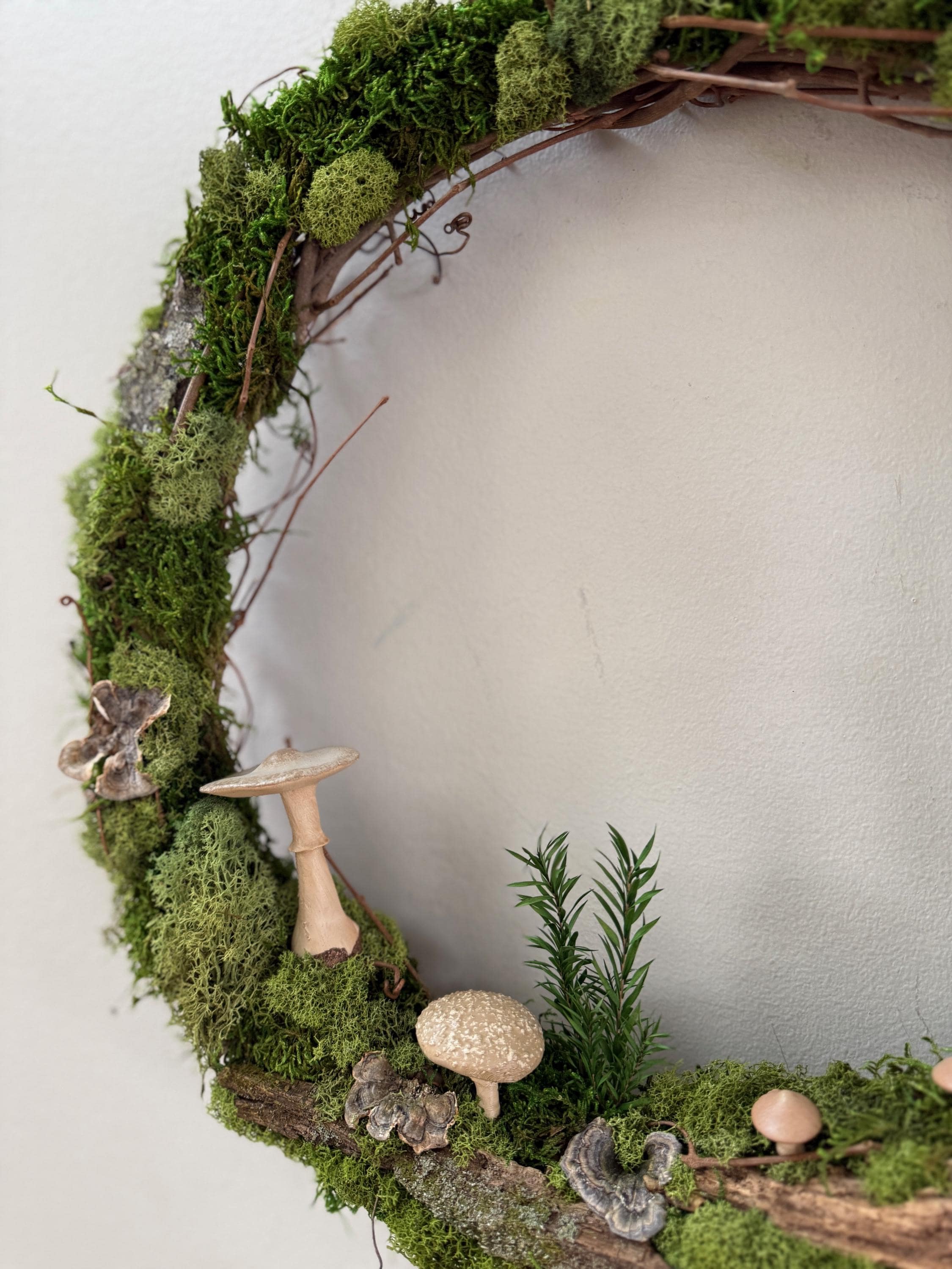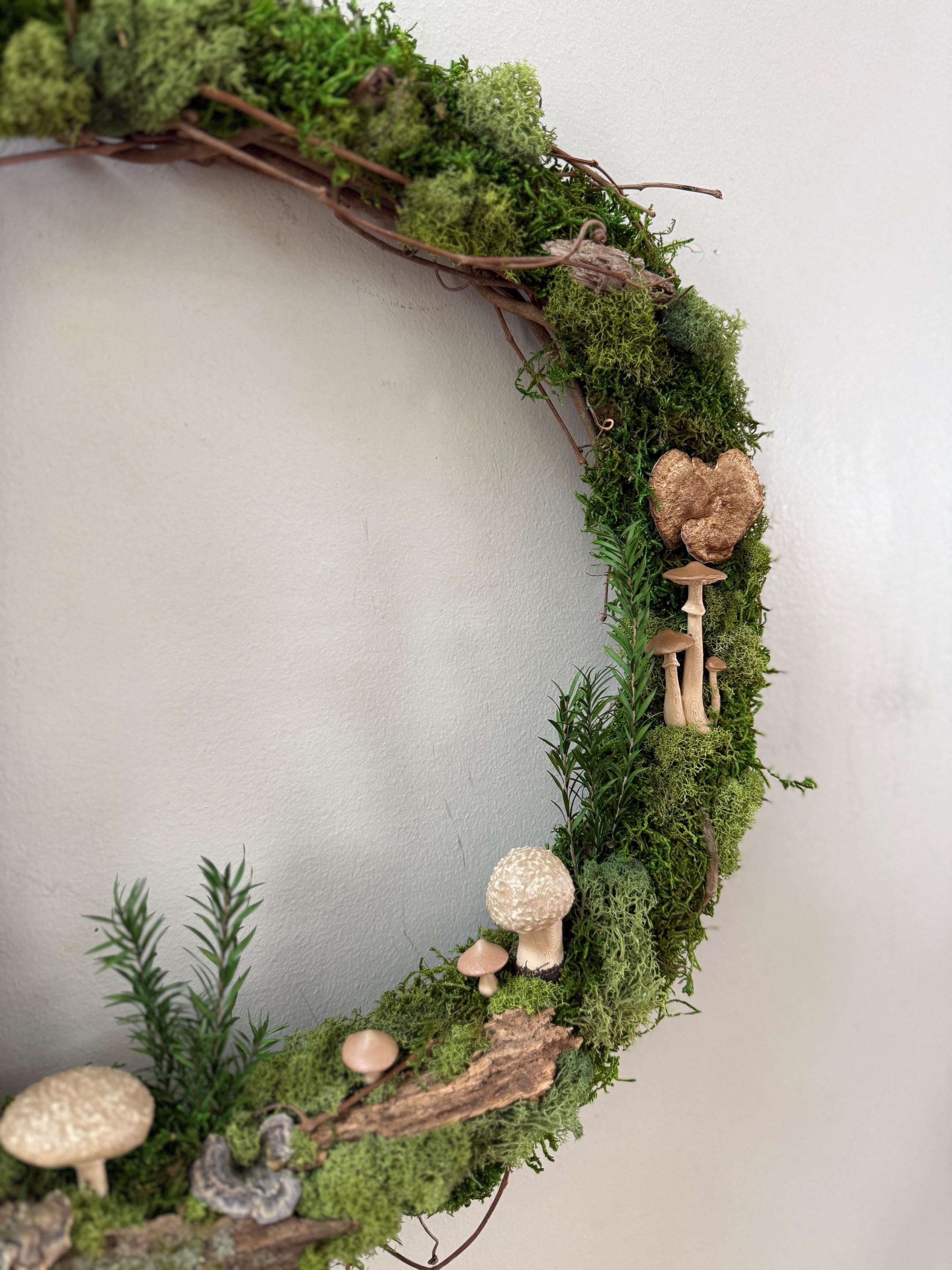 Woodland wreath made with preserved mosses, dried turkey tail mushrooms, pine cones, mossy bark, and handpainted mushrooms.