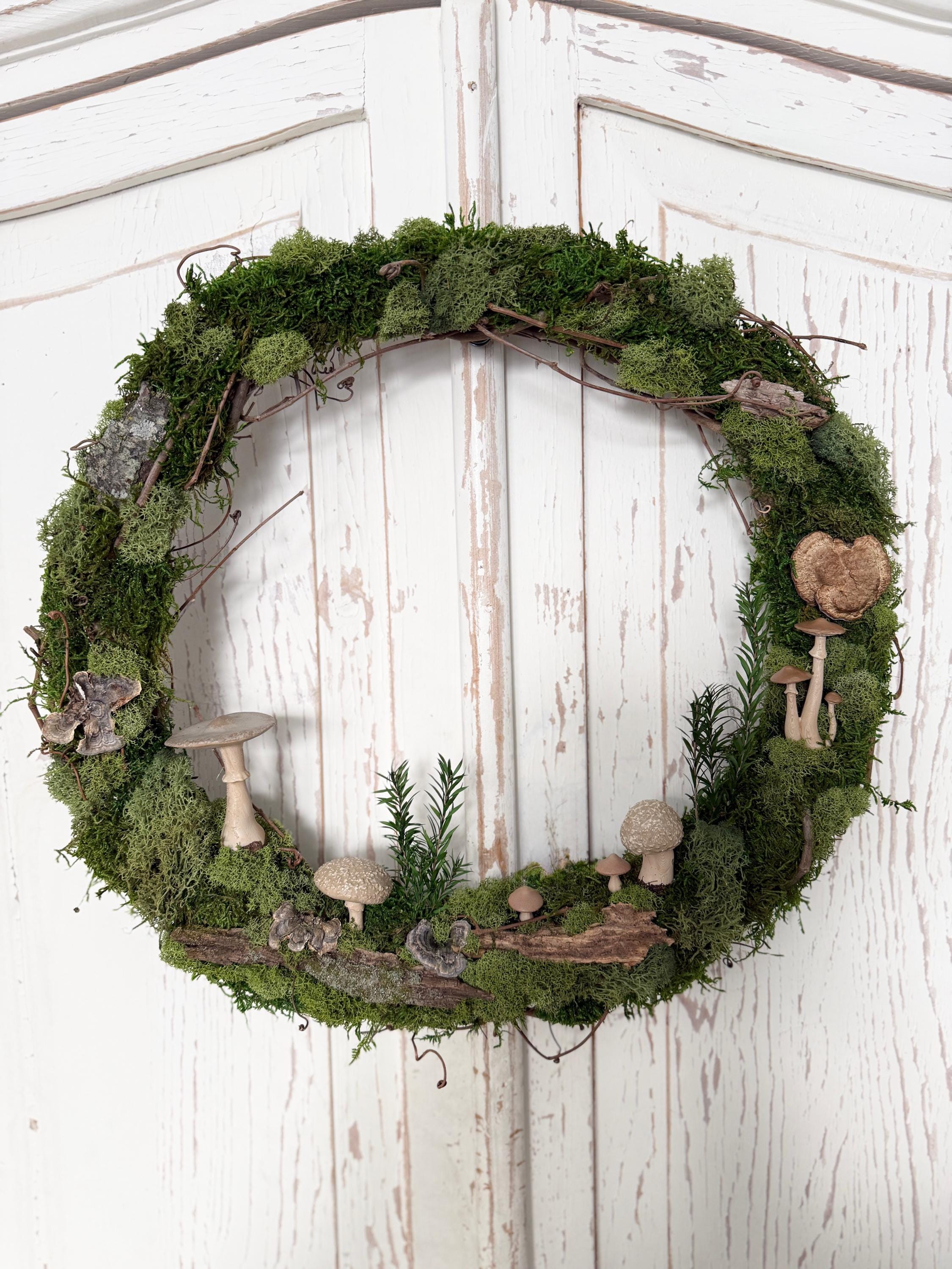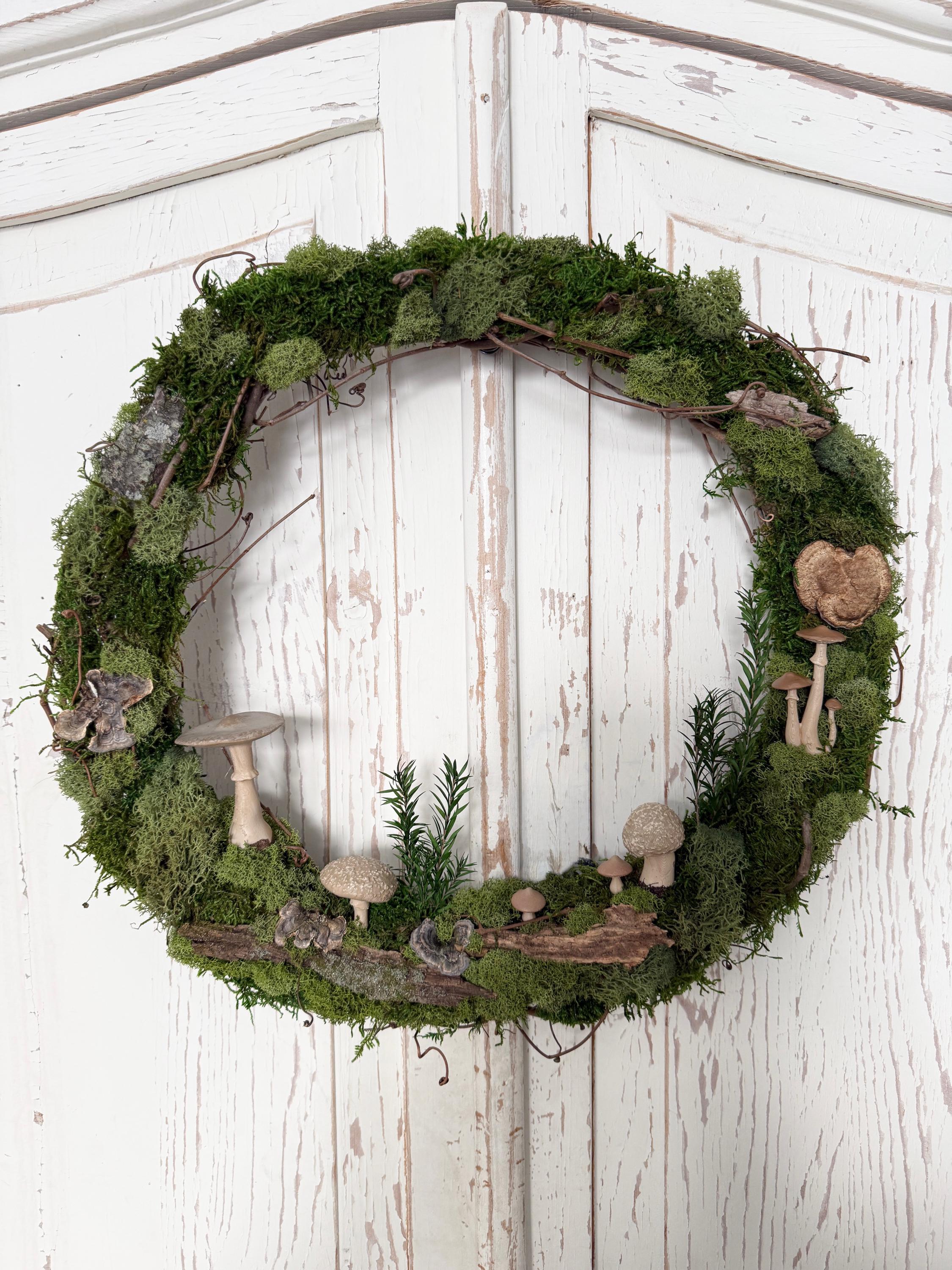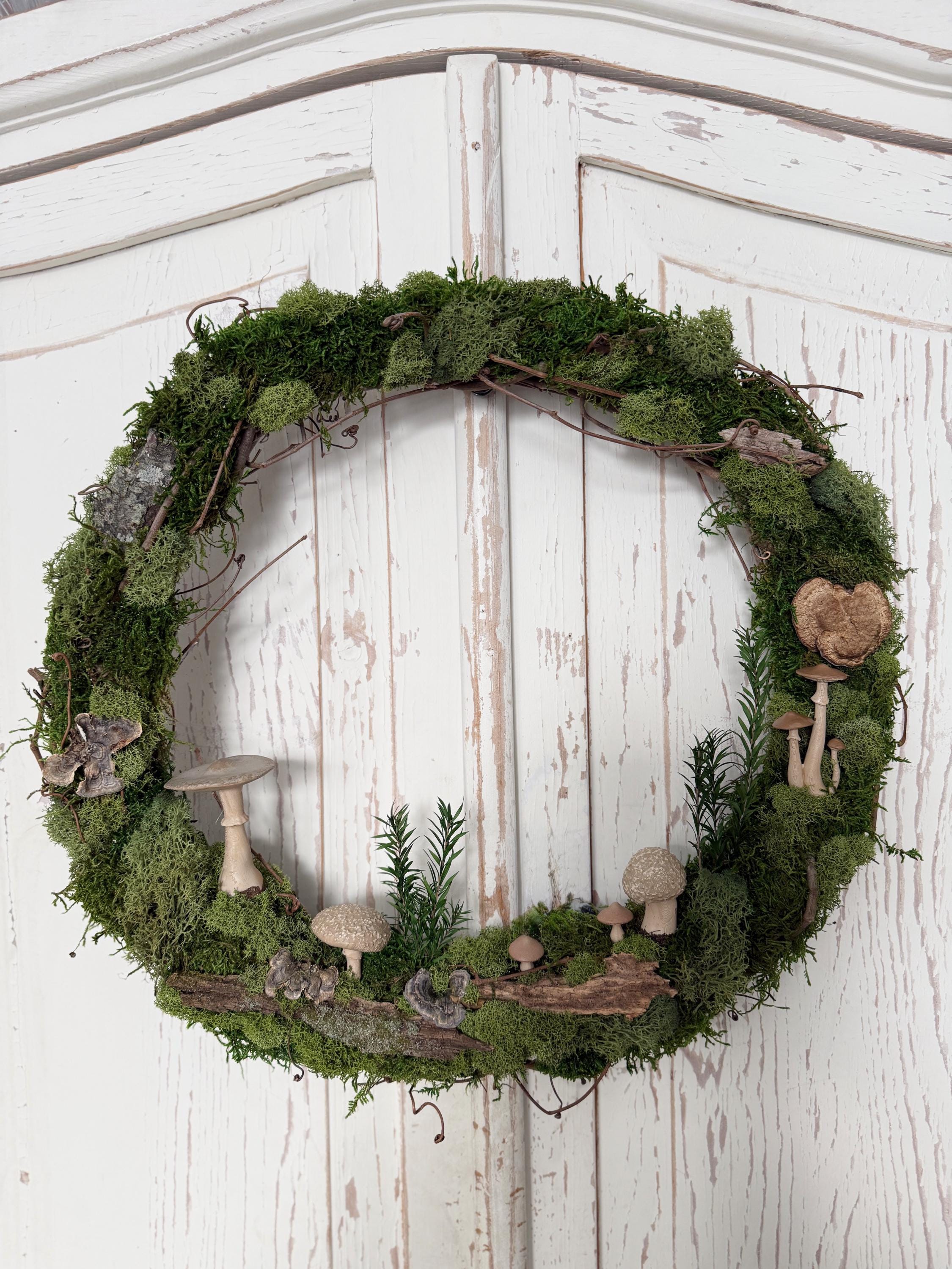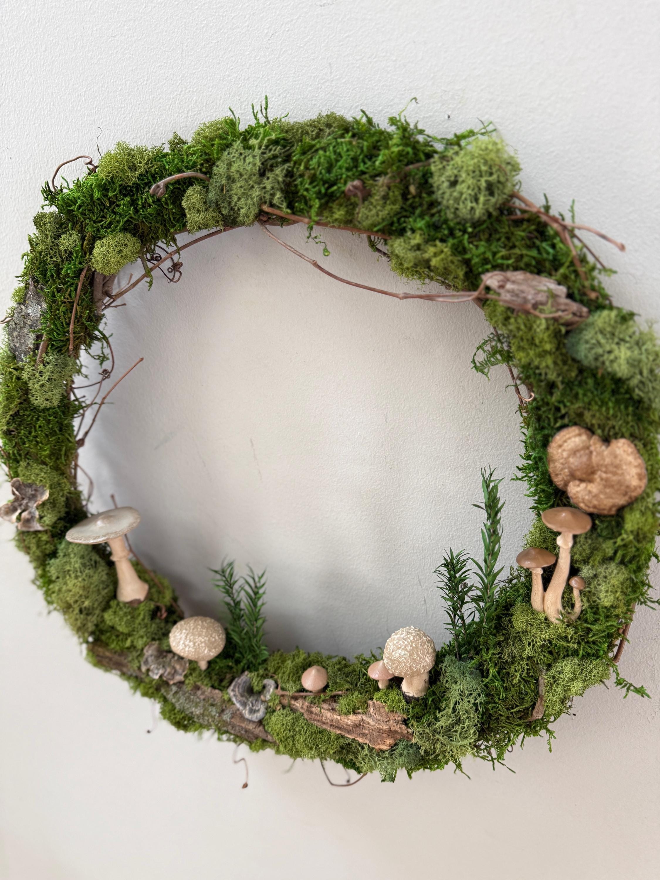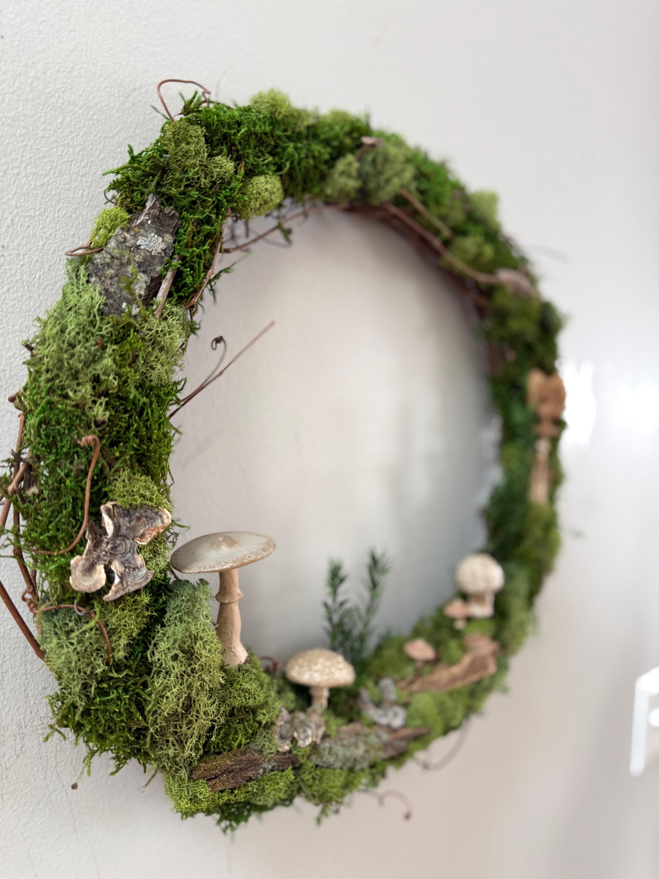 Woodland wreath made with preserved mosses, dried turkey tail mushrooms, pine cones, mossy bark, and handpainted mushrooms.