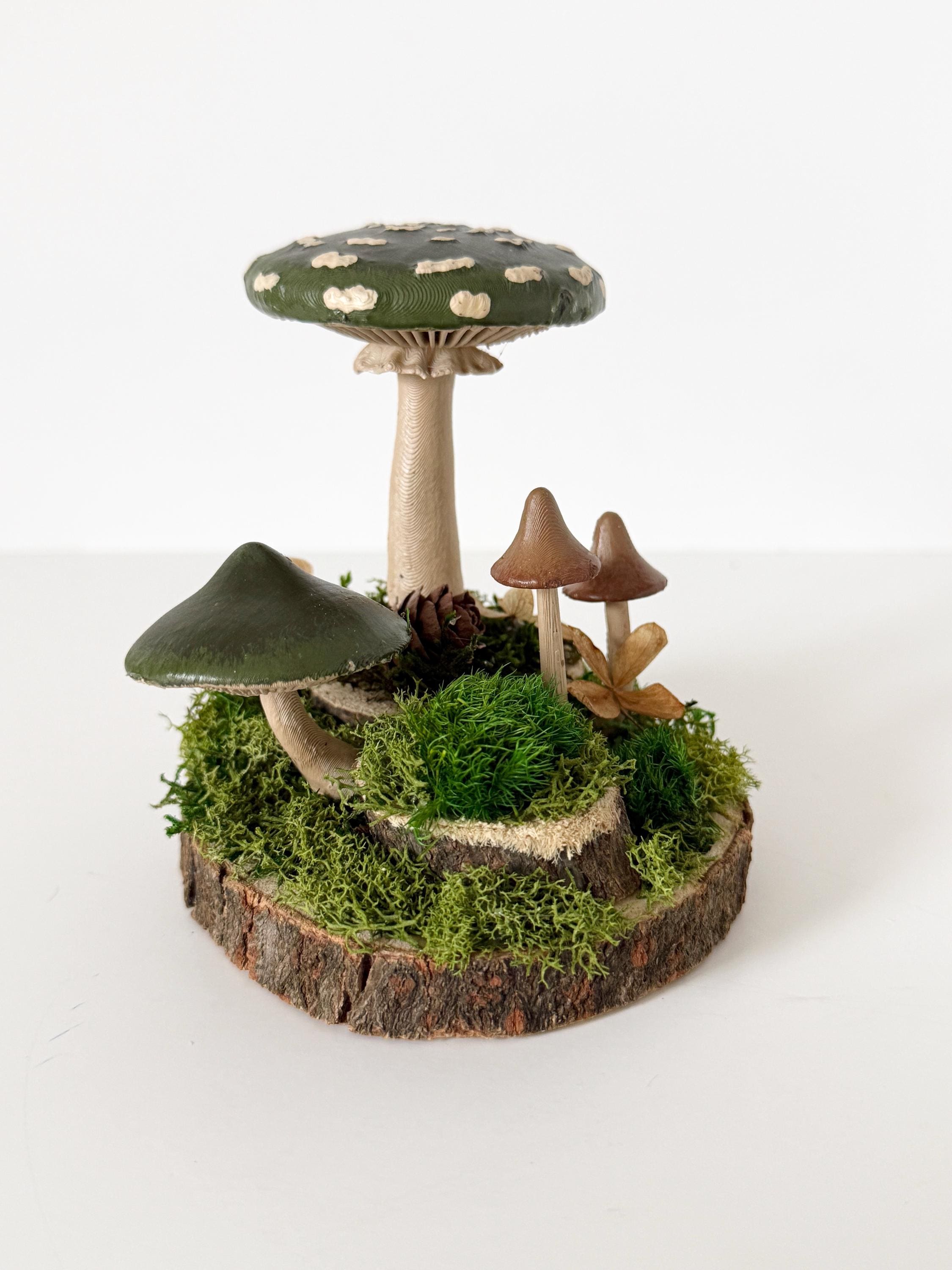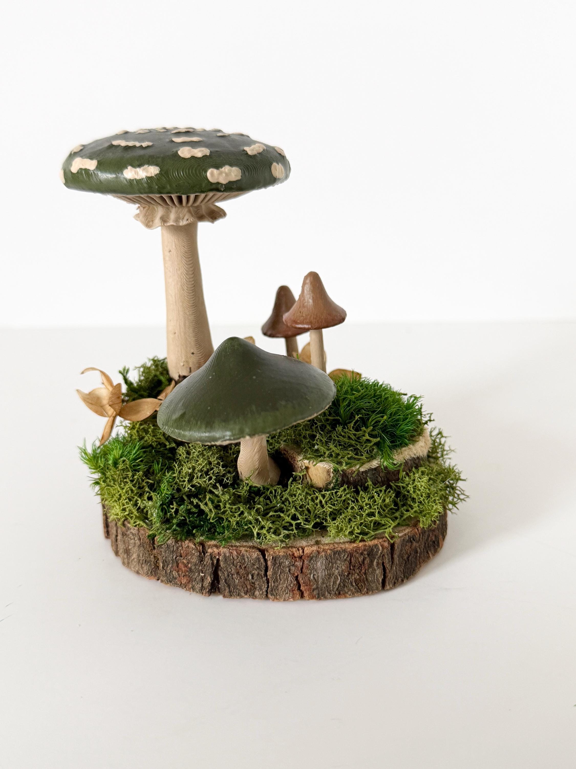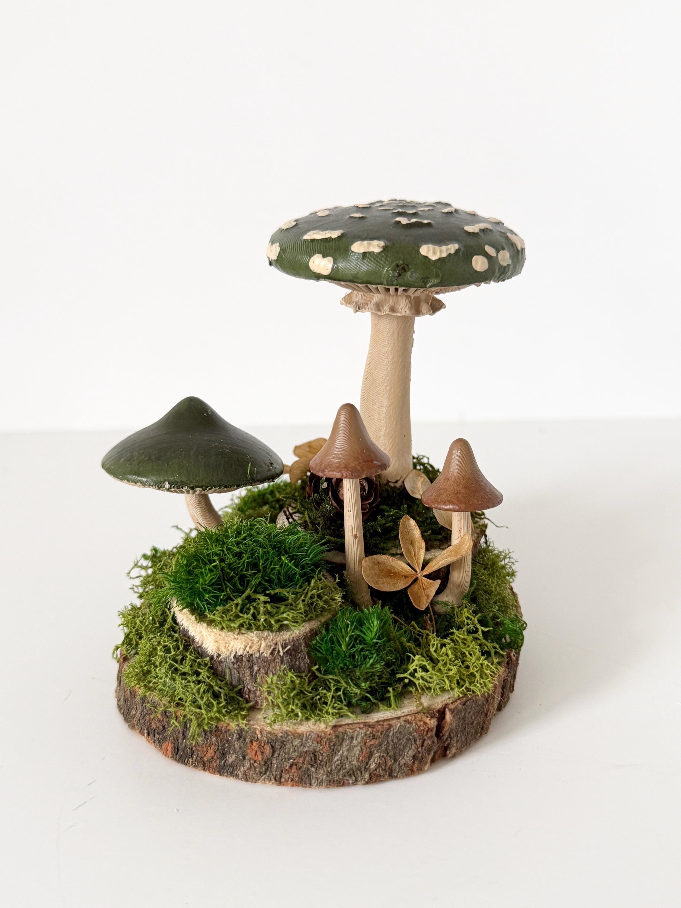 Realistic hand-painted mushrooms in a cute little nature scene. Real preserved moss and bark require no maintenance but bring the same natural element to your home and office as houseplants. Mushrooms are printed with eco-friendly, compostable PLA and hand painted. Base is a real slice of hardwood with bark edges.