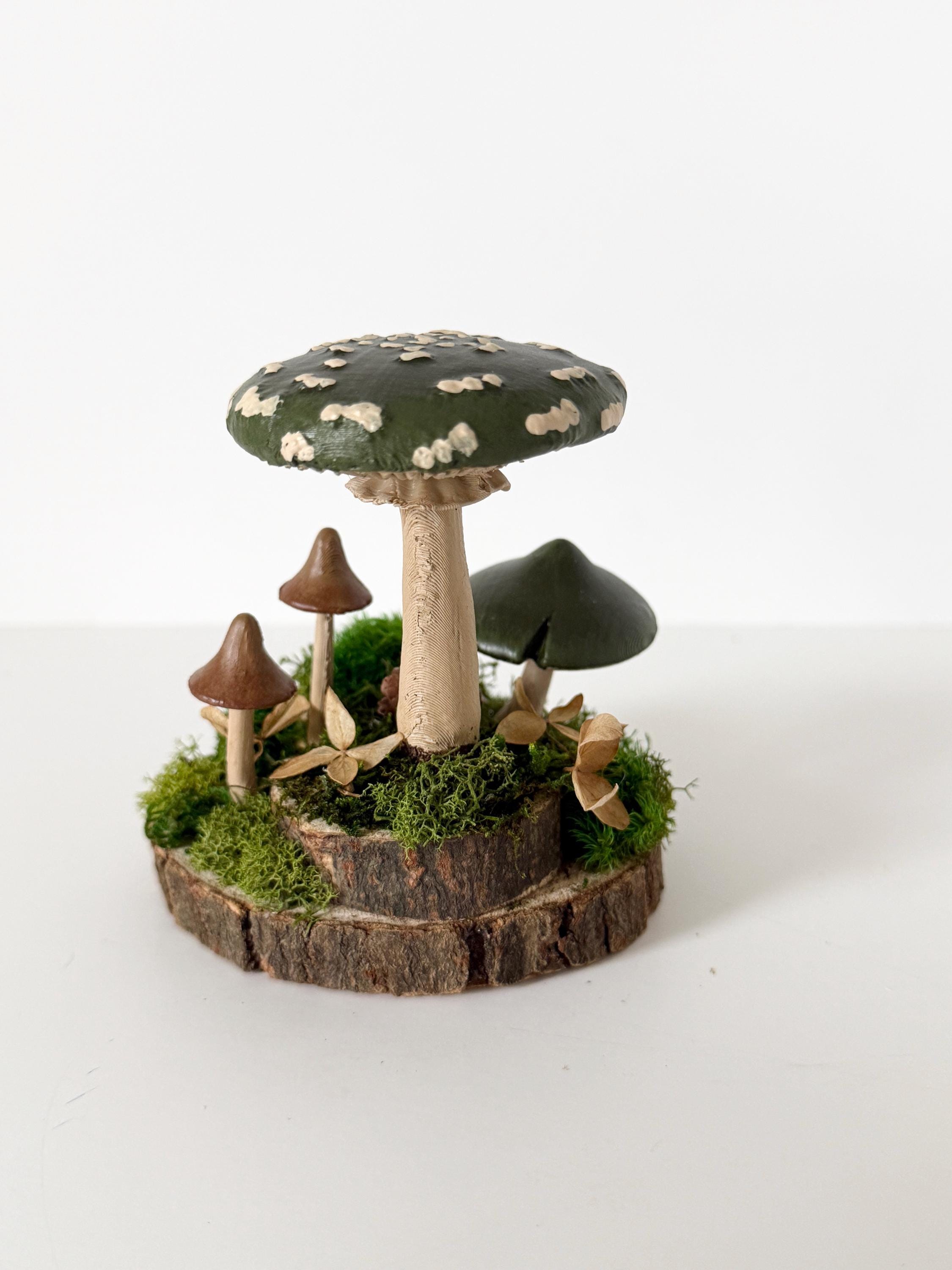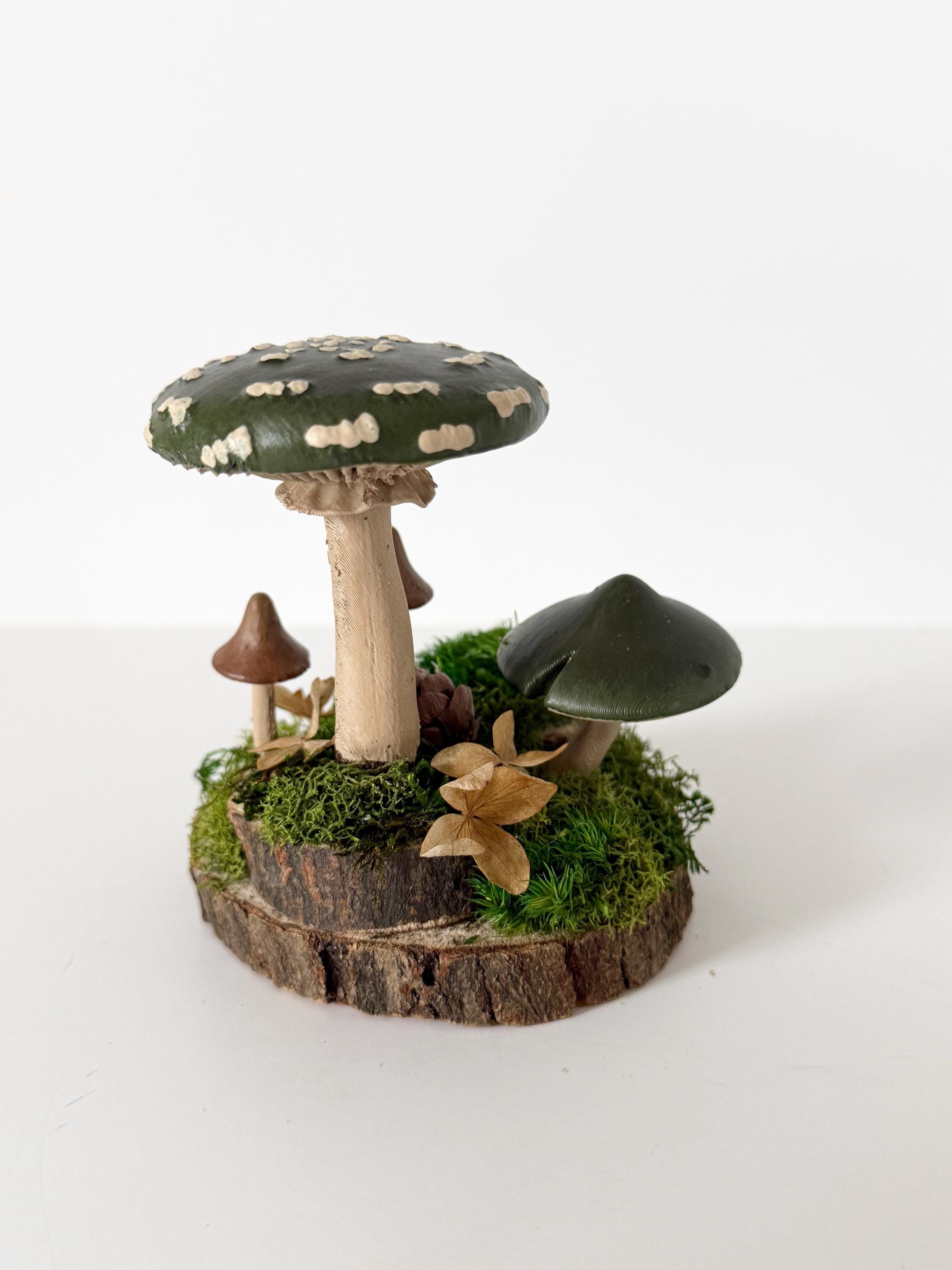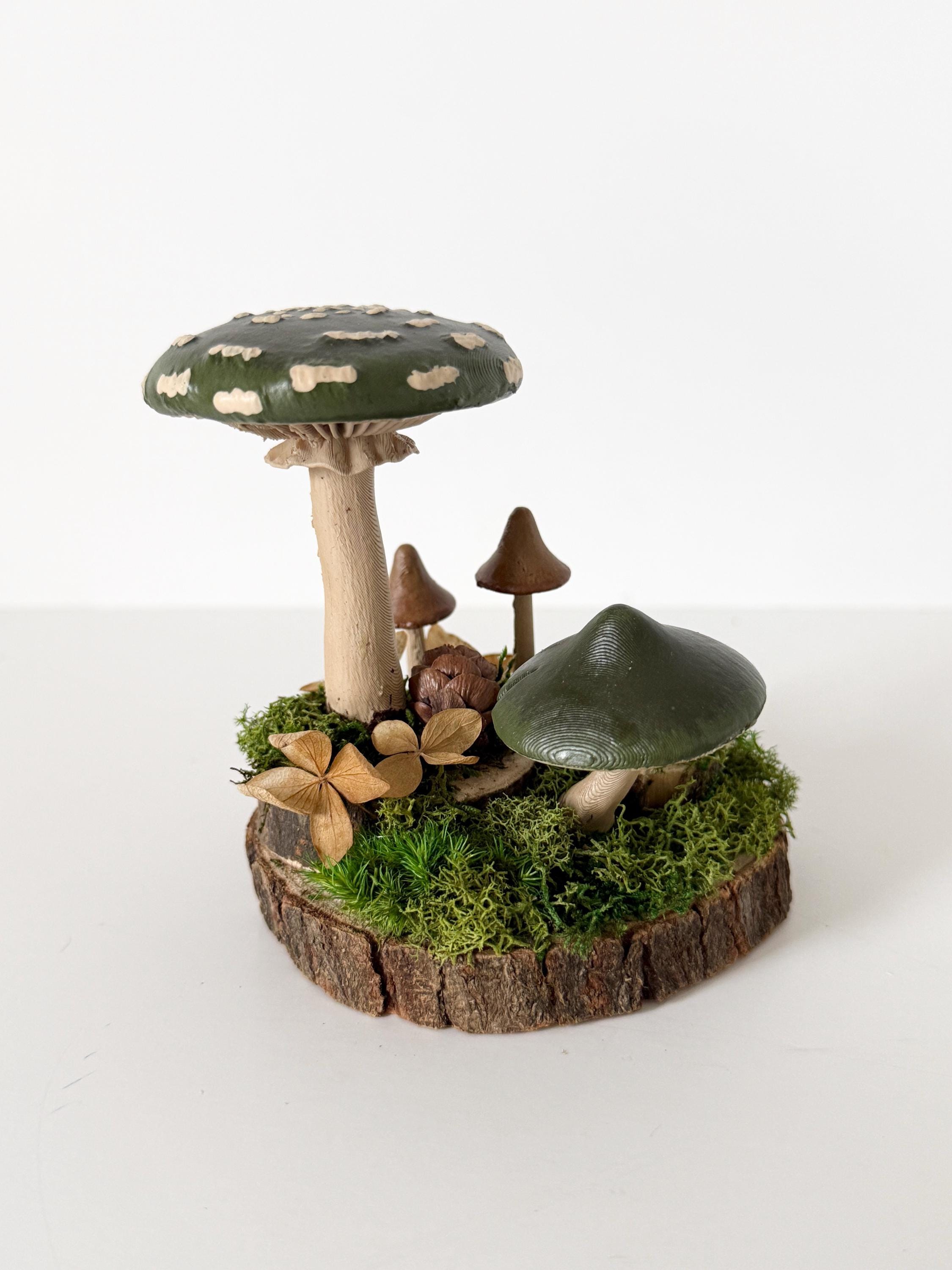 Realistic hand-painted mushrooms in a cute little nature scene. Real preserved moss and bark require no maintenance but bring the same natural element to your home and office as houseplants. Mushrooms are printed with eco-friendly, compostable PLA and hand painted. Base is a real slice of hardwood with bark edges.