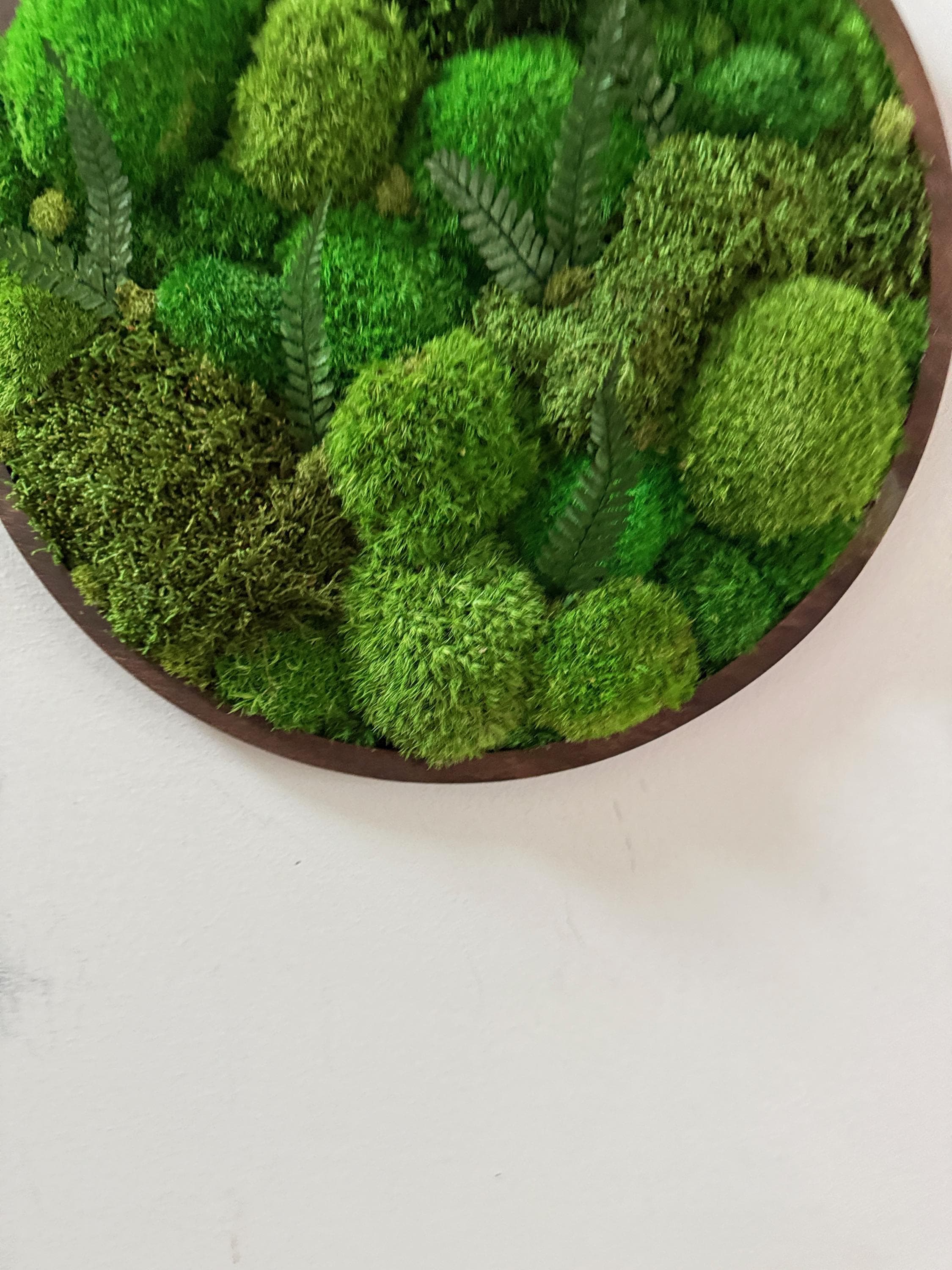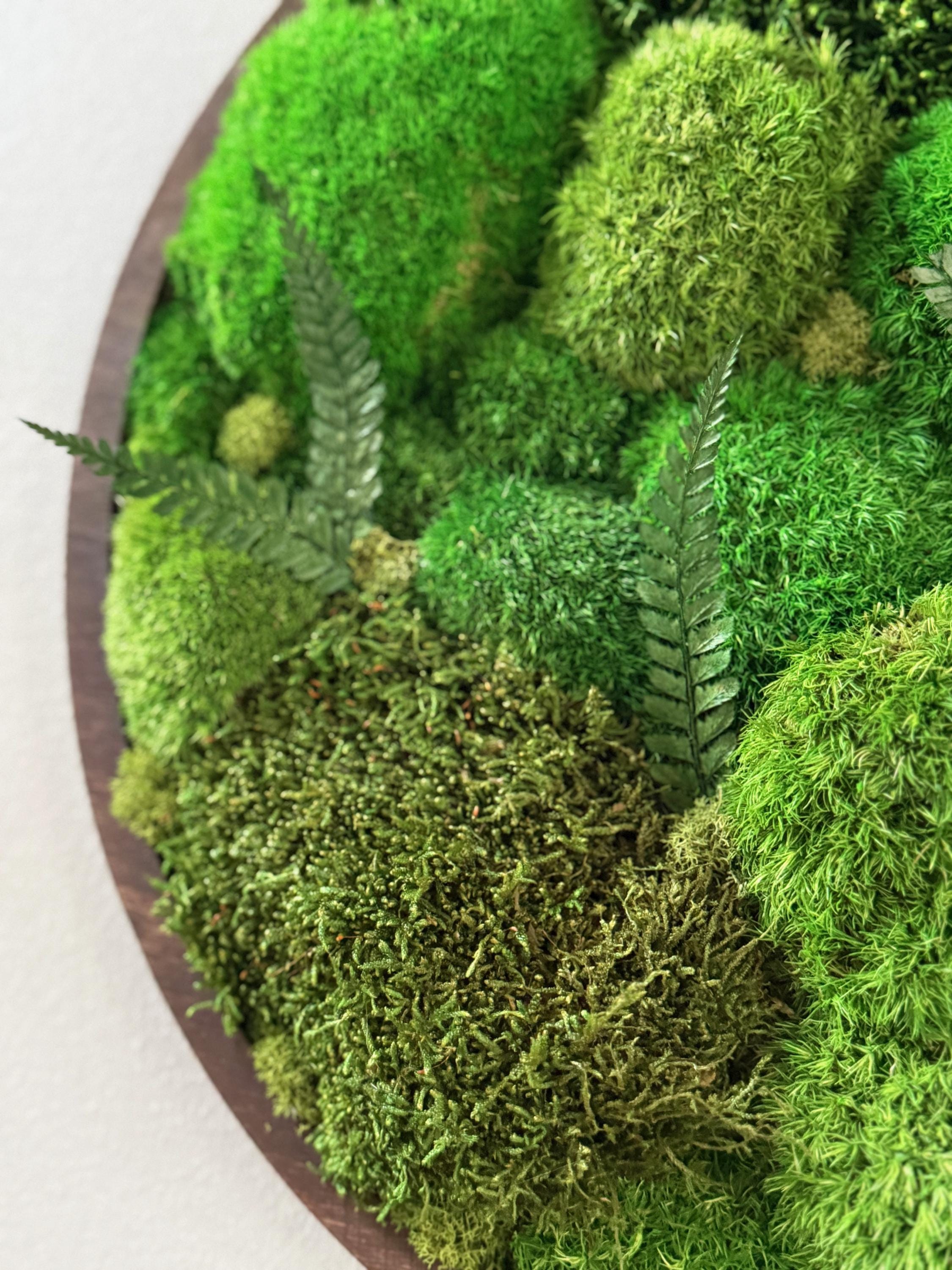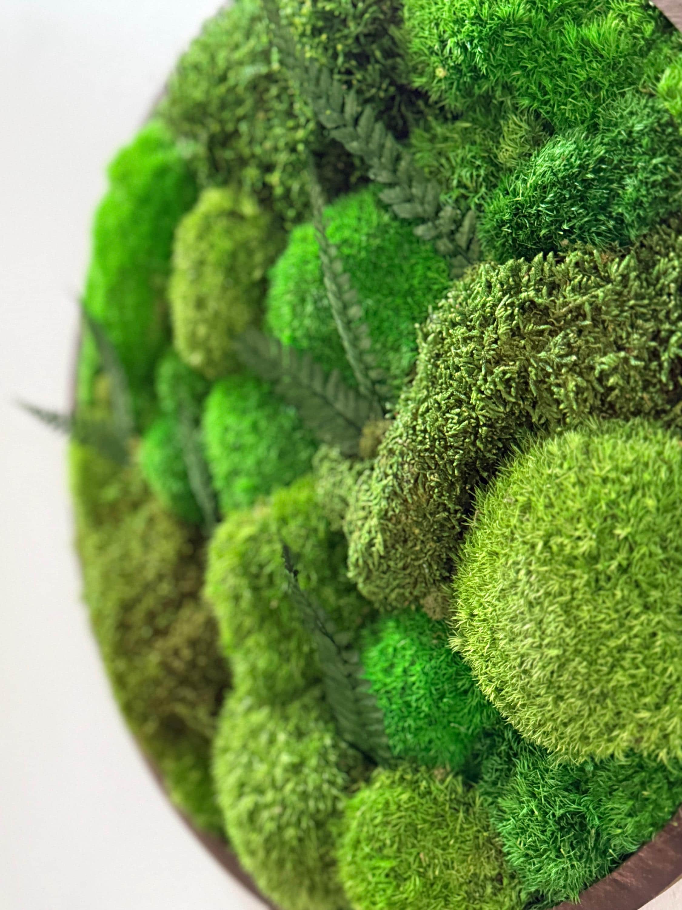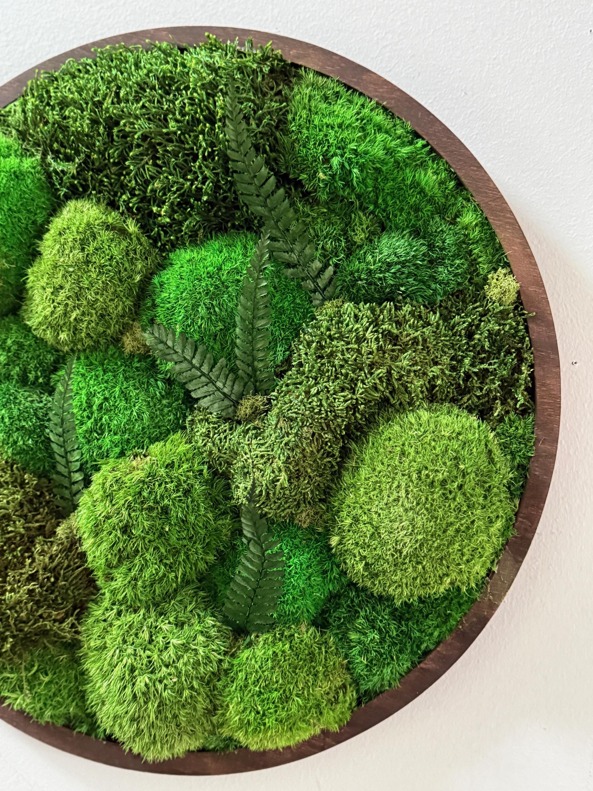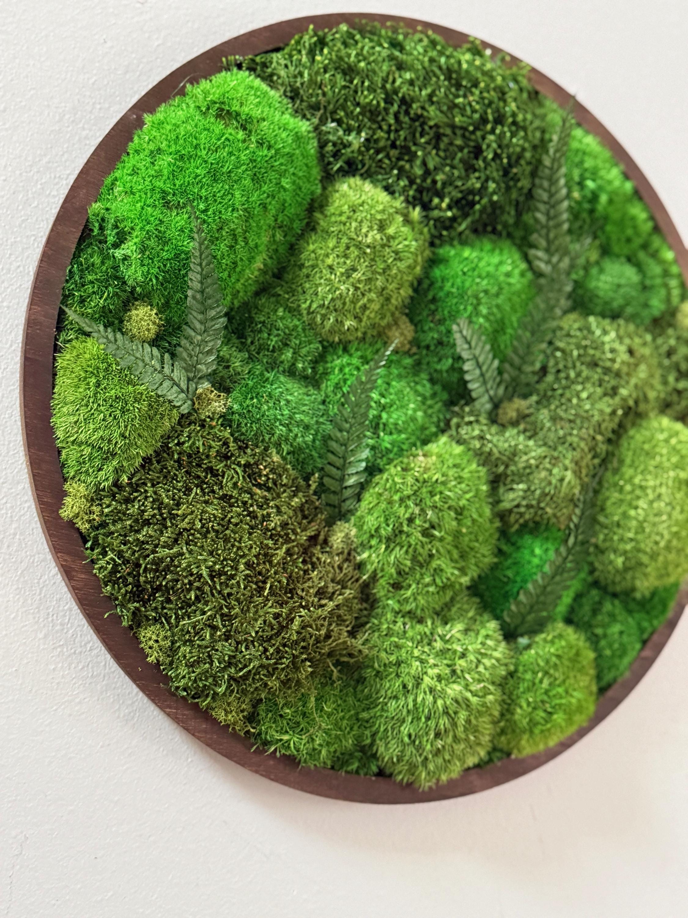 Real preserved mosses and ferns bring serenity to a space without any maintenance. All materials are preserved to stay looking beautiful forever. Set in a circular dark wood frame.