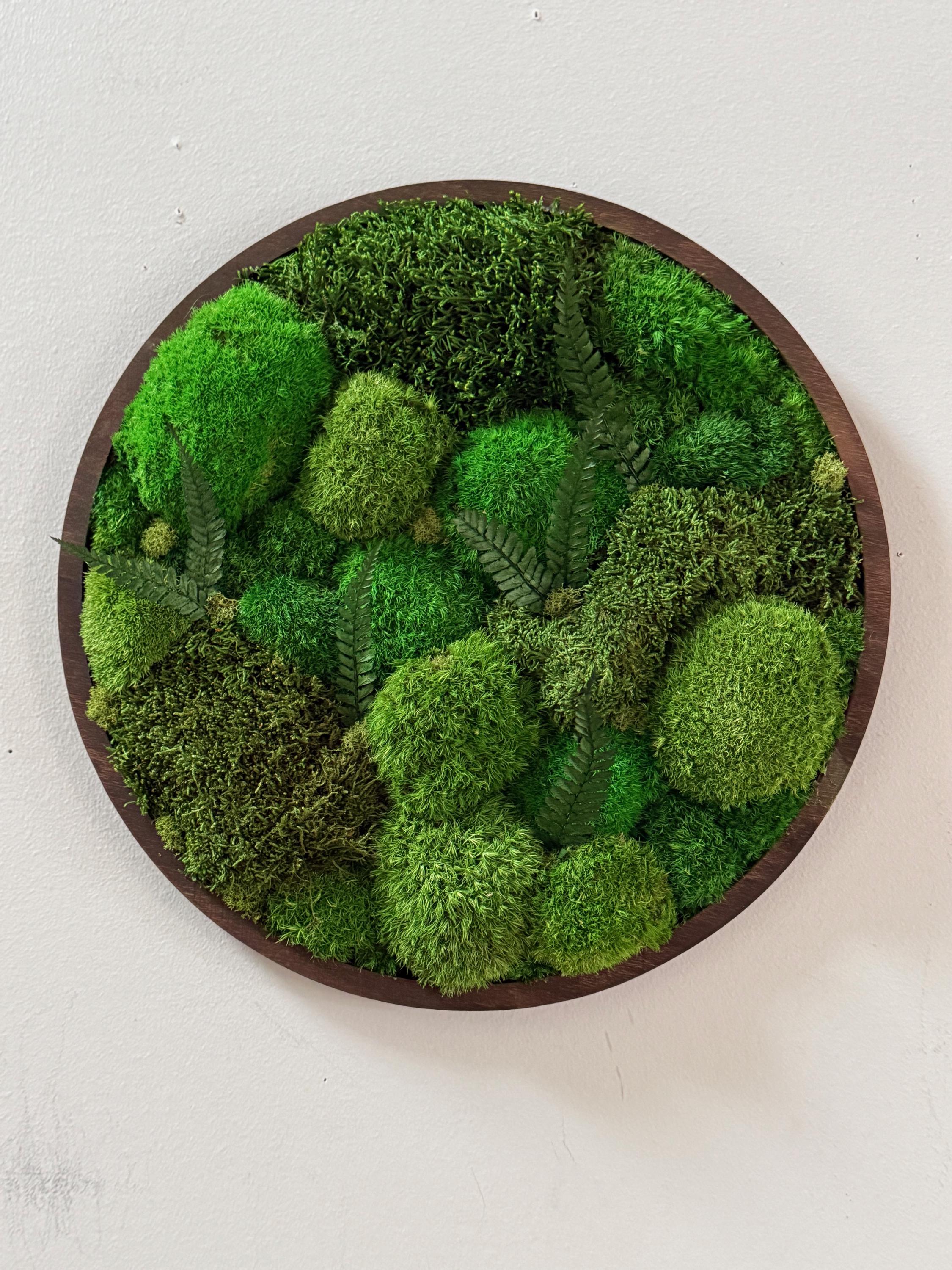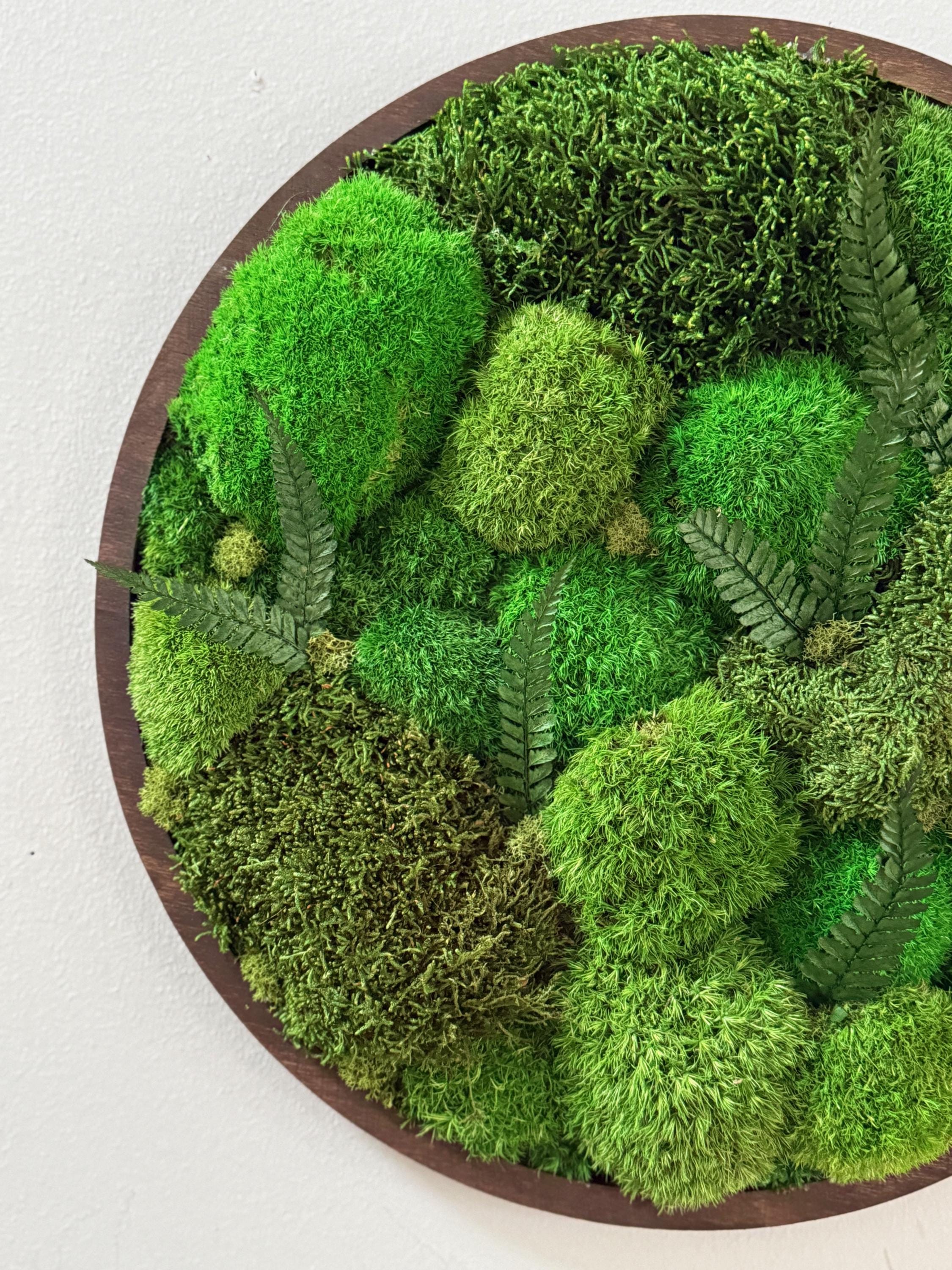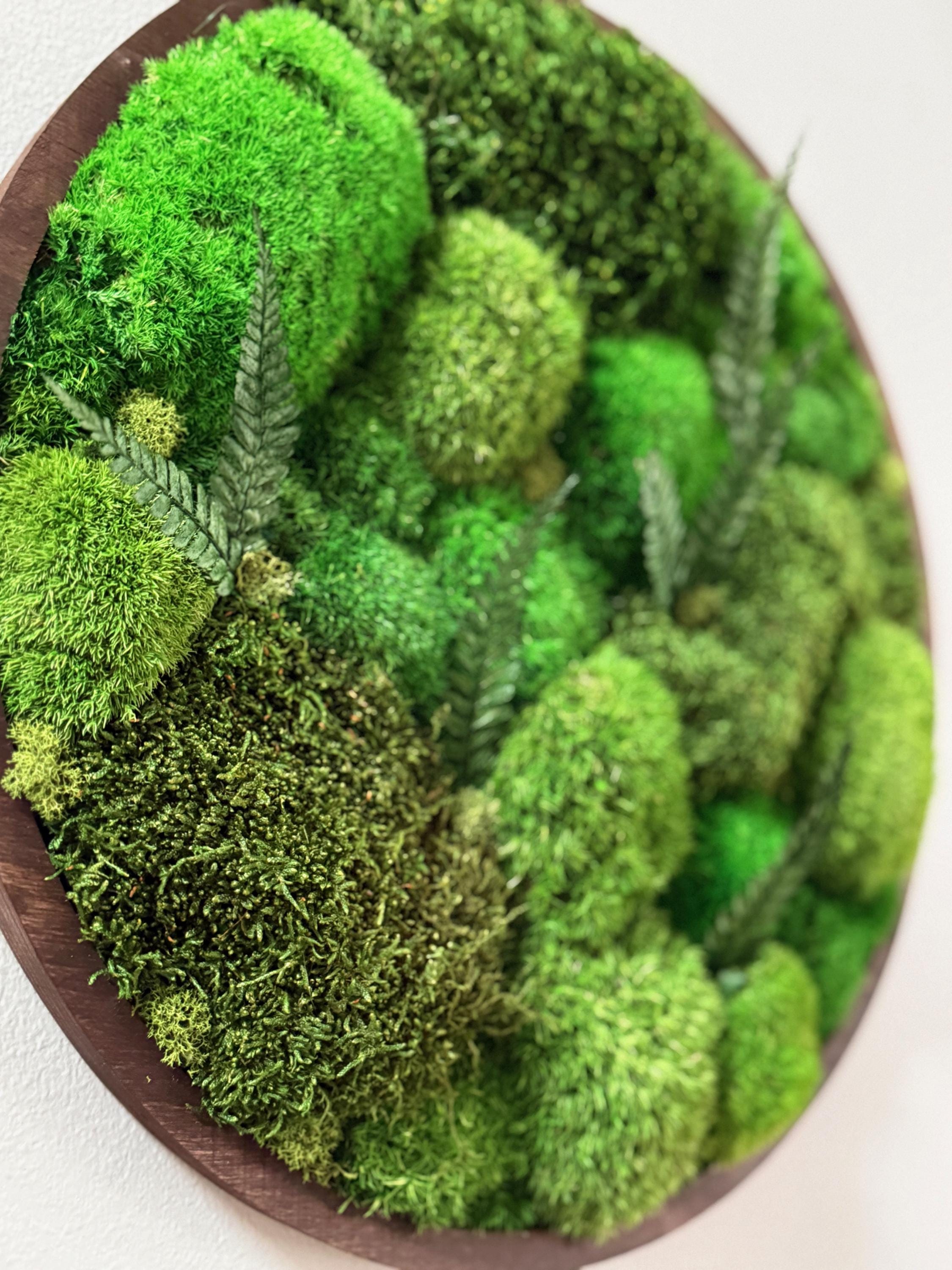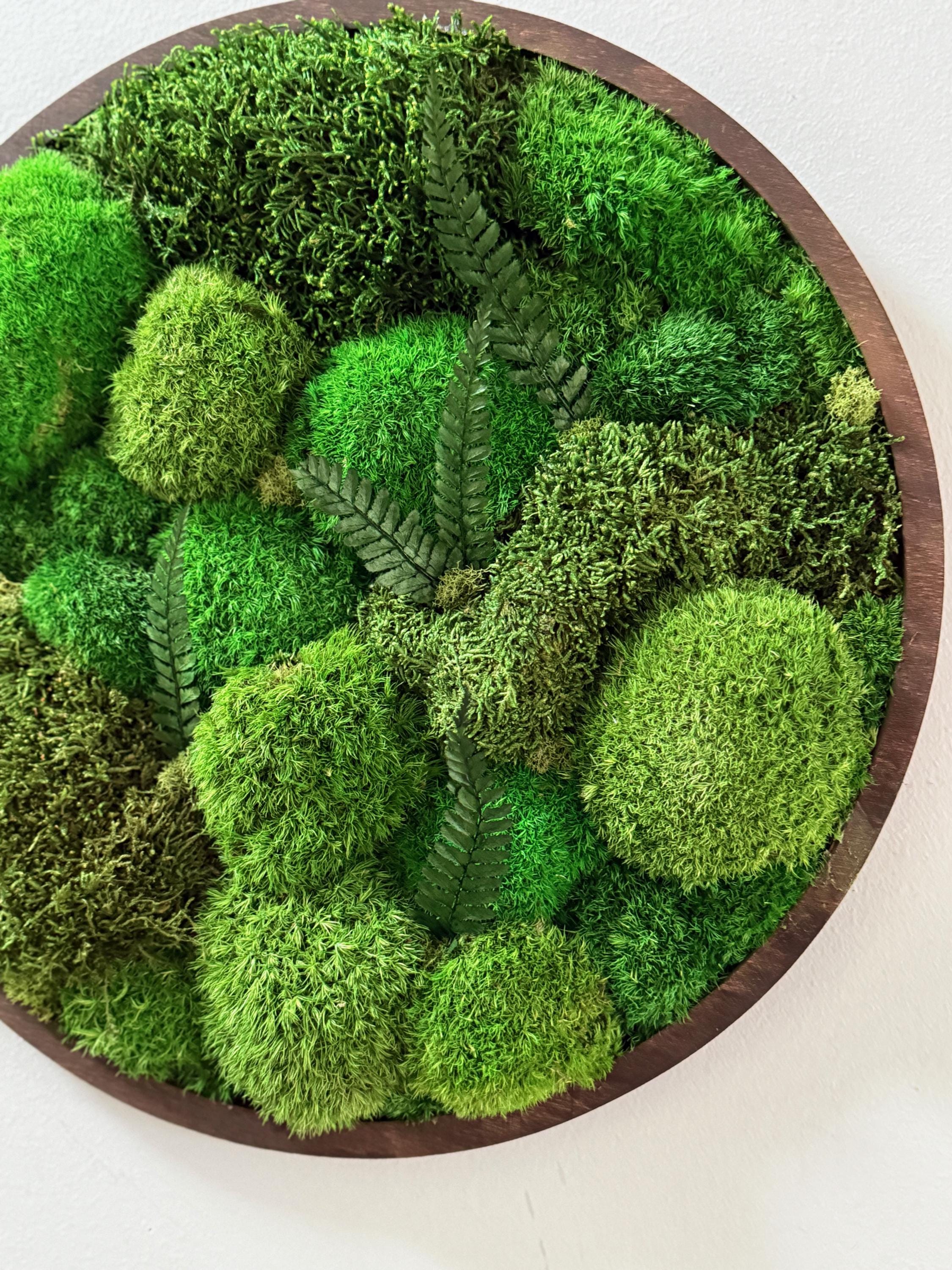 Real preserved mosses and ferns bring serenity to a space without any maintenance. All materials are preserved to stay looking beautiful forever. Set in a circular dark wood frame.