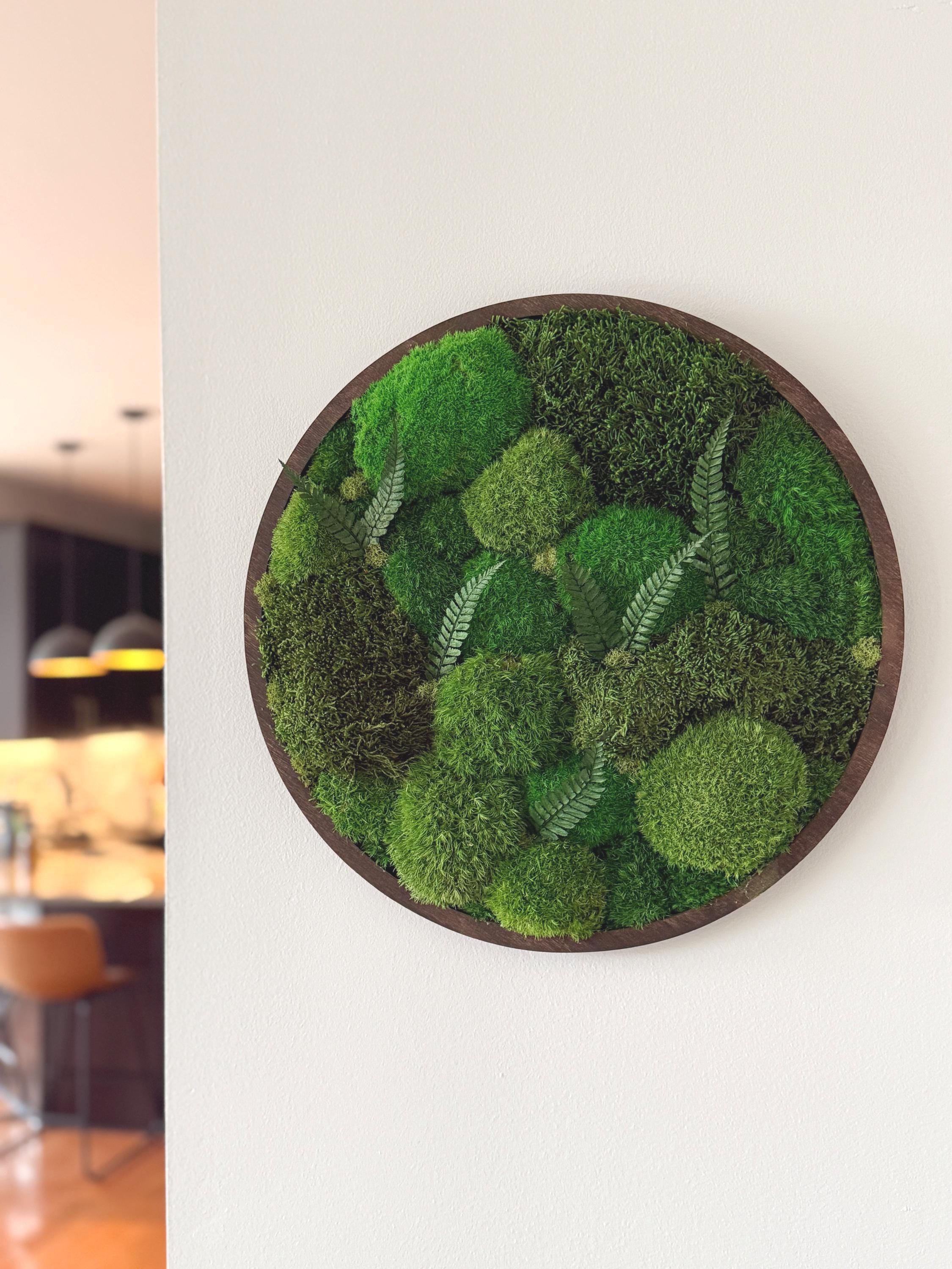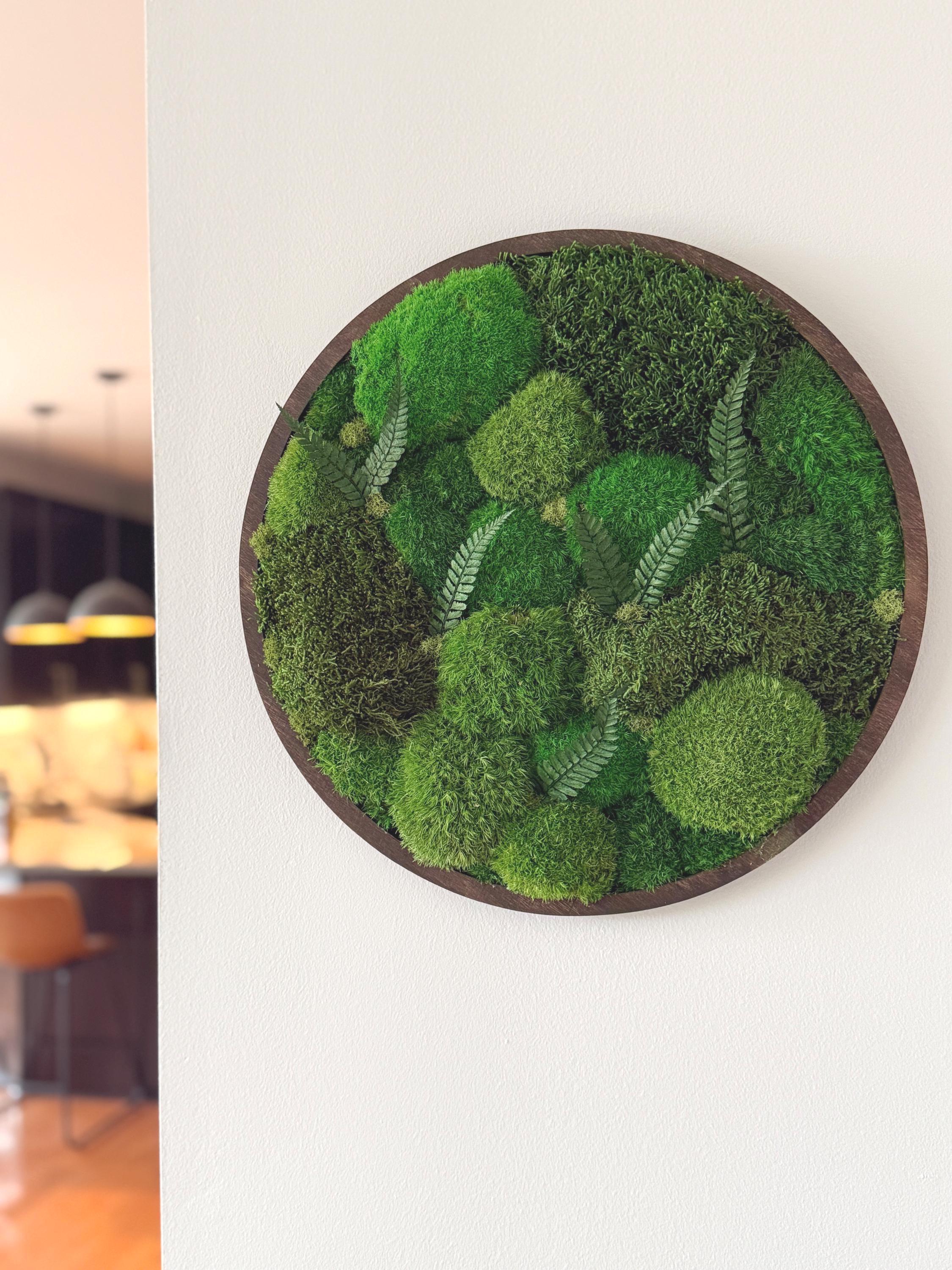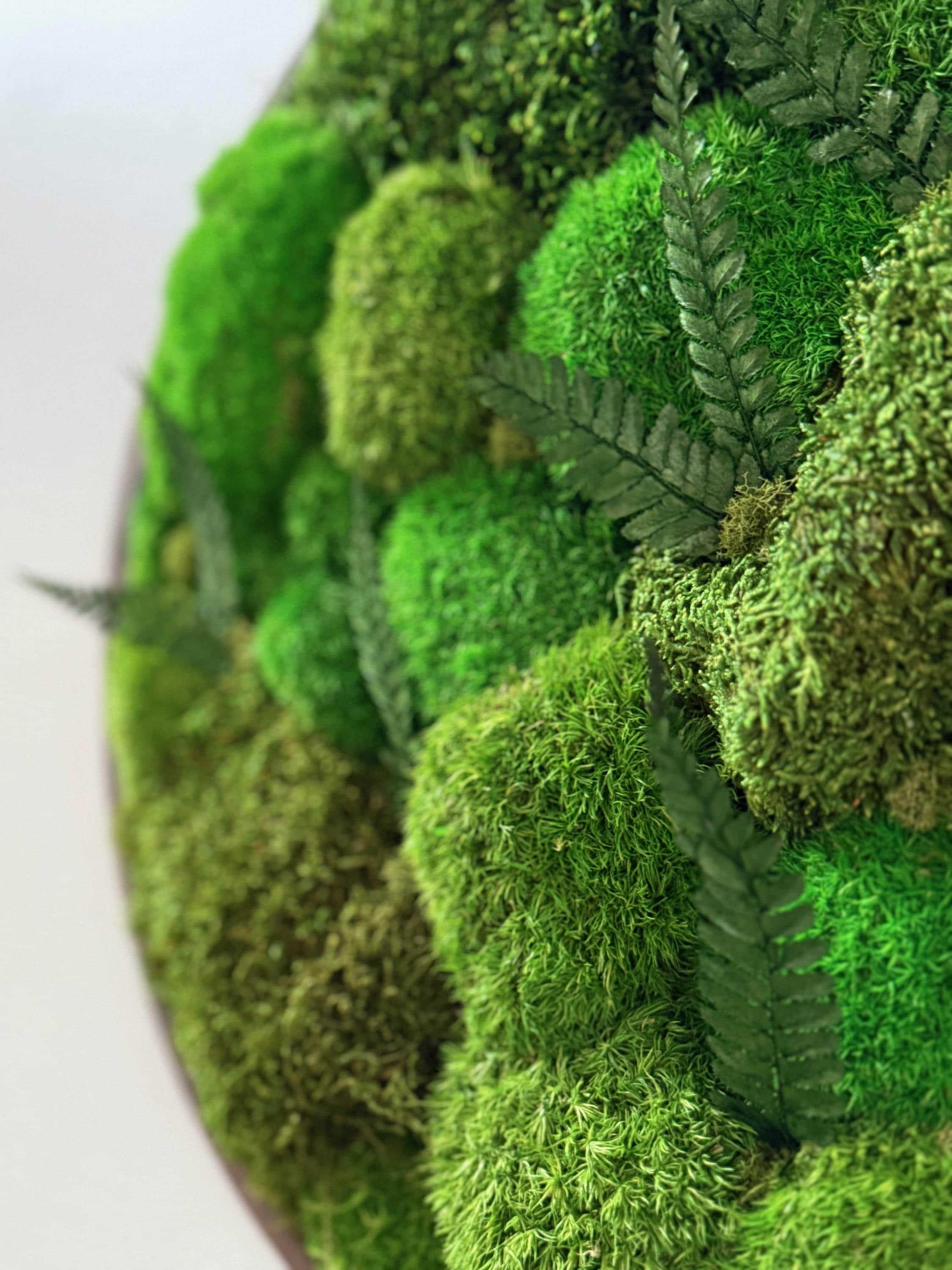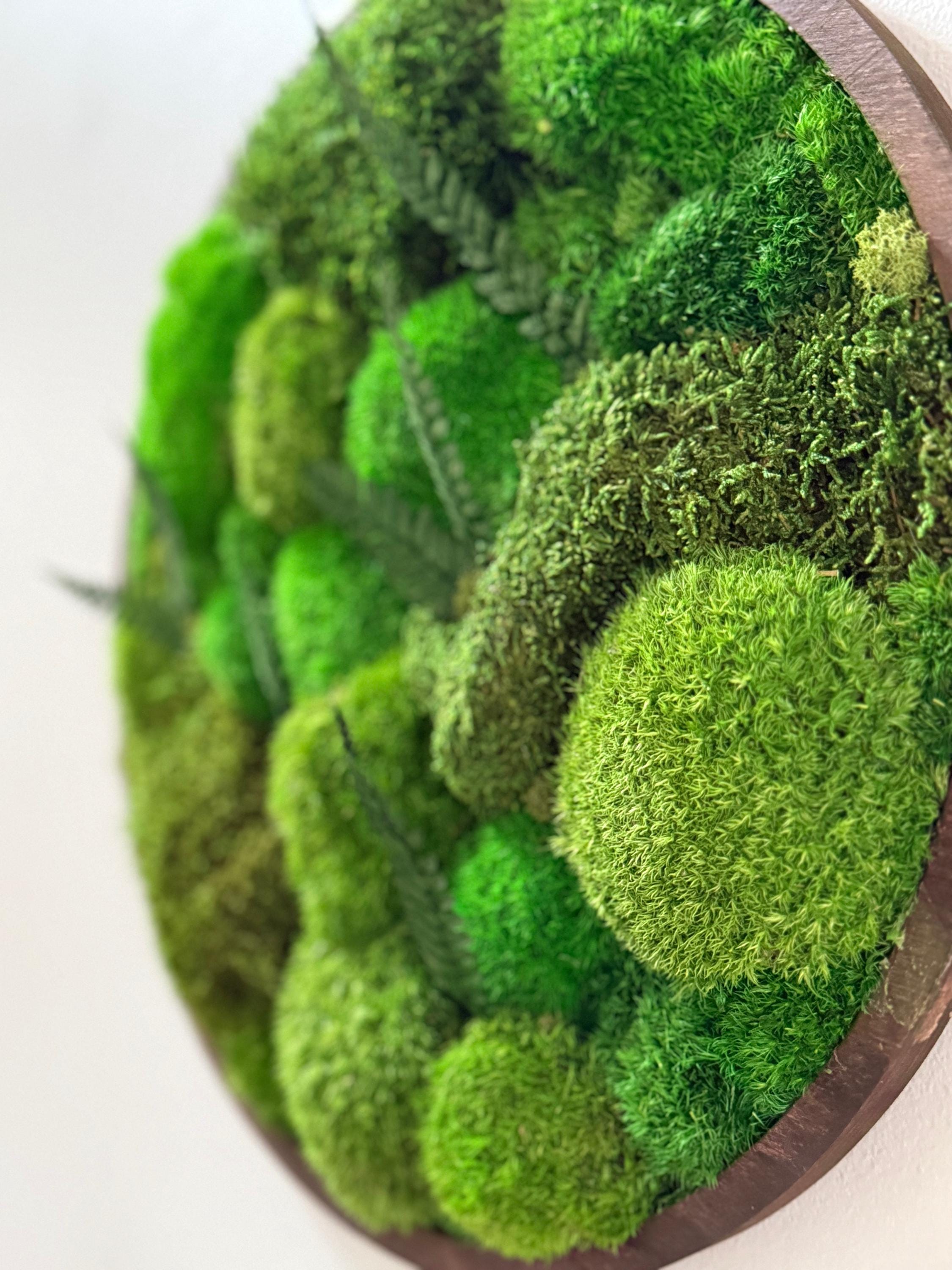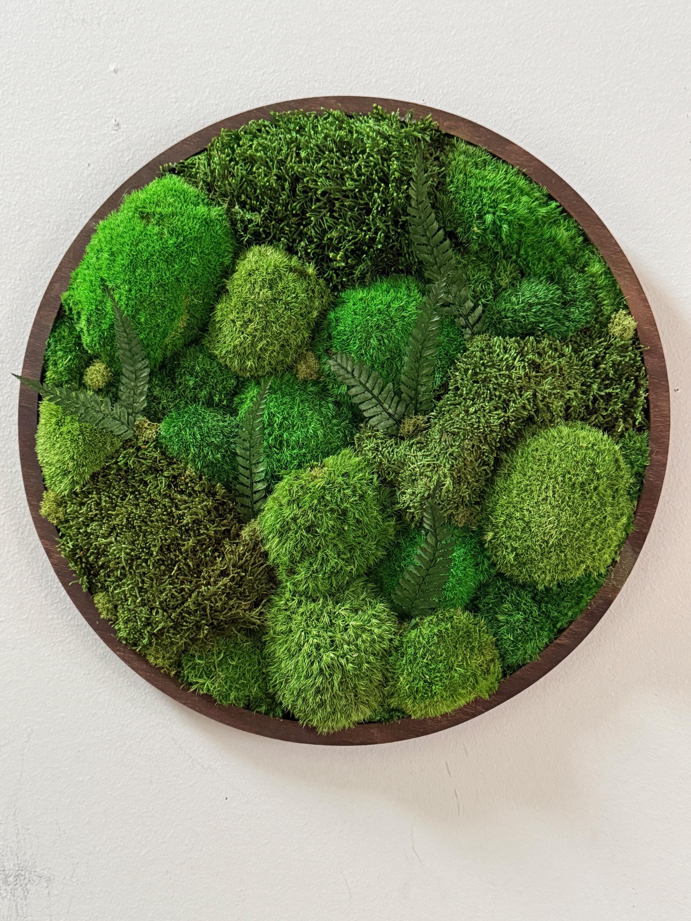 Real preserved mosses and ferns bring serenity to a space without any maintenance. All materials are preserved to stay looking beautiful forever. Set in a circular dark wood frame.