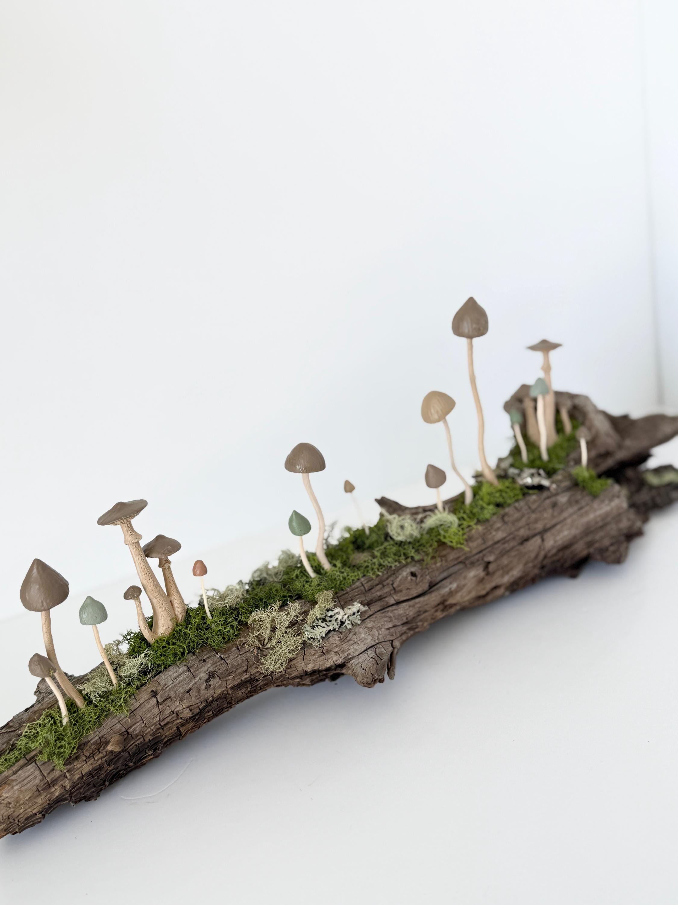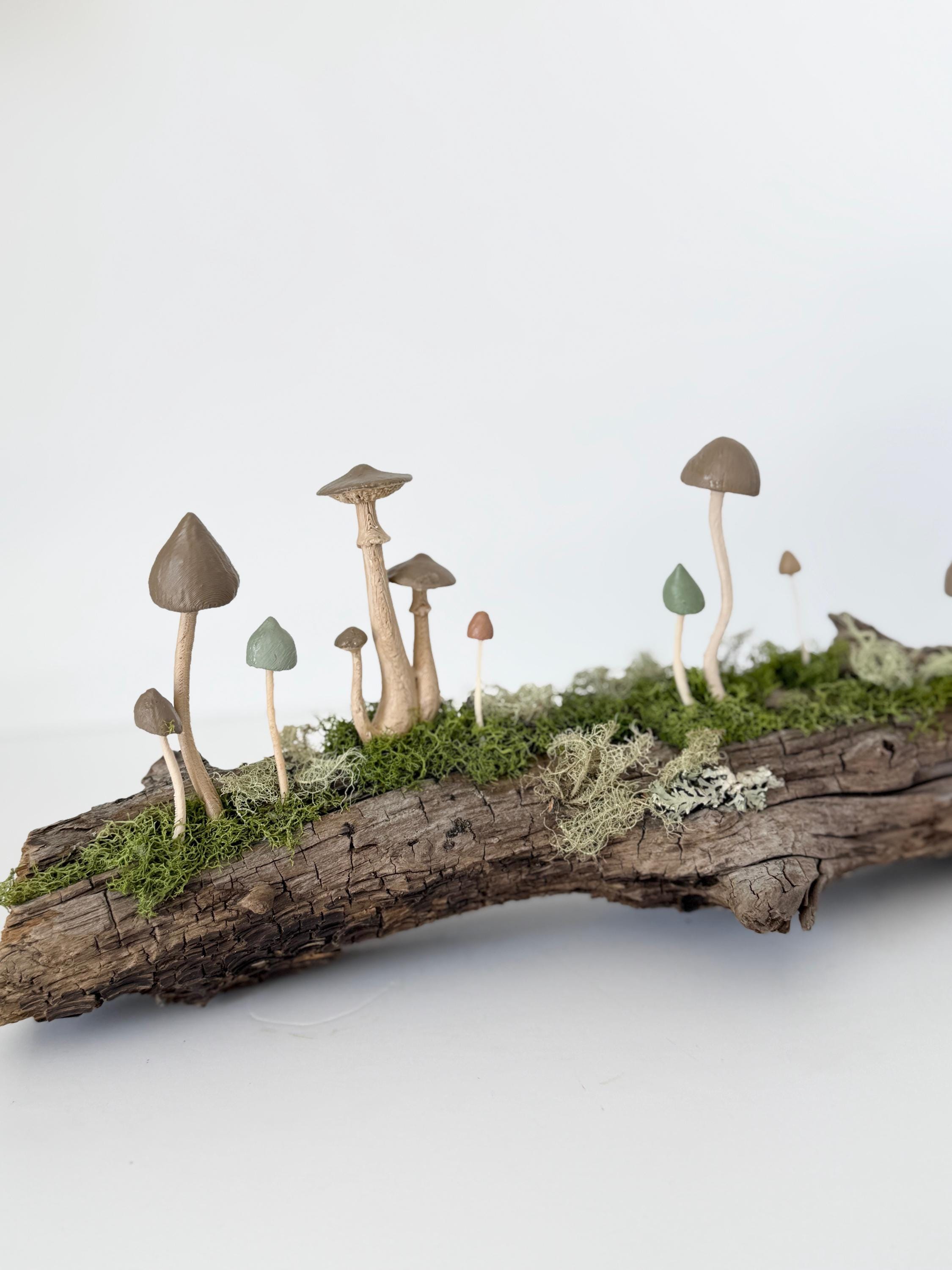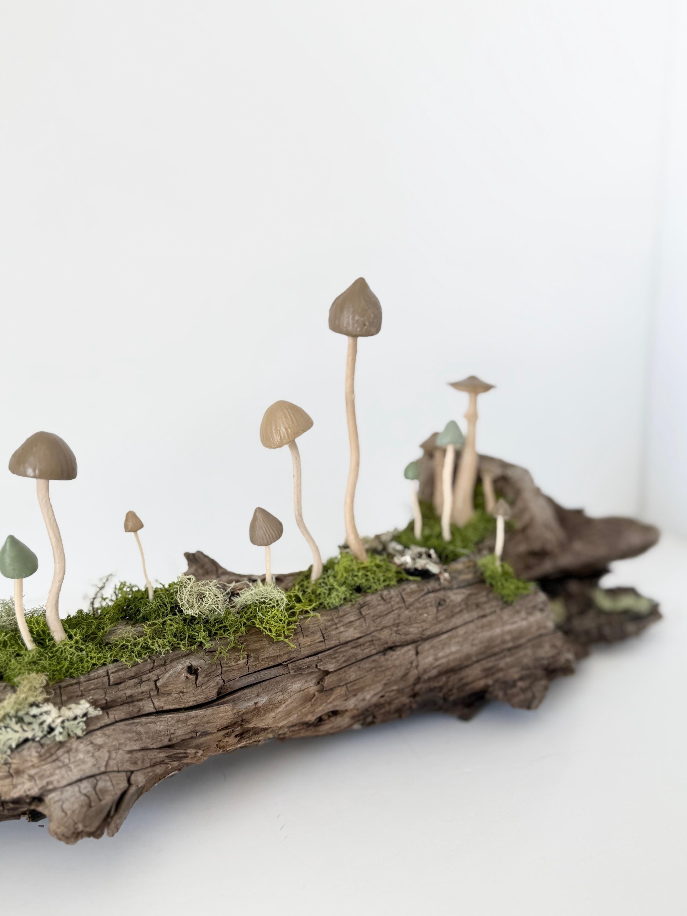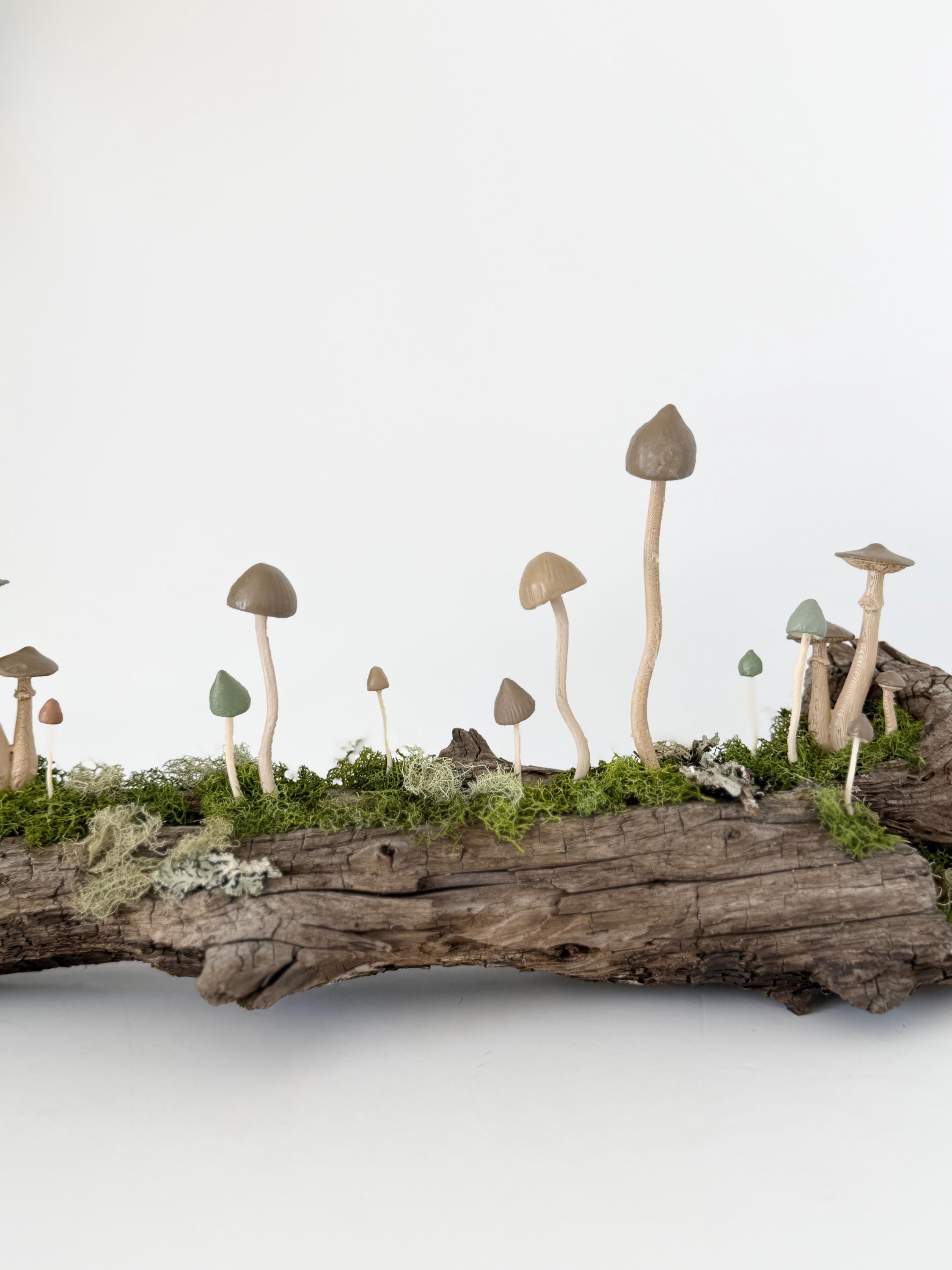 Natural botanical art created from real wood and moss foraged responsibly from nature, and mushrooms 3d printed with eco-friendly, plant based PLA and handpainted.