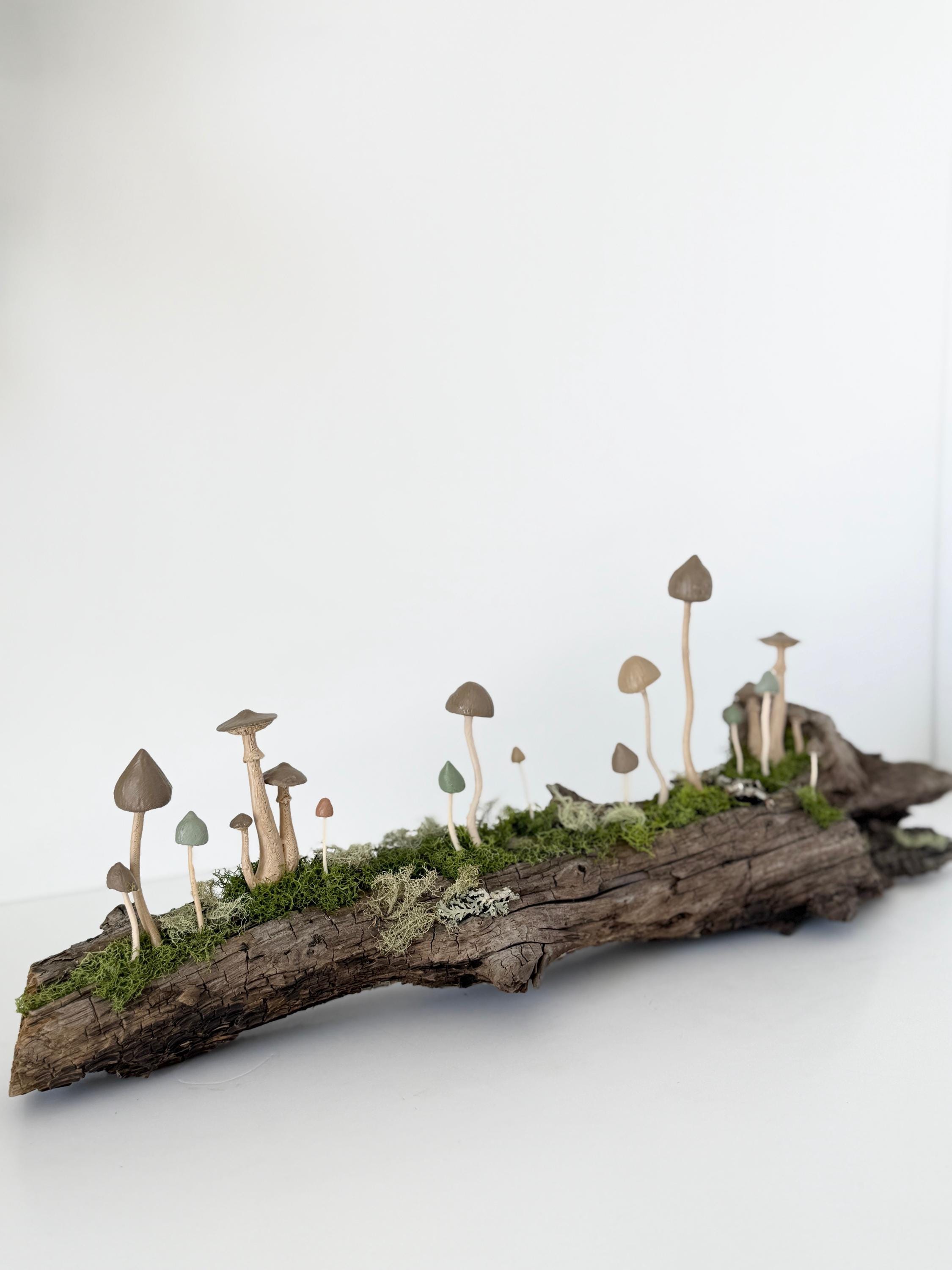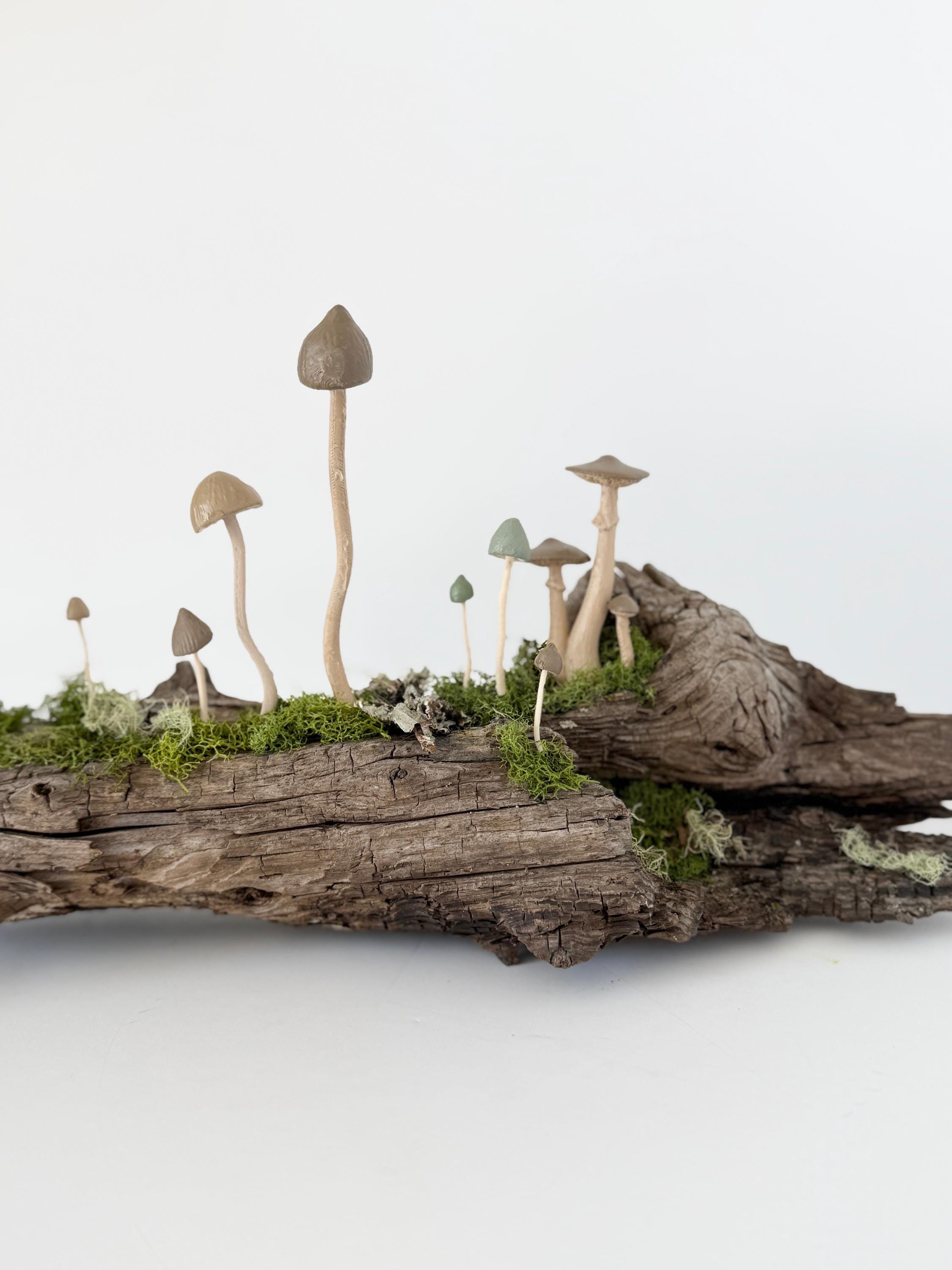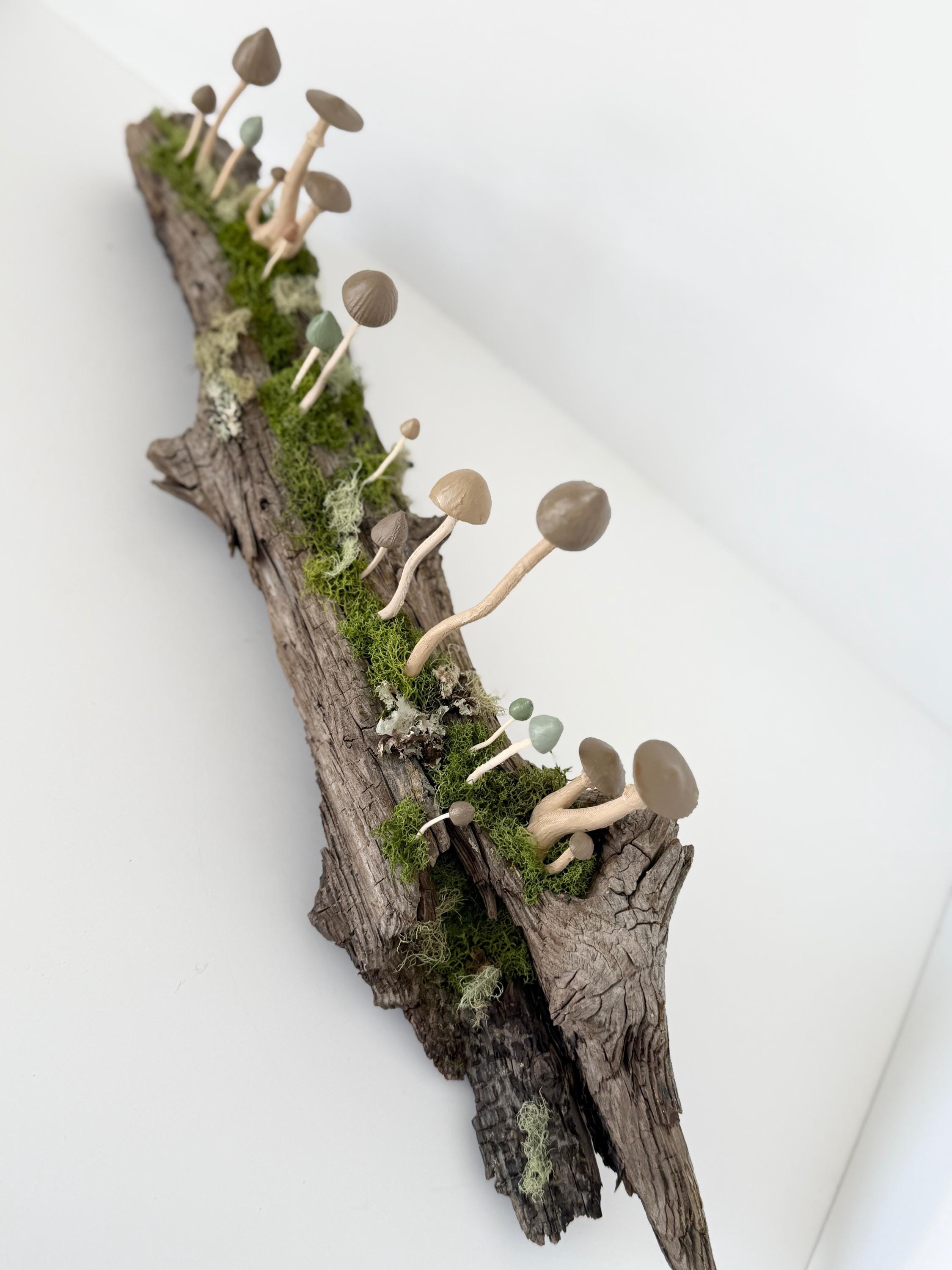 Natural botanical art created from real wood and moss foraged responsibly from nature, and mushrooms 3d printed with eco-friendly, plant based PLA and handpainted.