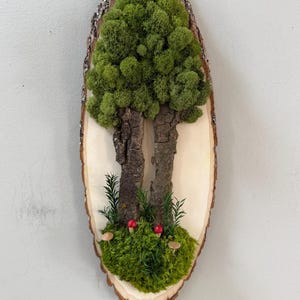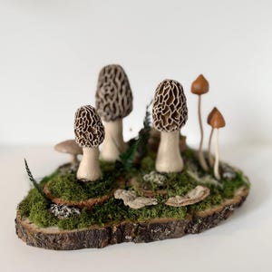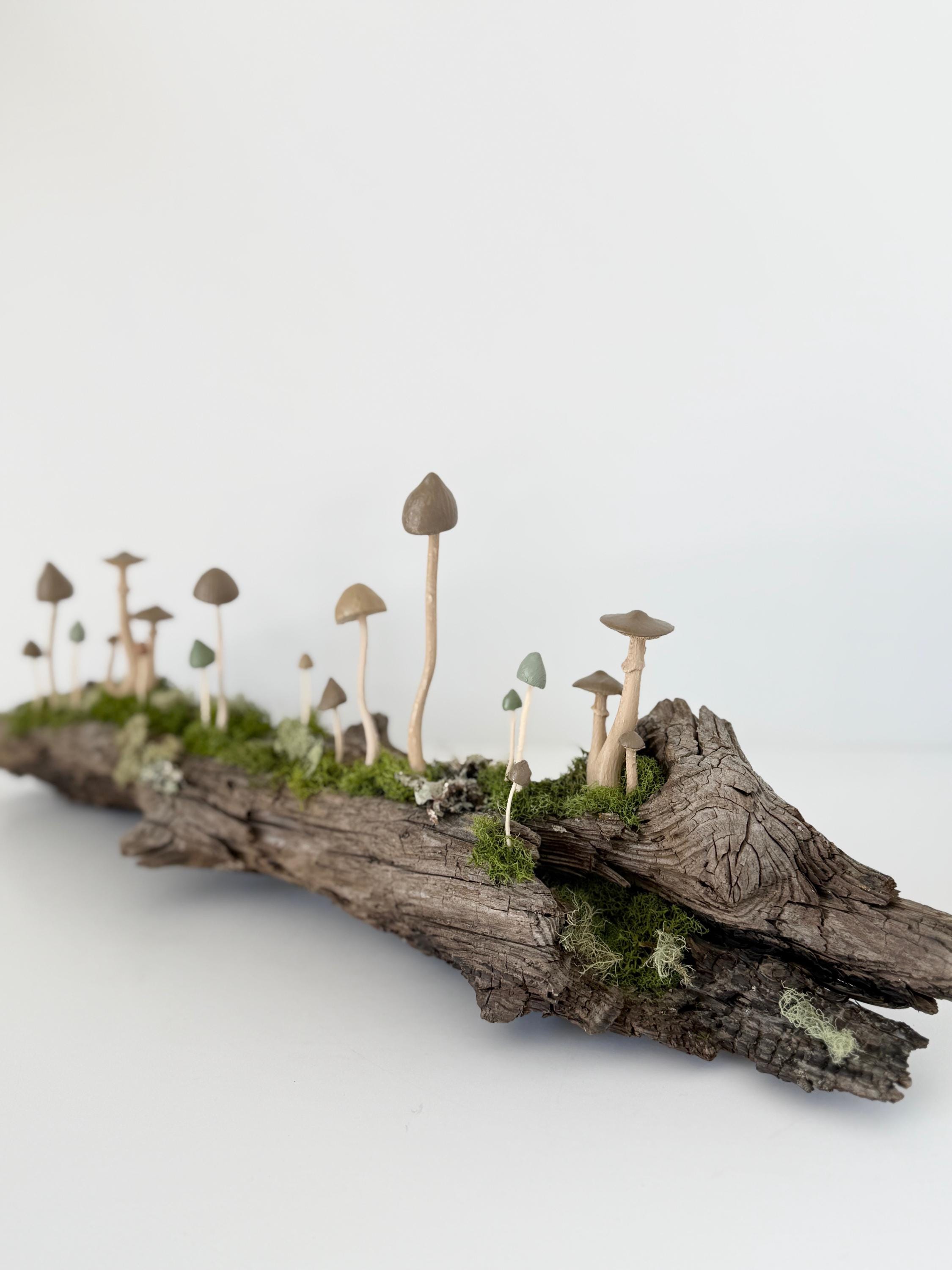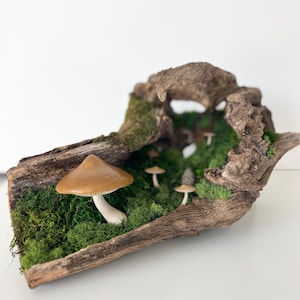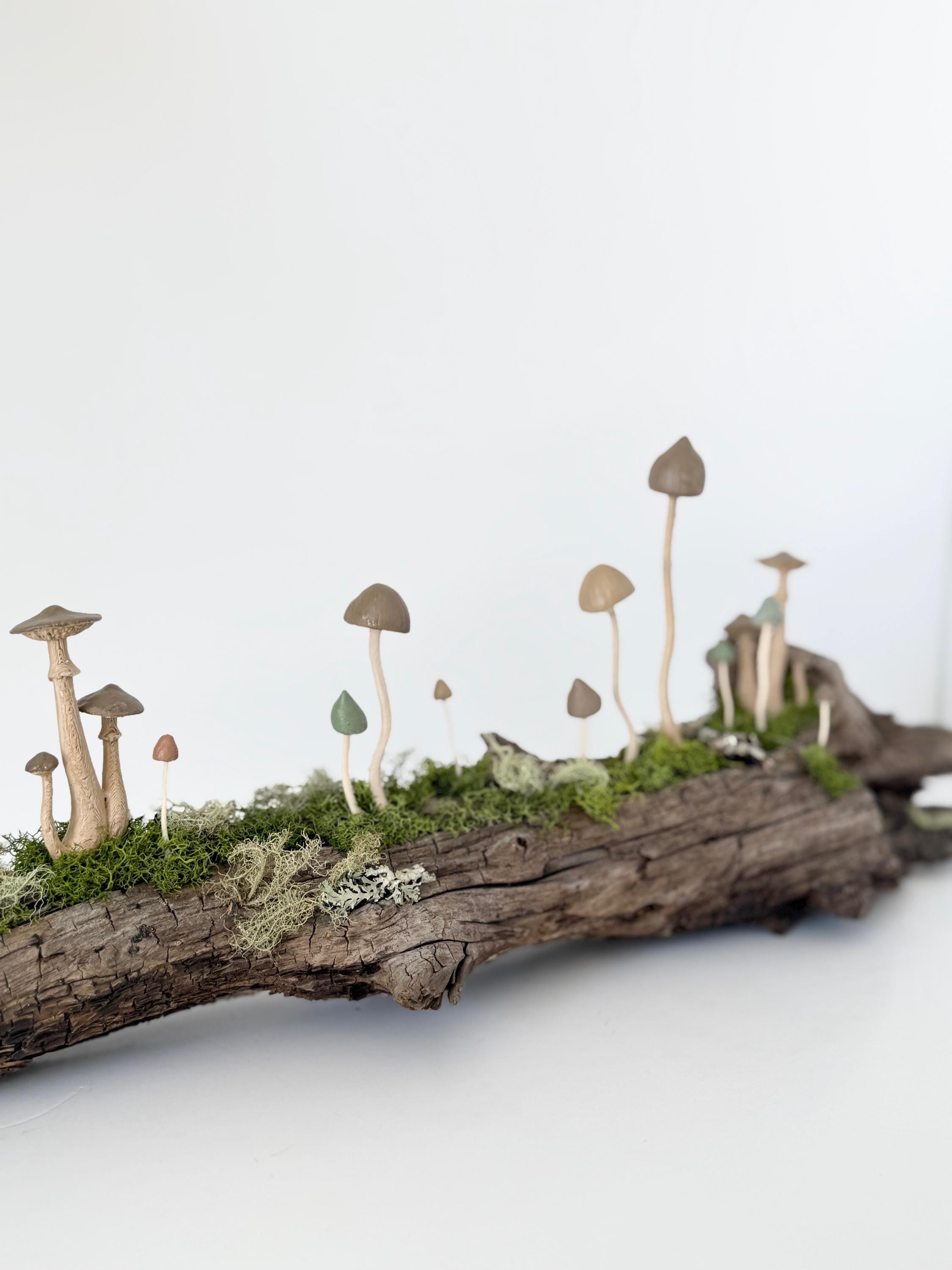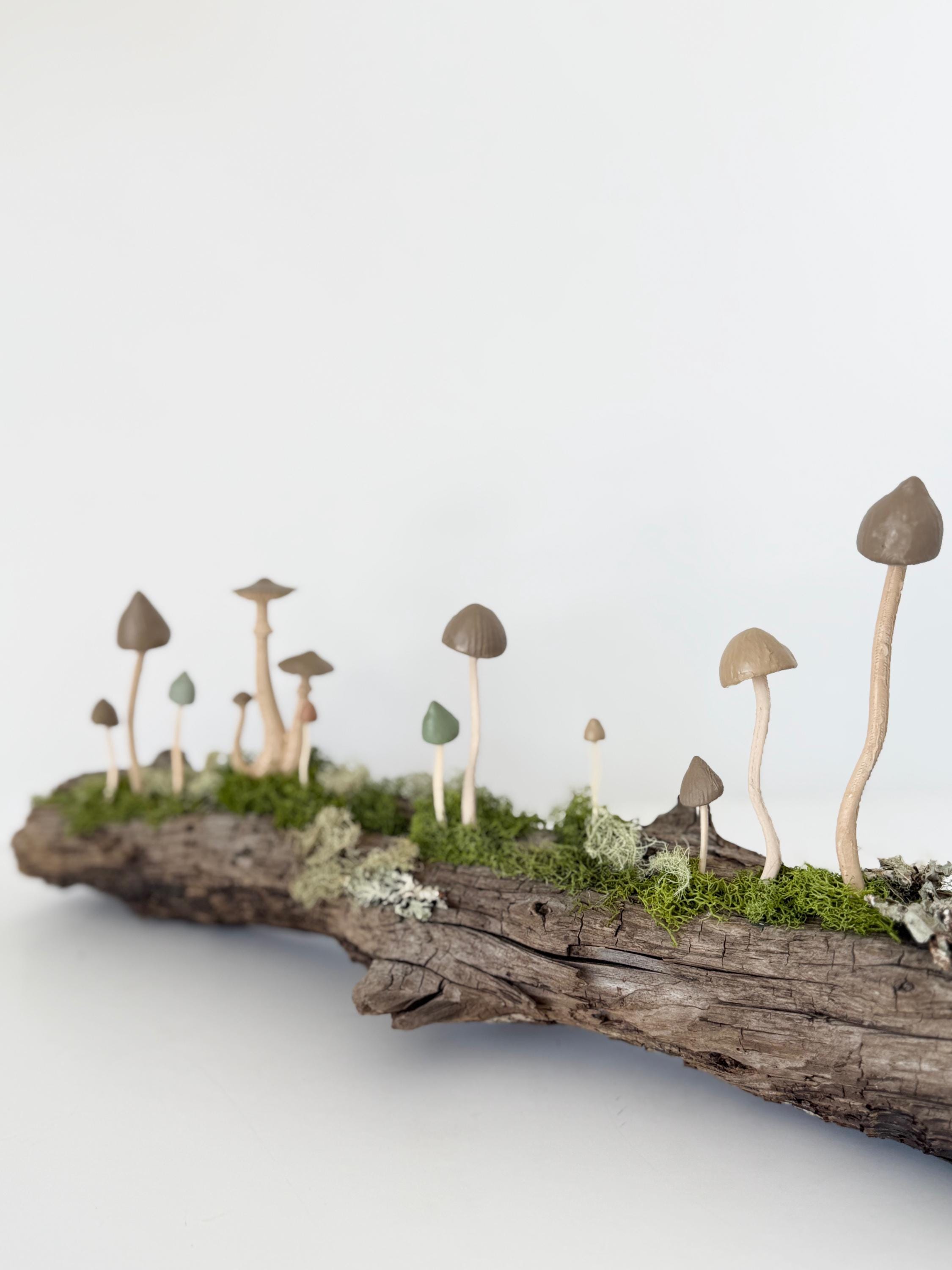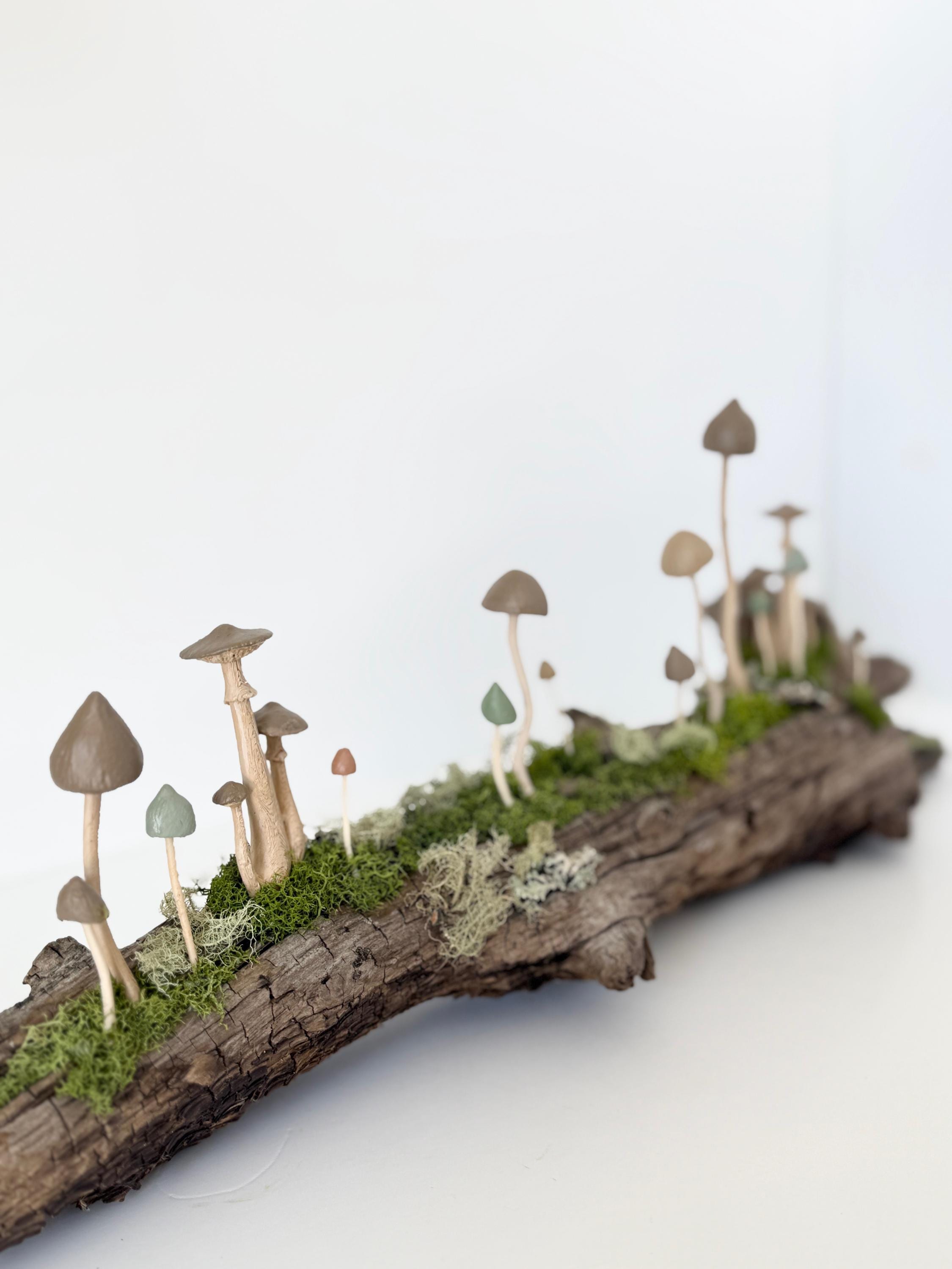 Natural botanical art created from real wood and moss foraged responsibly from nature, and mushrooms 3d printed with eco-friendly, plant based PLA and handpainted.
