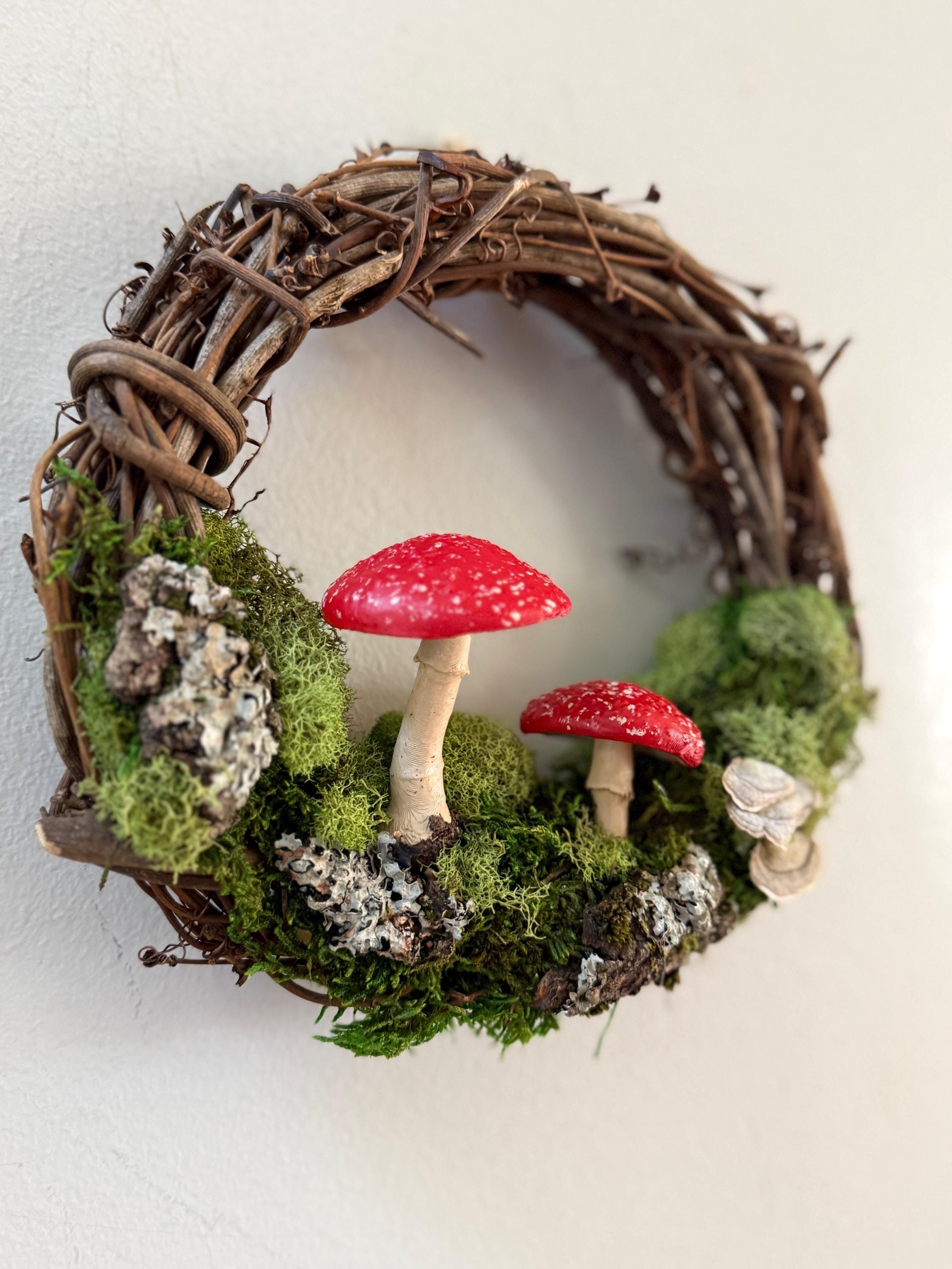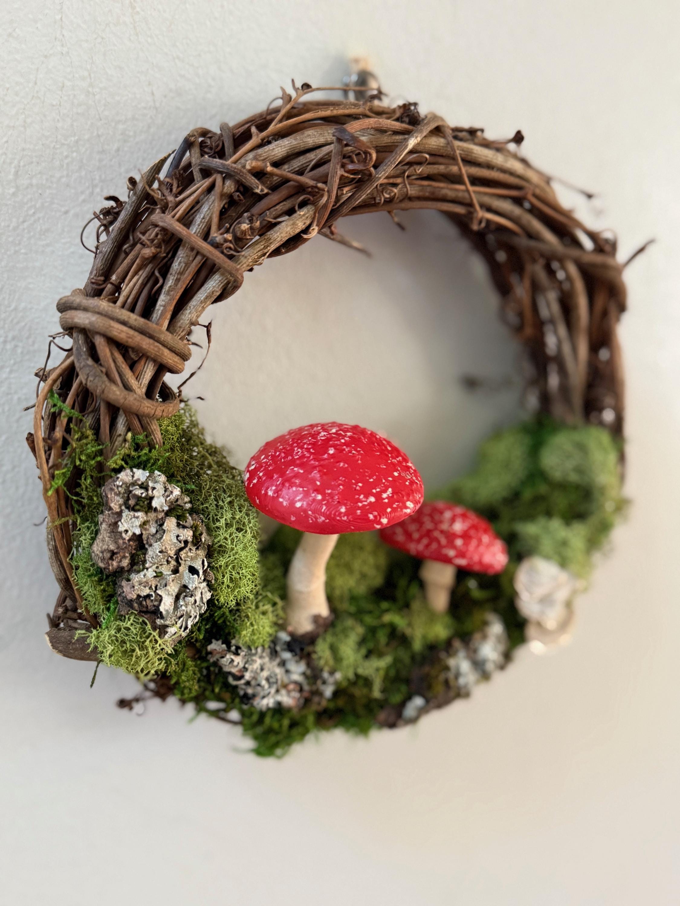 Little red amanita mushrooms and some real lichen and moss. Cute little 10" wreath to brighten up a space!