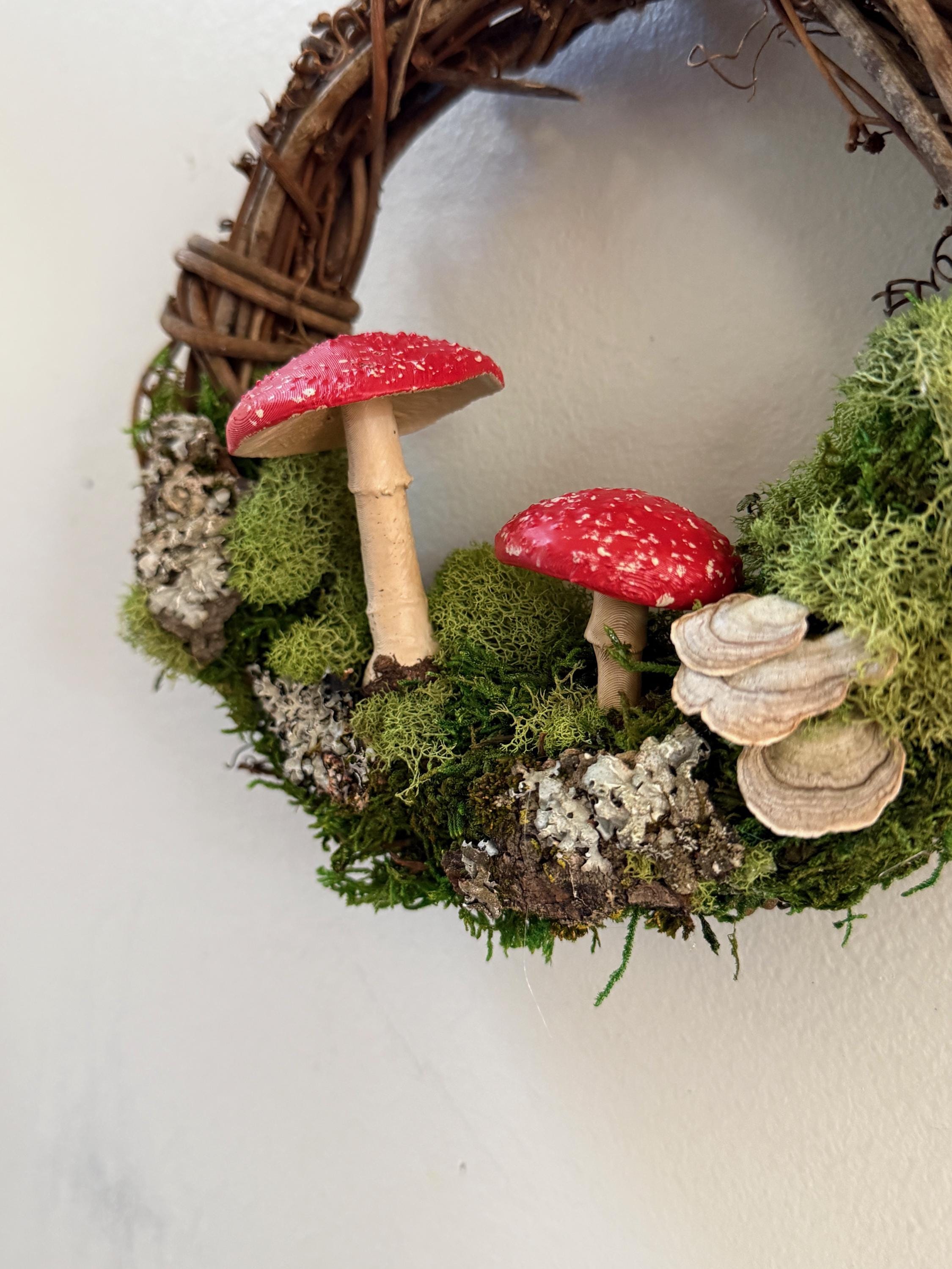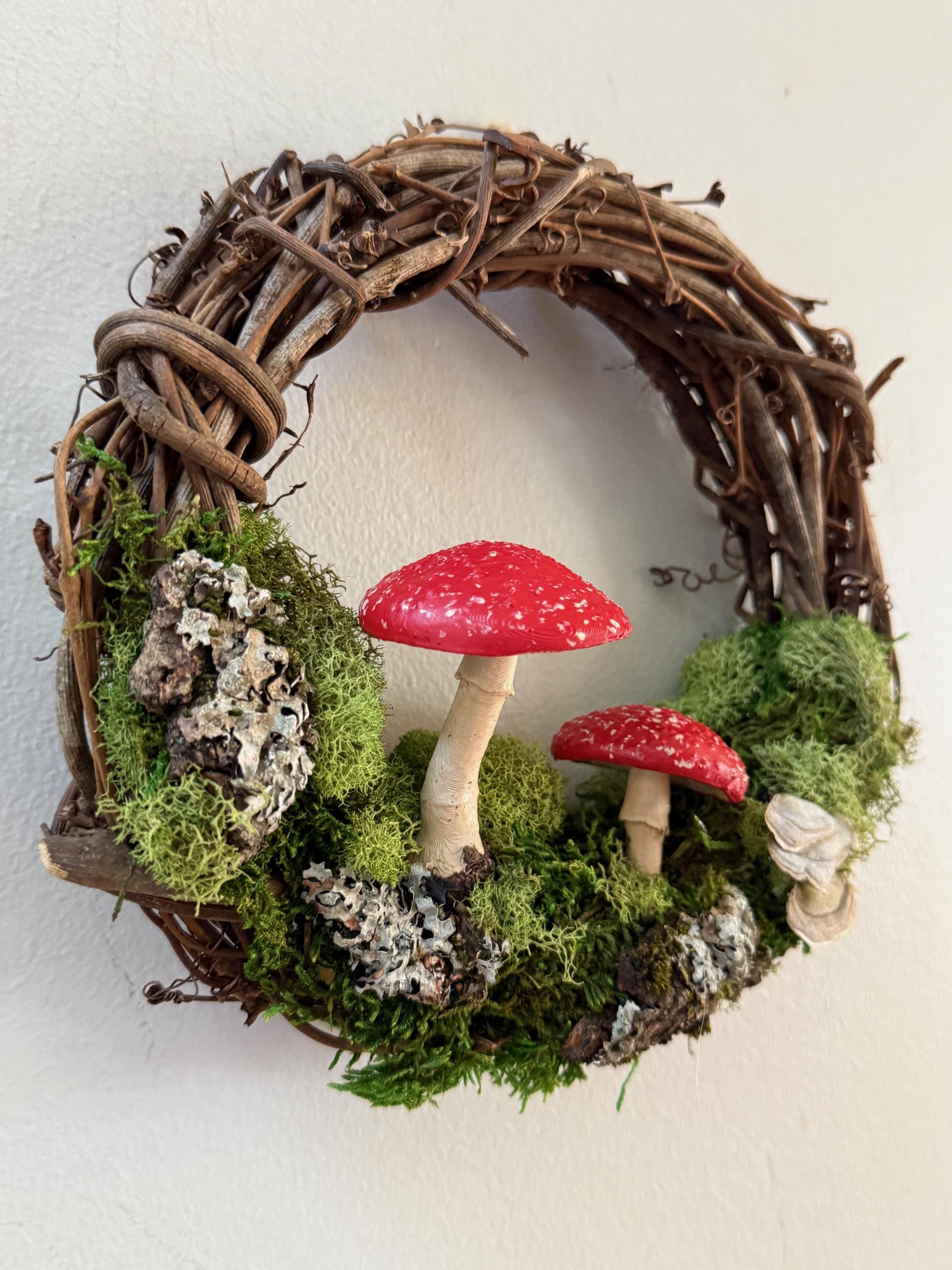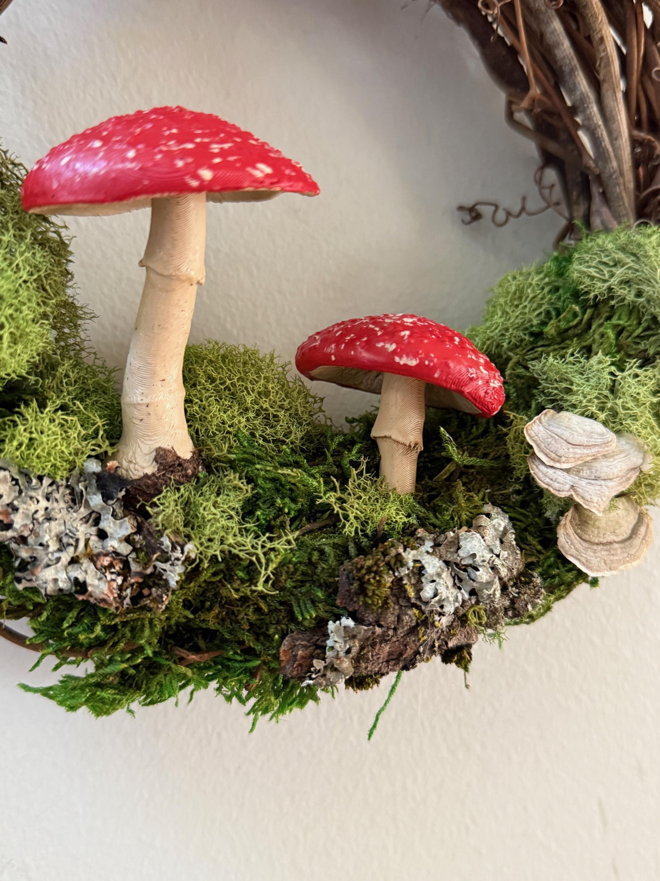 :: This piece is made using preserved natural mosses and lichen, so no care or watering is required. It will stay green and lush forever! :: Handpainted mushrooms are 3D printed in a eco-friendly, plant based and compostable PLA. :: Natural grapevine wreath measures 10 inches in diameter. :: Small hanging loop on the back. :: Made by hand in Michigan