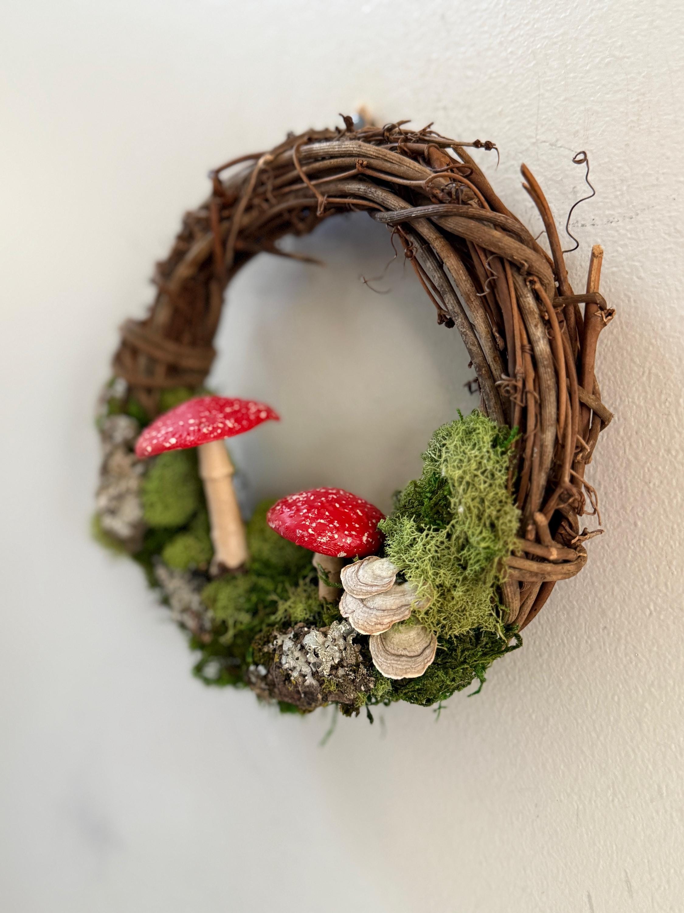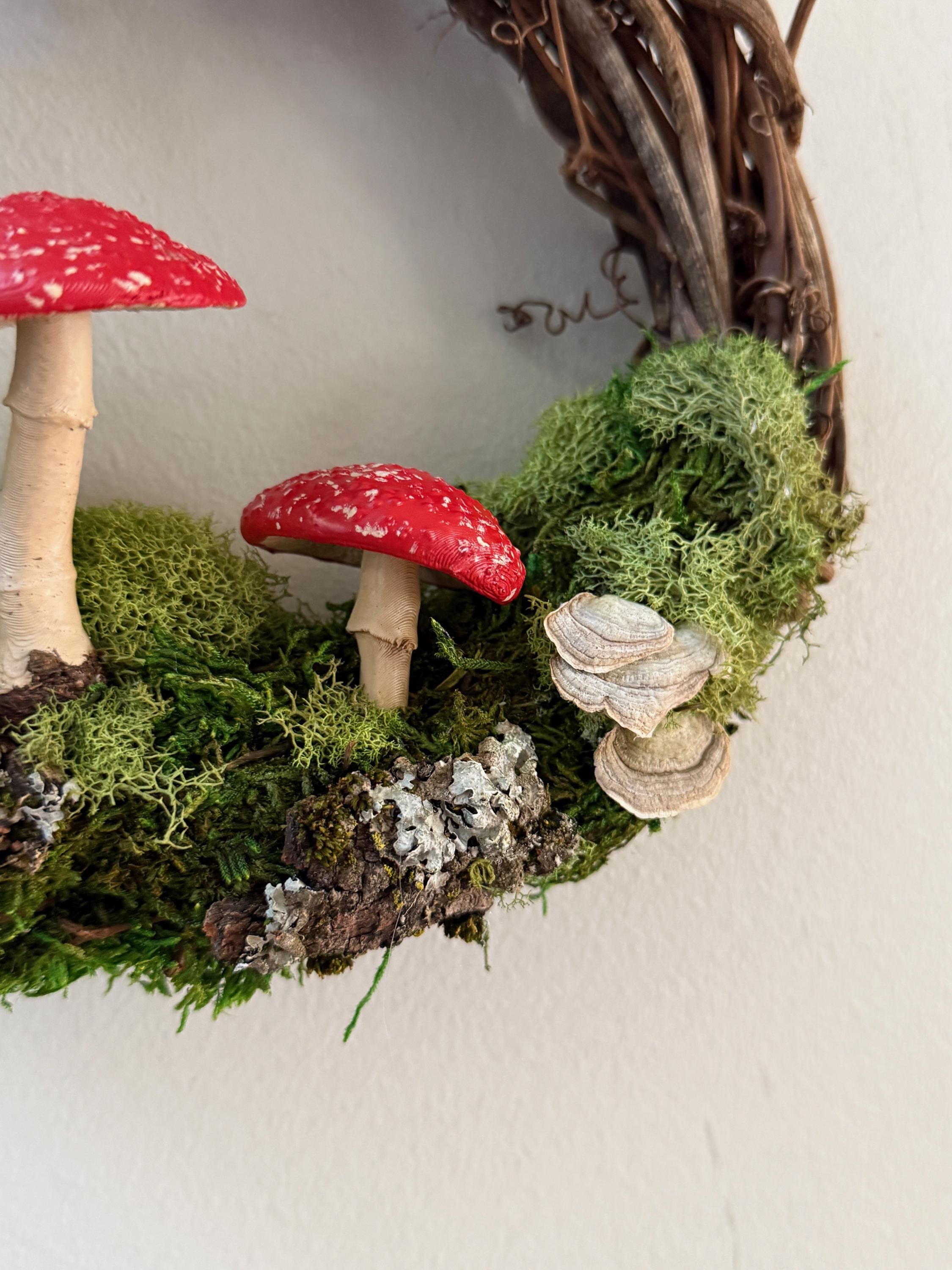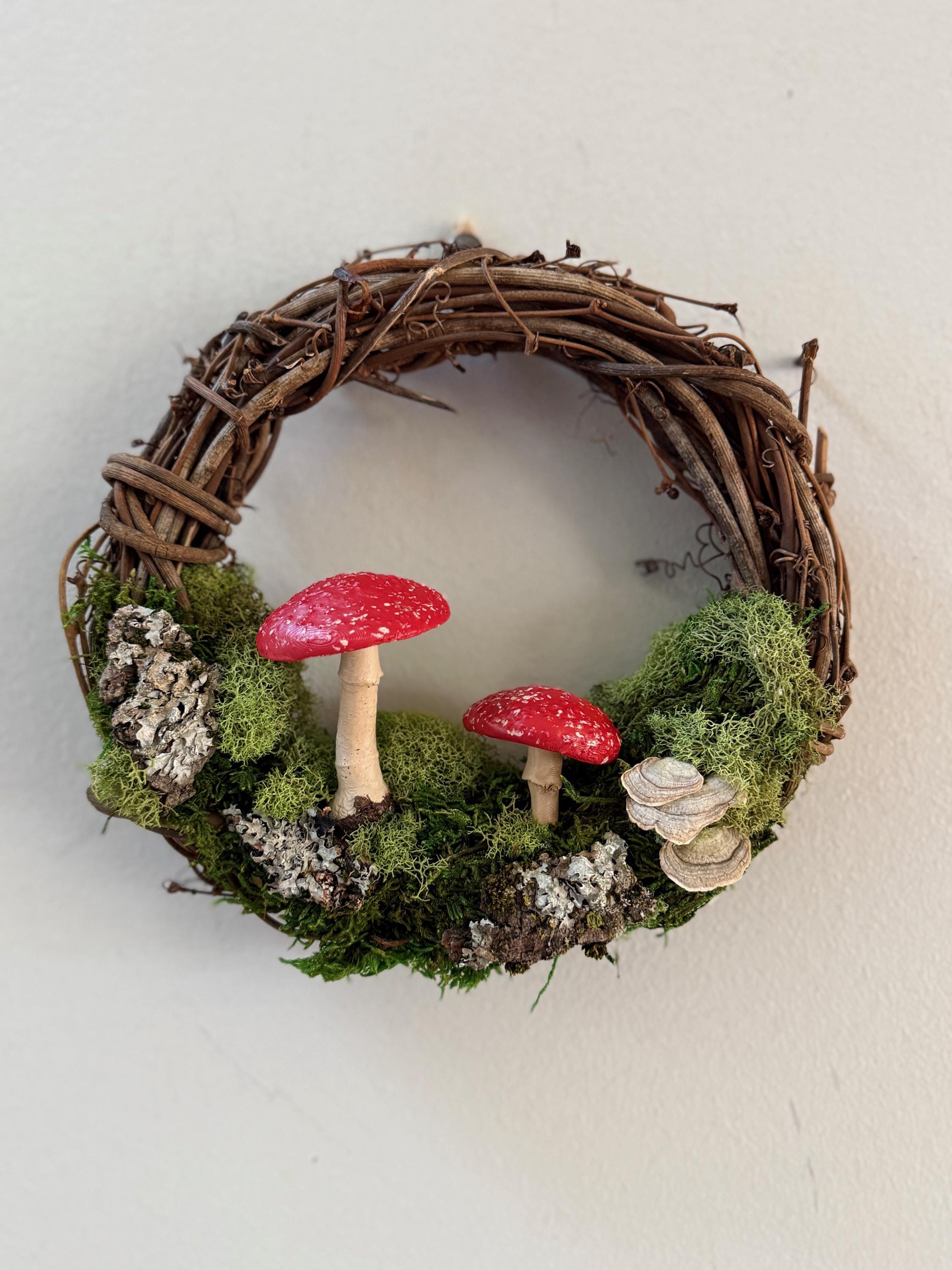 :: This piece is made using preserved natural mosses and lichen, so no care or watering is required. It will stay green and lush forever! :: Handpainted mushrooms are 3D printed in a eco-friendly, plant based and compostable PLA. :: Natural grapevine wreath measures 10 inches in diameter. :: Small hanging loop on the back. :: Made by hand in Michigan